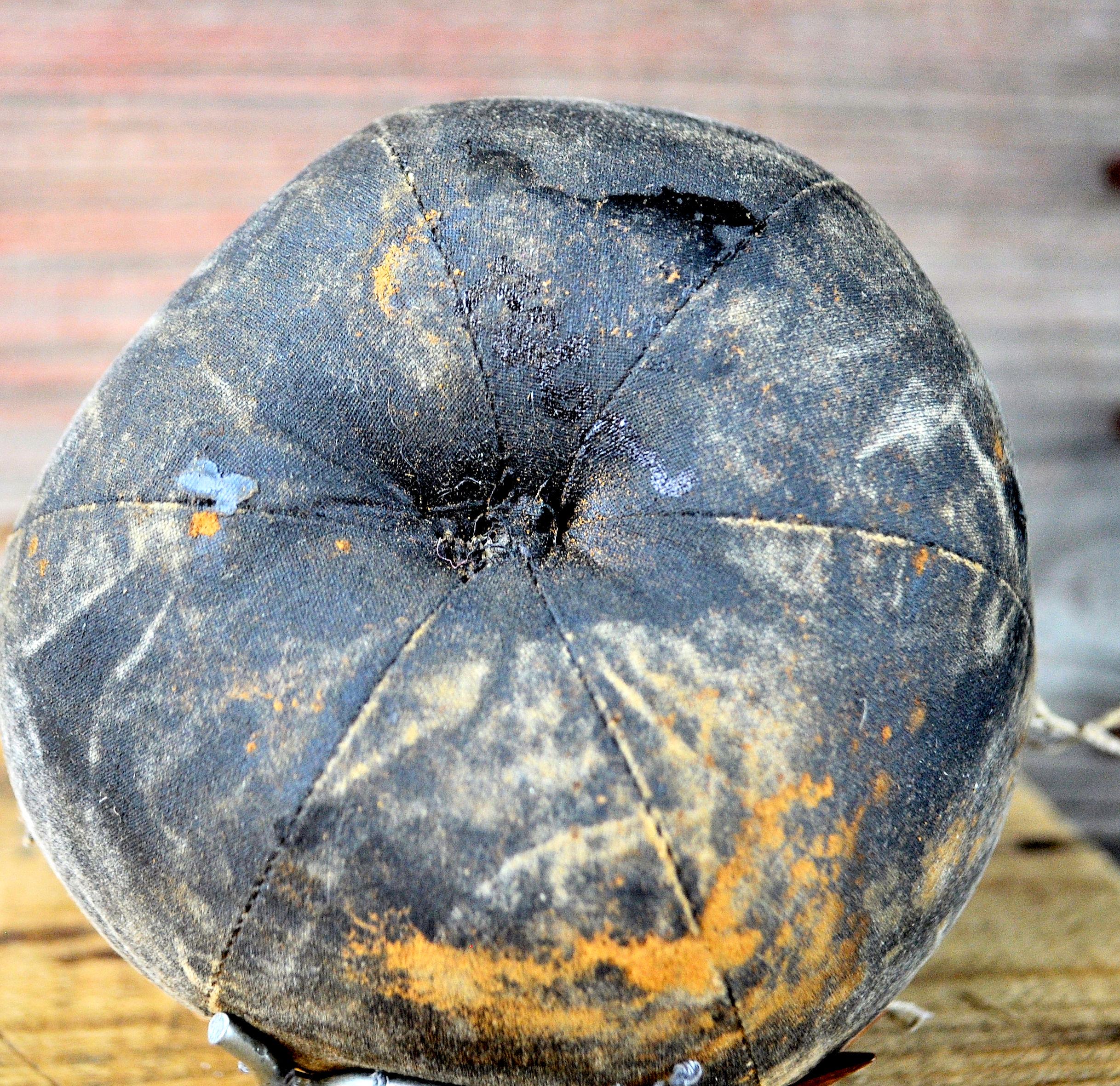 Barb Olson of Muddy Creek Primitives, designer and creator of unique handmade pieces is pleased to offer this one-of-a-kind Jack-O-Lantern. The rusty metal and other old hardware add charm and "primness" to this pumpkin. This JOL is painted black and grunged up with cinnamon and coffee to look very primitive. It is topped with a real pumpkin stem and Spanish moss. Set several different ones on a bench or mantle with fall garland or grapevine wrapped around them all. Each one of these pumpkins shows its unique personality and is signed by the artist on the base. He is 4" tall (not including stem).