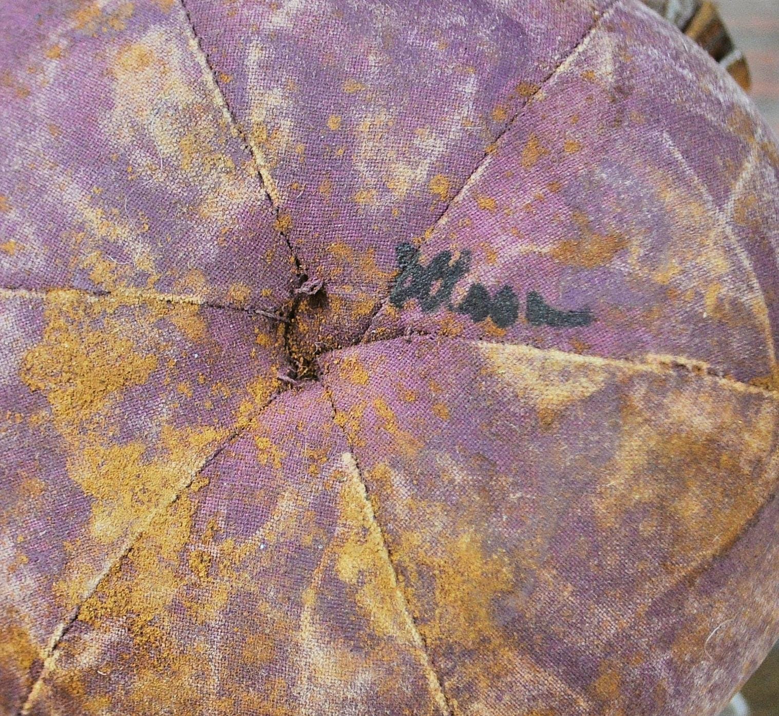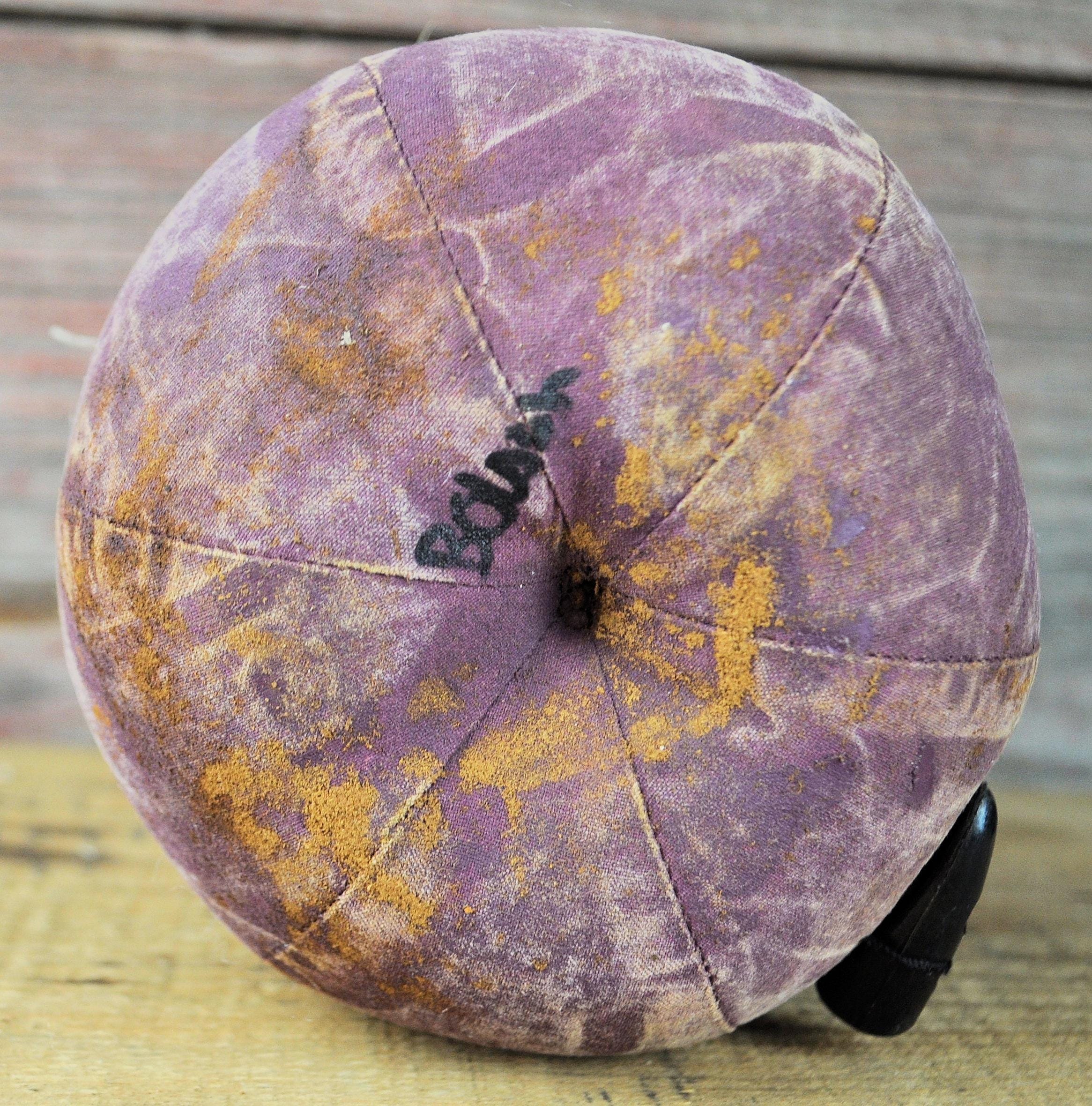 Barb Olson of Muddy Creek Primitives, designer and creator of unique handmade pieces is pleased to offer this one-of-a-kind Jack-O-Lantern. The rusty metal and other old hardware add charm and "primness" to this pumpkin. This JOL is painted purple and grunged up with cinnamon and coffee to look very primitive. It is topped with a real pumpkin stem and Spanish moss. Set several different ones on a bench or mantle with fall garland or grapevine wrapped around them all. Each one of these pumpkins shows its unique personality and is signed by the artist on the base. He is 4" tall (not including stem).