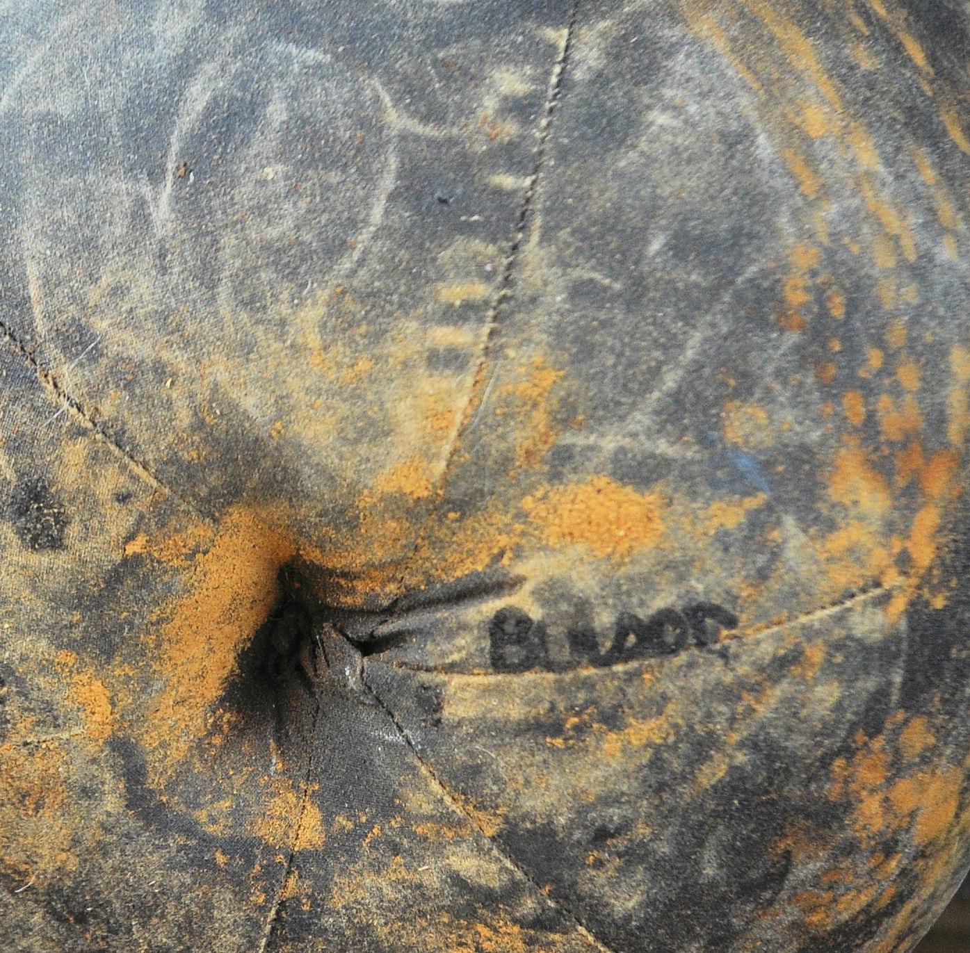 Barb Olson of Muddy Creek Primitives, designer and creator of unique handmade pieces is pleased to offer this one-of-a-kind Jack-O-Lantern. The rusty hardware & other items add charm and "primness" to this pumpkin. This JOL is painted dark gray and grunged up with cinnamon and coffee to make it look very primitive. It is topped with a real pumpkin stem and Spanish moss. Set several different ones on a bench or mantle with fall garland or grapevine wrapped around them all. Each one of these pumpkins shows its unique personality and is signed by the artist on the base. He is 11" tall (not including stem).
