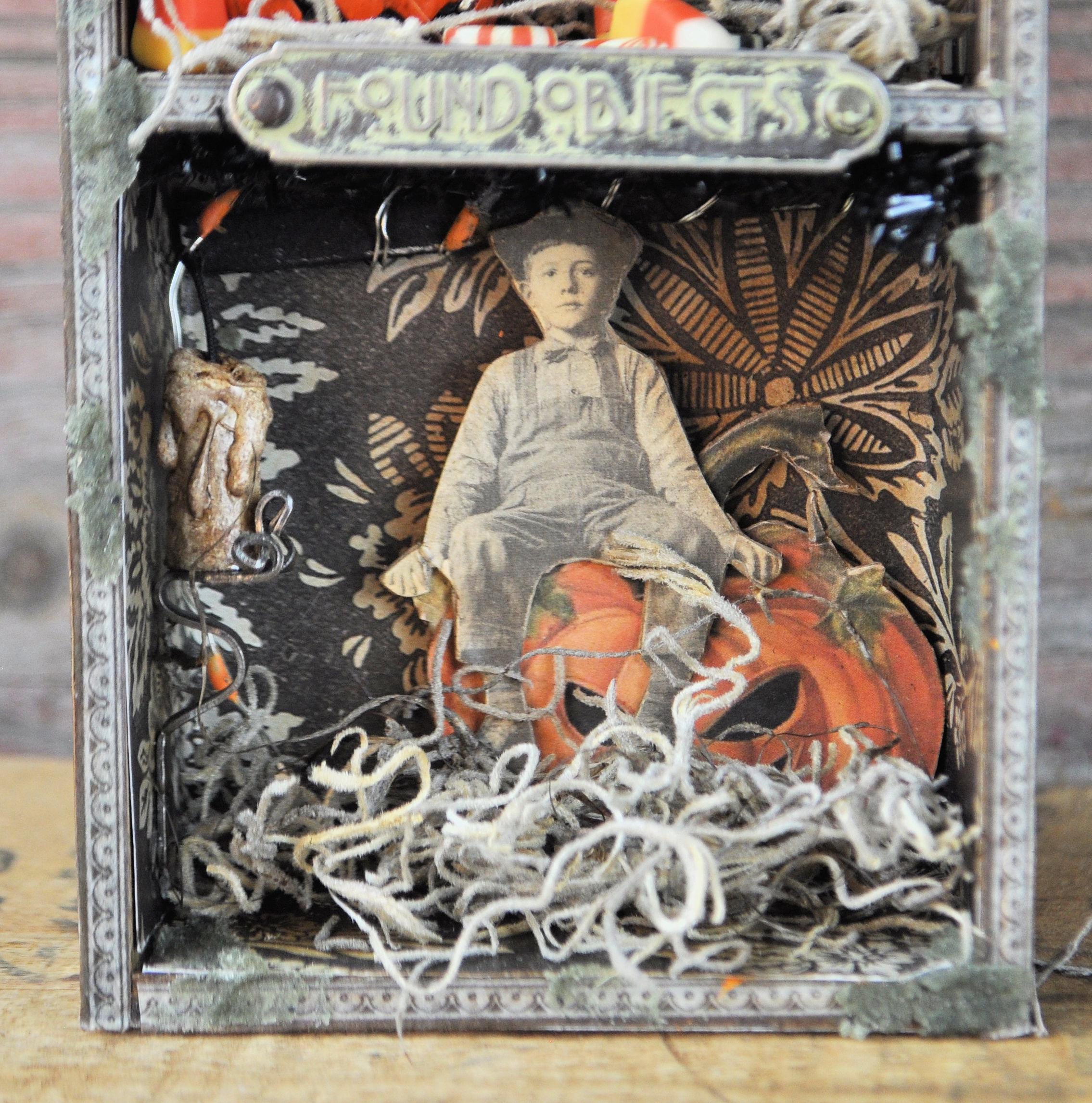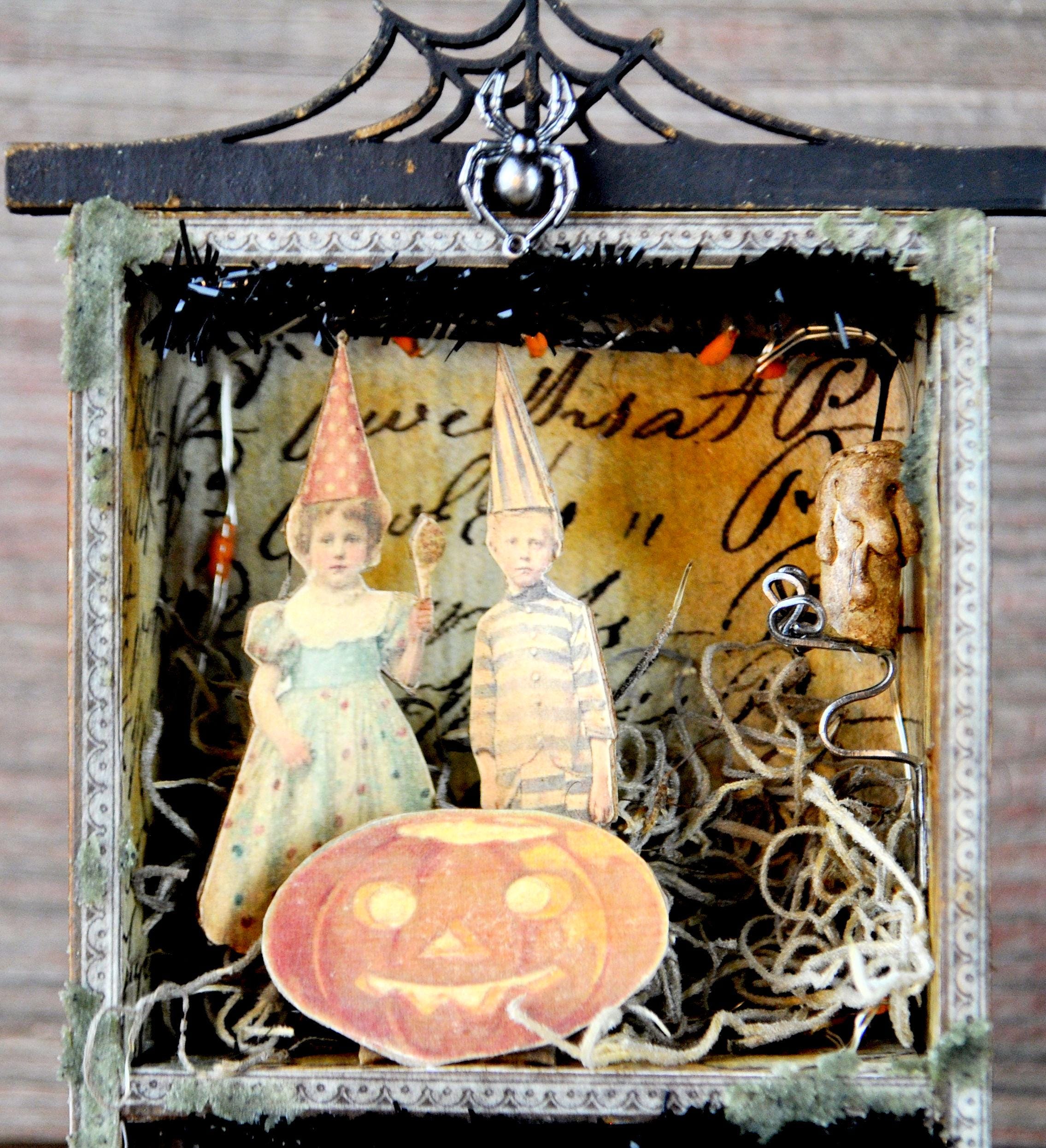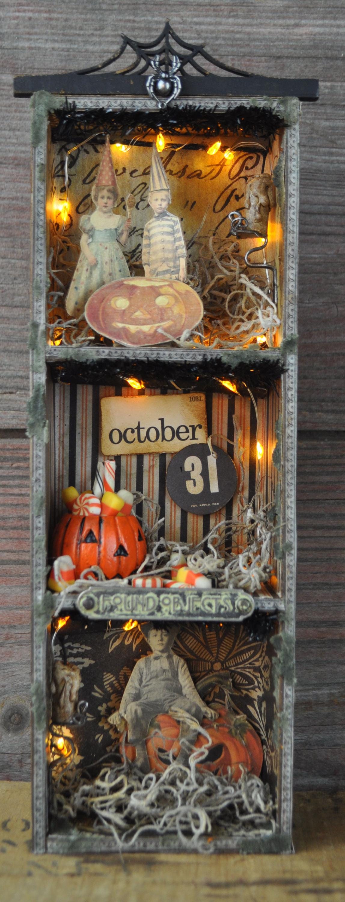 Barb Olson of Muddy Creek Primitives, designer and creator of unique handmade pieces is pleased to offer this primitive Halloween vignette display. It is all about the candy. There is a small jack-o-lantern filled with candy. It has two small candles in handmade sconces. There are all kinds of fun Halloween images. A small metal sign reads "found objects" is attached to the middle shelf. At the top is a spiderweb cutout with a metal spider. Spanish moss is stuck in here & there to add spookiness. There is a set of battery-operated tiny lights in orange. This Halloween vignette measures 9" x 3 1/2" x 2". It will look perfect with all your prim decor.