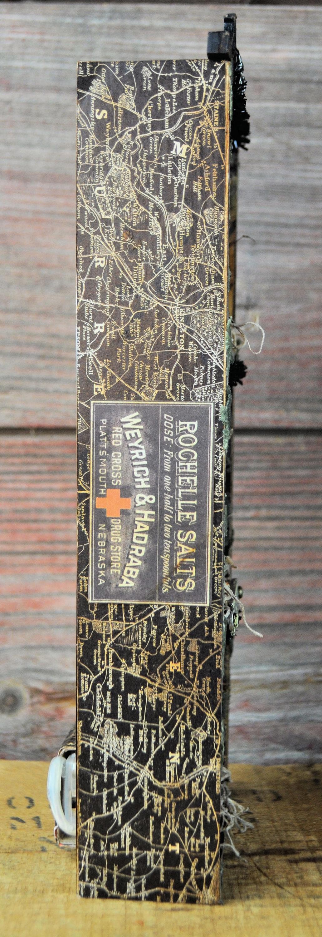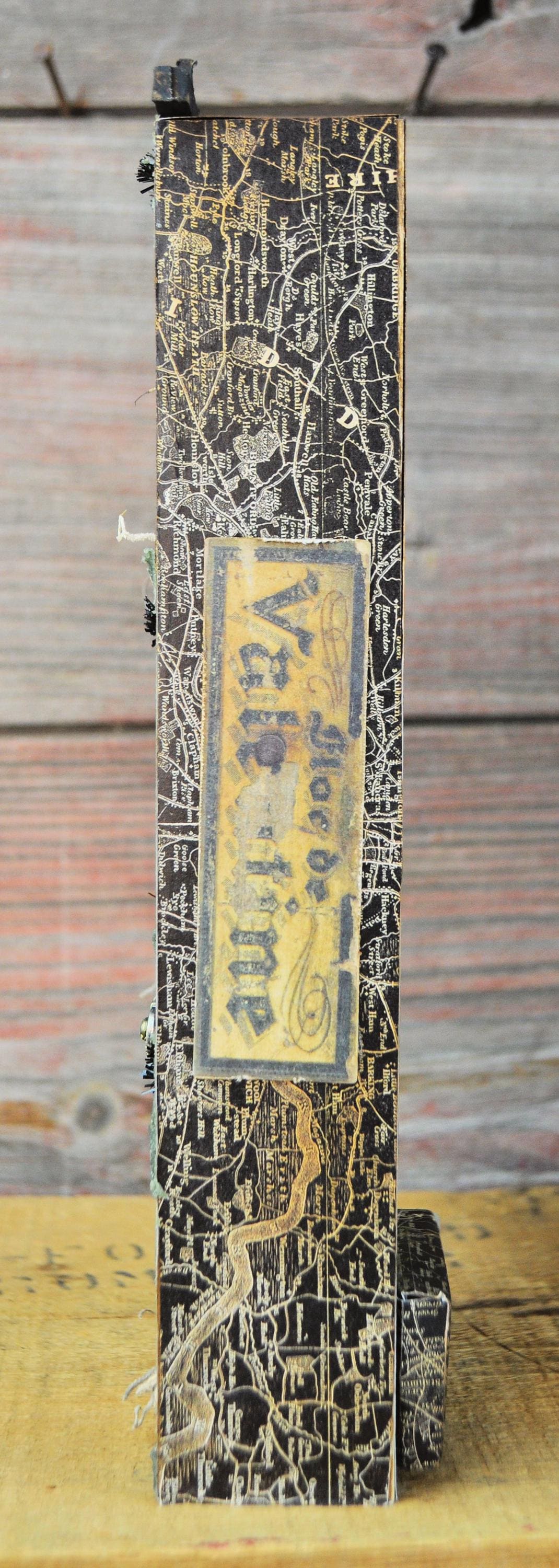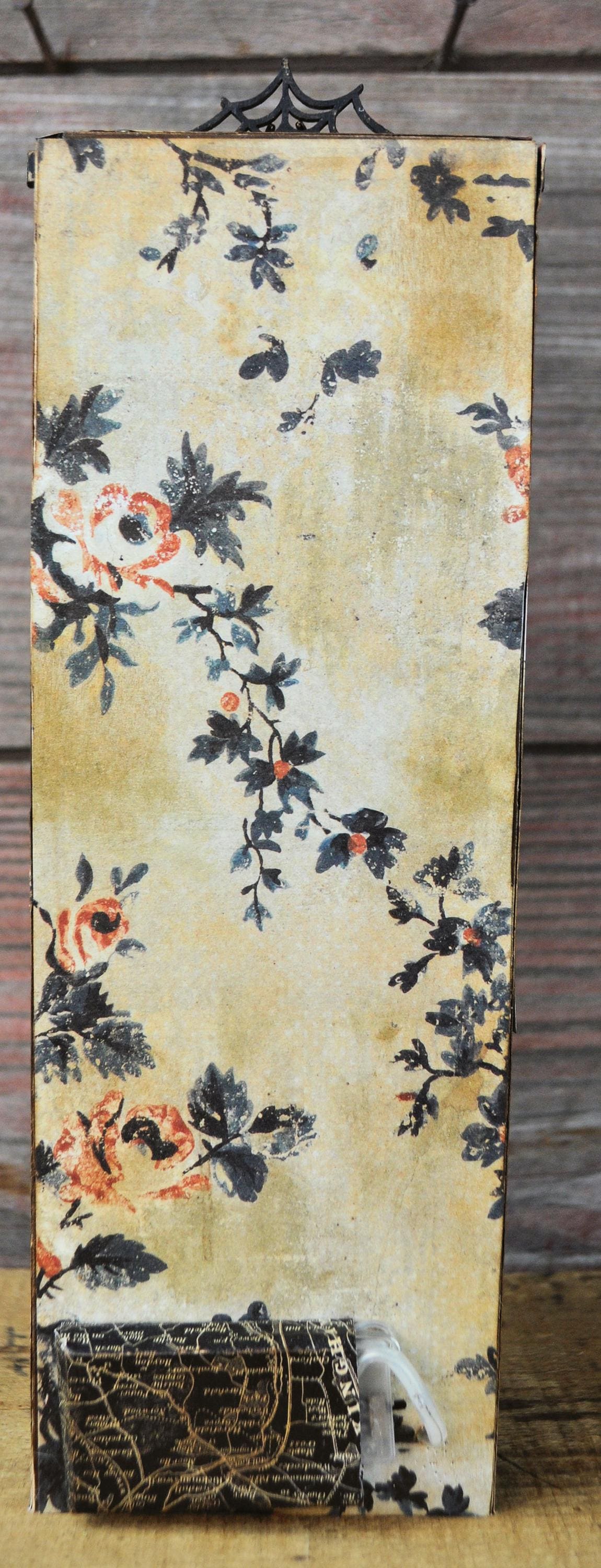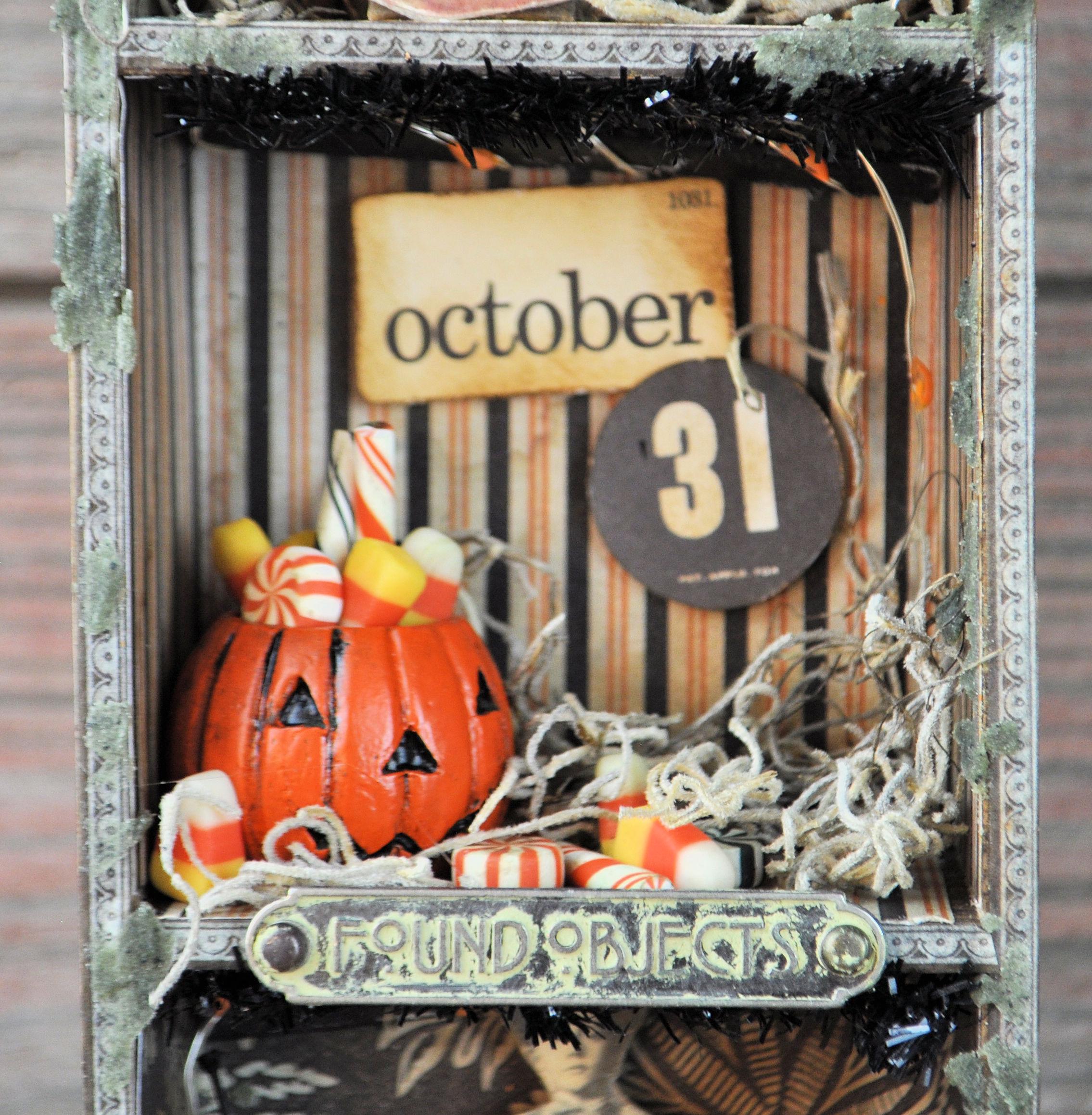 Barb Olson of Muddy Creek Primitives, designer and creator of unique handmade pieces is pleased to offer this primitive Halloween vignette display. It is all about the candy. There is a small jack-o-lantern filled with candy. It has two small candles in handmade sconces. There are all kinds of fun Halloween images. A small metal sign reads "found objects" is attached to the middle shelf. At the top is a spiderweb cutout with a metal spider. Spanish moss is stuck in here & there to add spookiness. There is a set of battery-operated tiny lights in orange. This Halloween vignette measures 9" x 3 1/2" x 2". It will look perfect with all your prim decor.