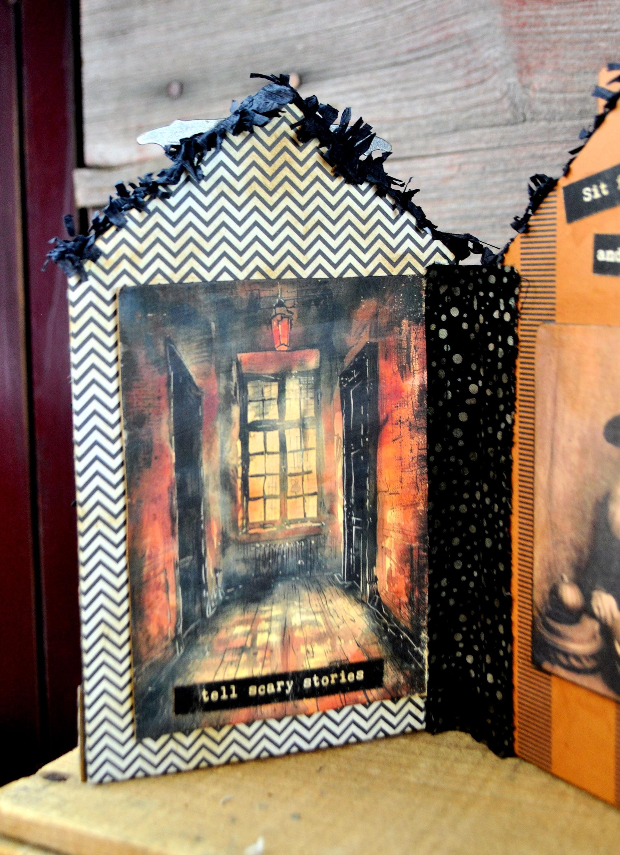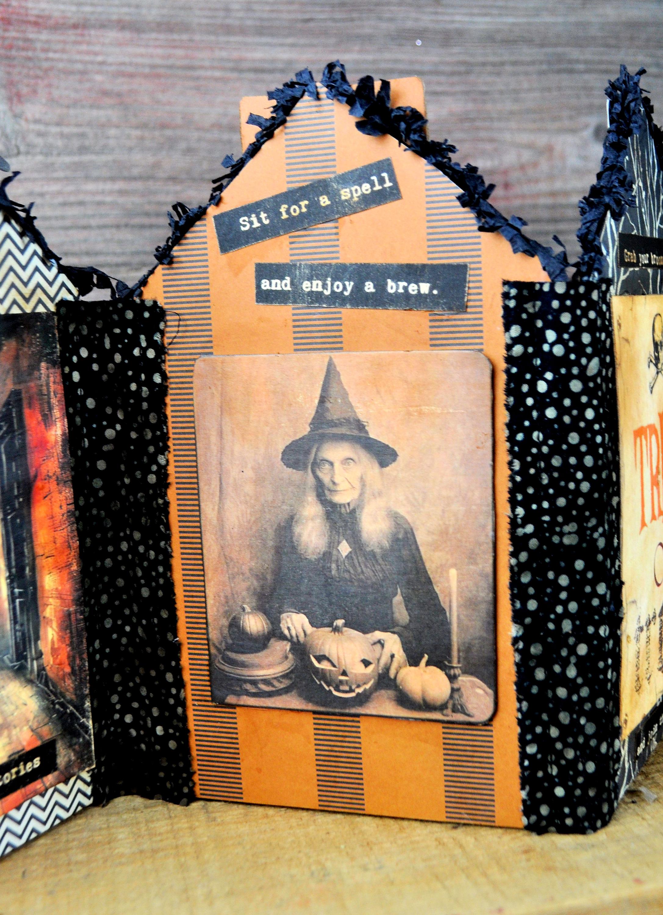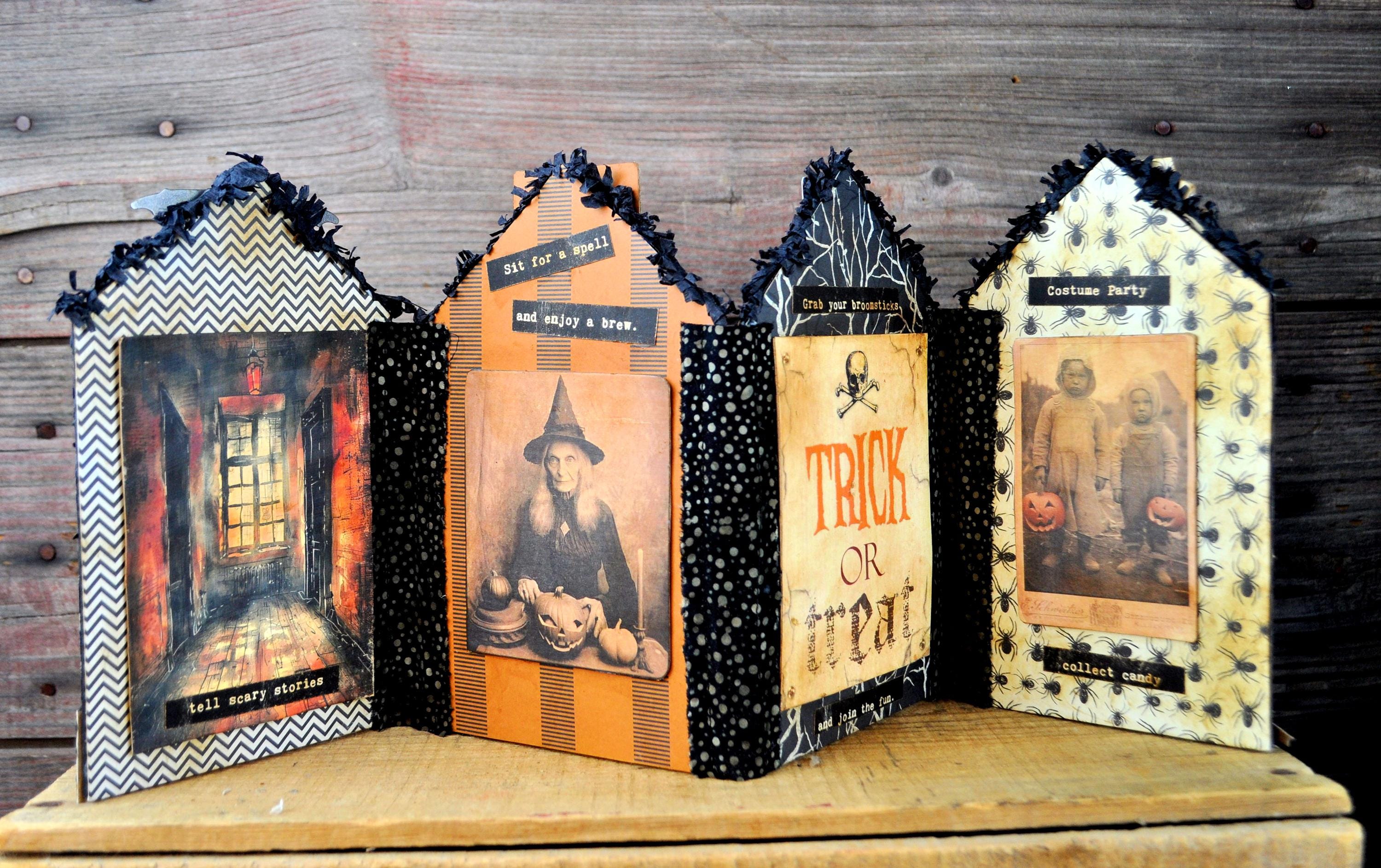 Barb Olson of Muddy Creek Primitives, designer and creator of unique handmade pieces is pleased to offer this primitive one-of-a-kind Halloween four panel Collage. It has some fun Halloween images to make it look spooktacular. The back is also decorated with Halloween graphics. This Halloween collage measures 19 1/2" x 7 1/2 ". It will look perfect sitting on a mantle or shelf with all your prim decor.