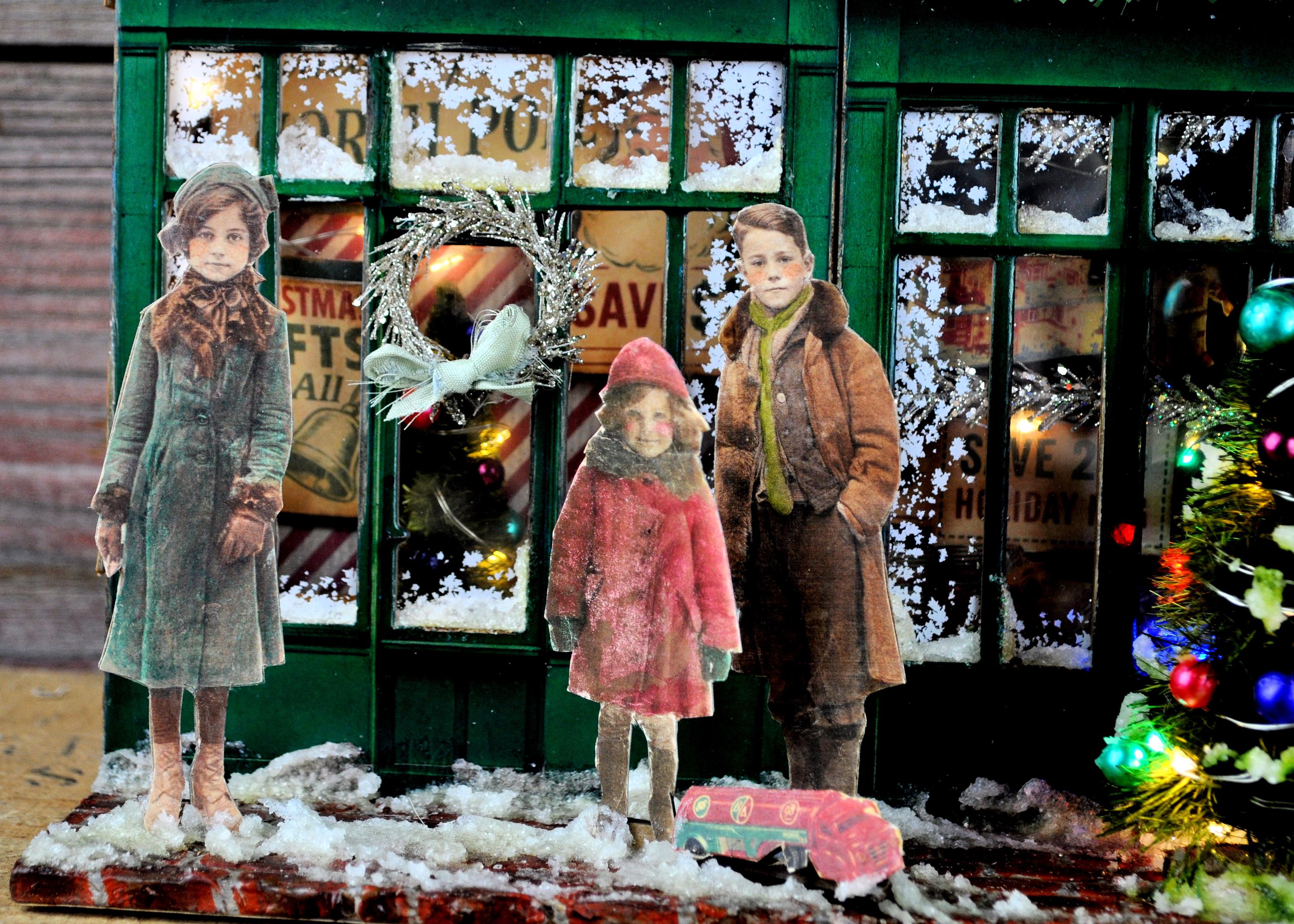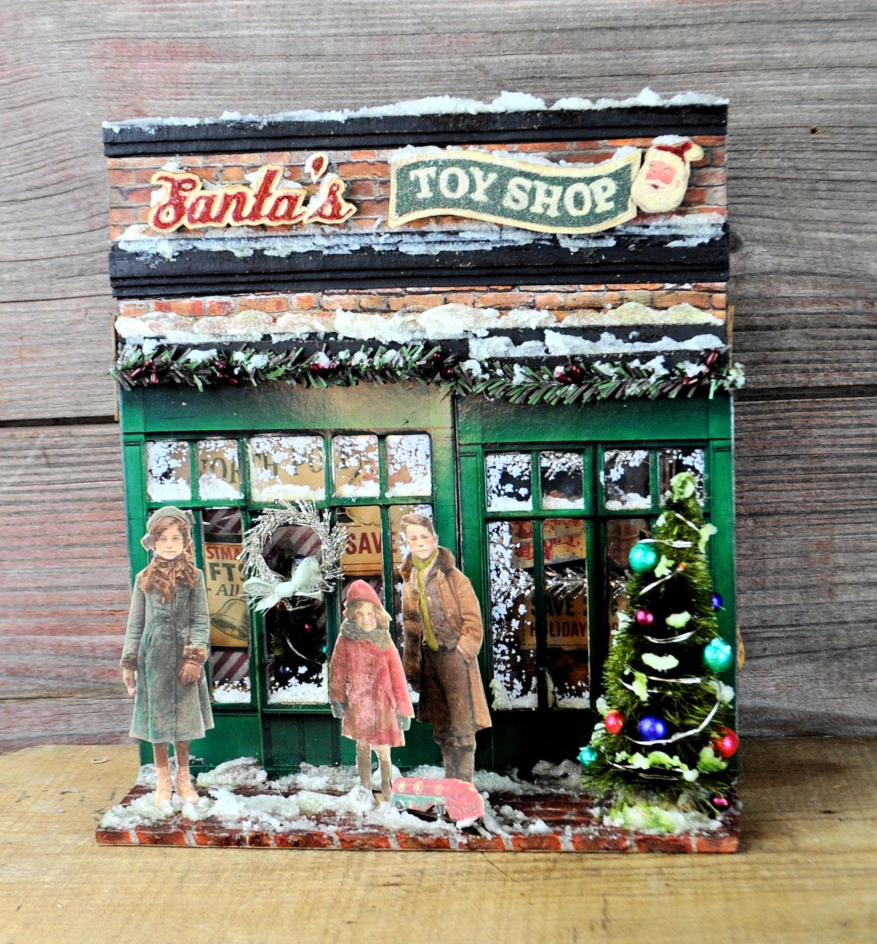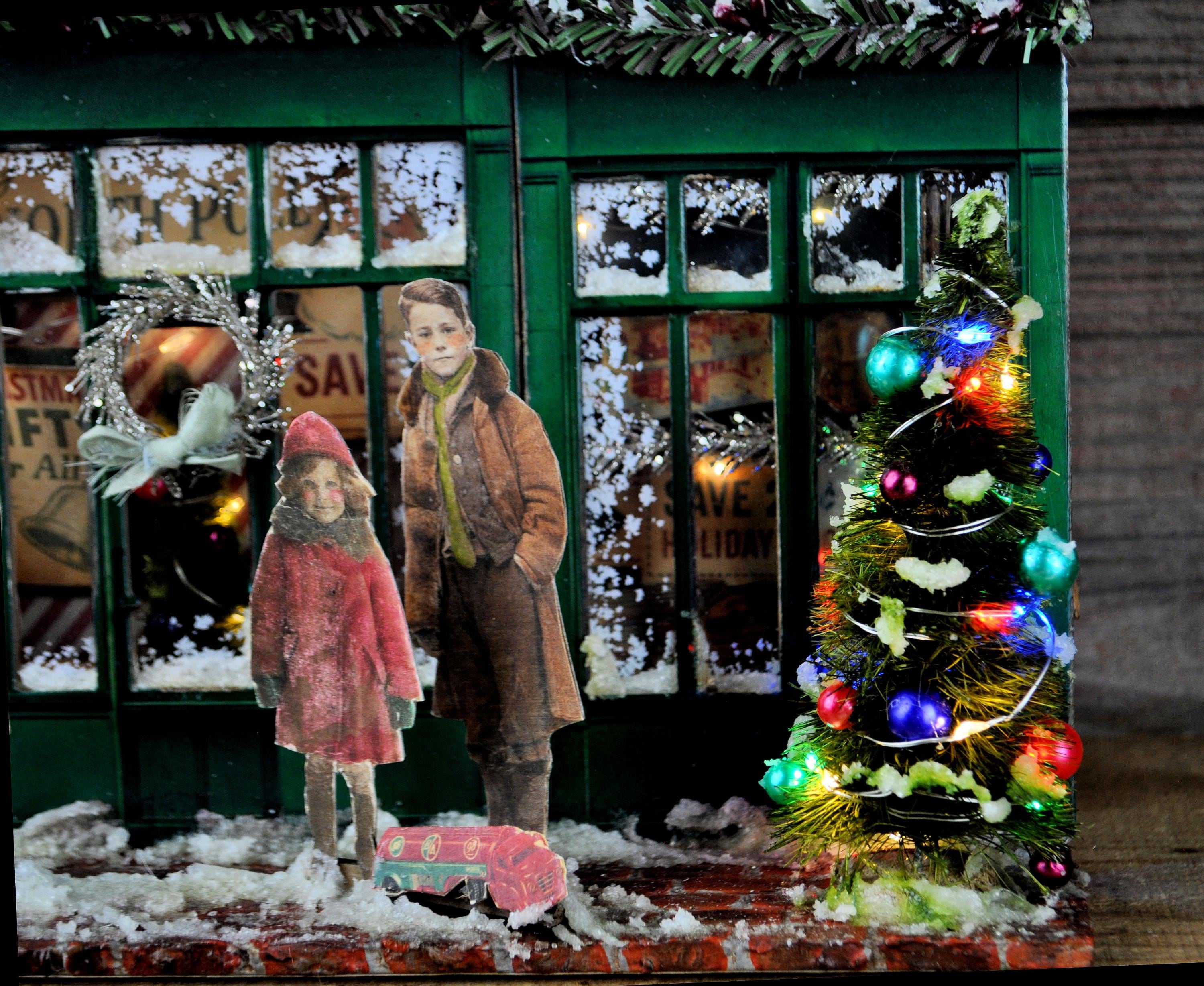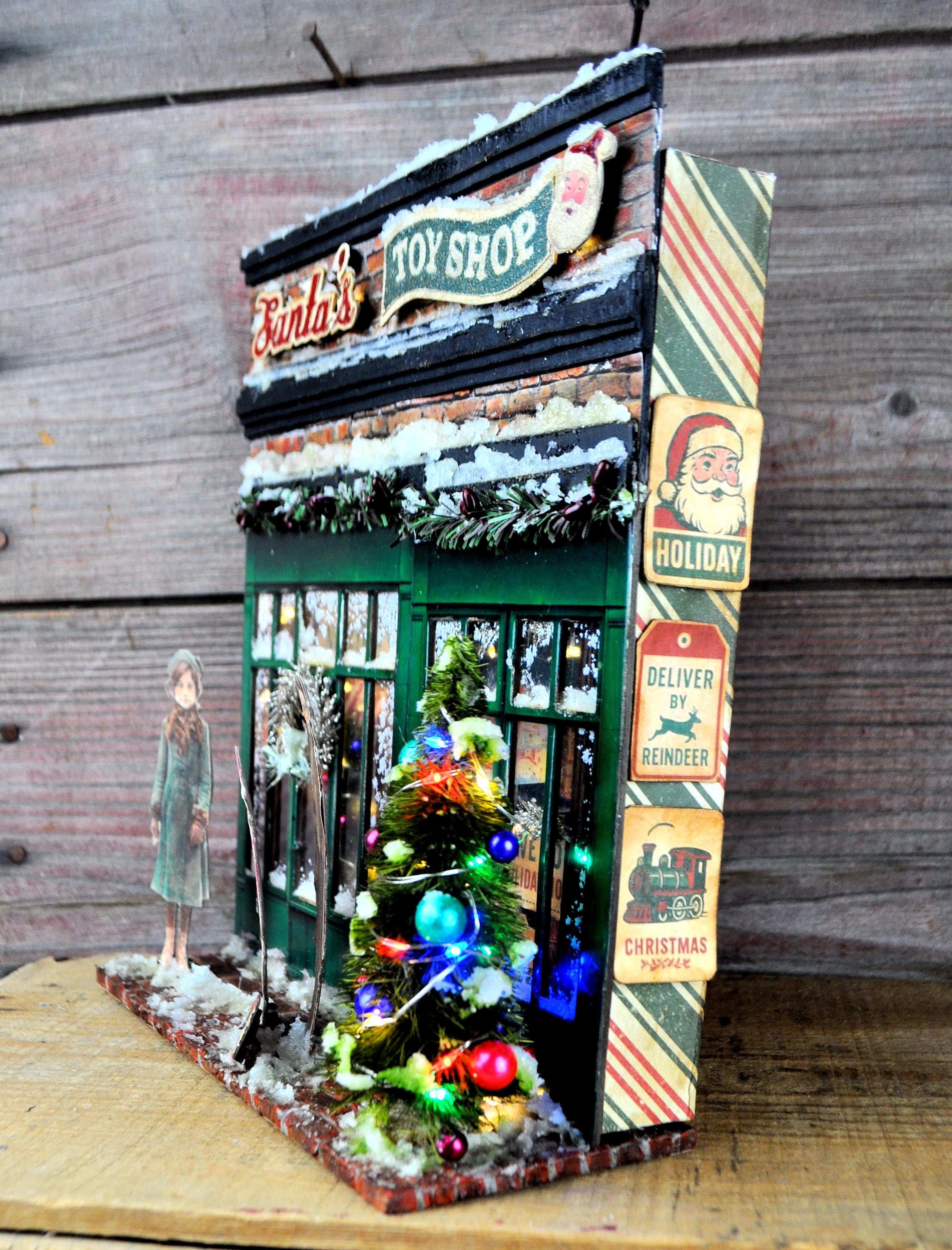 Barb Olson of Muddy Creek Primitives, designer and creator of unique handmade pieces is pleased to offer this primitive one-of-a-kind Christmas vignette display. Do you remember window shopping for Christmas toys as a child? This vignette will help to remind you of that special time. There is a handmade "Santa's Toy Shop" sign that is lighted from behind. The sidewalk has handmade looking bricks with snow. The three cardstock children in front are all bundled up and excited for Christmas. There is a small cardstock cutout truck by the boy. Inside there are all kinds of goodies. Signs everywhere, a bookshelf with cardstock toy cutouts, small lighted and decorated sisal tree and two gold reindeer. There is also a large sisal trees with lights and ball ornaments. The large one has a touch of snow on the branches. The windows have snow on the panes and there are faux greenery and small berries on the front of the store. On the front door is a silver wreath with a silk bow. There are all kinds of fun things to find in this vignette. There are also three sets of battery-operated tiny lights which are on the back of the box. This Christmas vignette measures 10 1/2" high x 9" wide x 3 1/2" deep. It will look perfect with all your prim Christmas decor.