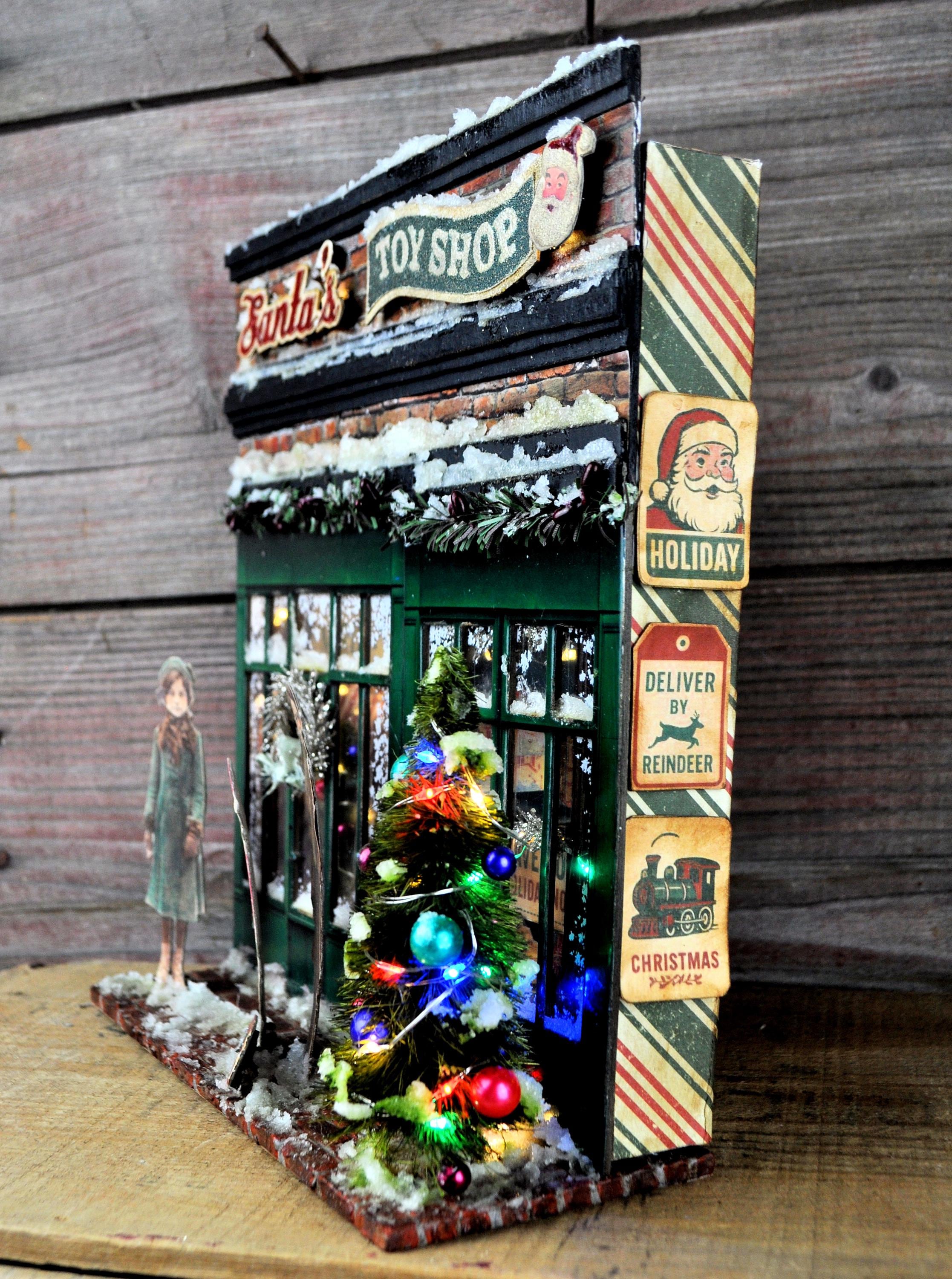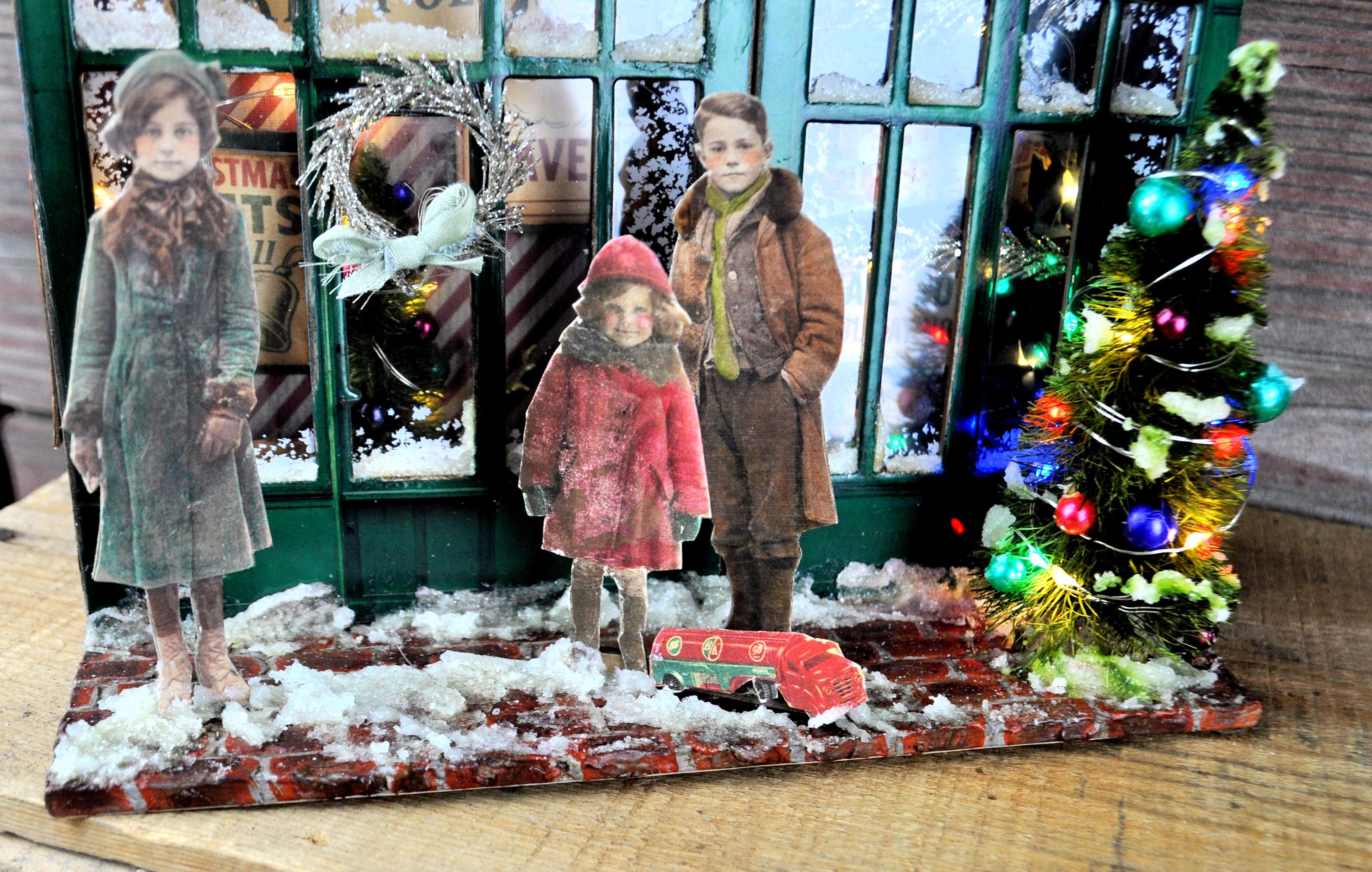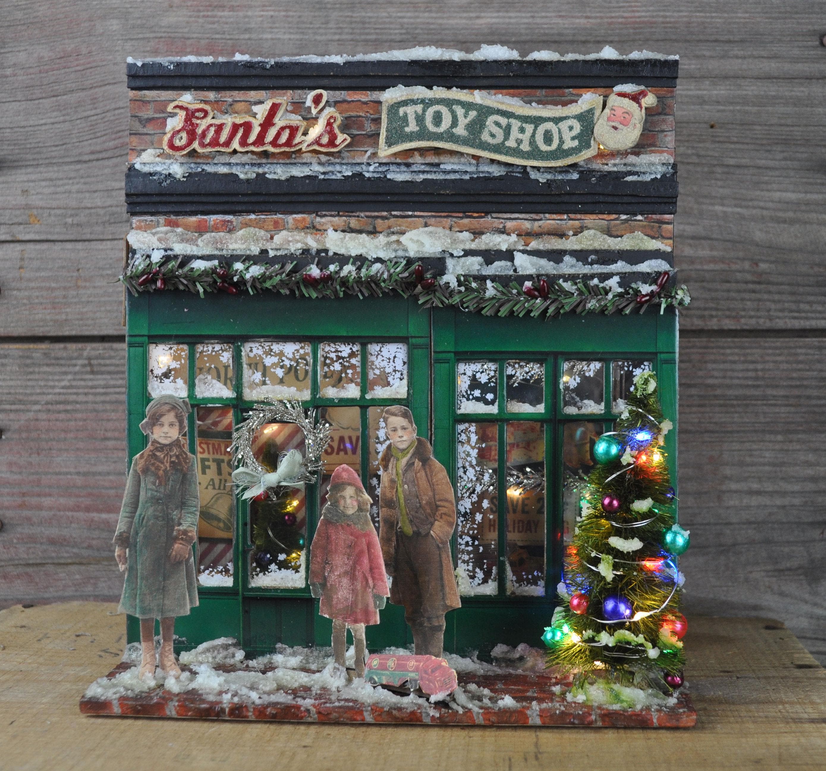 Barb Olson of Muddy Creek Primitives, designer and creator of unique handmade pieces is pleased to offer this primitive one-of-a-kind Christmas vignette display. Do you remember window shopping for Christmas toys as a child? This vignette will help to remind you of that special time. There is a handmade "Santa's Toy Shop" sign that is lighted from behind. The sidewalk has handmade looking bricks with snow. The three cardstock children in front are all bundled up and excited for Christmas. There is a small cardstock cutout truck by the boy. Inside there are all kinds of goodies. Signs everywhere, a bookshelf with cardstock toy cutouts, small lighted and decorated sisal tree and two gold reindeer. There is also a large sisal trees with lights and ball ornaments. The large one has a touch of snow on the branches. The windows have snow on the panes and there are faux greenery and small berries on the front of the store. On the front door is a silver wreath with a silk bow. There are all kinds of fun things to find in this vignette. There are also three sets of battery-operated tiny lights which are on the back of the box. This Christmas vignette measures 10 1/2" high x 9" wide x 3 1/2" deep. It will look perfect with all your prim Christmas decor.