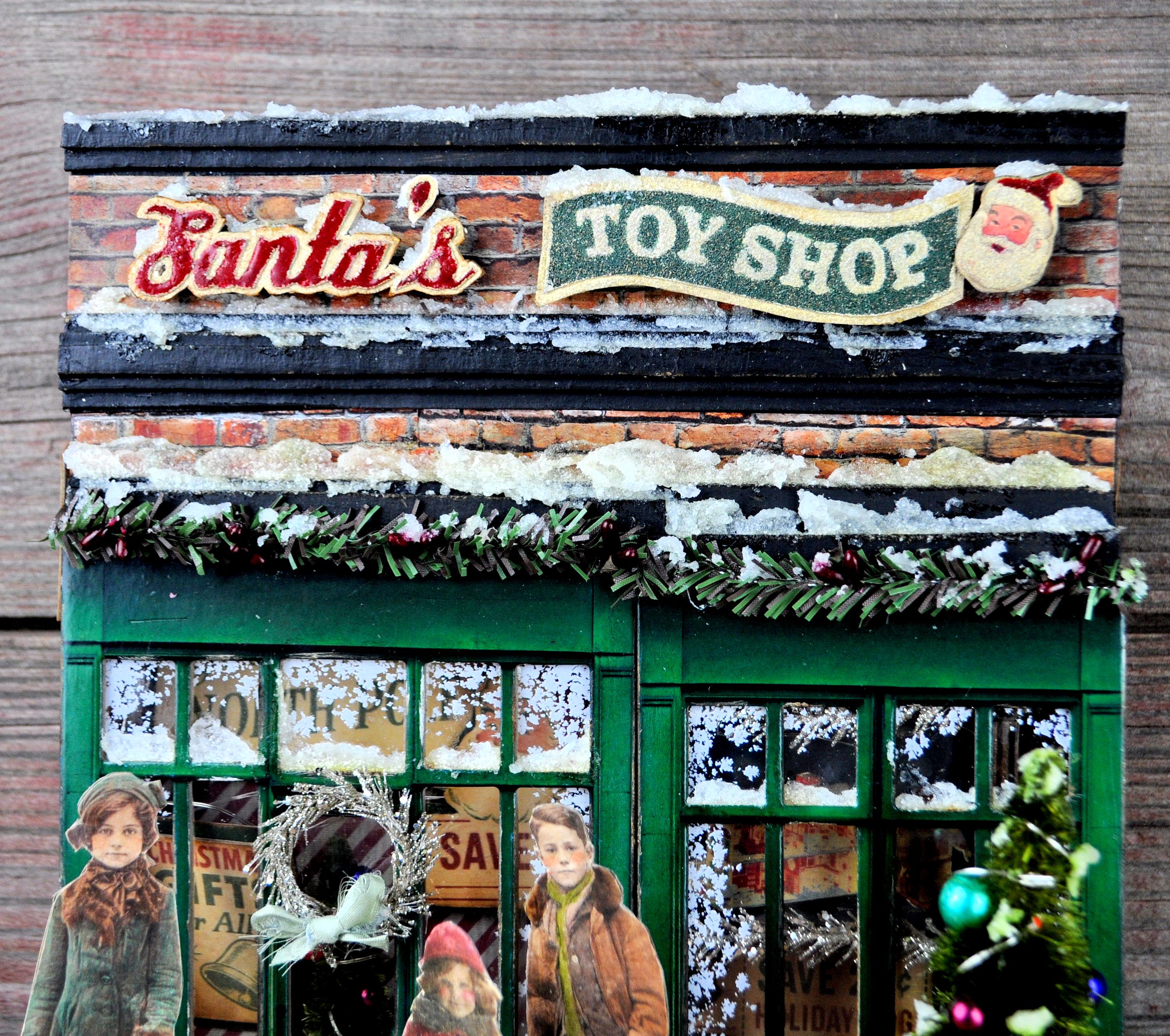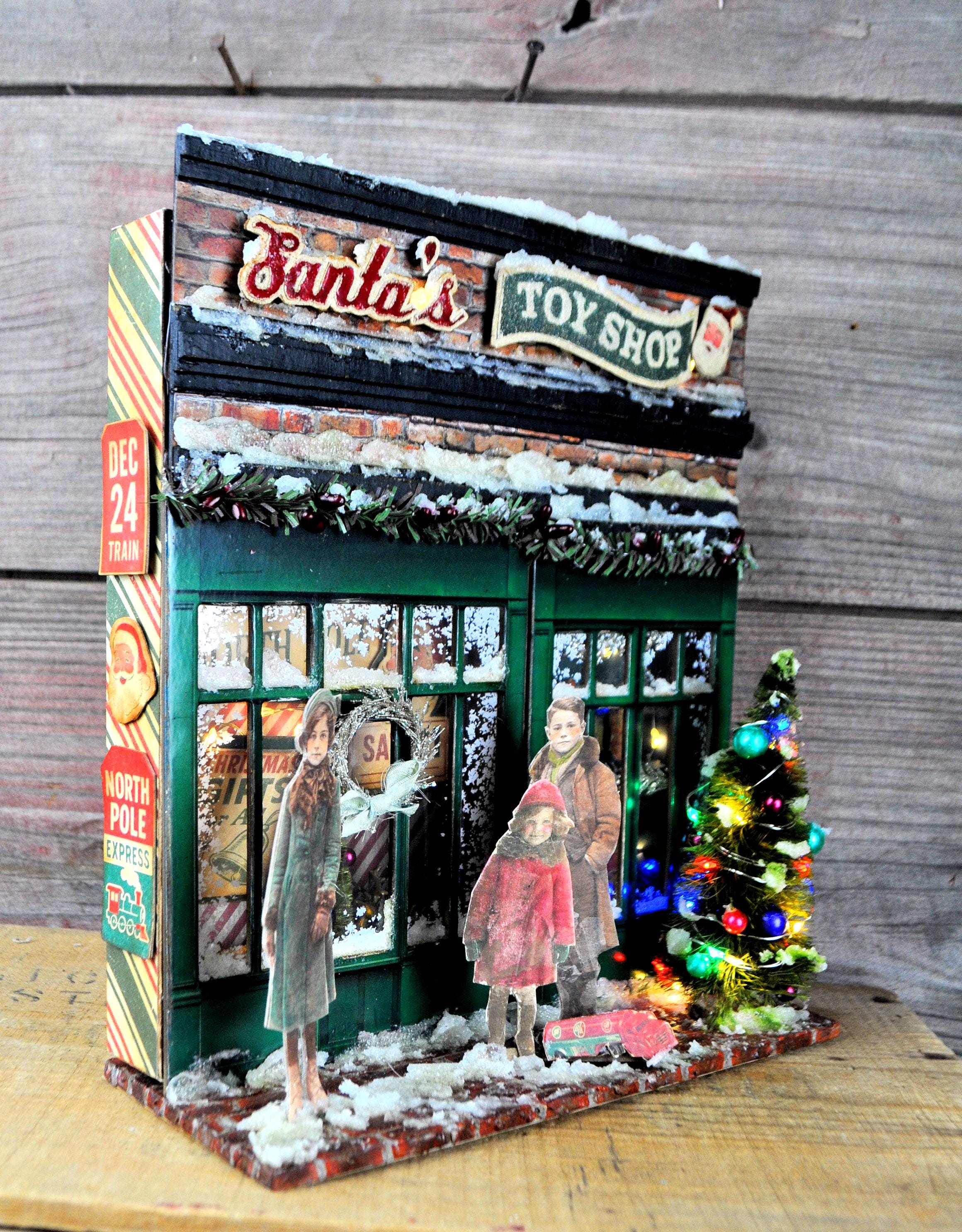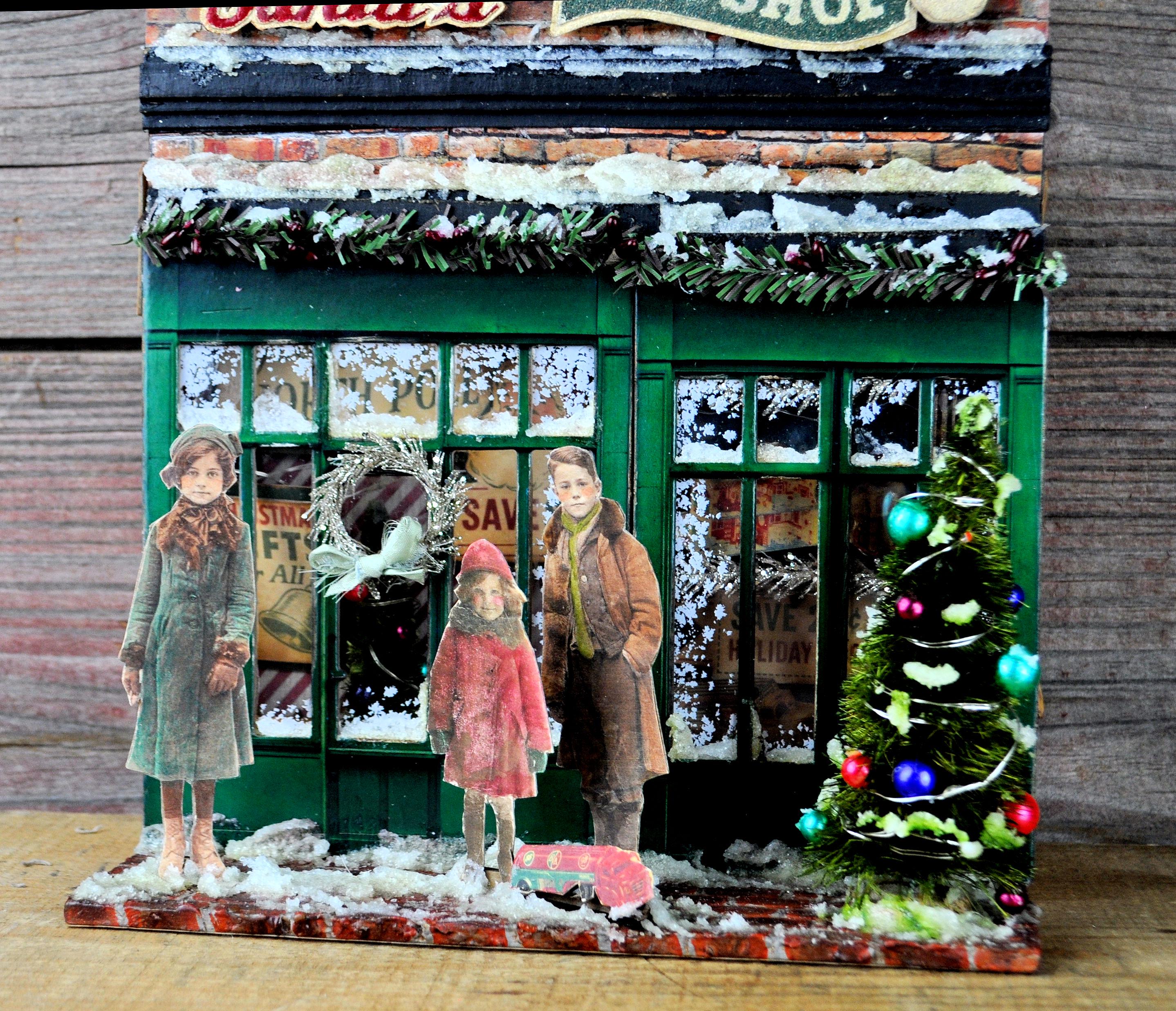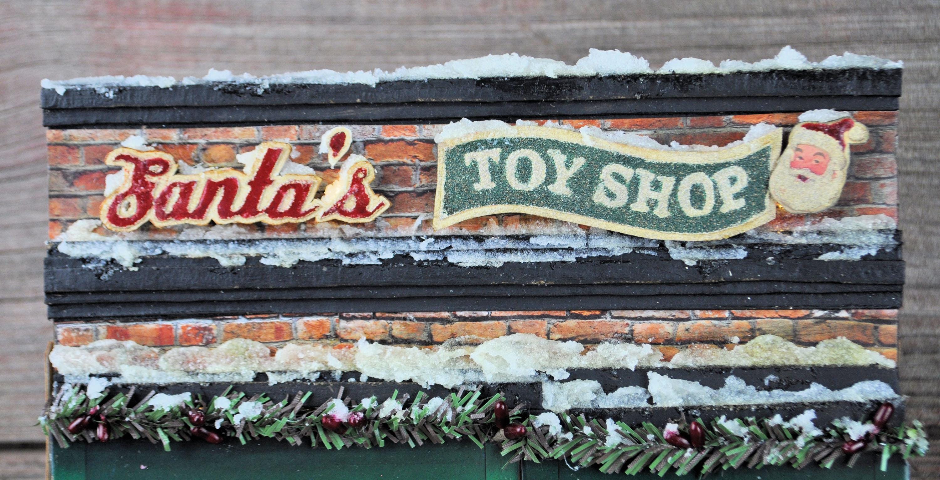 Barb Olson of Muddy Creek Primitives, designer and creator of unique handmade pieces is pleased to offer this primitive one-of-a-kind Christmas vignette display. Do you remember window shopping for Christmas toys as a child? This vignette will help to remind you of that special time. There is a handmade "Santa's Toy Shop" sign that is lighted from behind. The sidewalk has handmade looking bricks with snow. The three cardstock children in front are all bundled up and excited for Christmas. There is a small cardstock cutout truck by the boy. Inside there are all kinds of goodies. Signs everywhere, a bookshelf with cardstock toy cutouts, small lighted and decorated sisal tree and two gold reindeer. There is also a large sisal trees with lights and ball ornaments. The large one has a touch of snow on the branches. The windows have snow on the panes and there are faux greenery and small berries on the front of the store. On the front door is a silver wreath with a silk bow. There are all kinds of fun things to find in this vignette. There are also three sets of battery-operated tiny lights which are on the back of the box. This Christmas vignette measures 10 1/2" high x 9" wide x 3 1/2" deep. It will look perfect with all your prim Christmas decor.