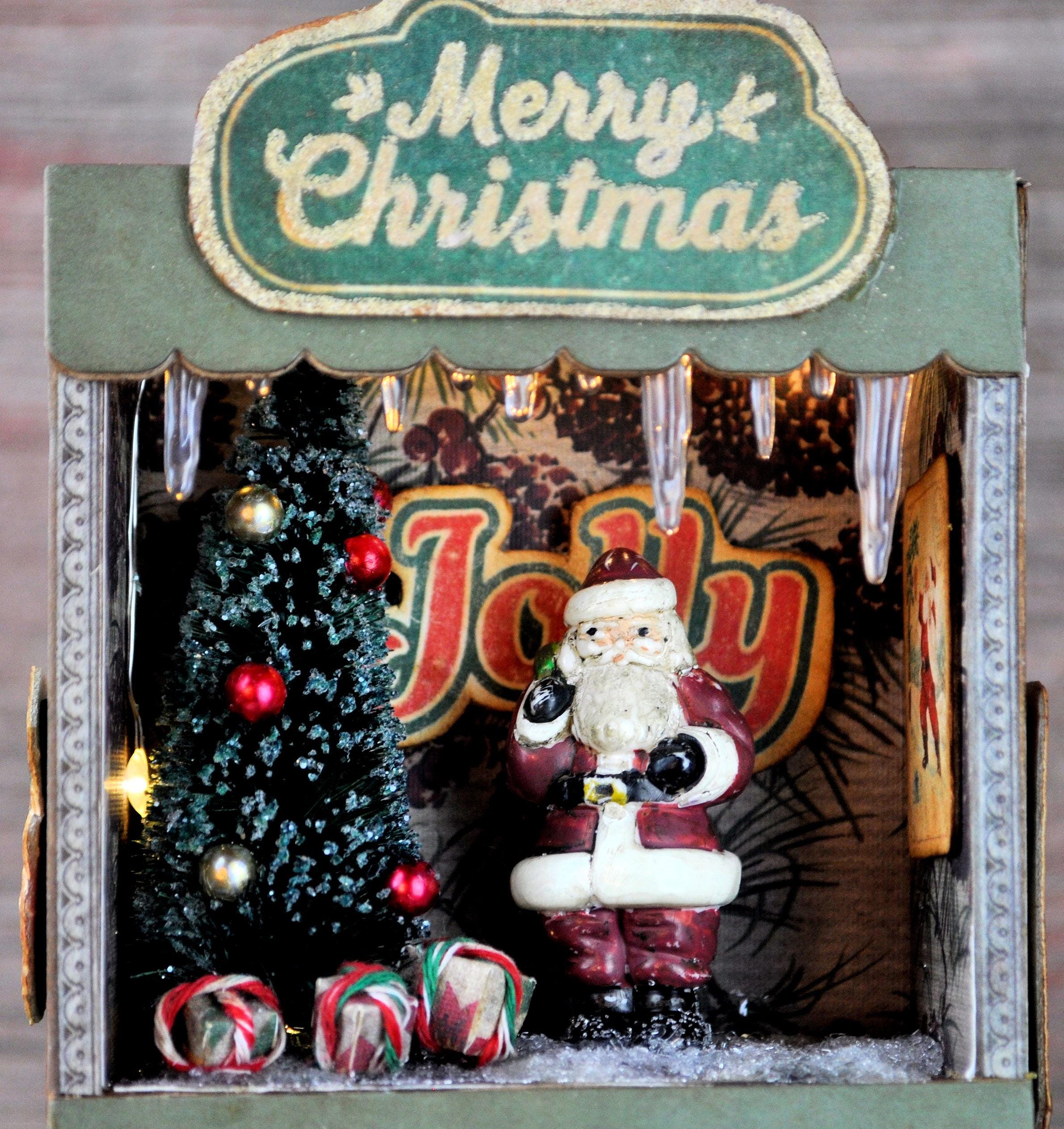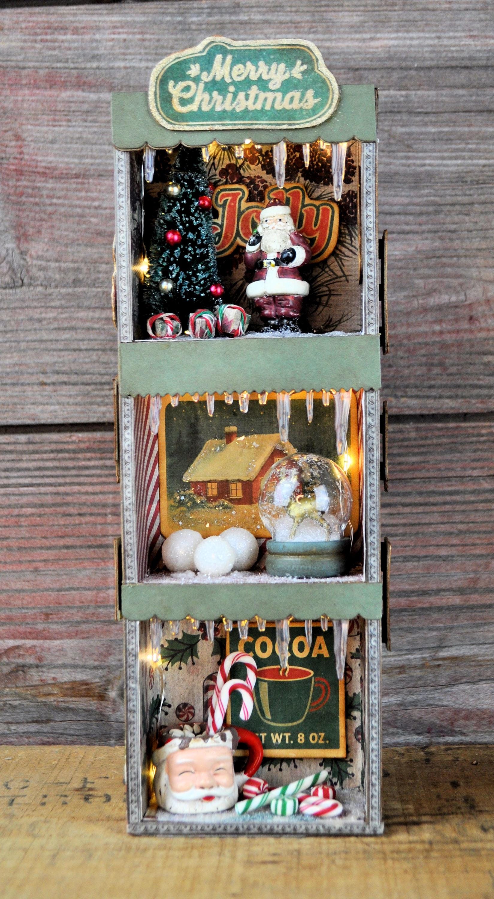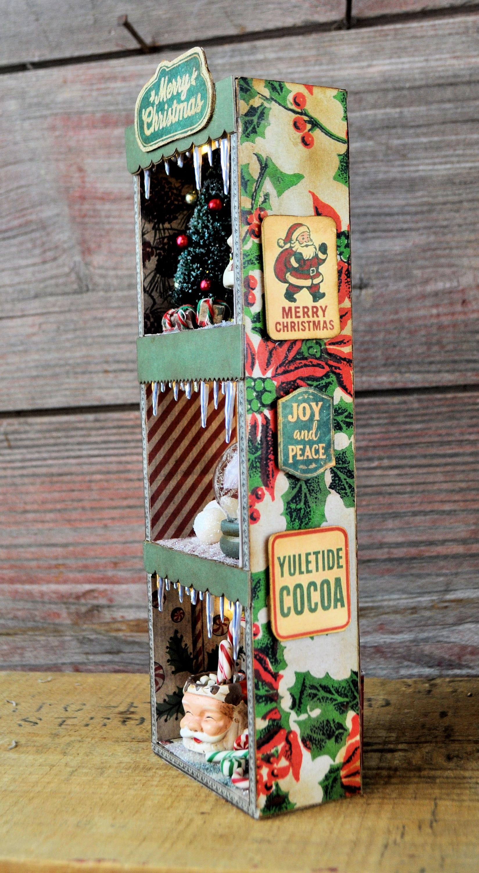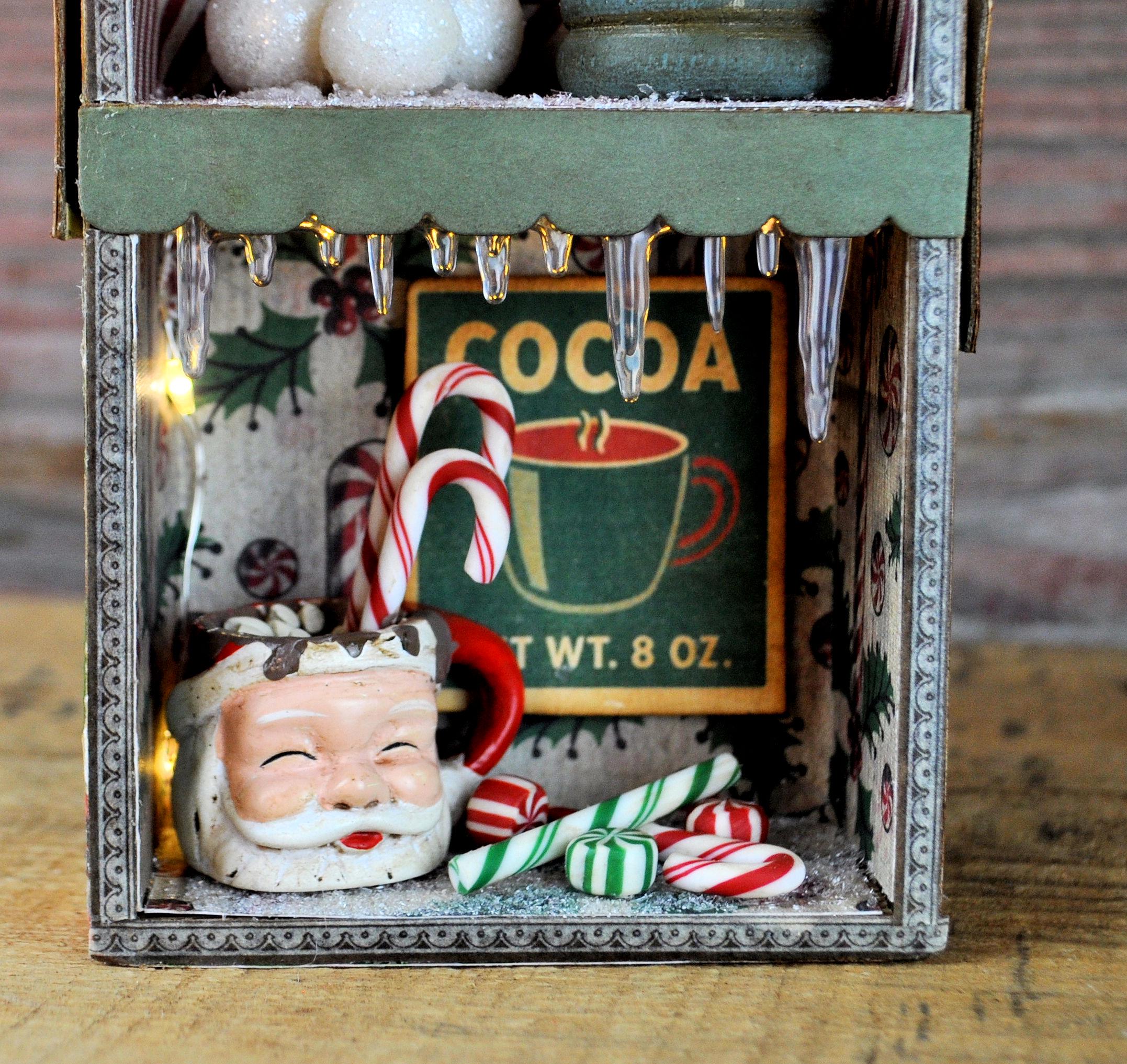Barb Olson of Muddy Creek Primitives, designer and creator of unique handmade pieces is pleased to offer this primitive one-of--kind Christmas vignette display. This fun Christmas box has a little of everything fun for the holiday. It is covered in vintage looking cardstock. There is a small Santa mug filled with cocoa dripping over the sides and tiny marshmallows. It also has two candy canes and more faux candies beside the mug. There is a hot cocoa sign in the back. In the middle is a snow globe with a small gold reindeer inside. There are also 3 faux snowballs and a winter cardstock scene in the back. On the top shelf is a small resin hand painted Santa. Beside him is a decorated sisal tree with small, wrapped packages underneath. There is a set of battery-operated tiny lights in white that wind throughout the box. There are faux icicles and a decorative trim on each shelf. Each shelf has faux snow also. The Merry Christmas sign at the top has embossed lettering and border. This Christmas vignette measures 10 3/4"" x 3 1/2" x 1 3/4". It will look perfect with all your winter prim decor.
