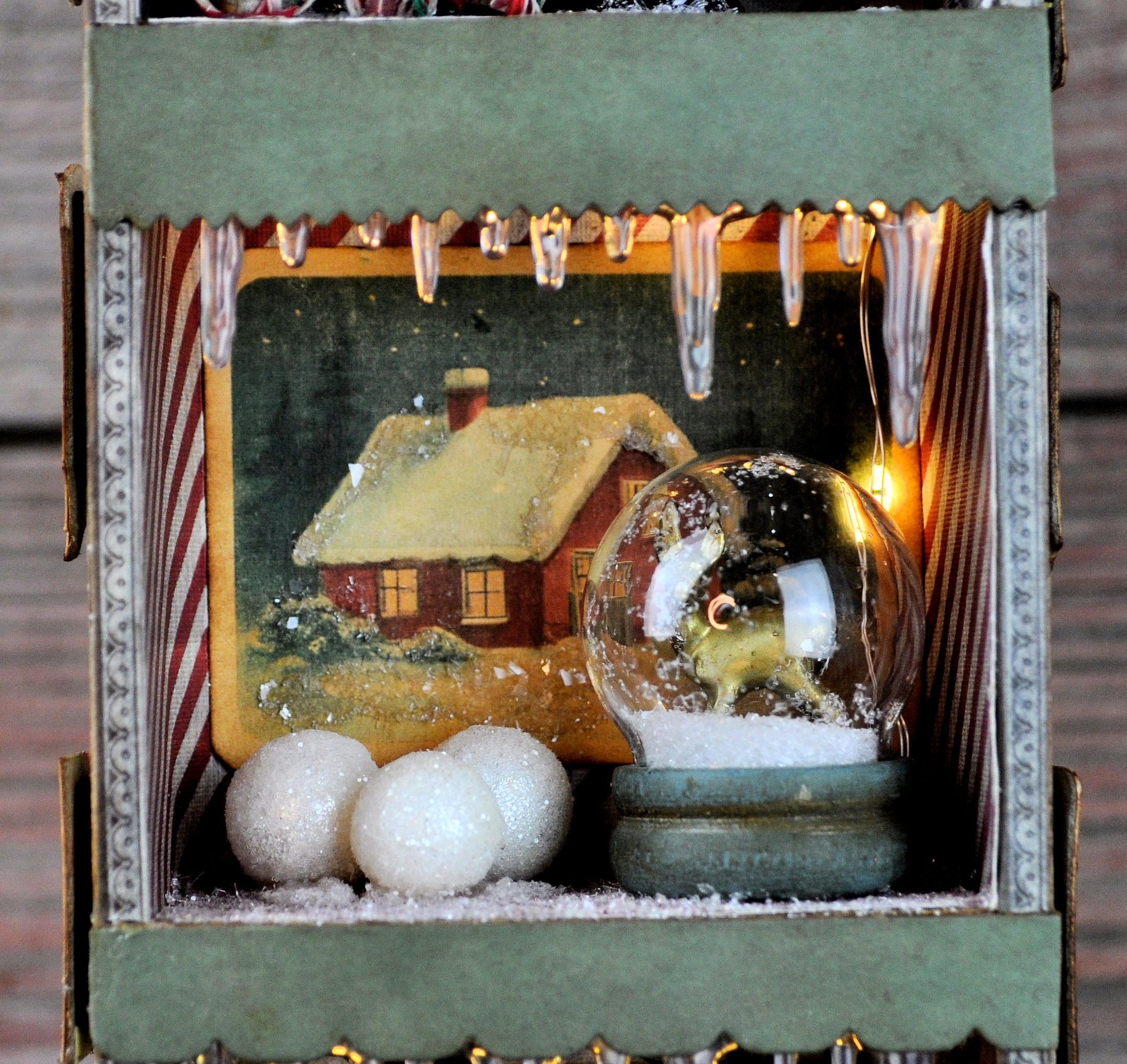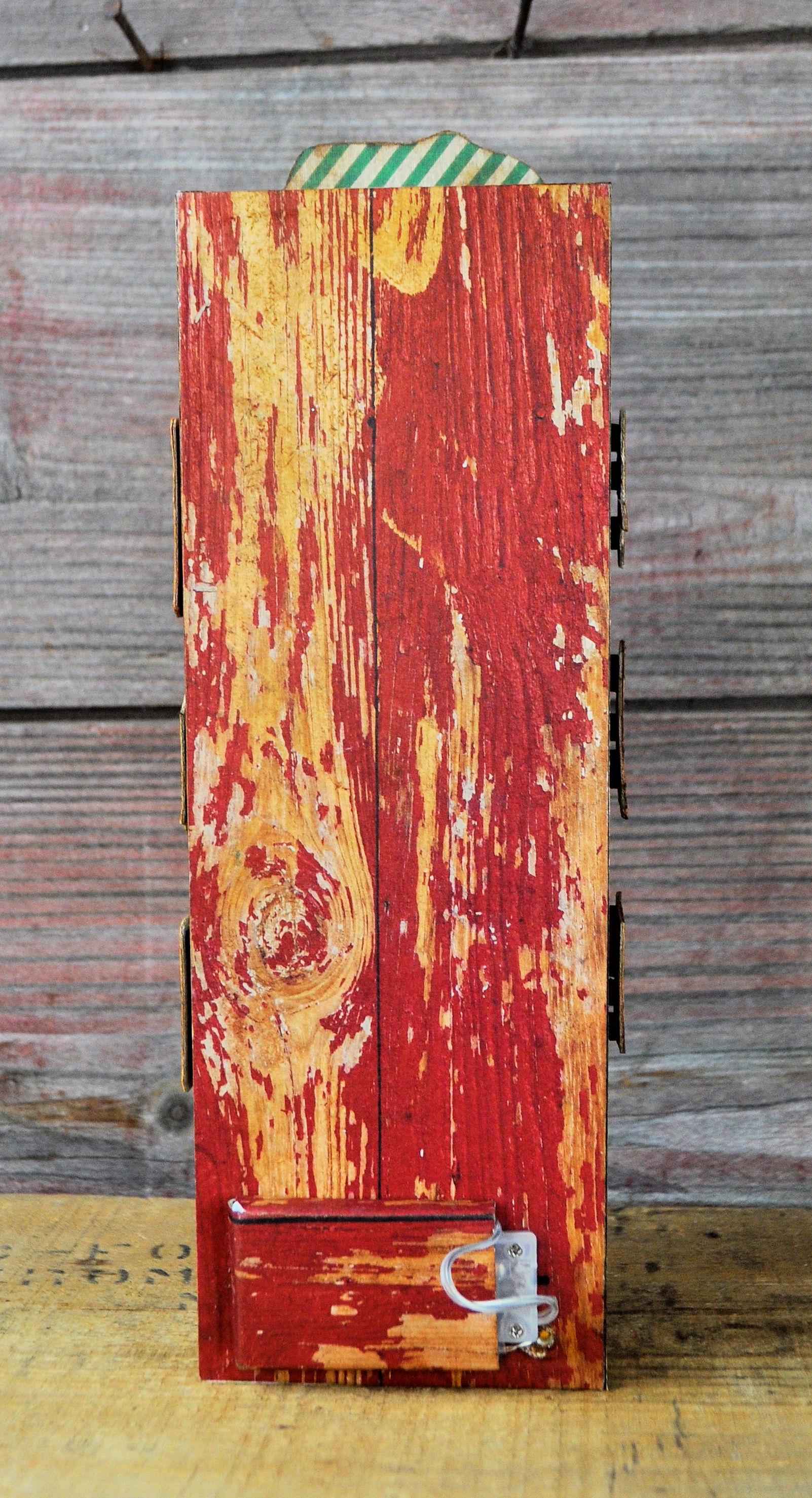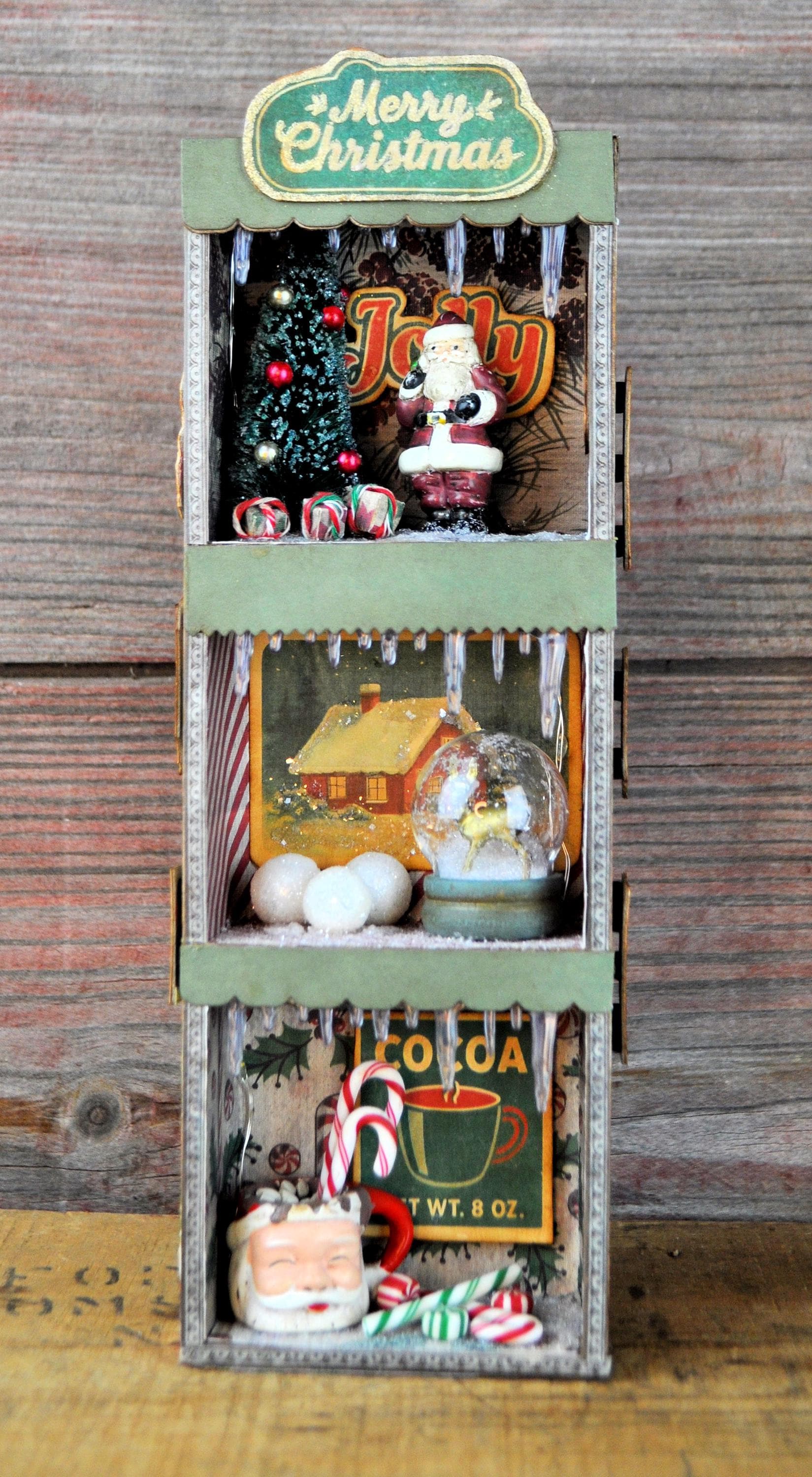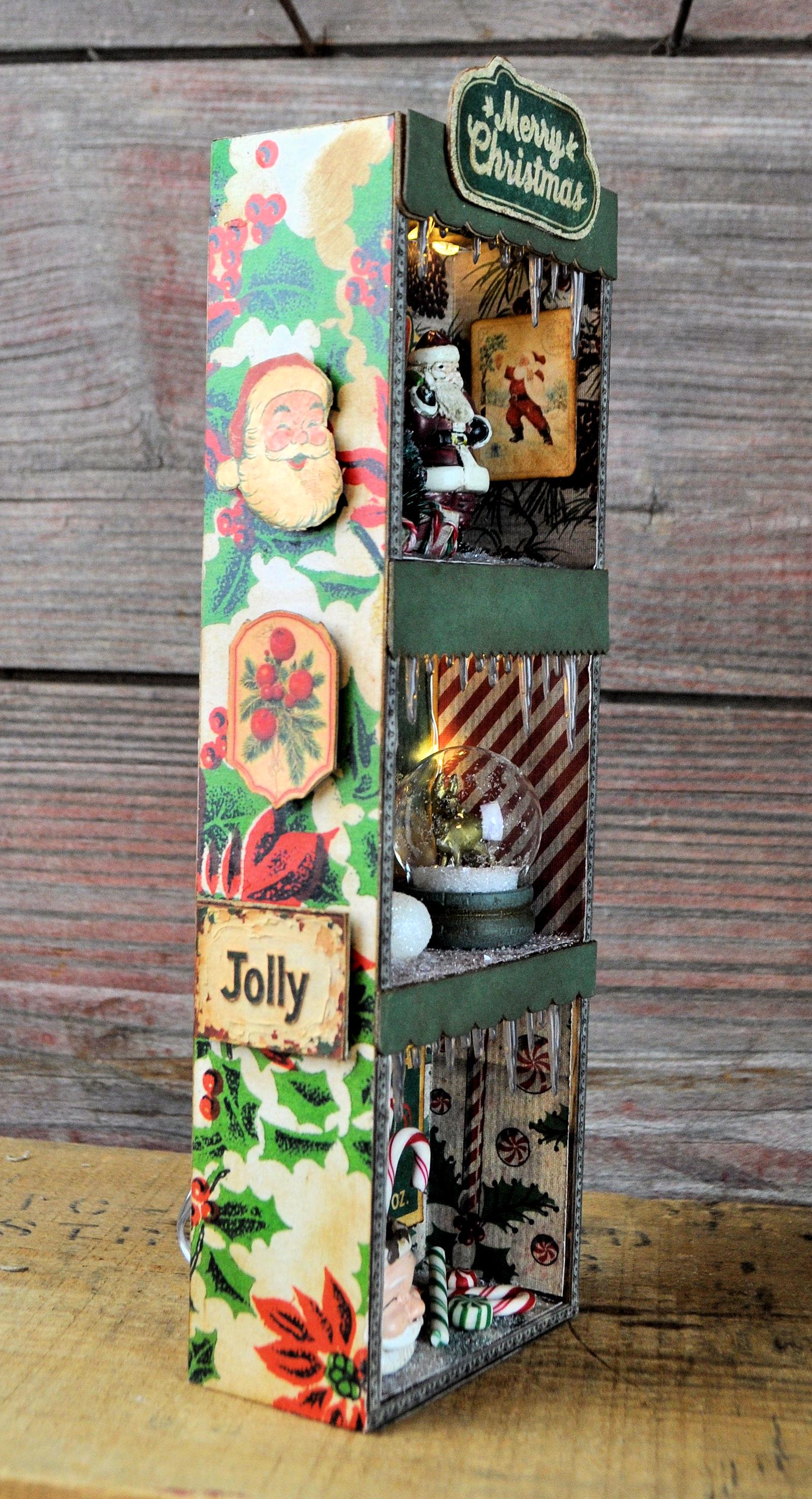 Barb Olson of Muddy Creek Primitives, designer and creator of unique handmade pieces is pleased to offer this primitive one-of--kind Christmas vignette display. This fun Christmas box has a little of everything fun for the holiday. It is covered in vintage looking cardstock. There is a small Santa mug filled with cocoa dripping over the sides and tiny marshmallows. It also has two candy canes and more faux candies beside the mug. There is a hot cocoa sign in the back. In the middle is a snow globe with a small gold reindeer inside. There are also 3 faux snowballs and a winter cardstock scene in the back. On the top shelf is a small resin hand painted Santa. Beside him is a decorated sisal tree with small, wrapped packages underneath. There is a set of battery-operated tiny lights in white that wind throughout the box. There are faux icicles and a decorative trim on each shelf. Each shelf has faux snow also. The Merry Christmas sign at the top has embossed lettering and border. This Christmas vignette measures 10 3/4"" x 3 1/2" x 1 3/4". It will look perfect with all your winter prim decor.