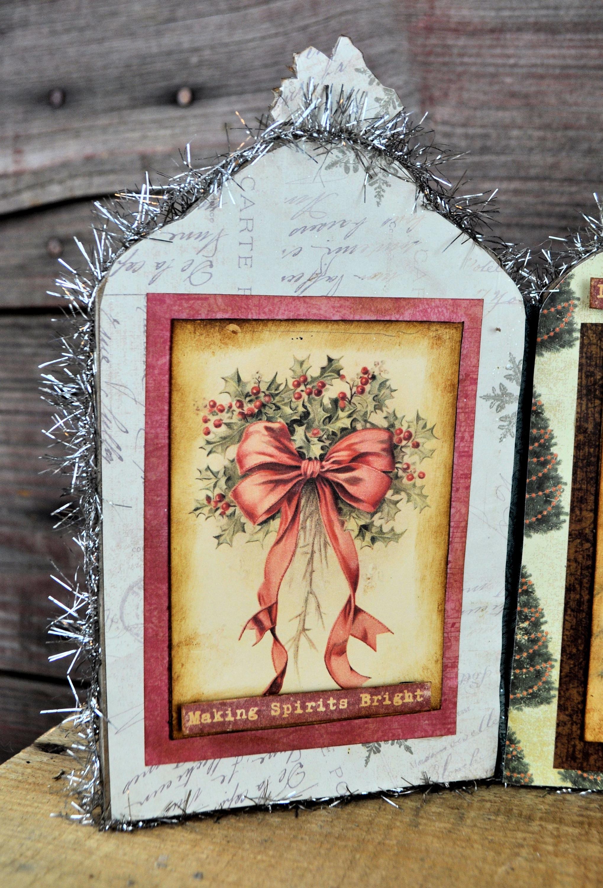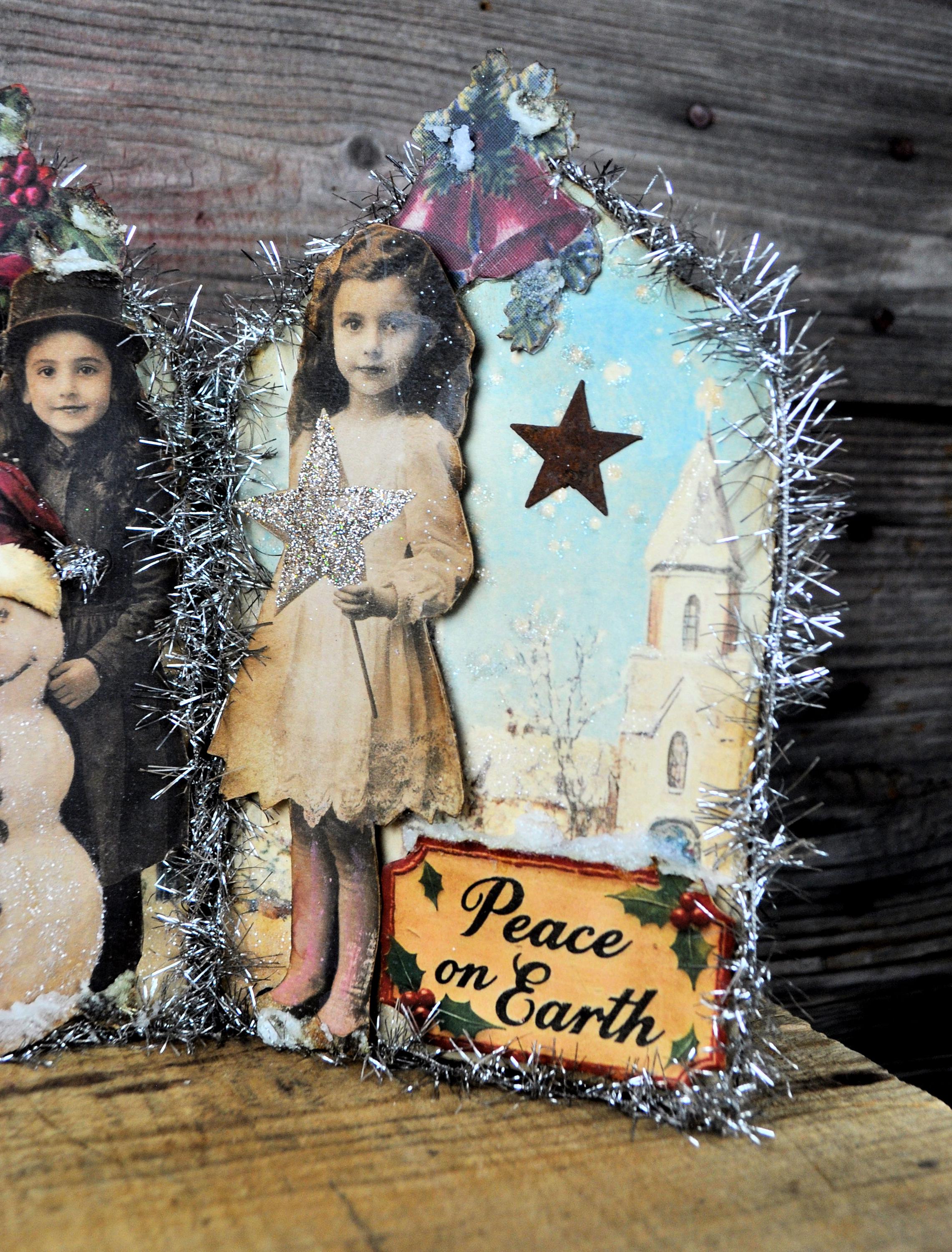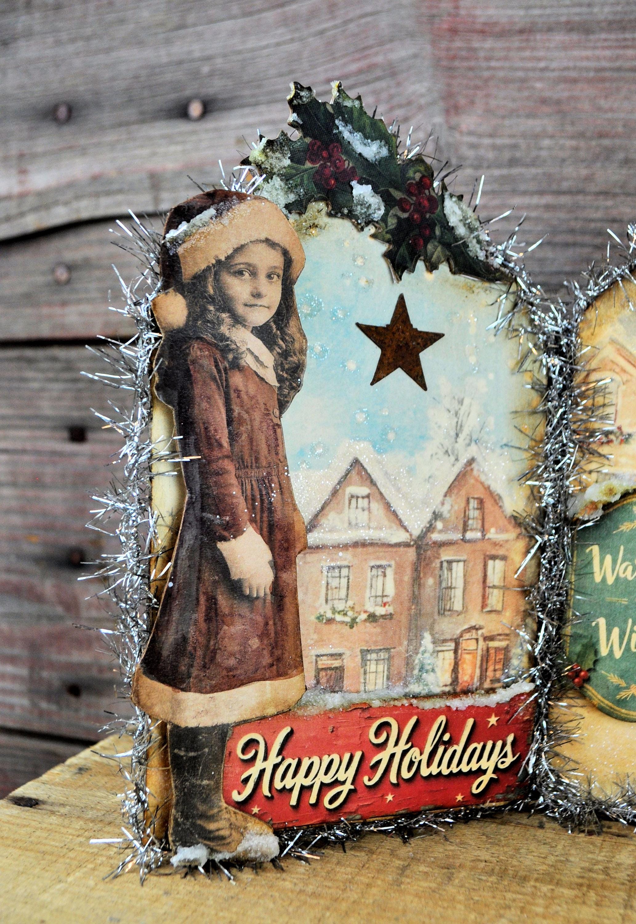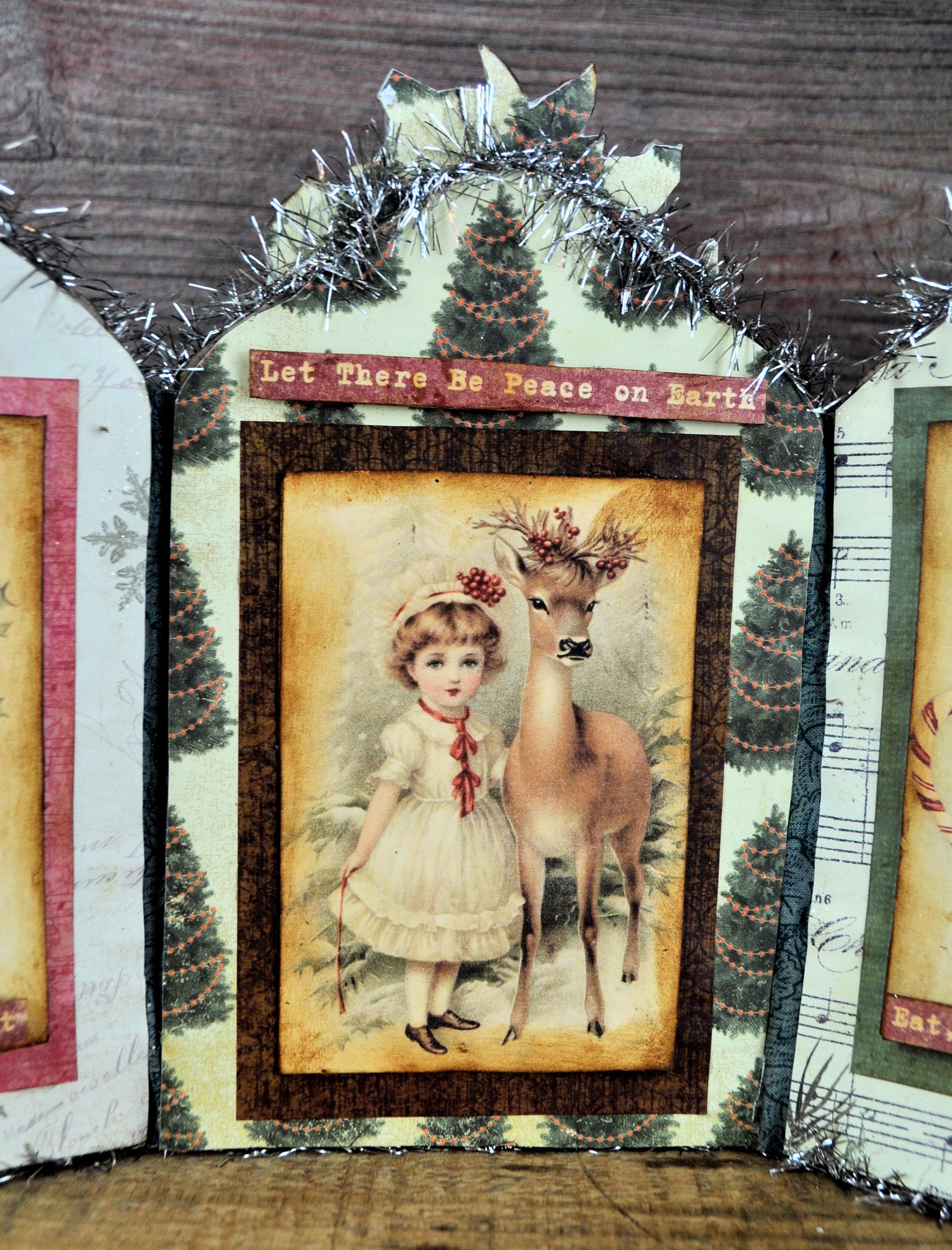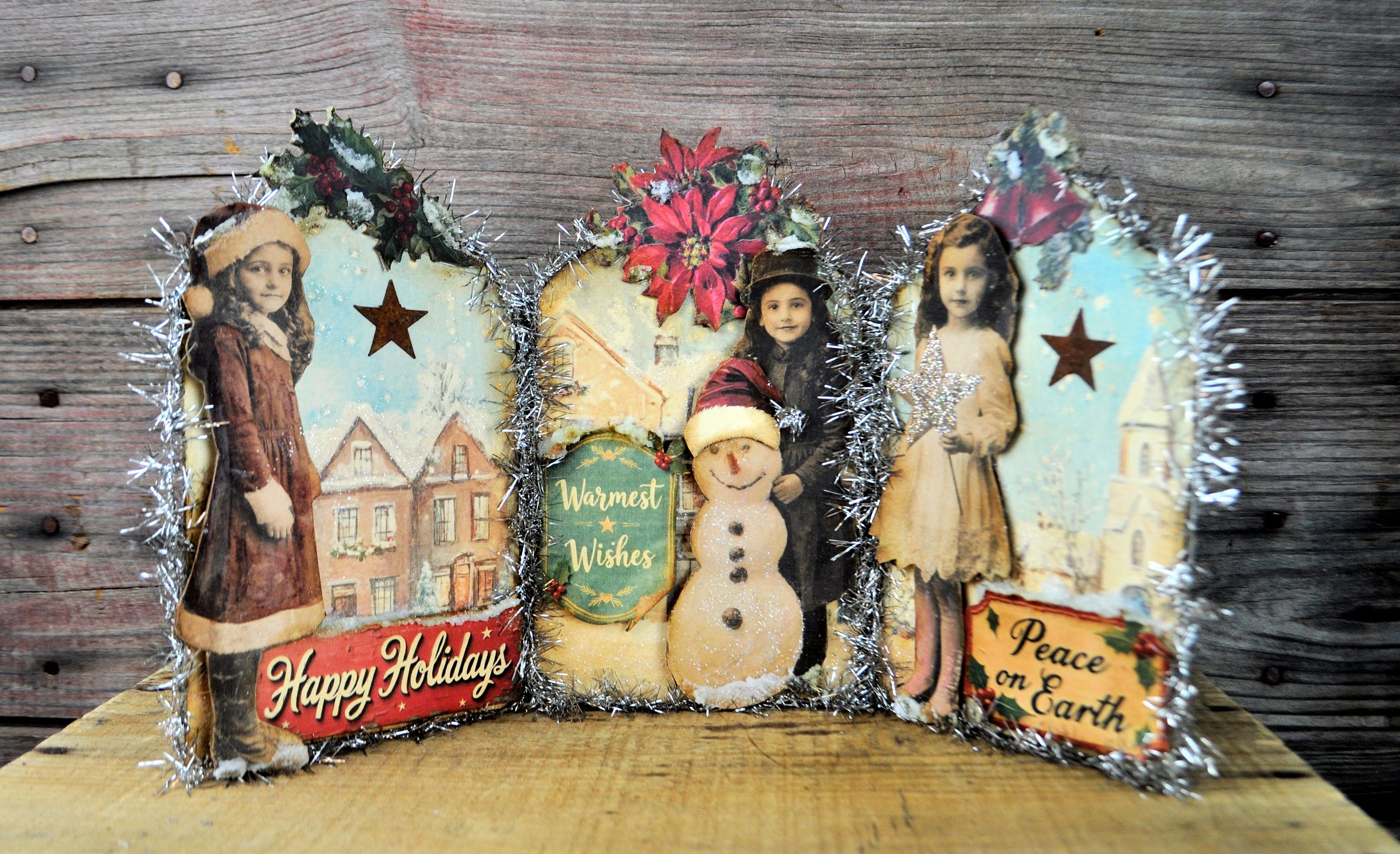 Barb Olson of Muddy Creek Primitives, designer and creator of unique handmade pieces is pleased to offer this primitive one-of-a-kind Christmas/Winter Trifold Collage. This trifold has Christmas girls dressed warmly for winter. Each panel has a phrase and lots of glitter and a poinsettia at the top. Two of them have a rusty star. They are all trimmed with silver tinsel garland. The back is also decorated with Christmas and winter graphics. This Christmas collage measures 14" x 8 ". It will look perfect sitting on a mantle or your desk with all your prim decor.