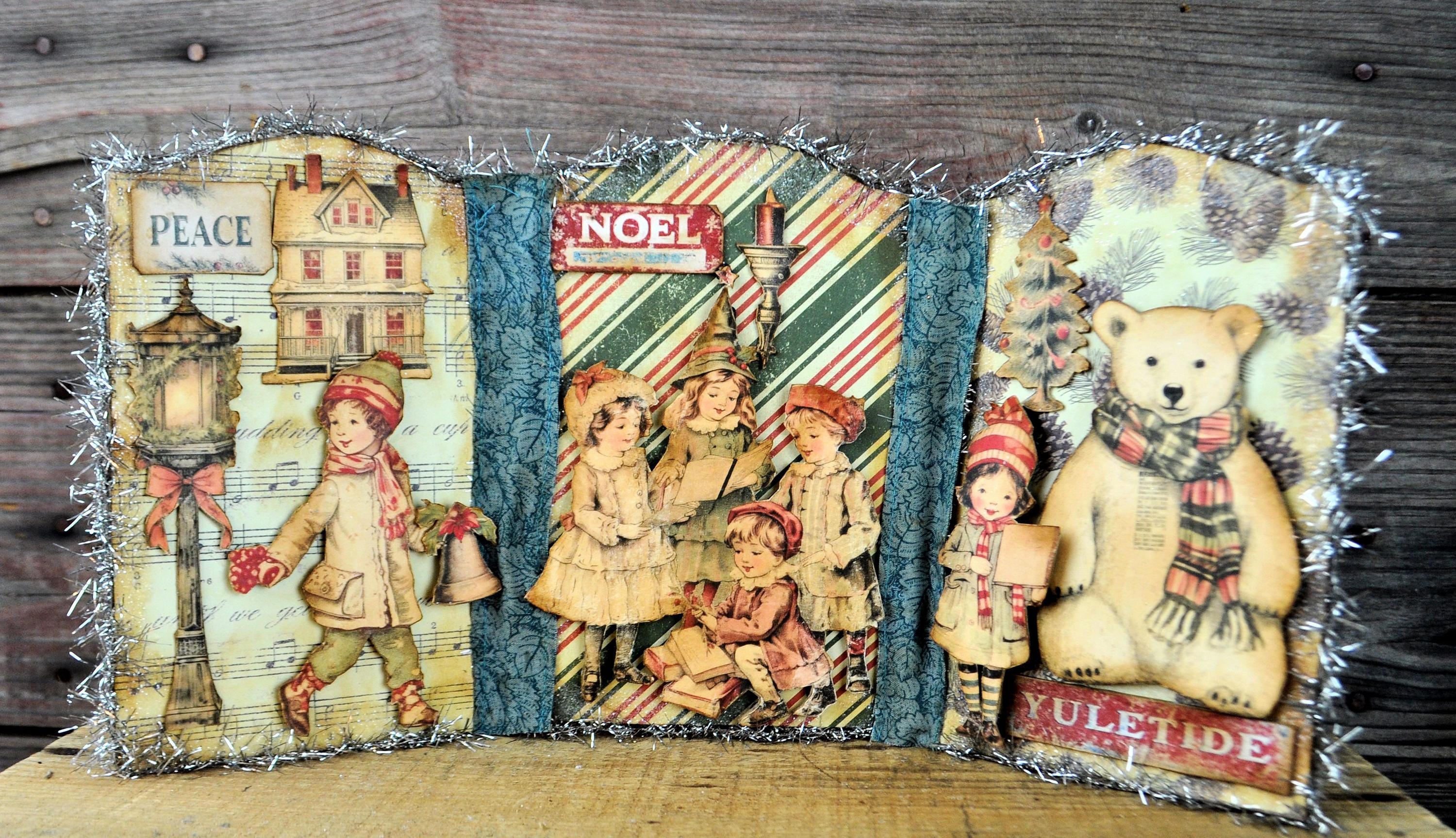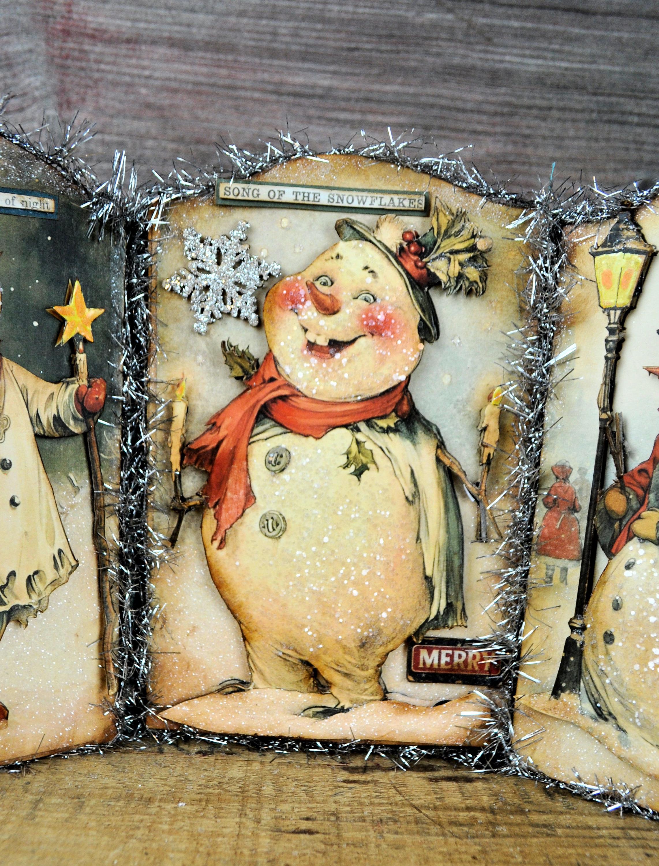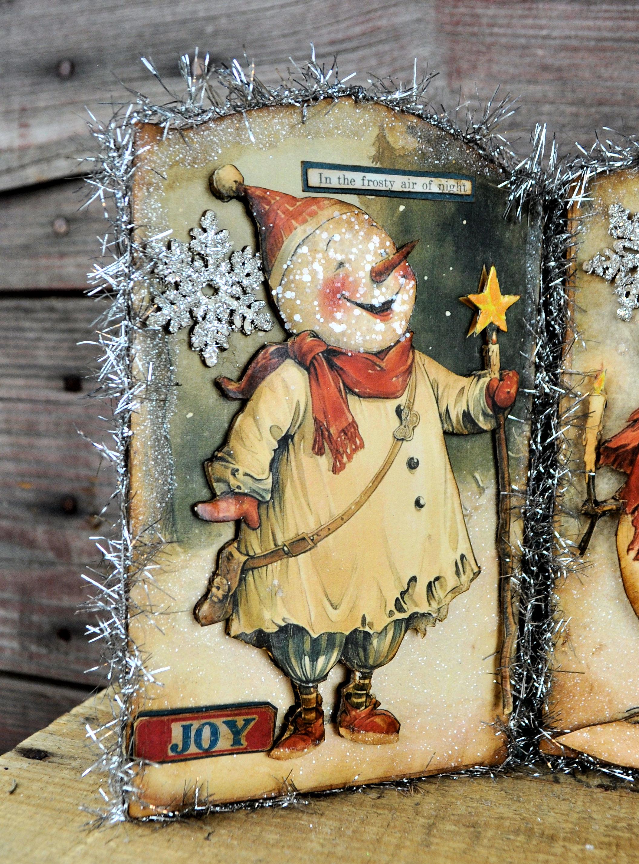 Barb Olson of Muddy Creek Primitives, designer and creator of unique handmade pieces is pleased to offer this primitive one-of-a-kind Christmas/Winter Trifold Collage. This trifold has three different snowmen activities images and sprinkled with lots of glitter. They are all trimmed with silver tinsel garland. The back is also decorated with winter graphics. This Christmas collage measures 14 " x 7 ". It will look perfect sitting on a mantle or your desk with all your prim decor.