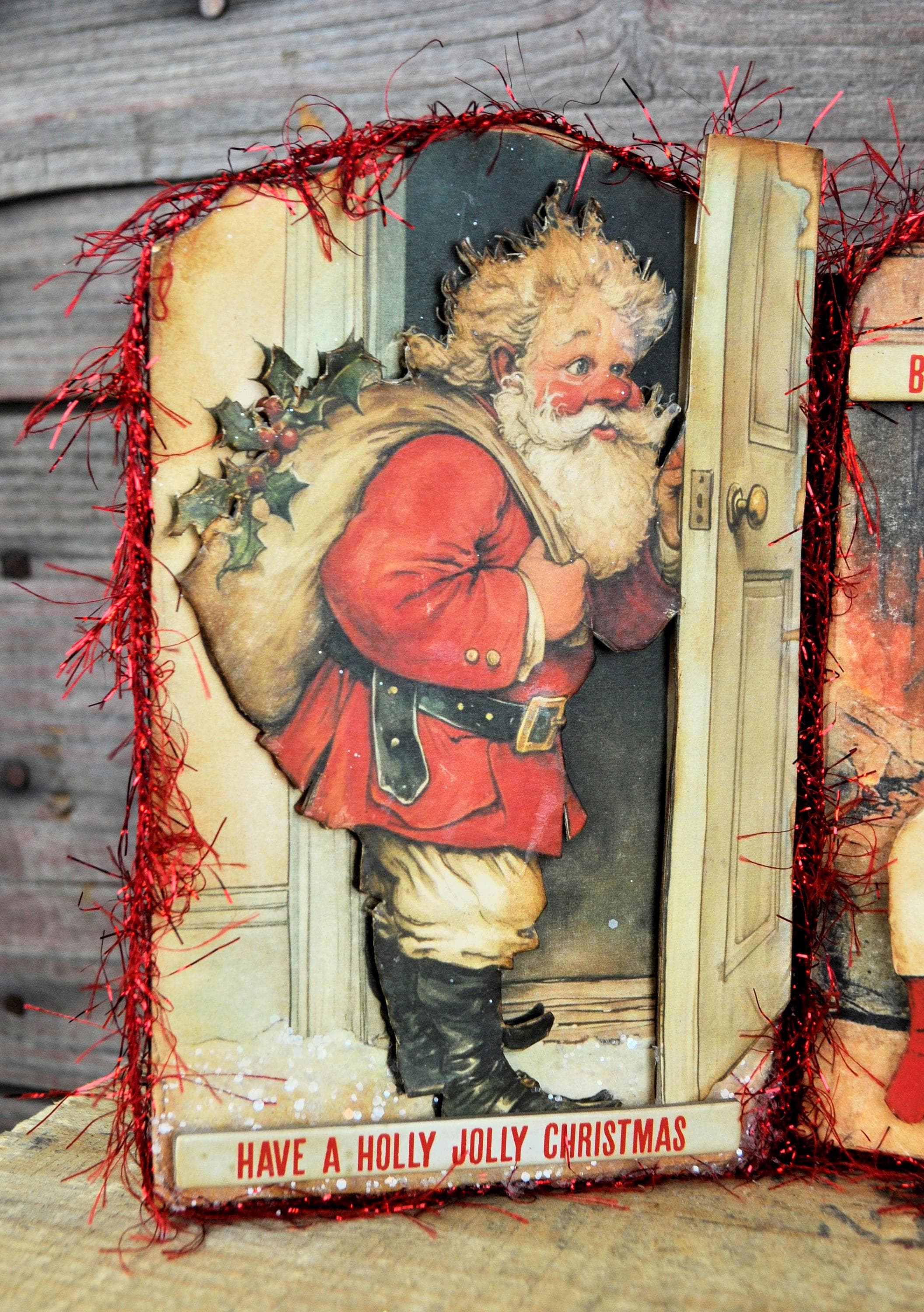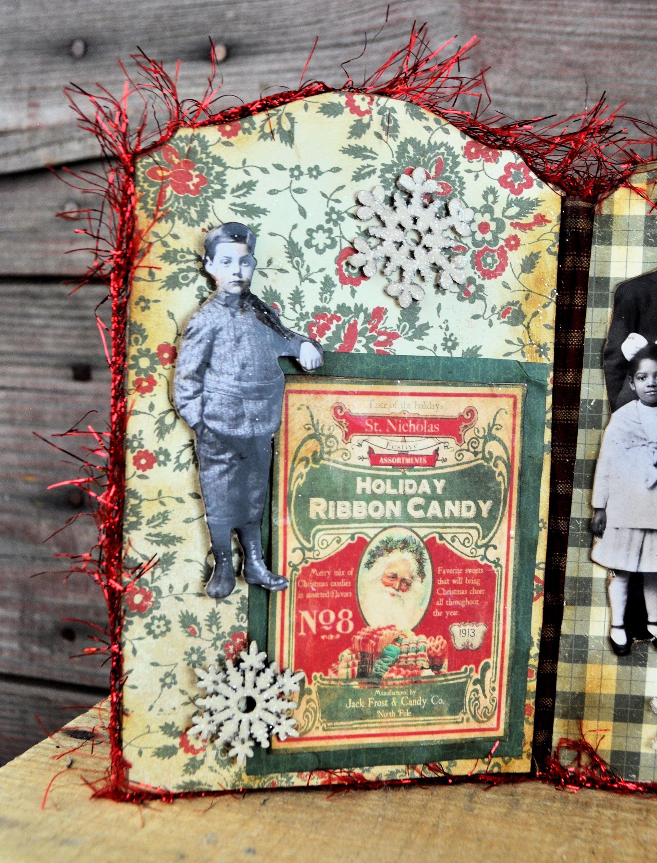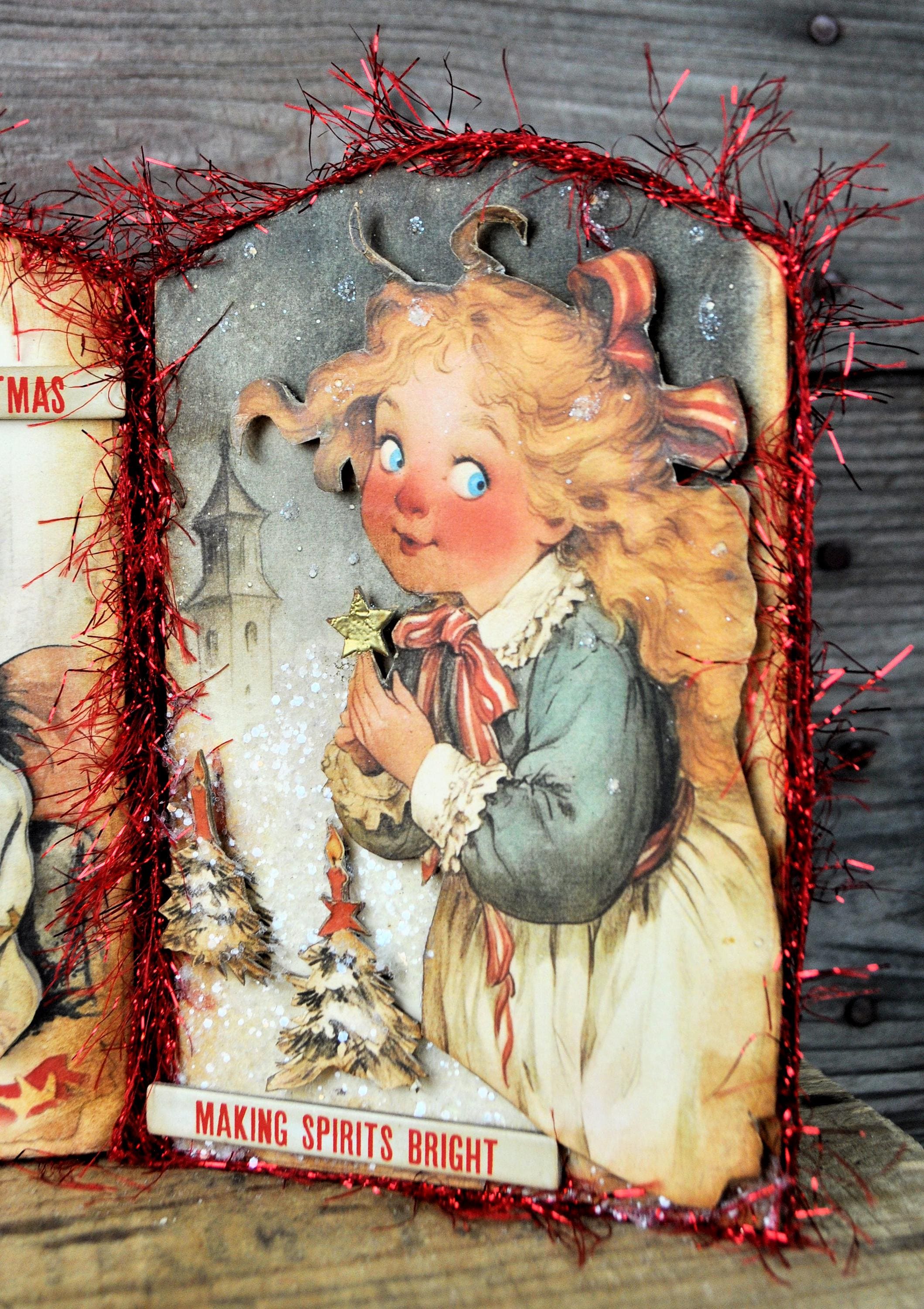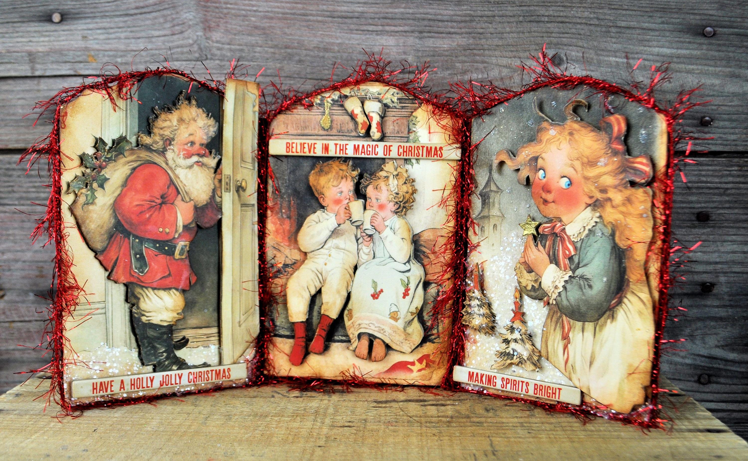 Barb Olson of Muddy Creek Primitives, designer and creator of unique handmade pieces is pleased to offer this primitive one-of-a-kind Christmas/Winter Trifold Collage. This trifold has three different festive Christmas images and sprinkled with glitter. They are all trimmed with red tinsel yarn. The back is also decorated with Christmas and winter graphics. This Christmas collage measures 14 1/8" x 7 ". It will look perfect sitting on a mantle or your desk with all your prim decor.
