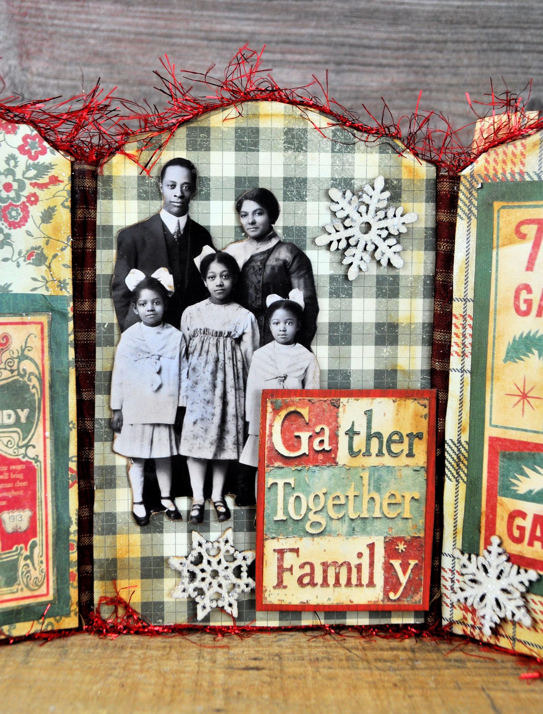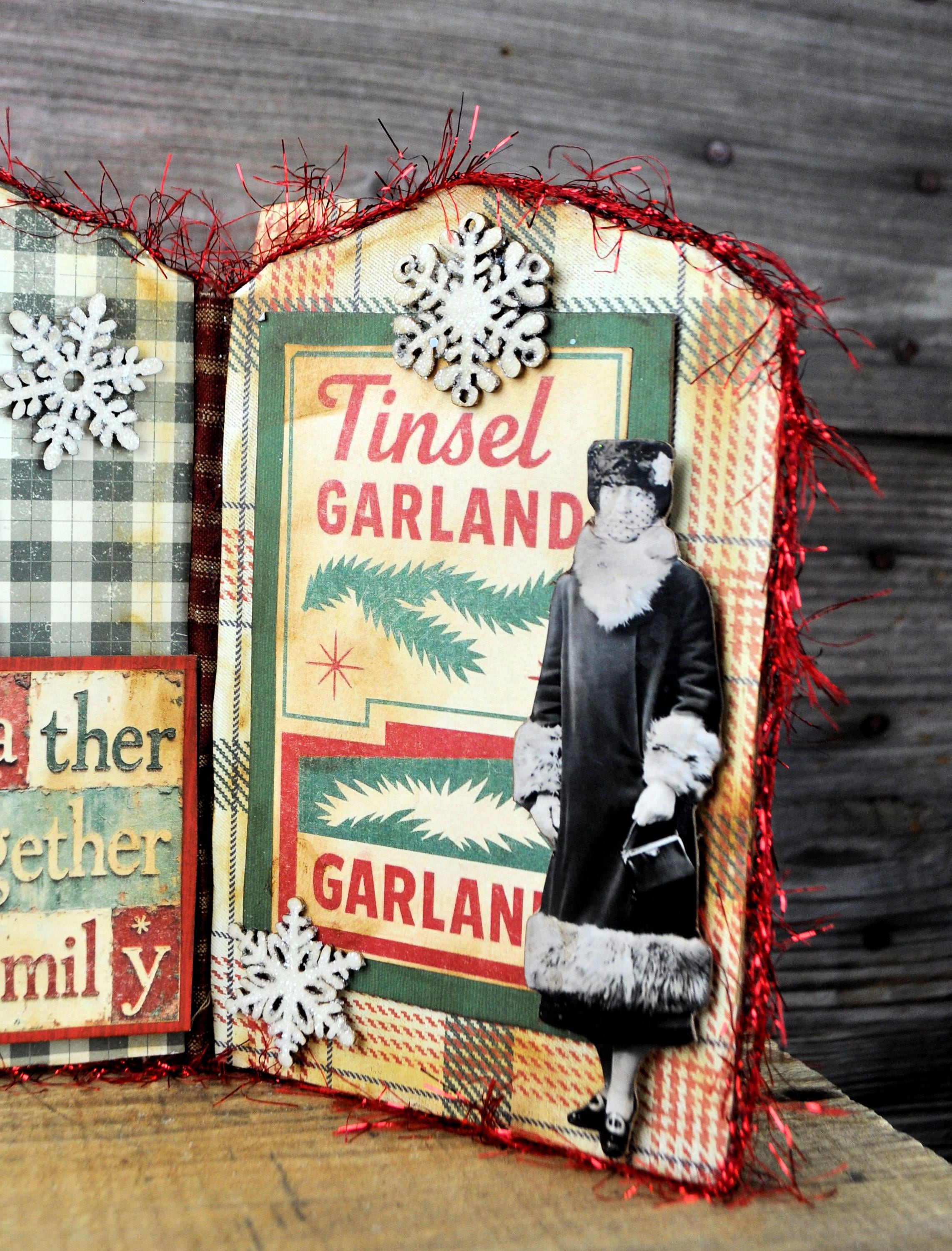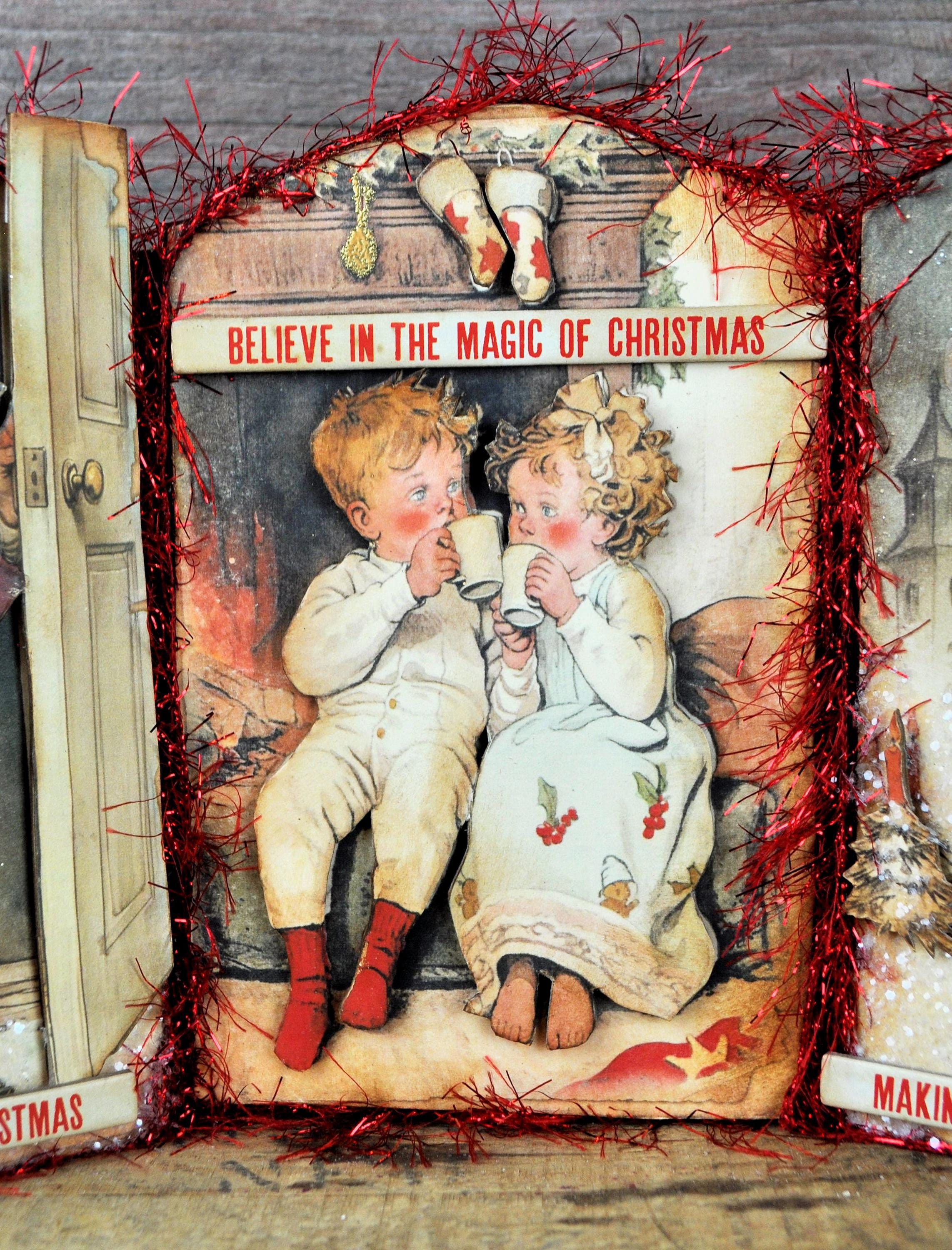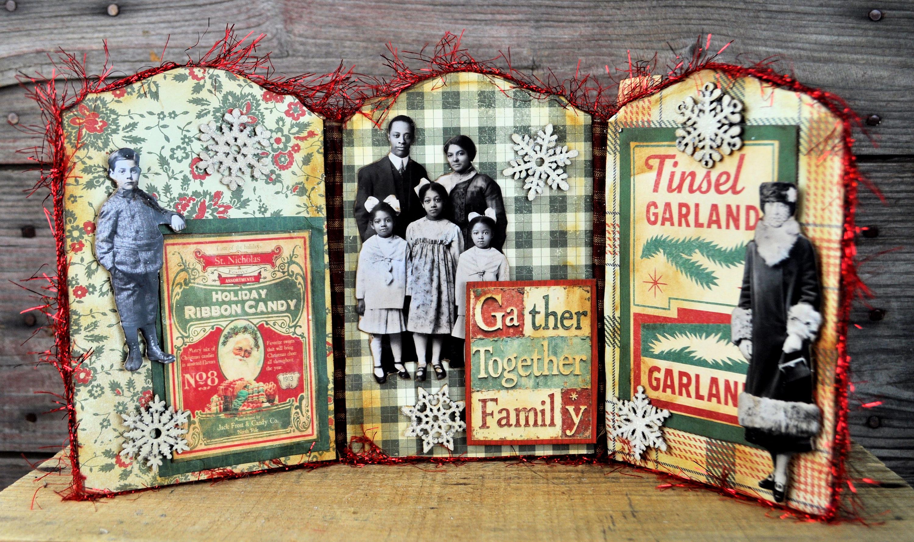 Barb Olson of Muddy Creek Primitives, designer and creator of unique handmade pieces is pleased to offer this primitive one-of-a-kind Christmas/Winter Trifold Collage. This trifold has three different festive Christmas images and sprinkled with glitter. They are all trimmed with red tinsel yarn. The back is also decorated with Christmas and winter graphics. This Christmas collage measures 14 1/8" x 7 ". It will look perfect sitting on a mantle or your desk with all your prim decor.