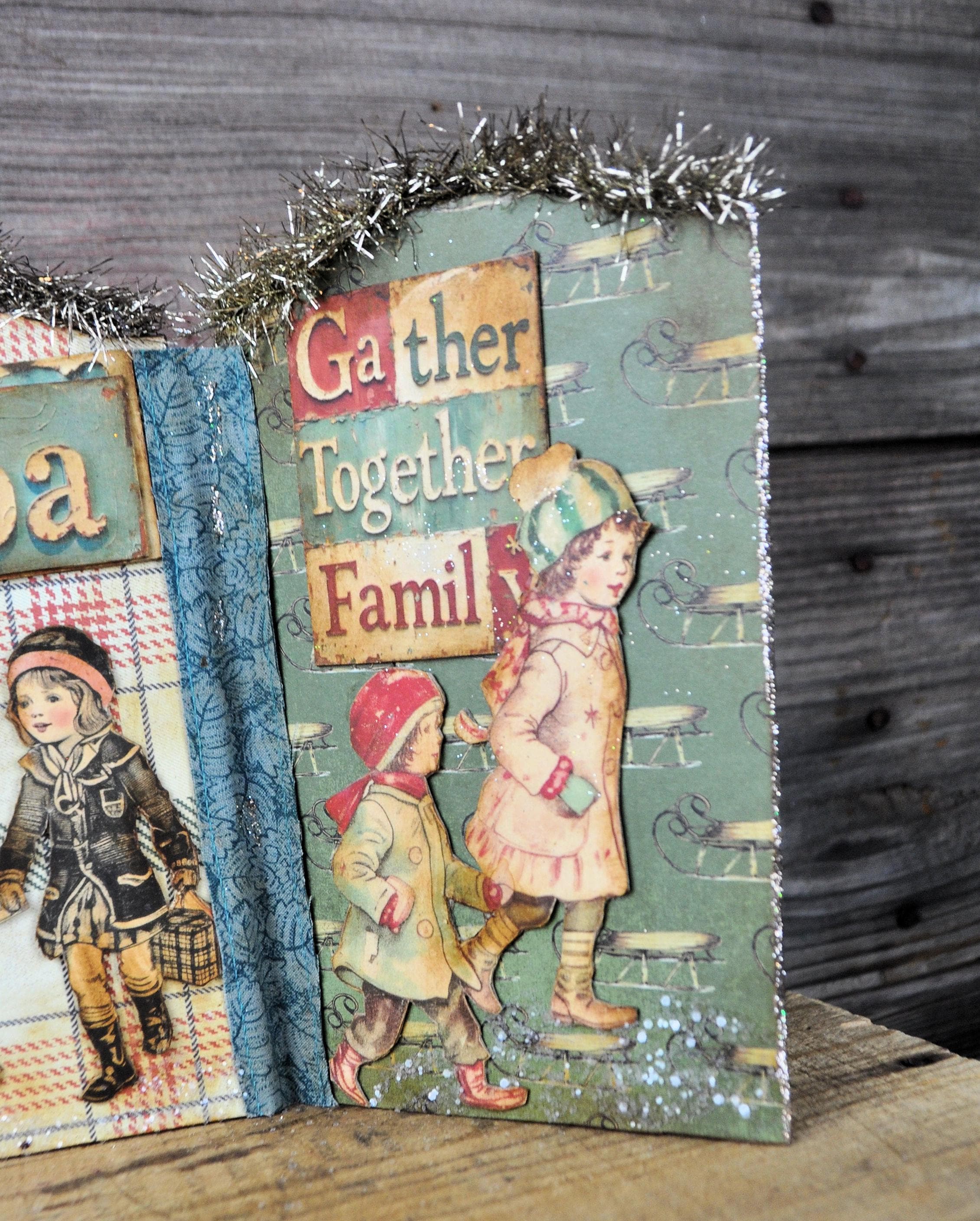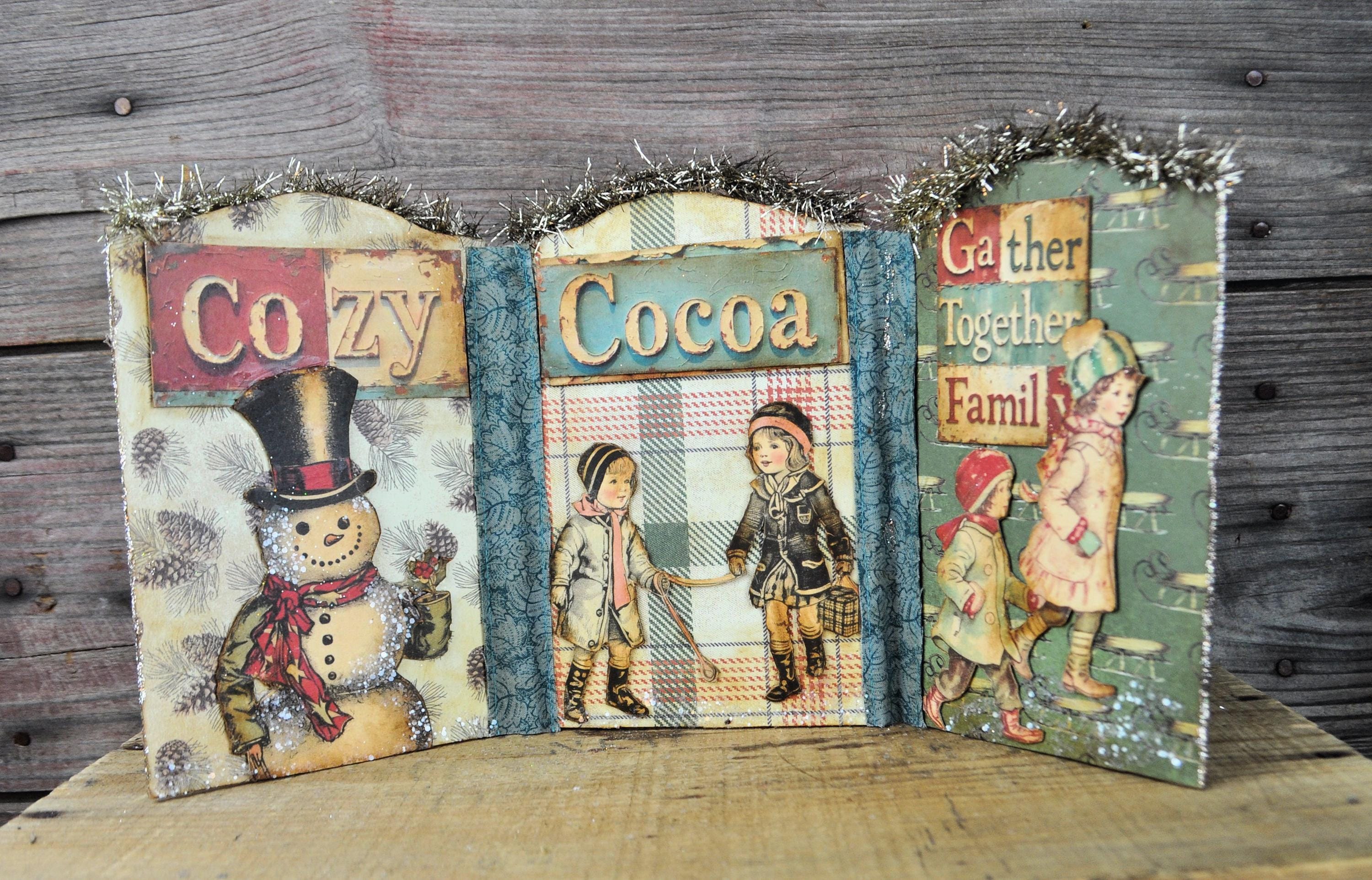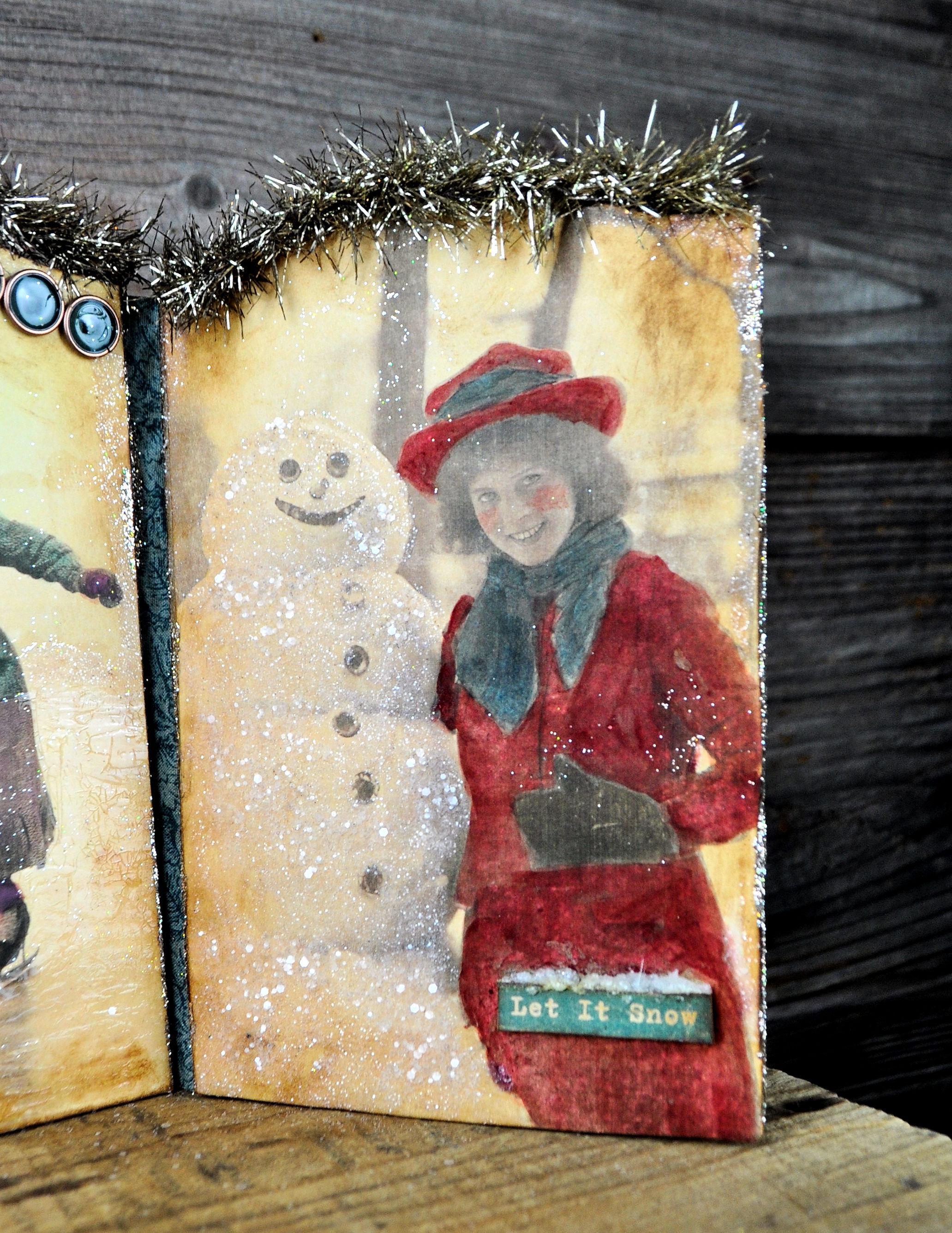 Barb Olson of Muddy Creek Primitives, designer and creator of unique handmade pieces is pleased to offer this primitive one-of-a-kind Christmas/Winter Trifold Collage. This trifold has three different winter activities images and sprinkled with glitter. The middle panel has "Winter Fun" spelled out in handmade metal charms. They are all trimmed with silver tinsel garland and old gold glitter. The back is also decorated with winter graphics. This Christmas collage measures 14 1/8" x 7 ". It will look perfect sitting on a mantle or your desk with all your prim decor.