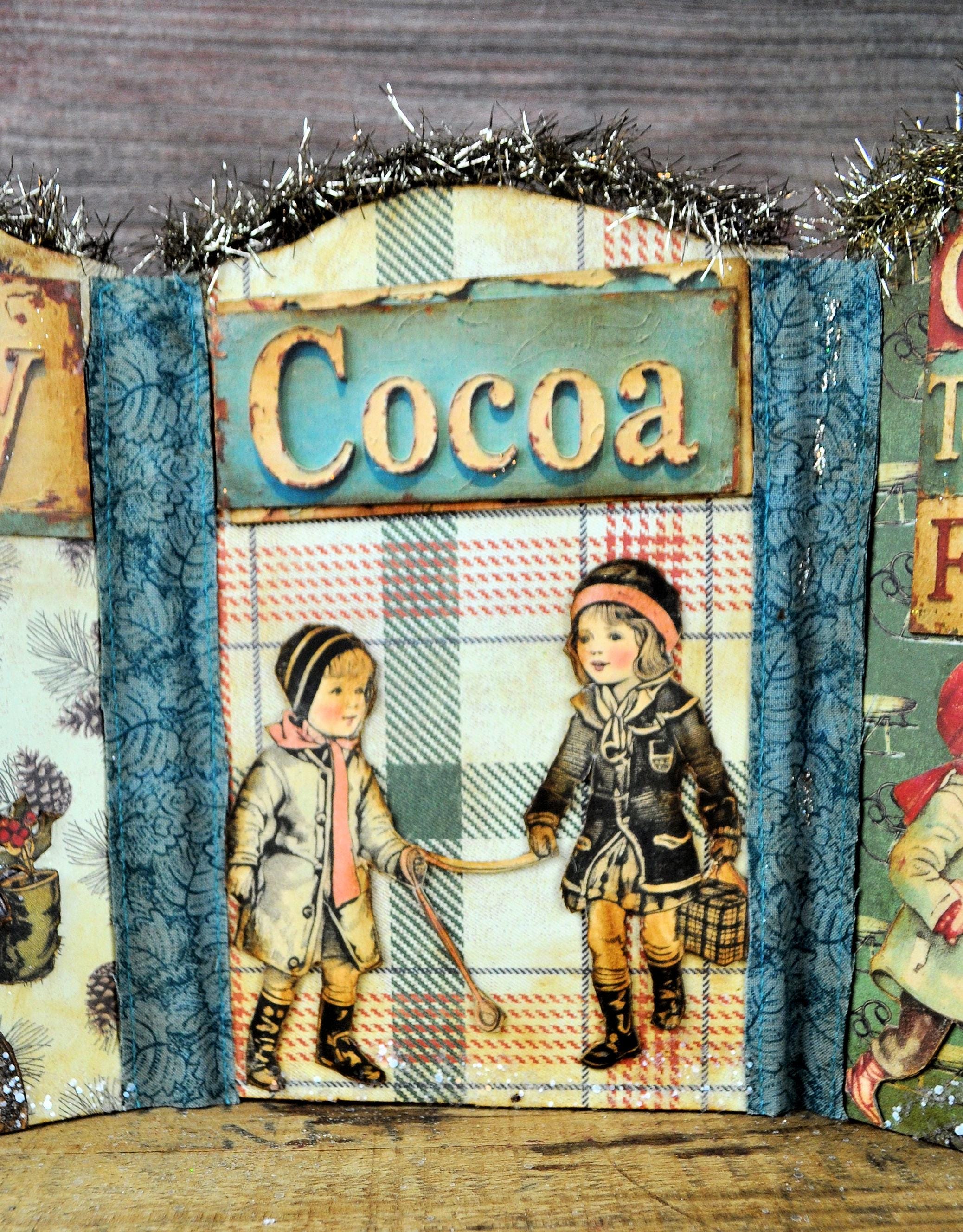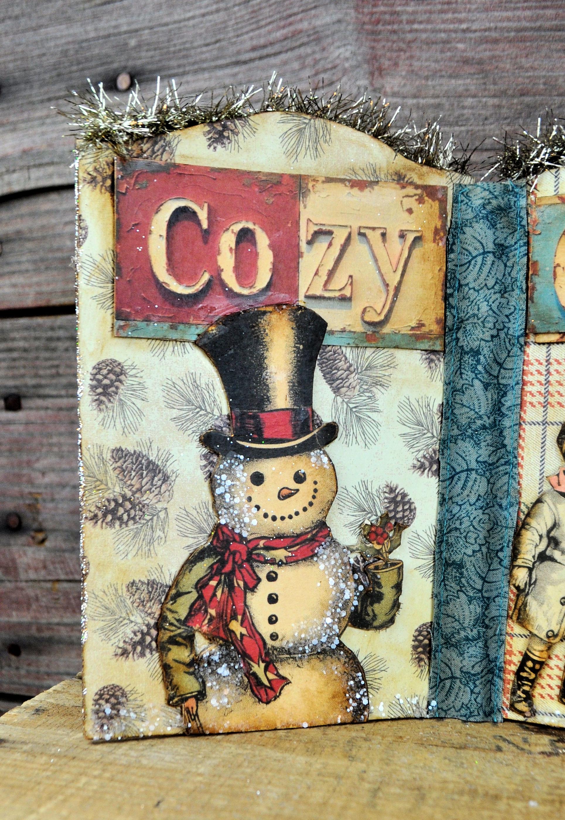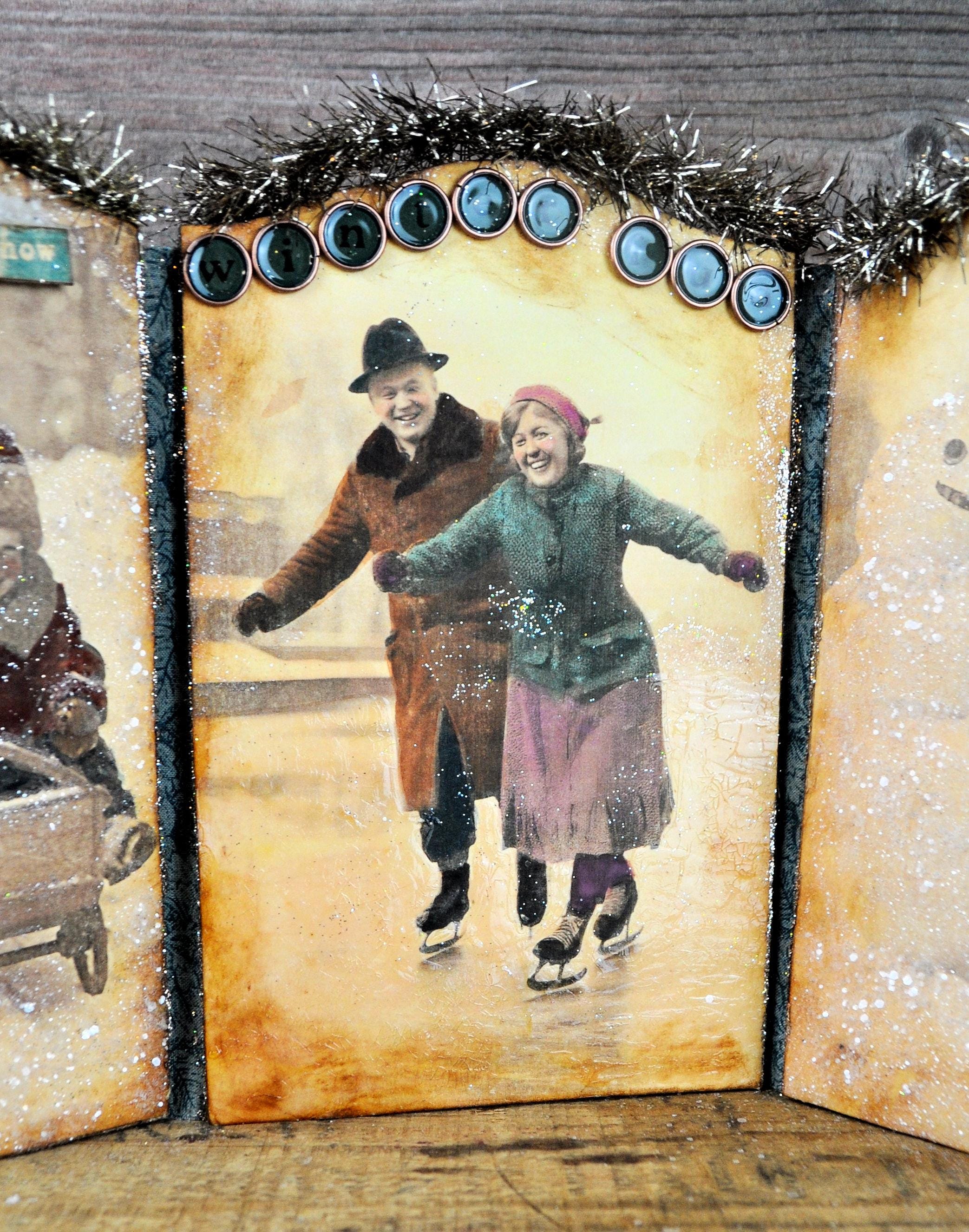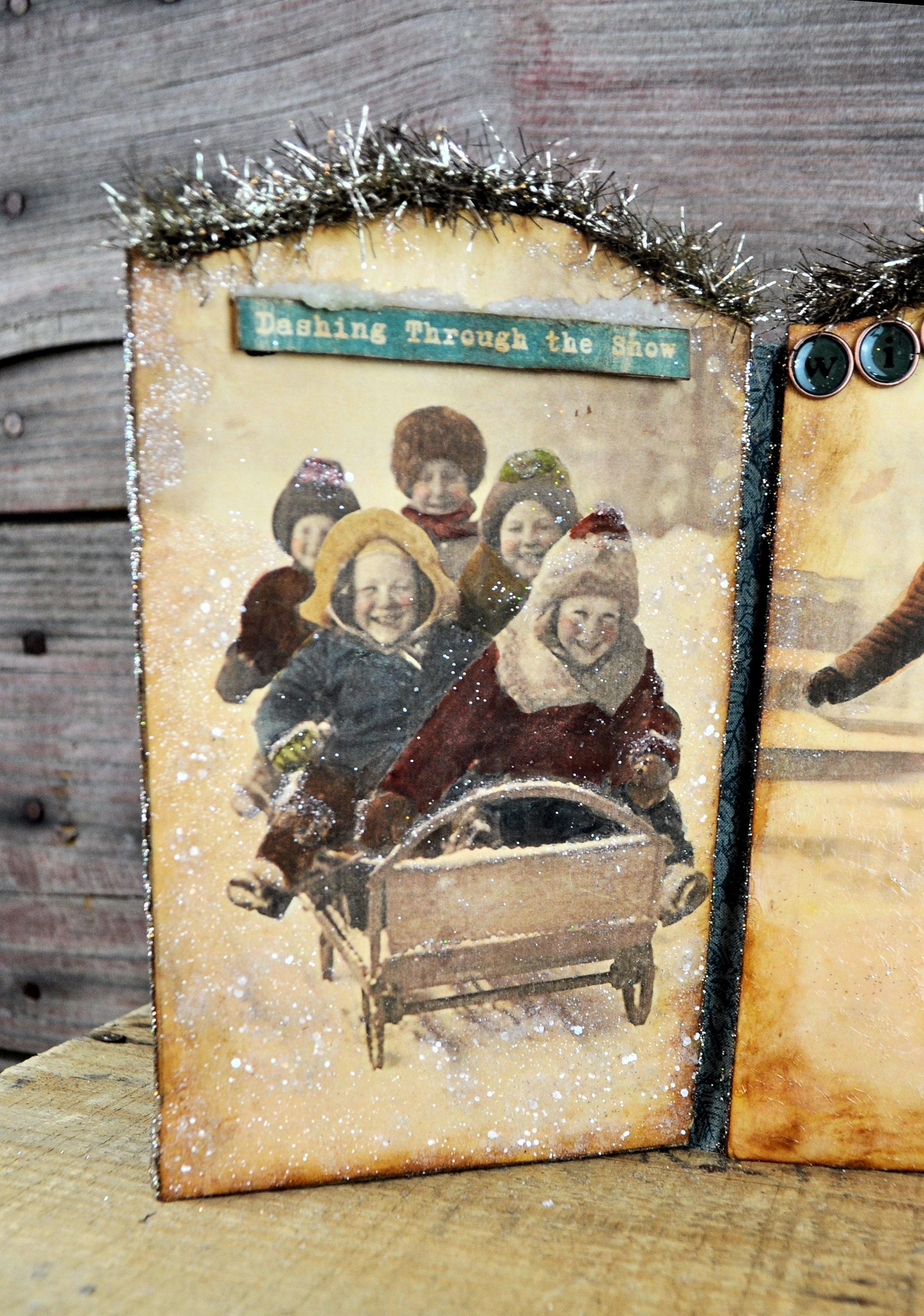 Barb Olson of Muddy Creek Primitives, designer and creator of unique handmade pieces is pleased to offer this primitive one-of-a-kind Christmas/Winter Trifold Collage. This trifold has three different winter activities images and sprinkled with glitter. The middle panel has "Winter Fun" spelled out in handmade metal charms. They are all trimmed with silver tinsel garland and old gold glitter. The back is also decorated with winter graphics. This Christmas collage measures 14 1/8" x 7 ". It will look perfect sitting on a mantle or your desk with all your prim decor.