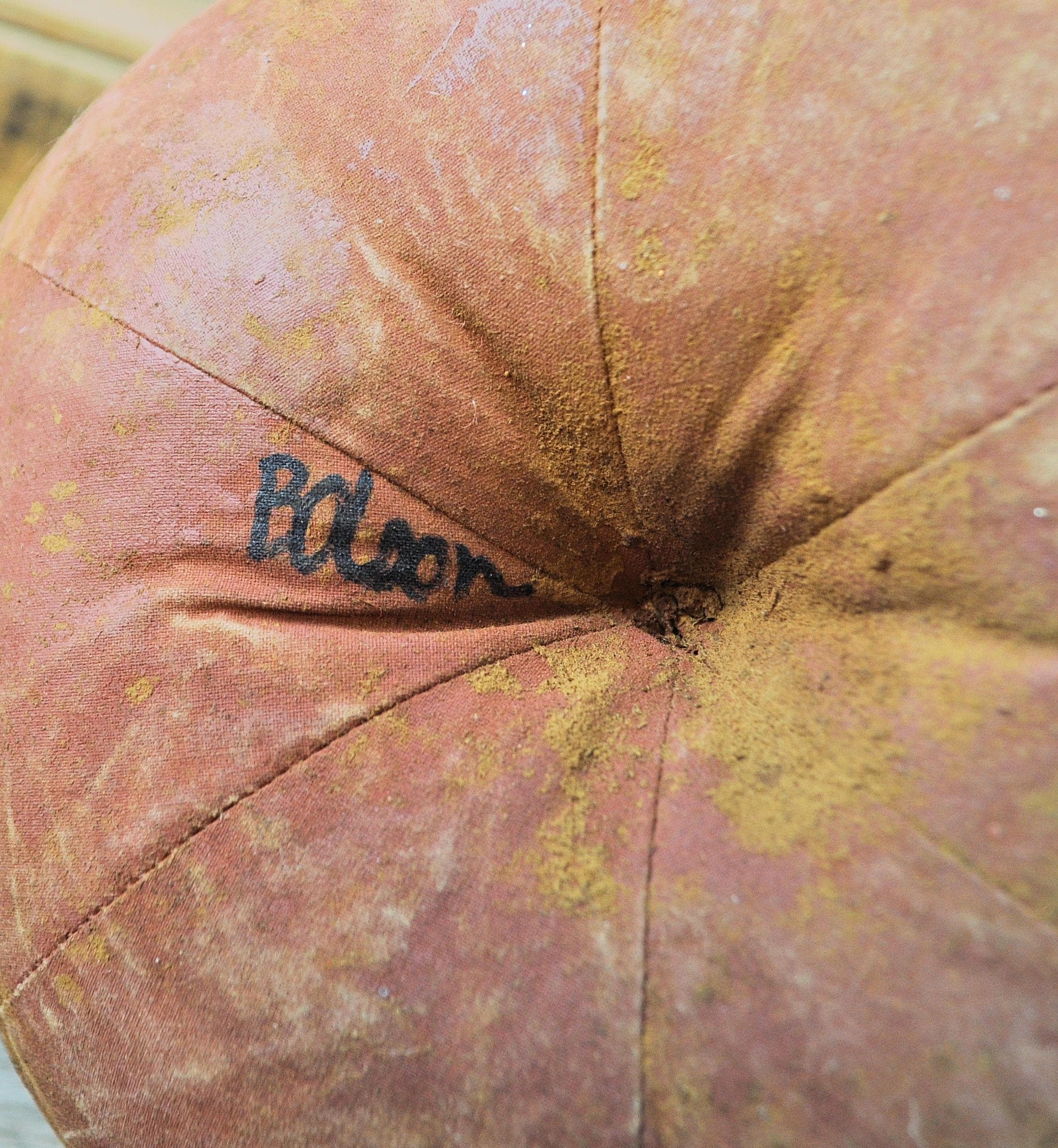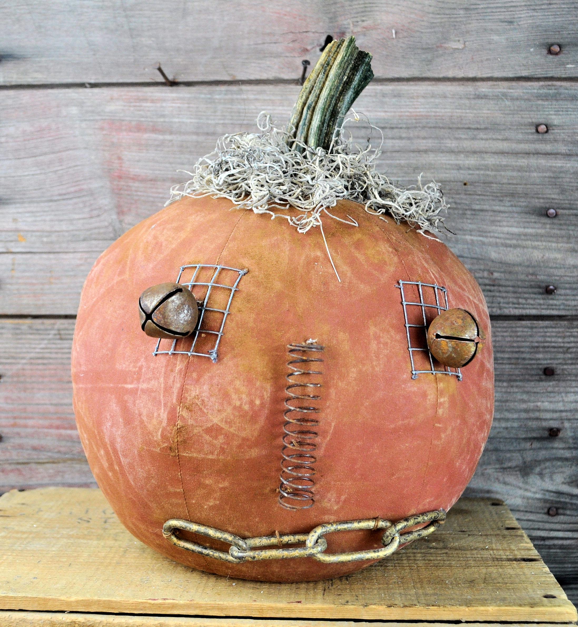 Barb Olson of Muddy Creek Primitives, designer and creator of unique handmade pieces is pleased to offer this one-of-a-kind Jack-O-Lantern. The rusty hardware & other items add charm and "primness" to this pumpkin. This JOL is painted burnt orange and grunged up with cinnamon and coffee to make it look very primitive. It is topped with a real pumpkin stem and Spanish moss. Set several different ones on a bench or mantle with fall garland or grapevine wrapped around them all. Each one of these pumpkins shows its unique personality and is signed by the artist on the base. He is 14" tall (not including stem).