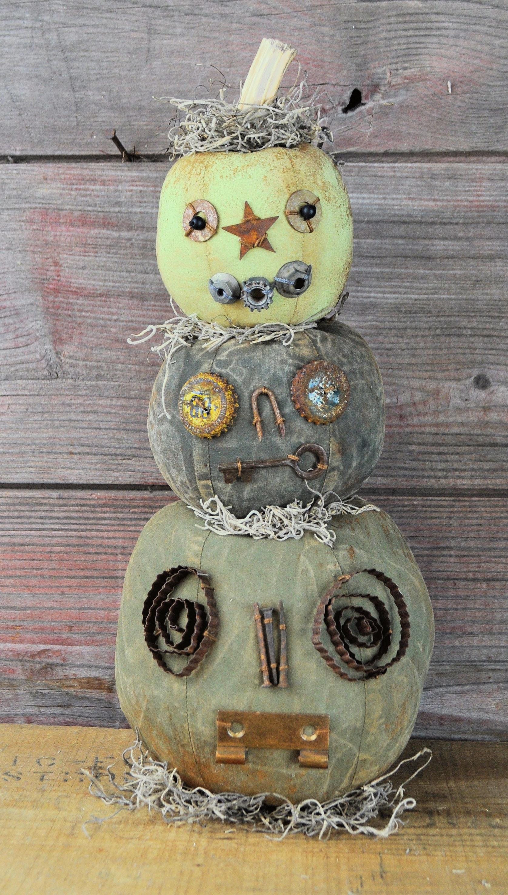 Barb Olson of Muddy Creek Primitives, designer and creator of unique handmade pieces is excited to offer this primitive Jack-O-Lantern Stack. It is painted light green, dark gray & gray green. Each pumpkin has a unique face made with rusty hardware, vintage buttons and bits of salvage. It has a real pumpkin stem on top and lots of spanish moss. This JOL stack is all "grunged" up to make it look so wonderfully prim. It is signed on the bottom. Each one is unique. This small JOL stack is 12 1/2" tall not including stem. Set it next to a bench or old cupboard.
