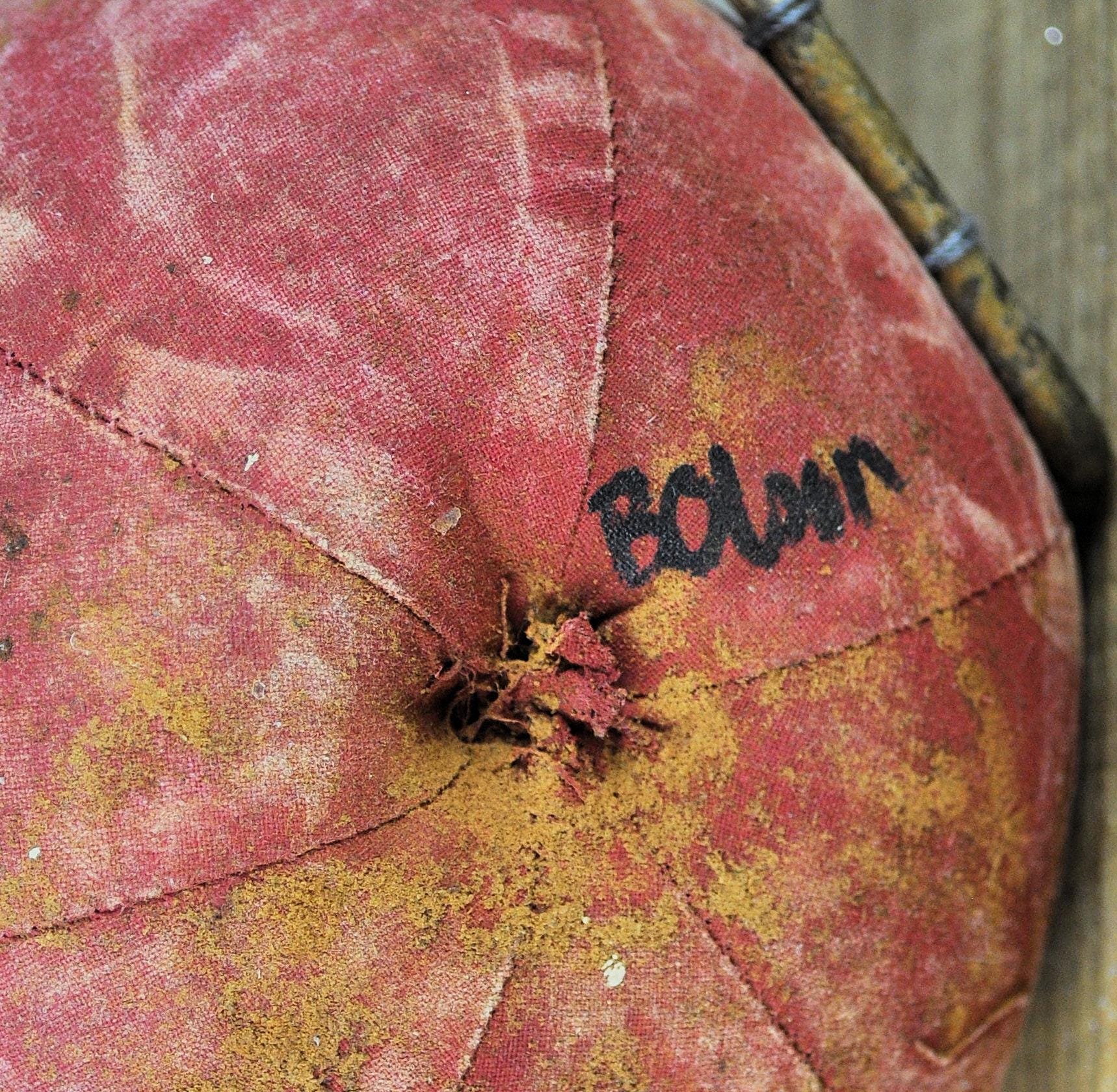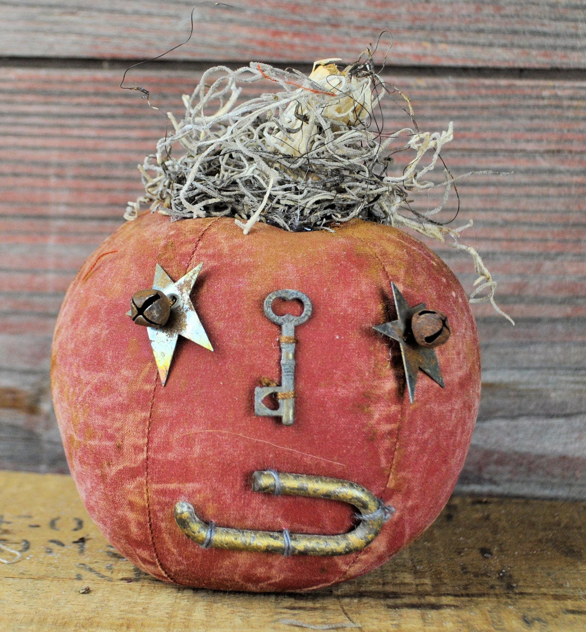 Barb Olson of Muddy Creek Primitives, designer and creator of unique handmade pieces is pleased to offer this one-of-a-kind Jack-O-Lantern. The rusty metal and other old hardware add charm and "primness" to this pumpkin. This JOL is painted harvest red and grunged up with cinnamon and coffee to look very primitive. It is topped with a real pumpkin stem and Spanish moss. Set several different ones on a bench or mantle with fall garland or grapevine wrapped around them all. Each one of these pumpkins shows its unique personality and is signed by the artist on the base. He is 4" tall (not including stem).
