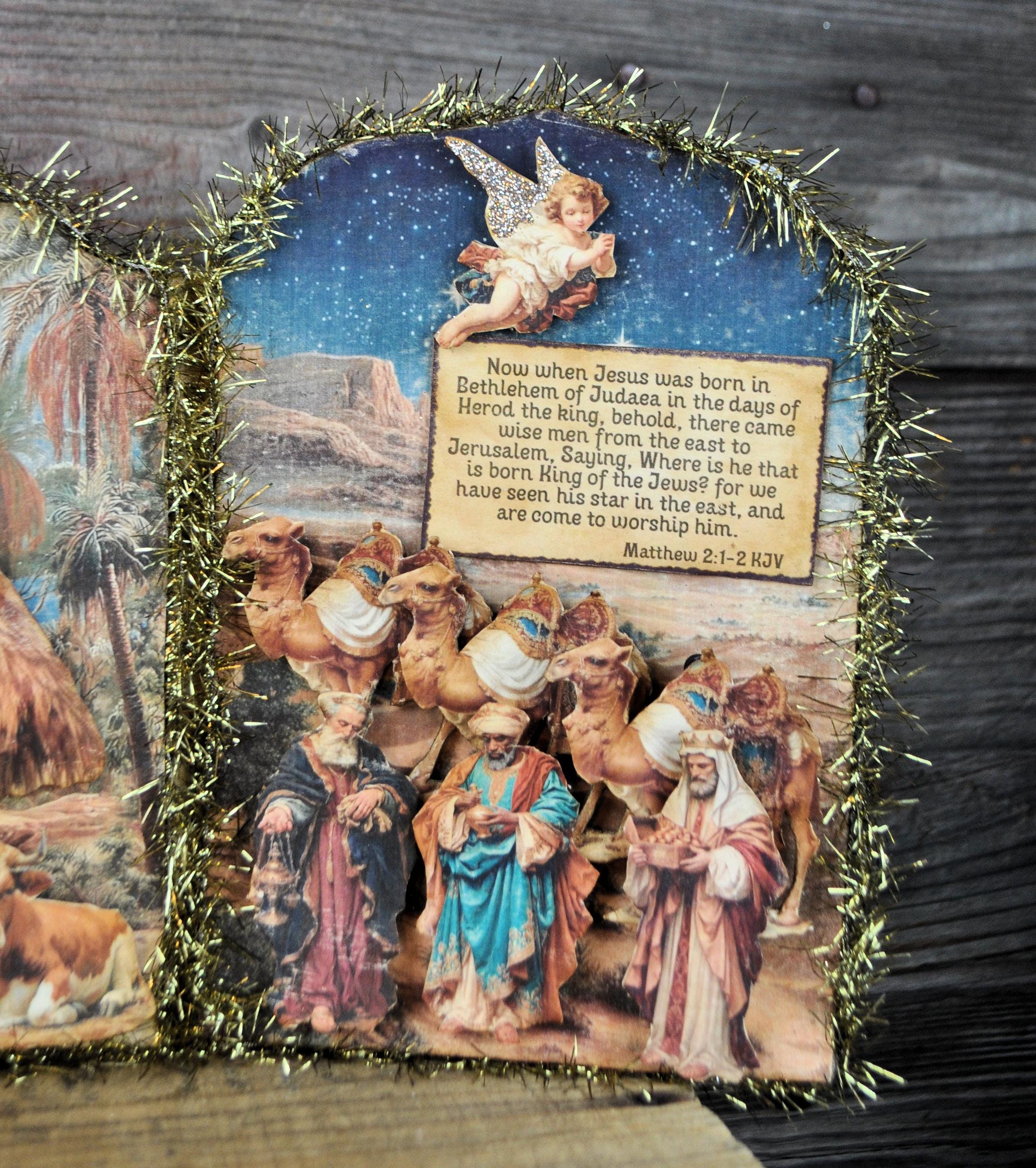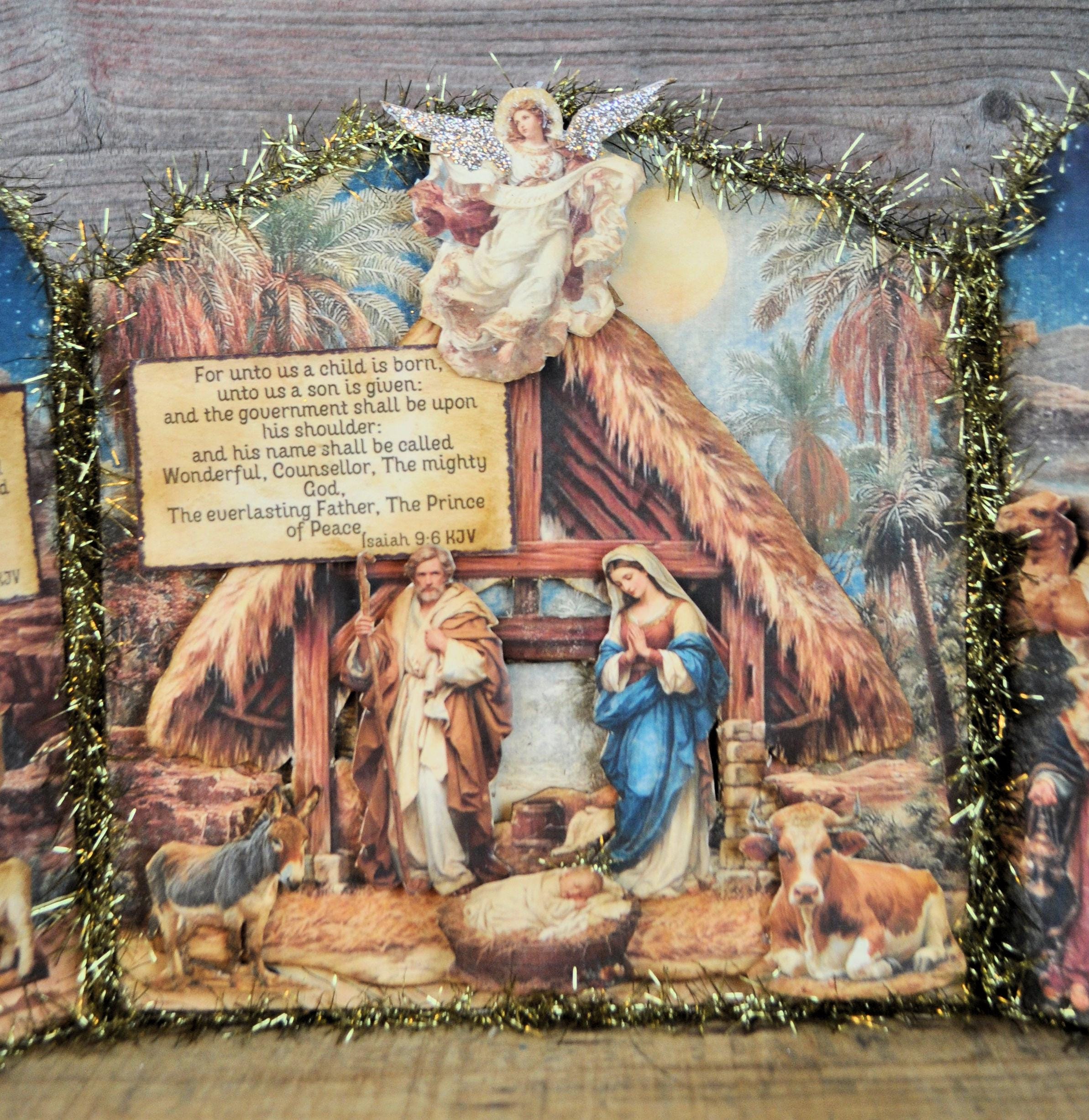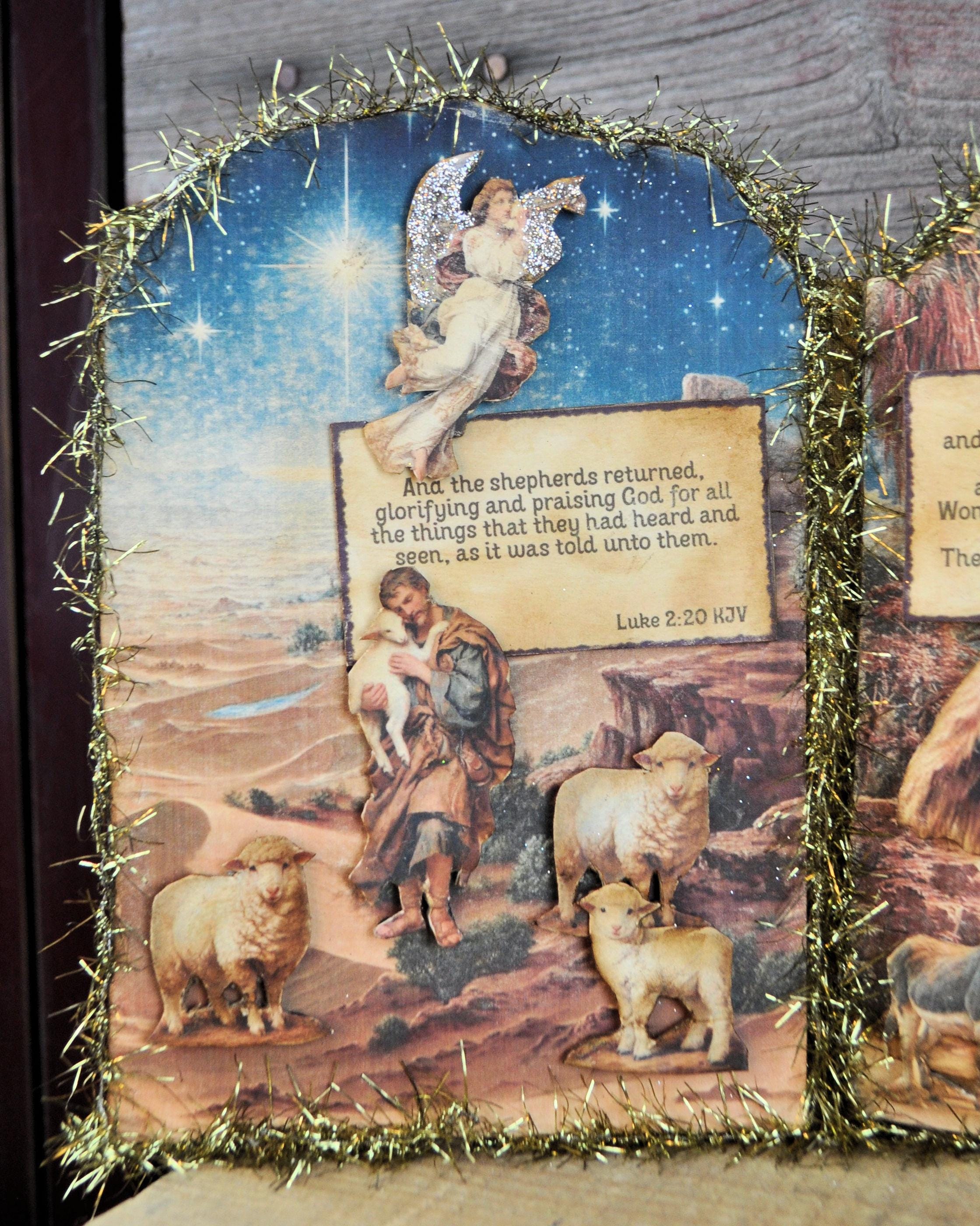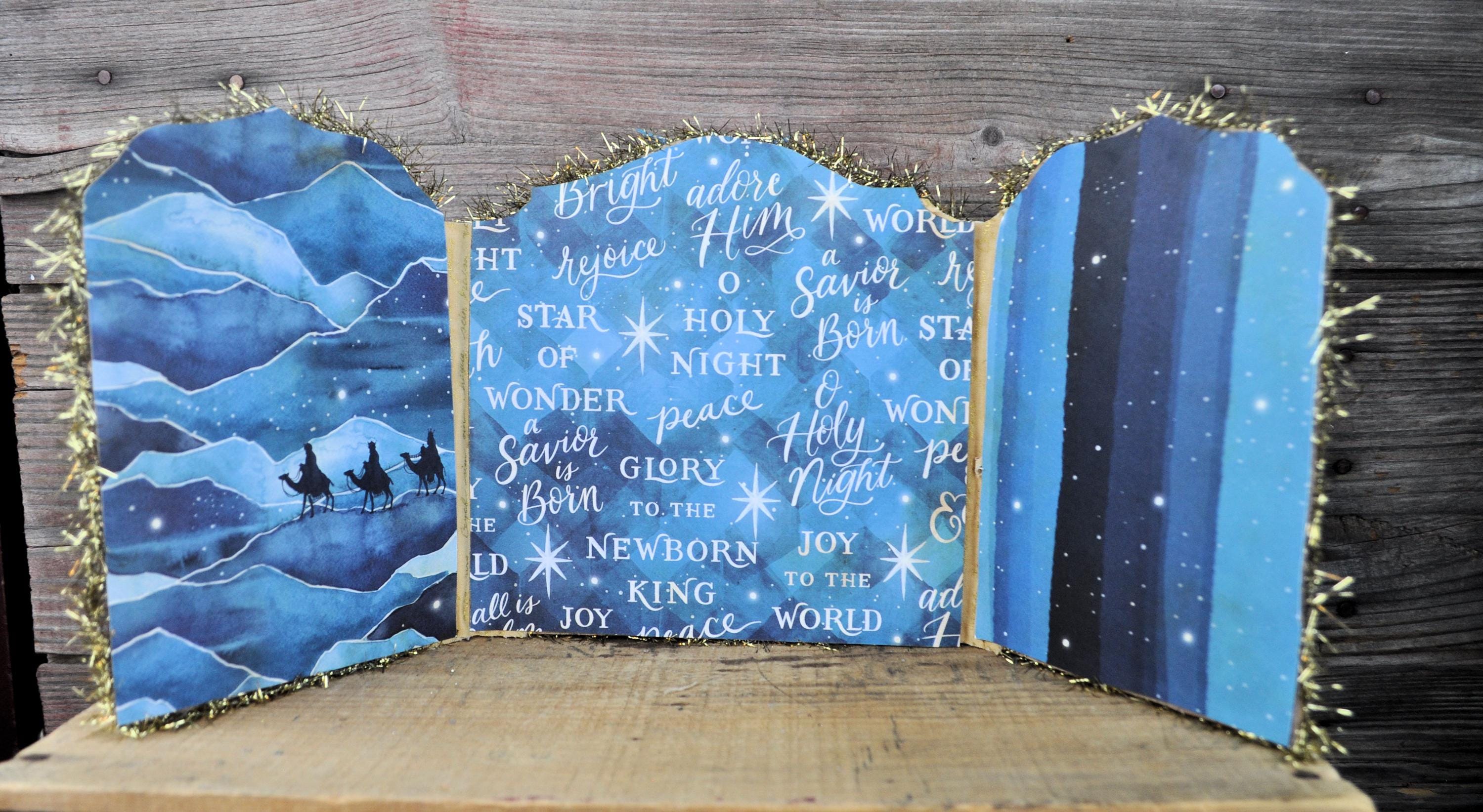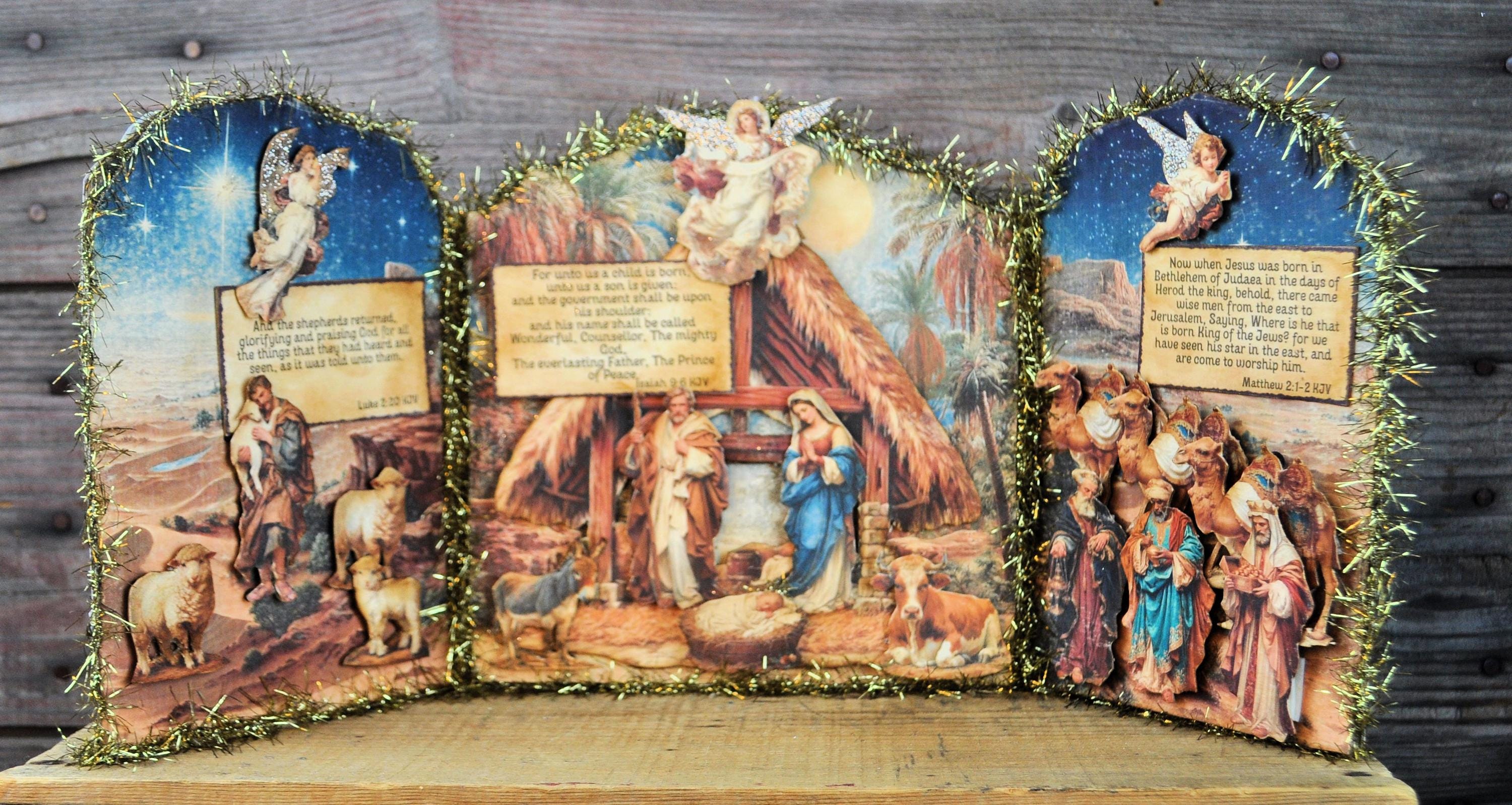 Barb Olson of Muddy Creek Primitives, designer and creator of unique handmade pieces is pleased to offer. This primitive limited edition Christmas Nativity Trifold Collage. The trifold shows the beautiful birth of Christ. It has scripture verses and is sprinkled with silver glass glitter. All the images are cut from cardstock and mounted on chipboard. The panels are trimmed with gold tinsel garland. The back is also decorated with blue nativity cardstock. This Christmas Nativity collage measures 19" x 8 ". It will look perfect sitting on a mantle or your desk with all your prim decor.