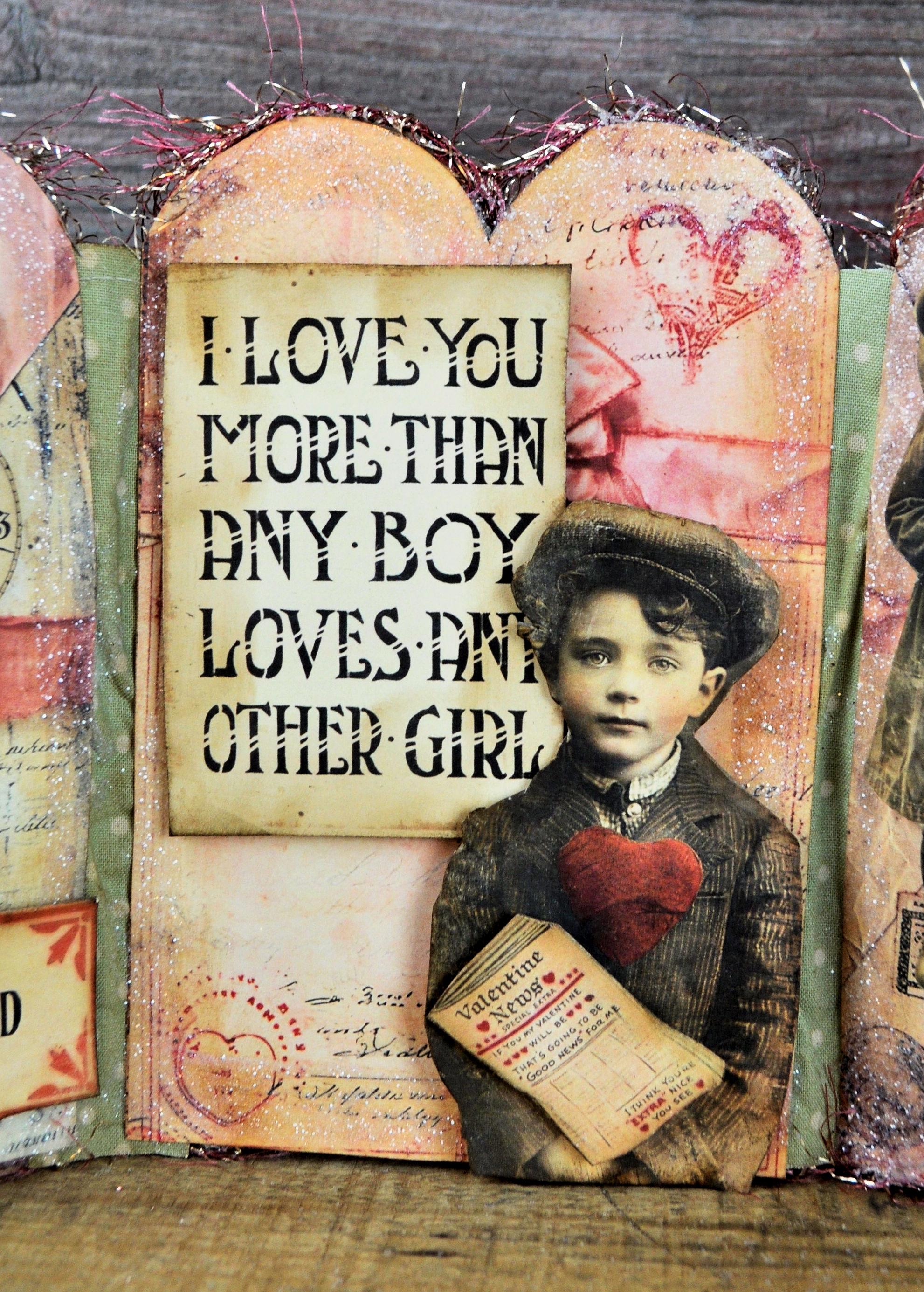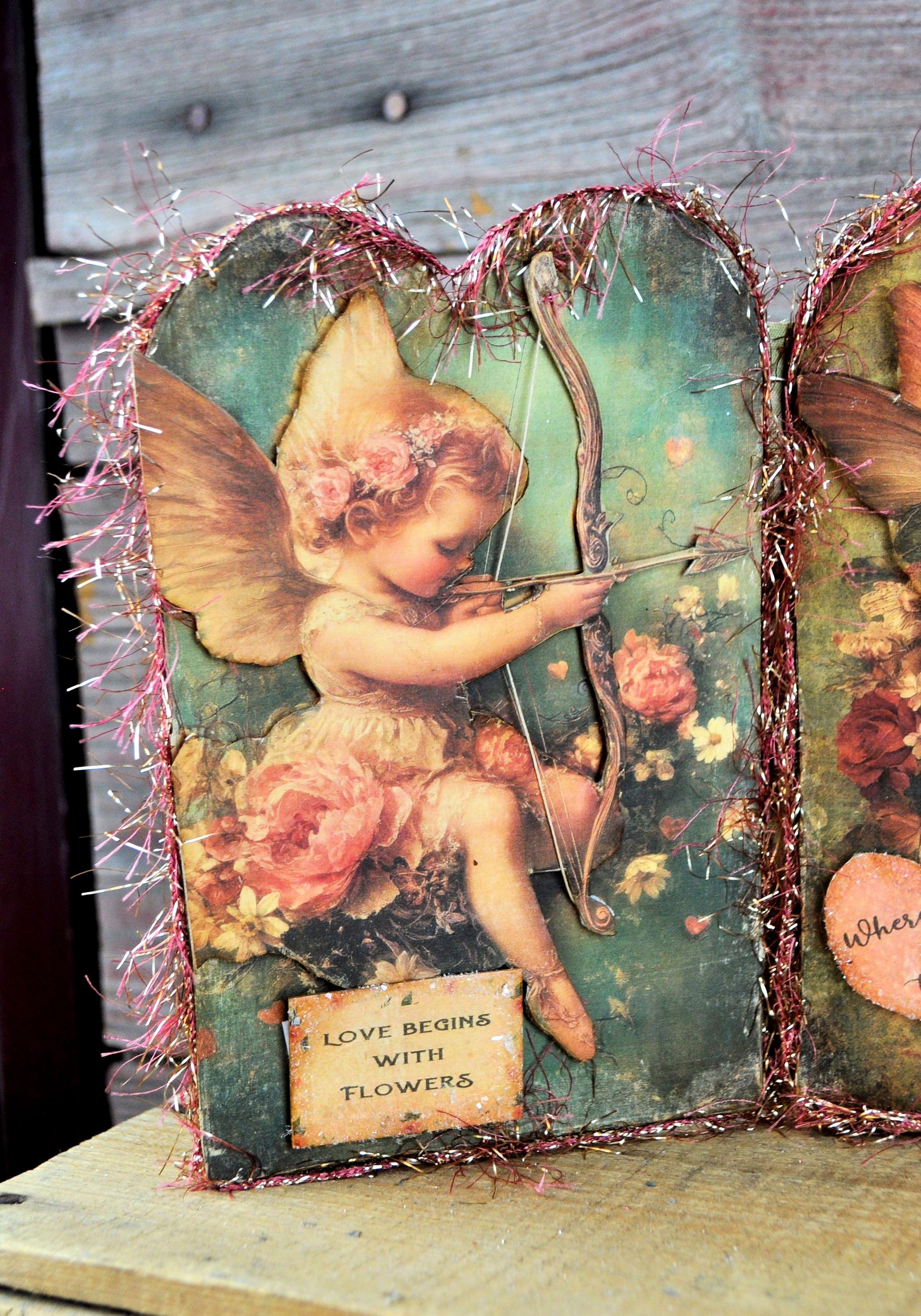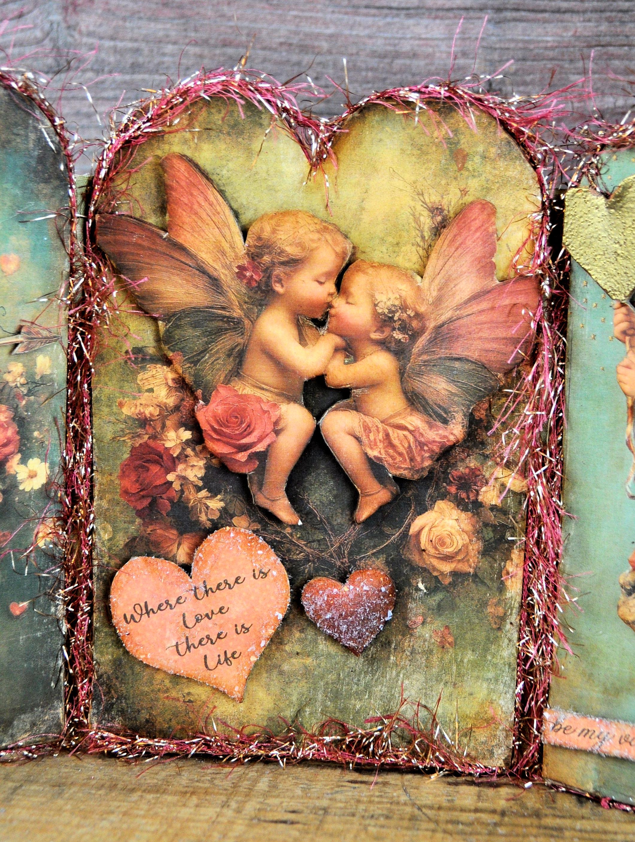 Barb Olson of Muddy Creek Primitives, designer and creator of unique handmade pieces is pleased to offer this primitive one-of-a-kind Valentines Day Trifold Collage. This trifold has three different sweet Valentine images and sprinkled with glitter. They are all trimmed with pink sparkle yarn. The back is also decorated with Valentines Day graphics. This Valentine collage measures 14 1/2" x 7 1/4 ". It will look perfect sitting on a mantle or your desk with all your prim decor.