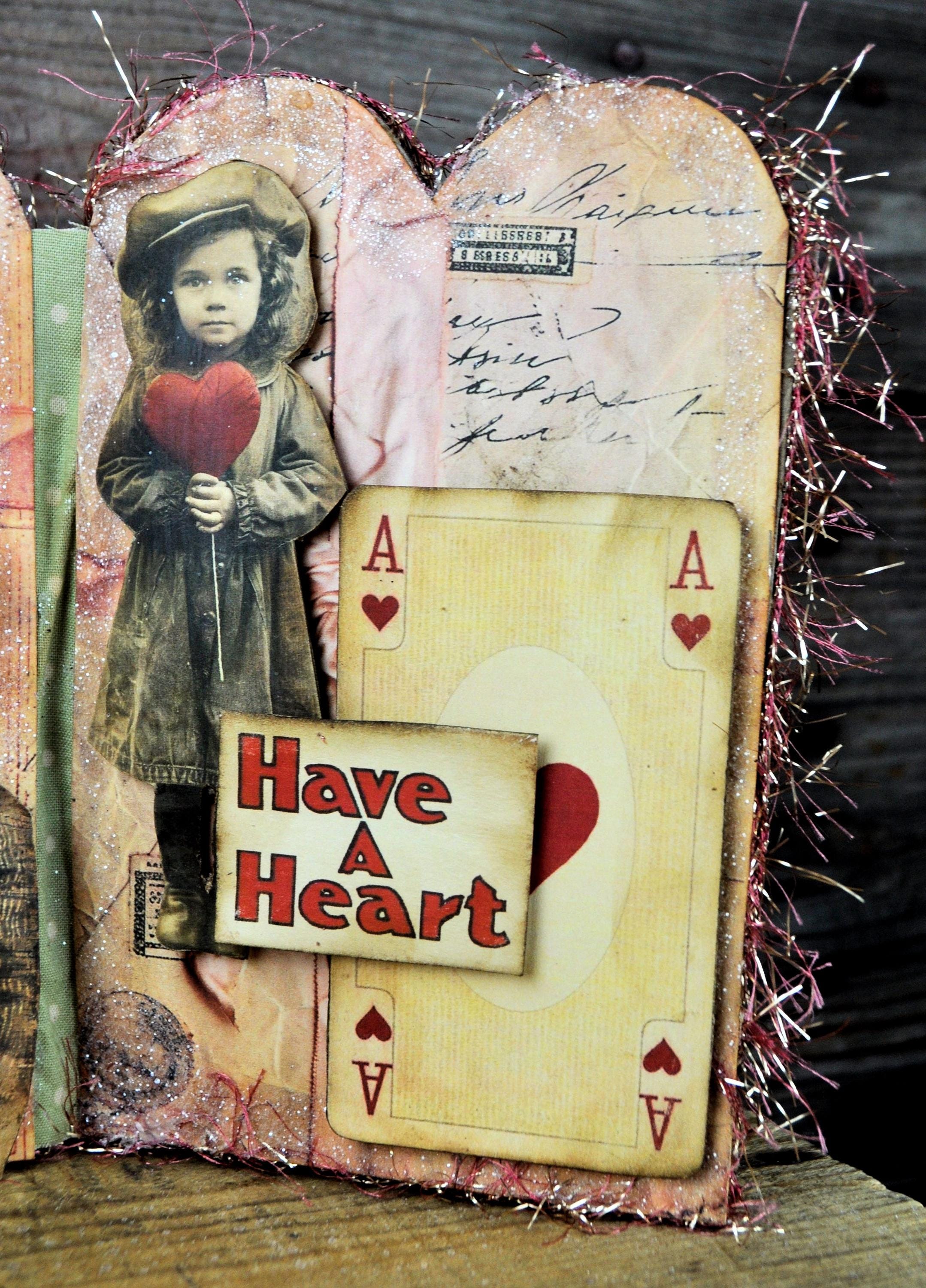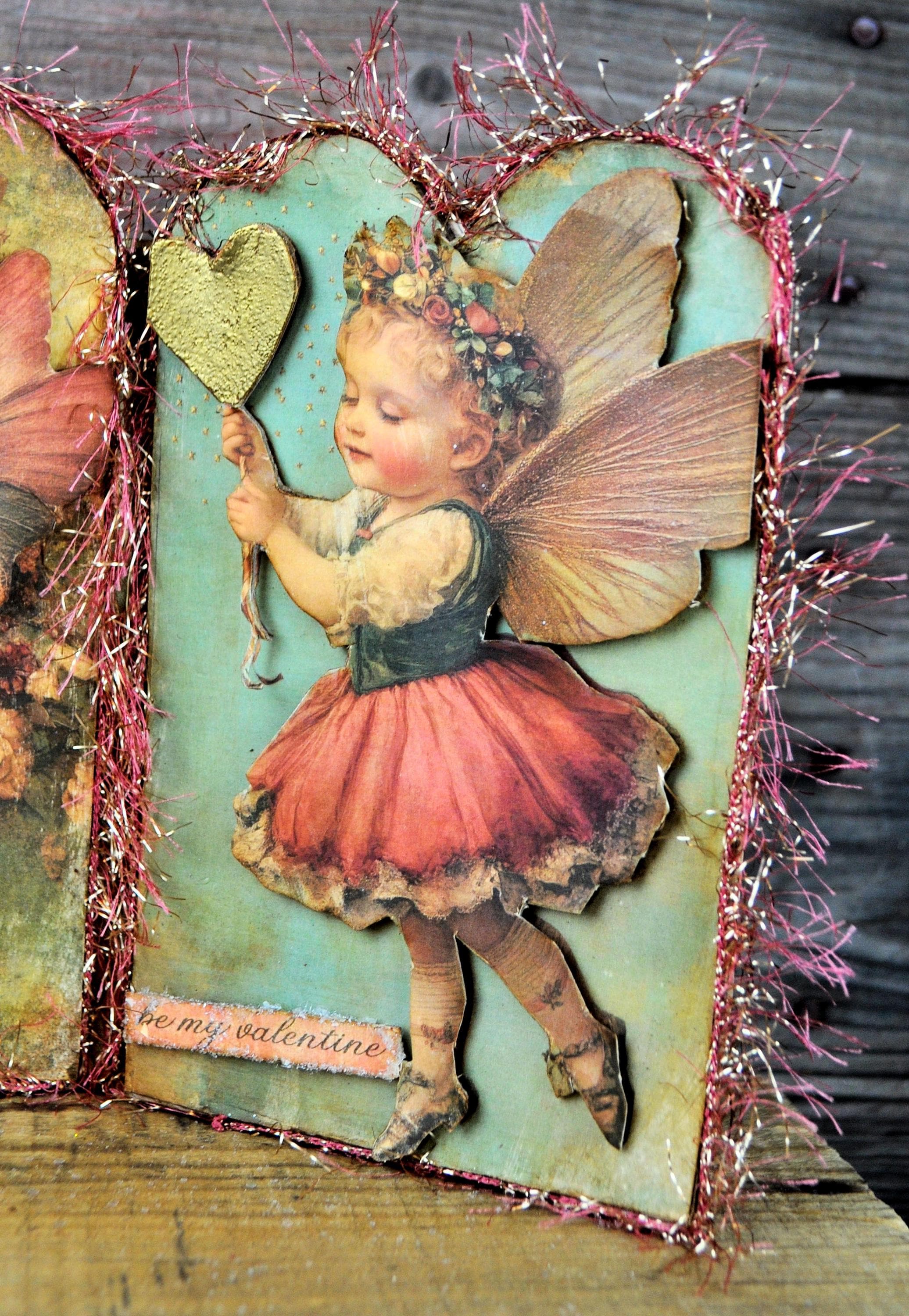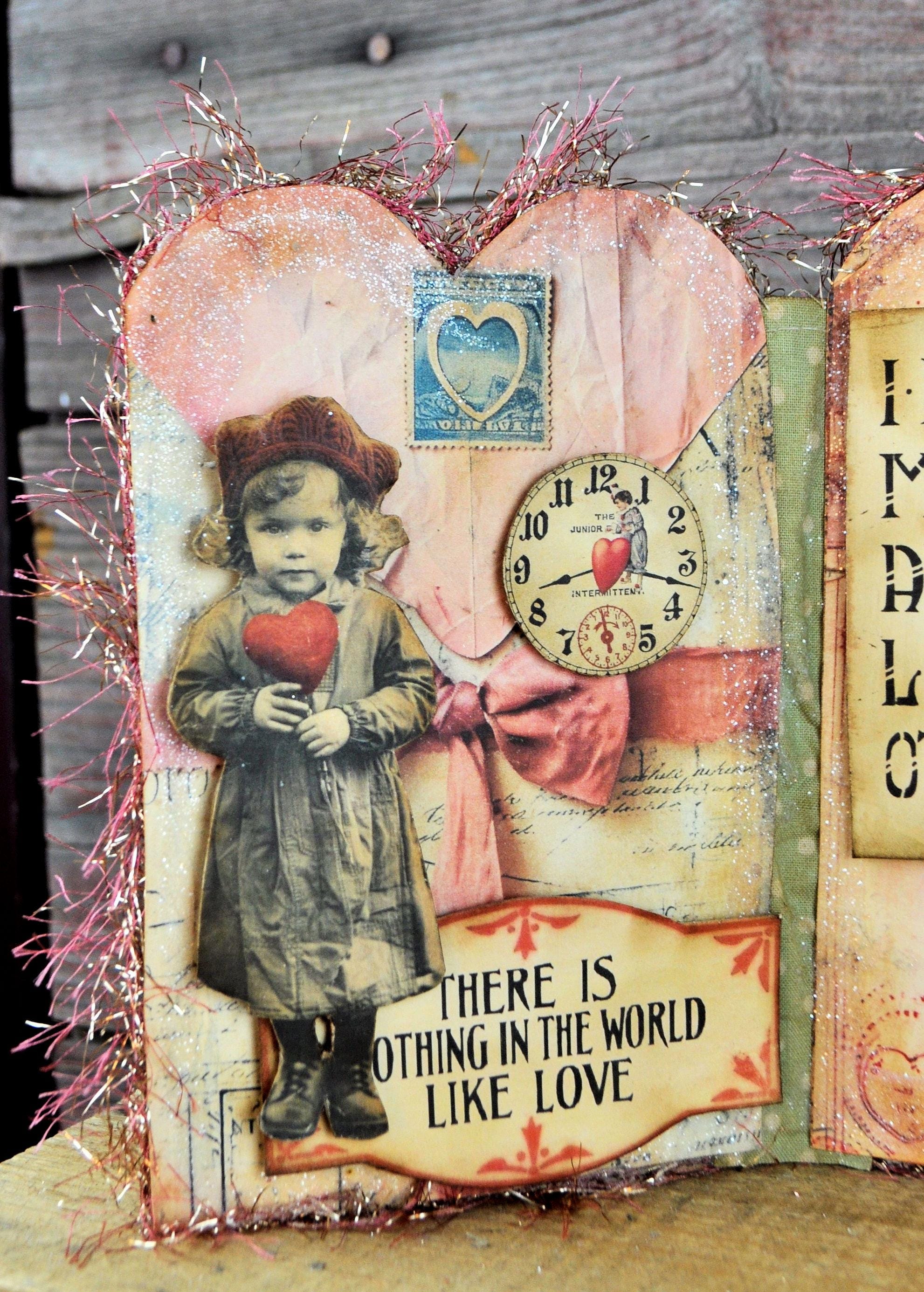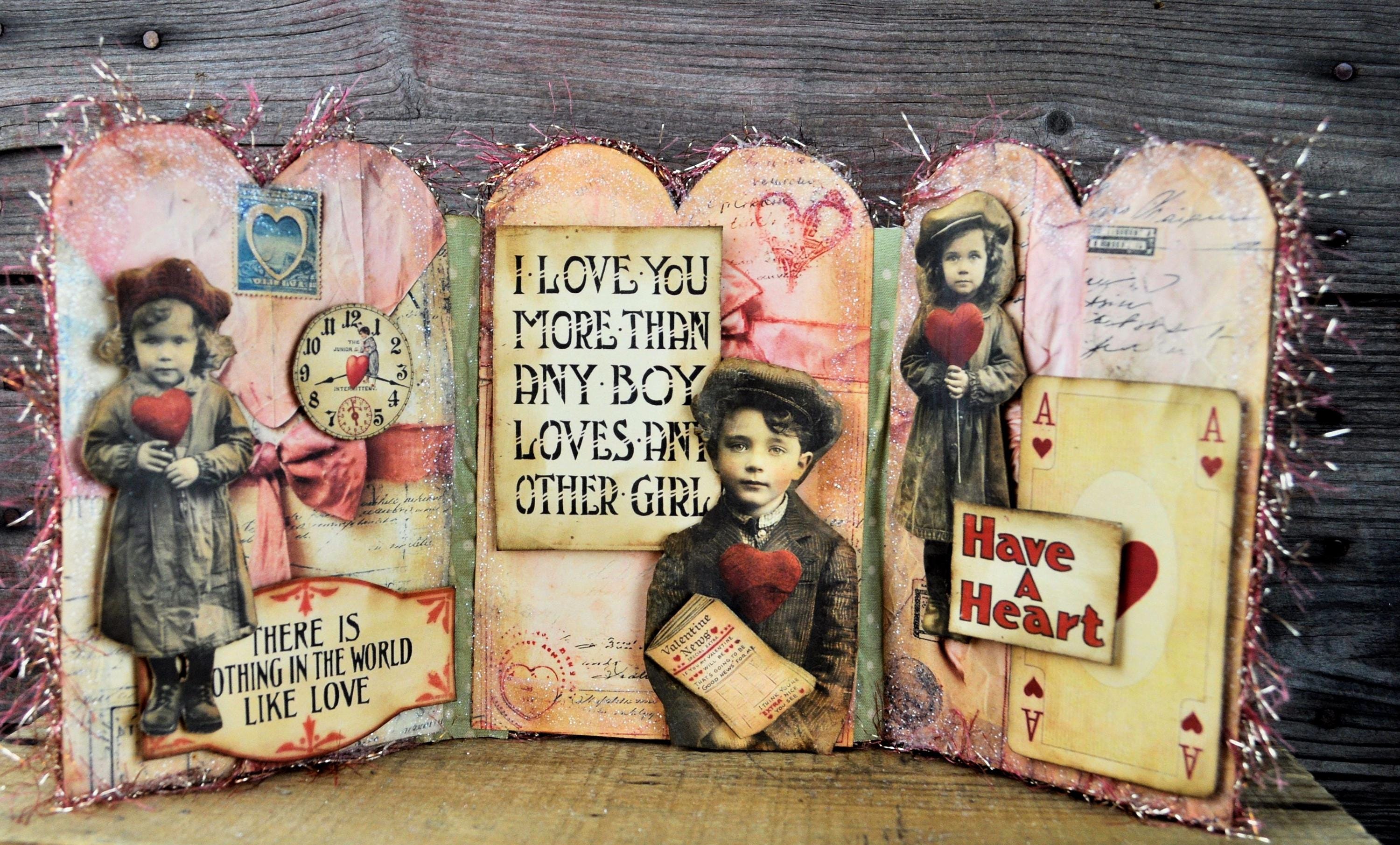 Barb Olson of Muddy Creek Primitives, designer and creator of unique handmade pieces is pleased to offer this primitive one-of-a-kind Valentines Day Trifold Collage. This trifold has three different sweet Valentine images and sprinkled with glitter. They are all trimmed with pink sparkle yarn. The back is also decorated with Valentines Day graphics. This Valentine collage measures 14 1/2" x 7 1/4 ". It will look perfect sitting on a mantle or your desk with all your prim decor.