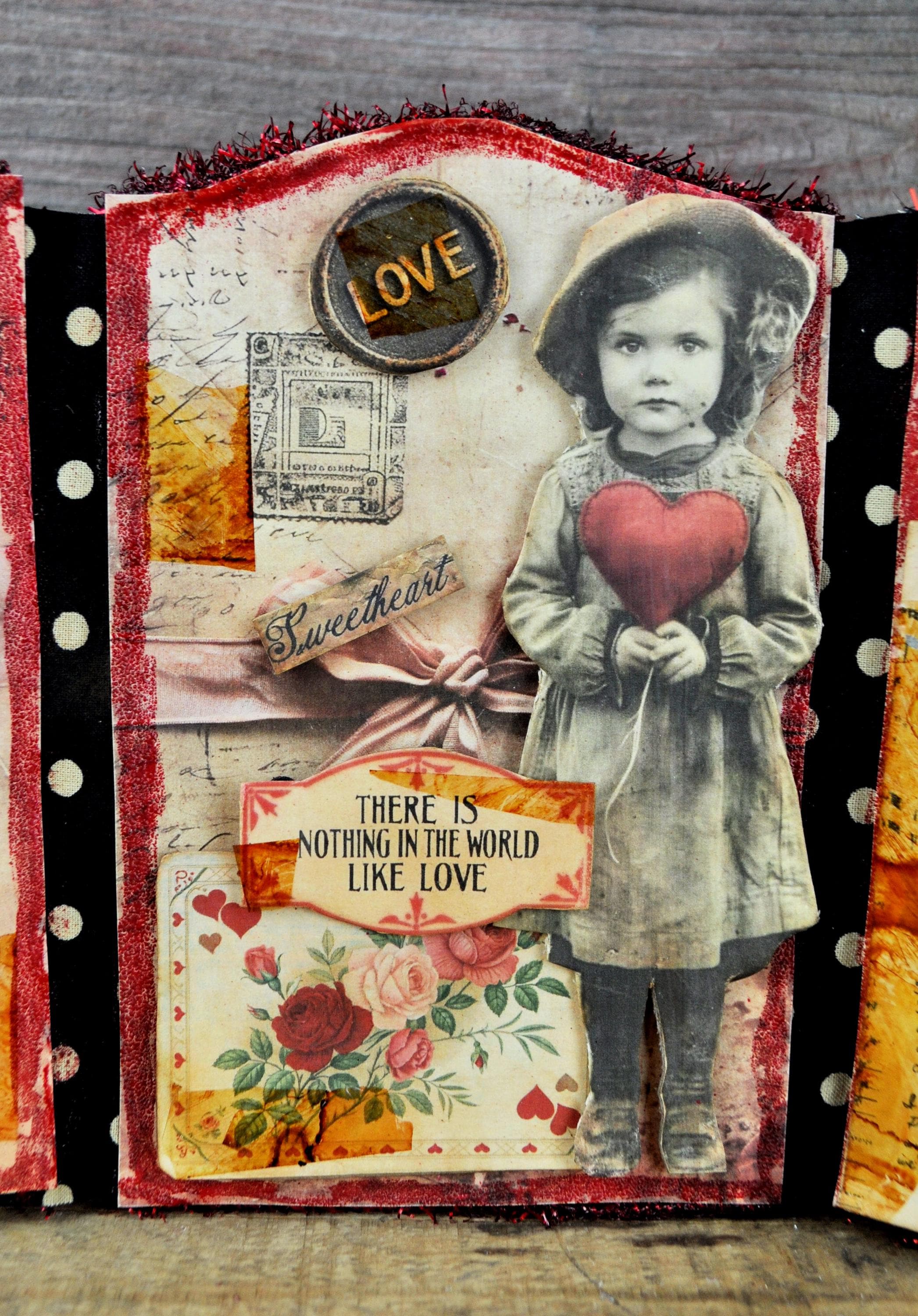 Barb Olson of Muddy Creek Primitives, designer and creator of unique handmade pieces is pleased to offer this primitive one-of-a-kind Valentines Day Trifold Collage. This trifold has three different sweet Valentine images and sprinkled with glitter and embellished with faux vintage cellophane tape. Each panel is trimmed with red sparkle tinsel. The back is also decorated with Valentines Day graphics. This Valentine collage measures 14 1/2" x 7 1/4 ". It will look perfect sitting on a mantle or your desk with all your prim decor.