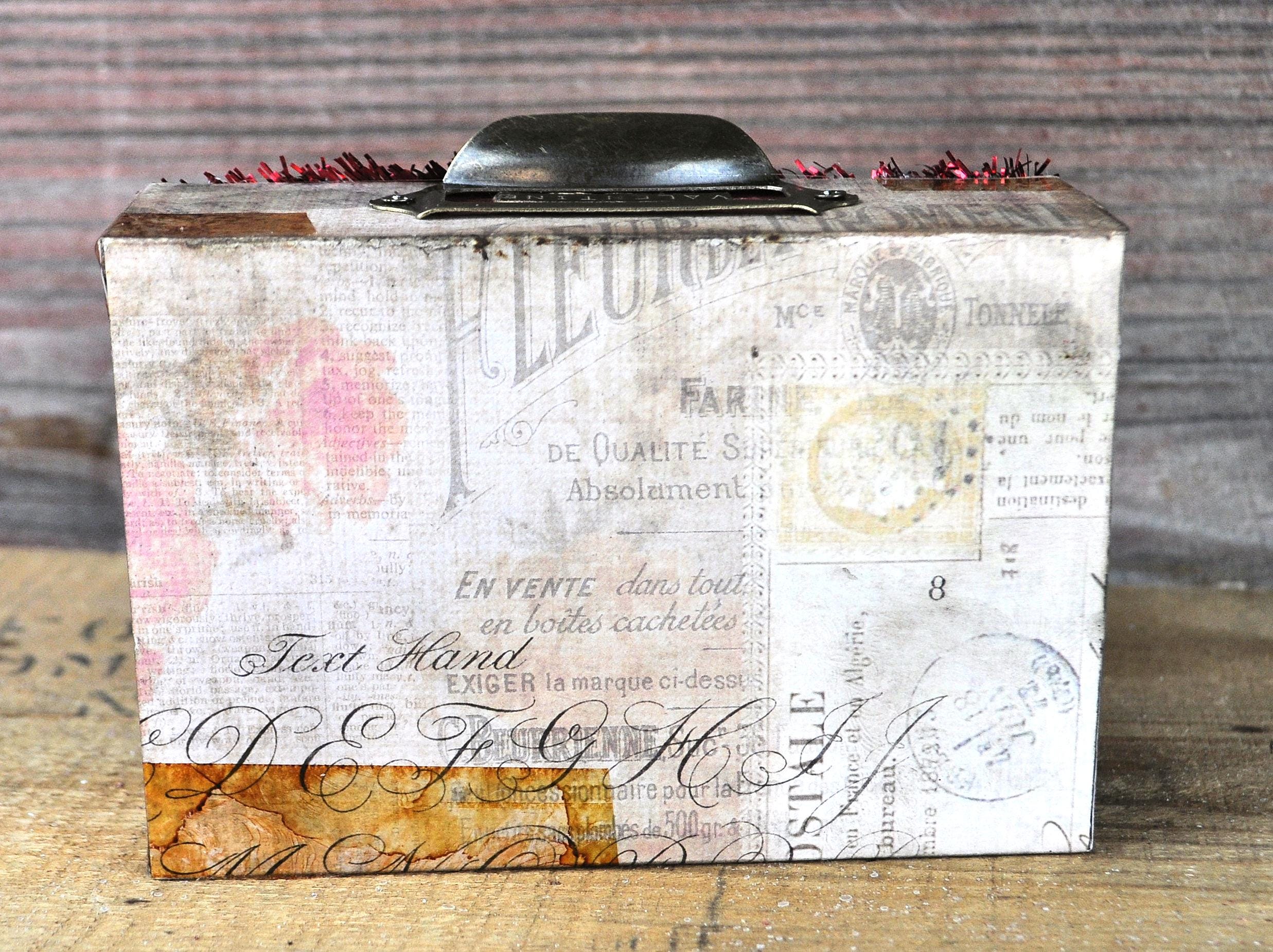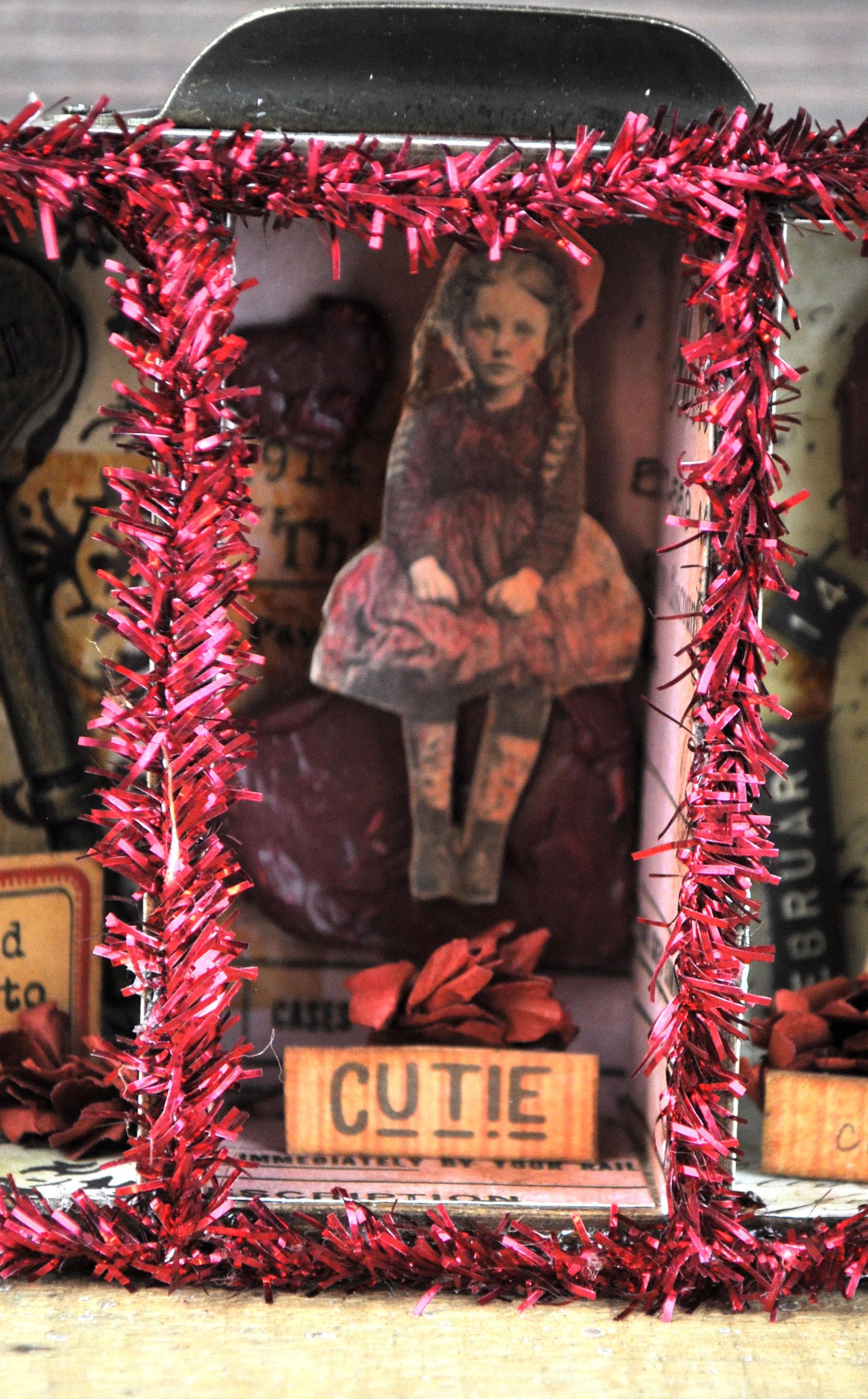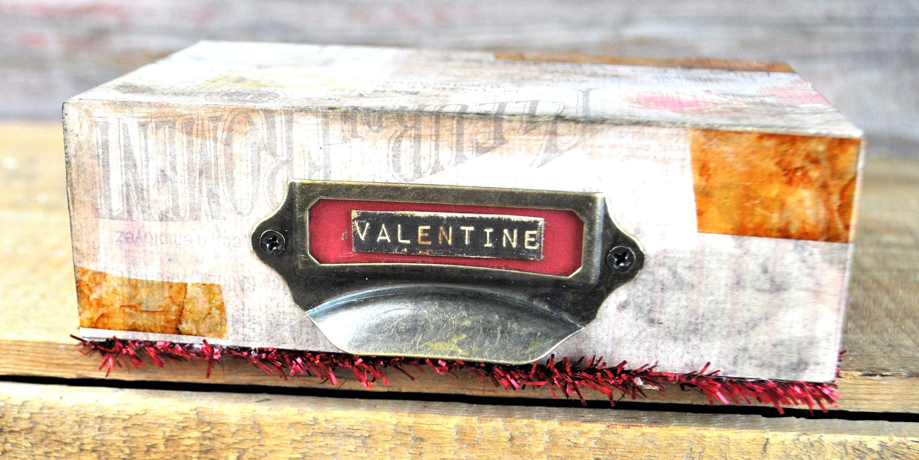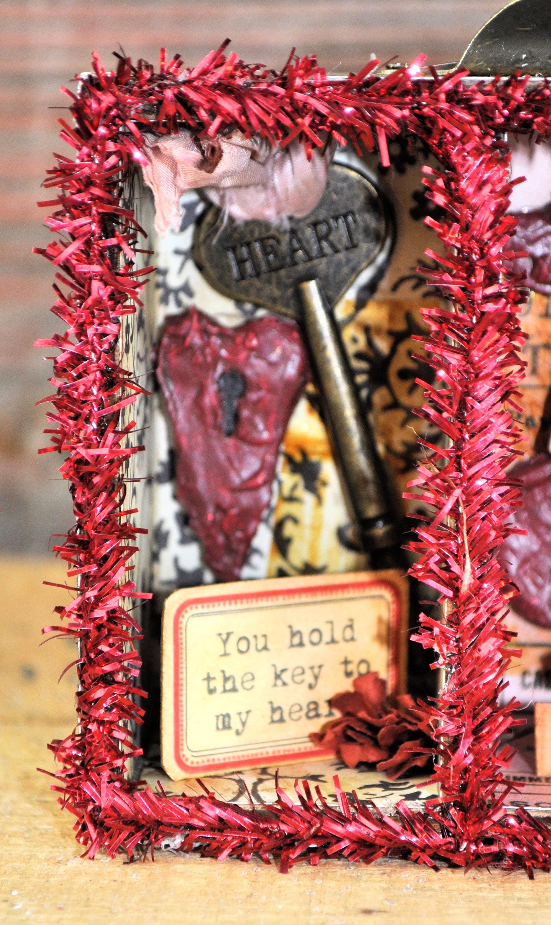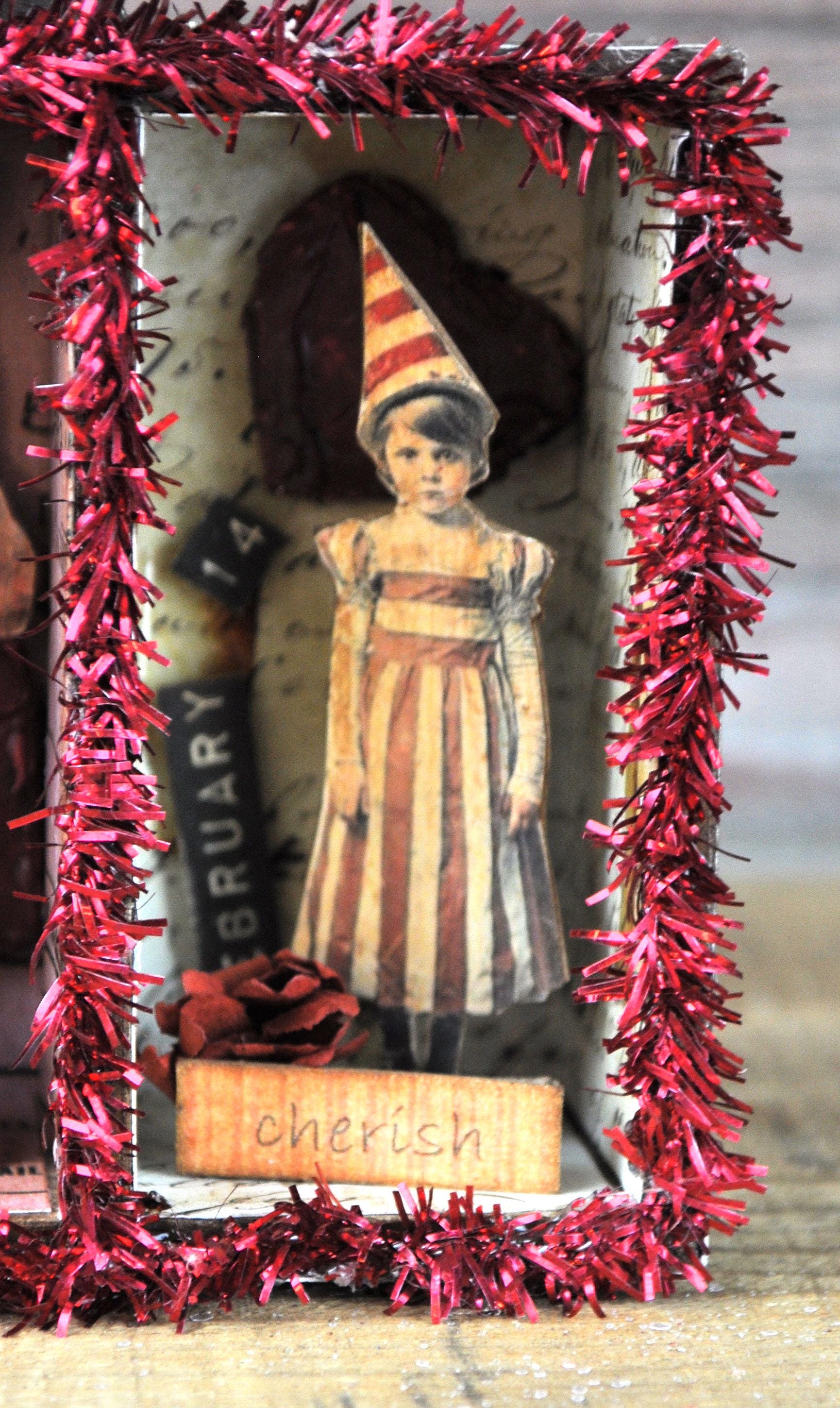 Barb Olson of Muddy Creek Primitives, designer and creator of unique handmade pieces is pleased to offer this small primitive one-of-a-kind Valentines Day vignette display. There is a vintage looking key with silk ribbon and a heart with a keyhole. The middle section has a little girl sitting on a heart. The third section has a vintage looking girl with a heart and February 14. Each section is covered with different vintage looking paper and has a small sign in front. There is a drawer pull on the top with the word "Valentine" inside. It also has faux vintage cellophane tape in various spots and faux red flowers in each section. The back and sides are also covered in a vintage looking paper. It is trimmed with red sparkle tinsel. This Valentines Day vignette measures 3 1/2" high x 5 1/2" wide x 1" deep. It will look perfect with all your prim Valentines Day decor.