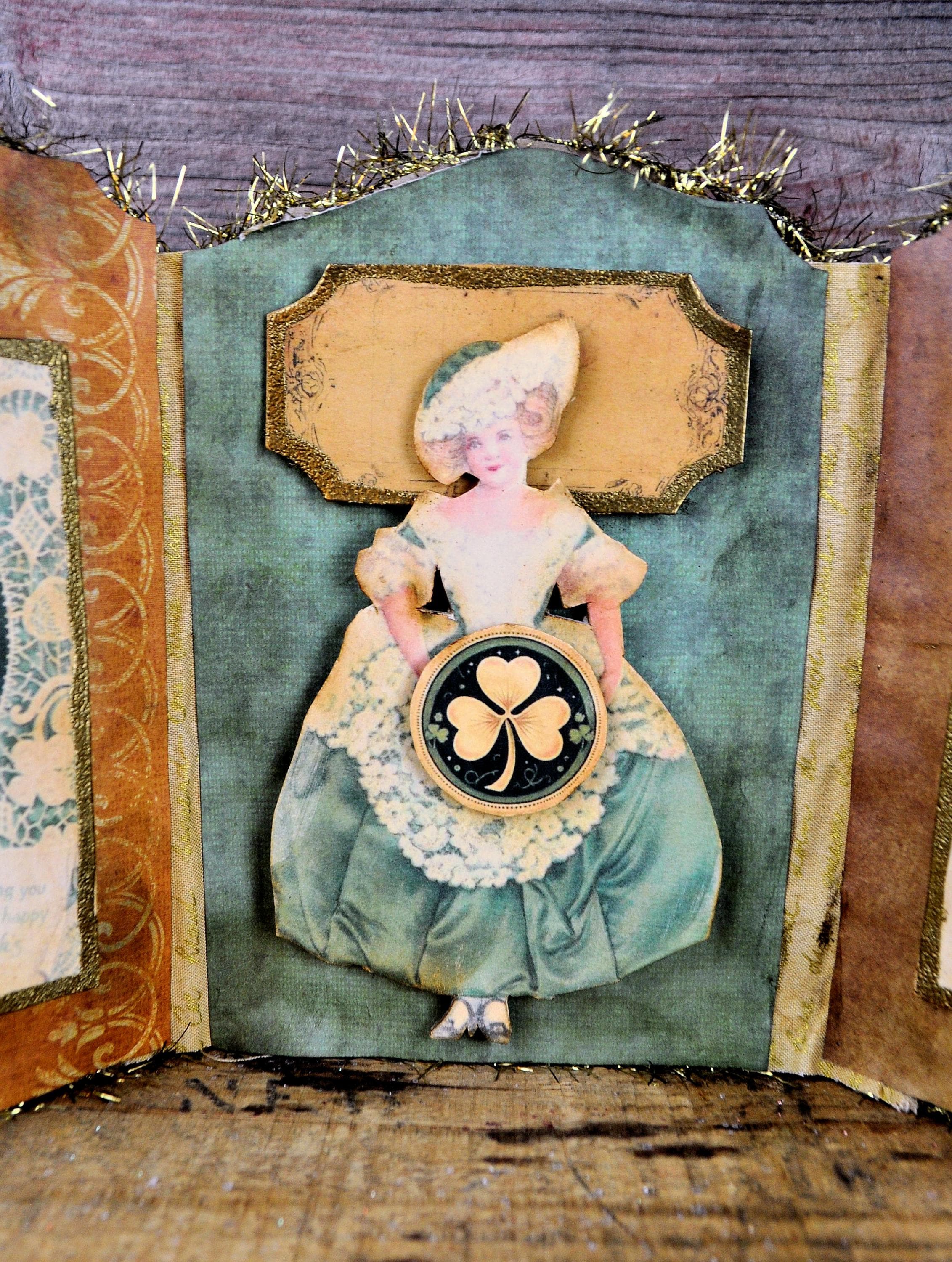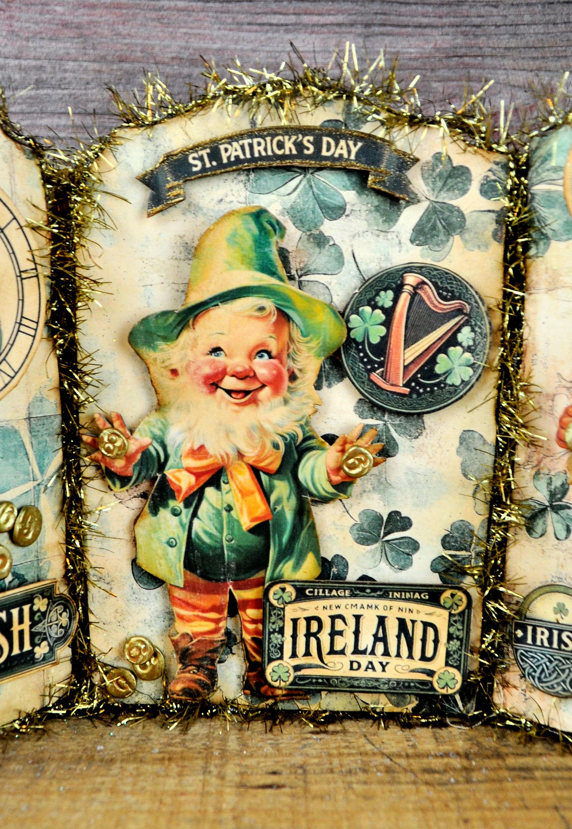 Barb Olson of Muddy Creek Primitives, designer and creator of unique handmade pieces is pleased to offer this primitive one-of-a-kind St. Patrick's Day Trifold Collage. This trifold has three different leprechaun images and embellished with faux vintage cellophane tape. Each panel is trimmed with gold tinsel garland. They each have small handmade gold coins added to them. The back is also decorated with St. Patrick's Day graphics. This St. Pat's collage measures 14 1/2" x 7 1/4 ". It will look perfect sitting on a mantle or your desk with all your prim decor.