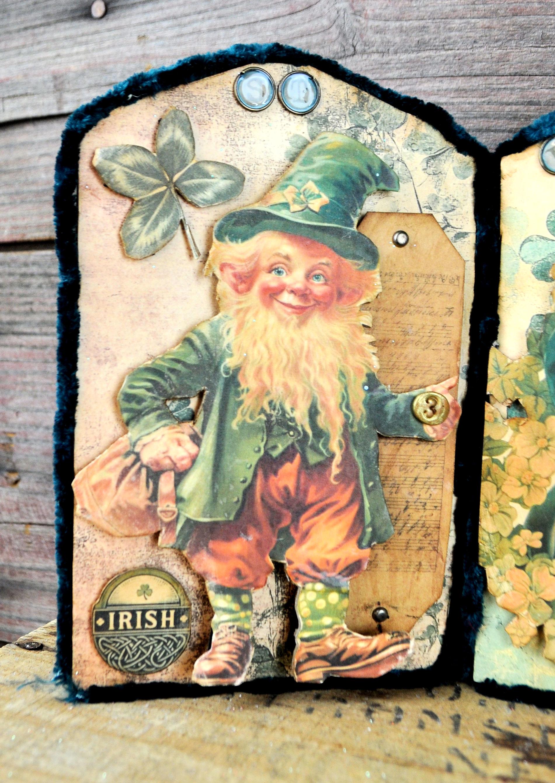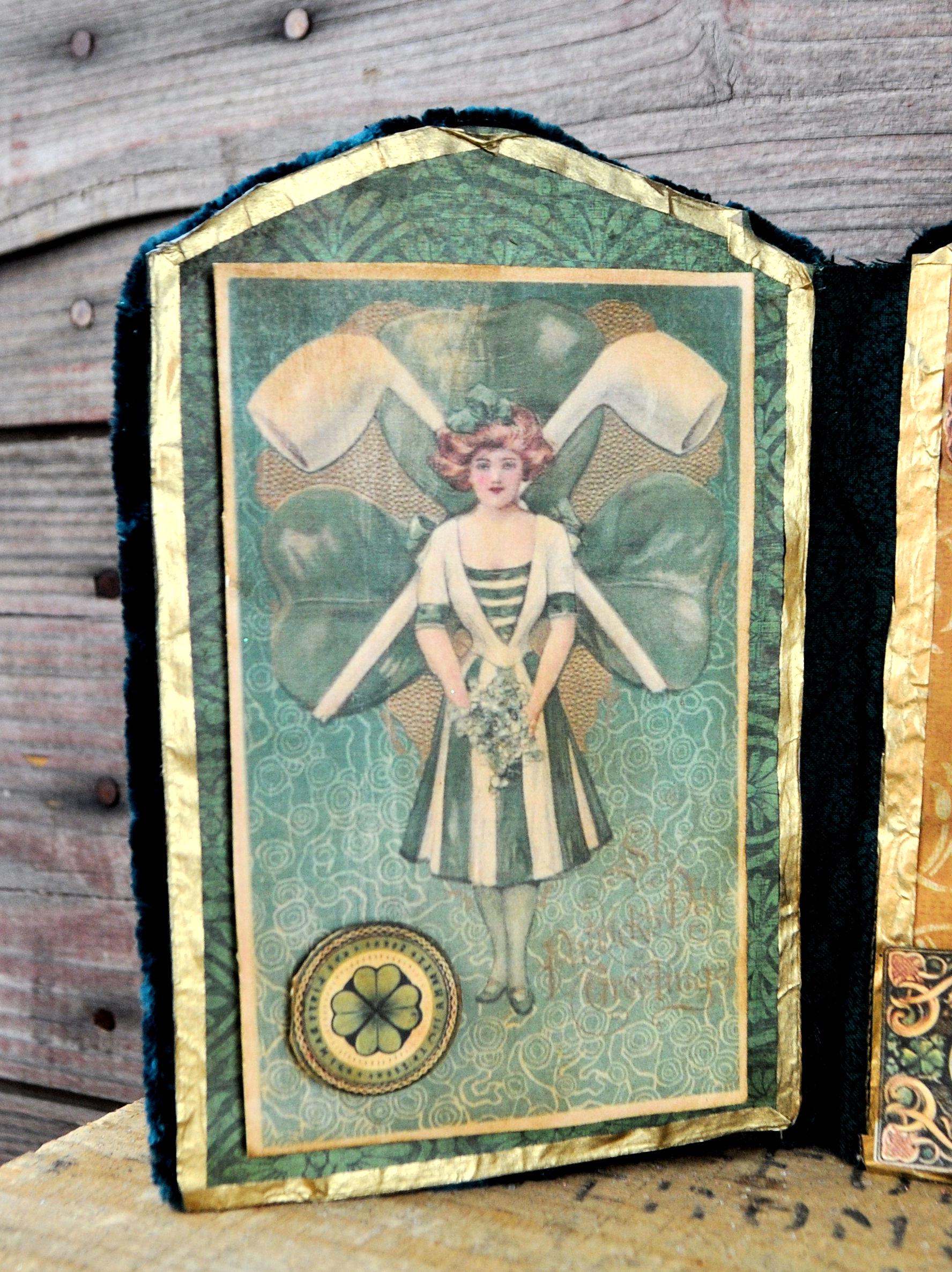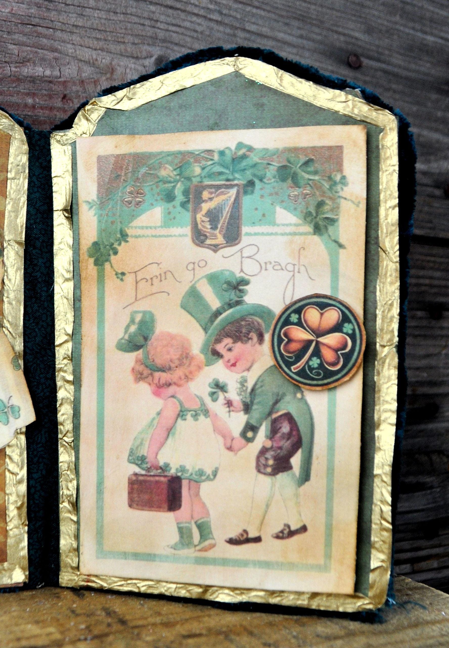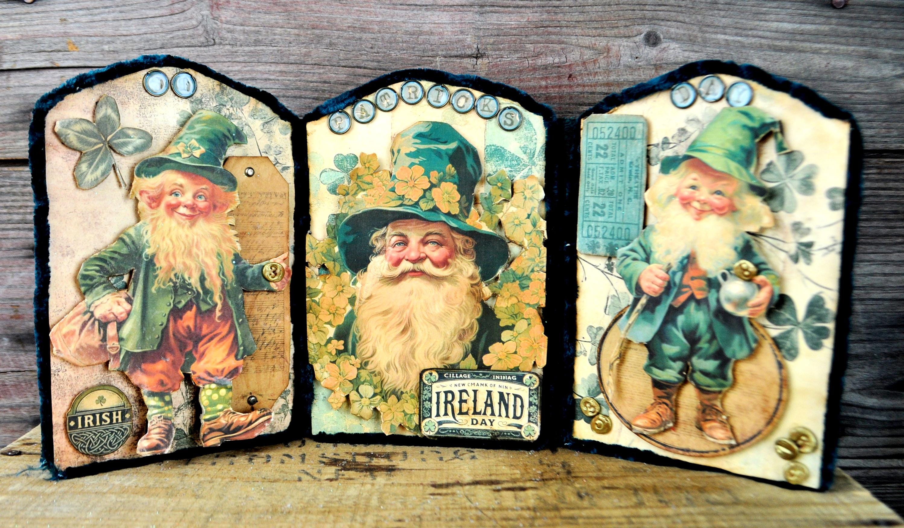 Barb Olson of Muddy Creek Primitives, designer and creator of unique handmade pieces is pleased to offer this primitive one-of-a-kind St. Patrick's Day Trifold Collage. This trifold has three different leprechaun images and embellished with faux vintage cellophane tape. The panels have small metal charms that spell "St Patricks Day". Each panel is trimmed with green chenille yarn. They each have small handmade gold coins added to them. The back is also decorated with St. Patrick's Day graphics. This St. Pat's collage measures 14 1/2" x 7 1/4 ". It will look perfect sitting on a mantle or your desk with all your prim decor.
