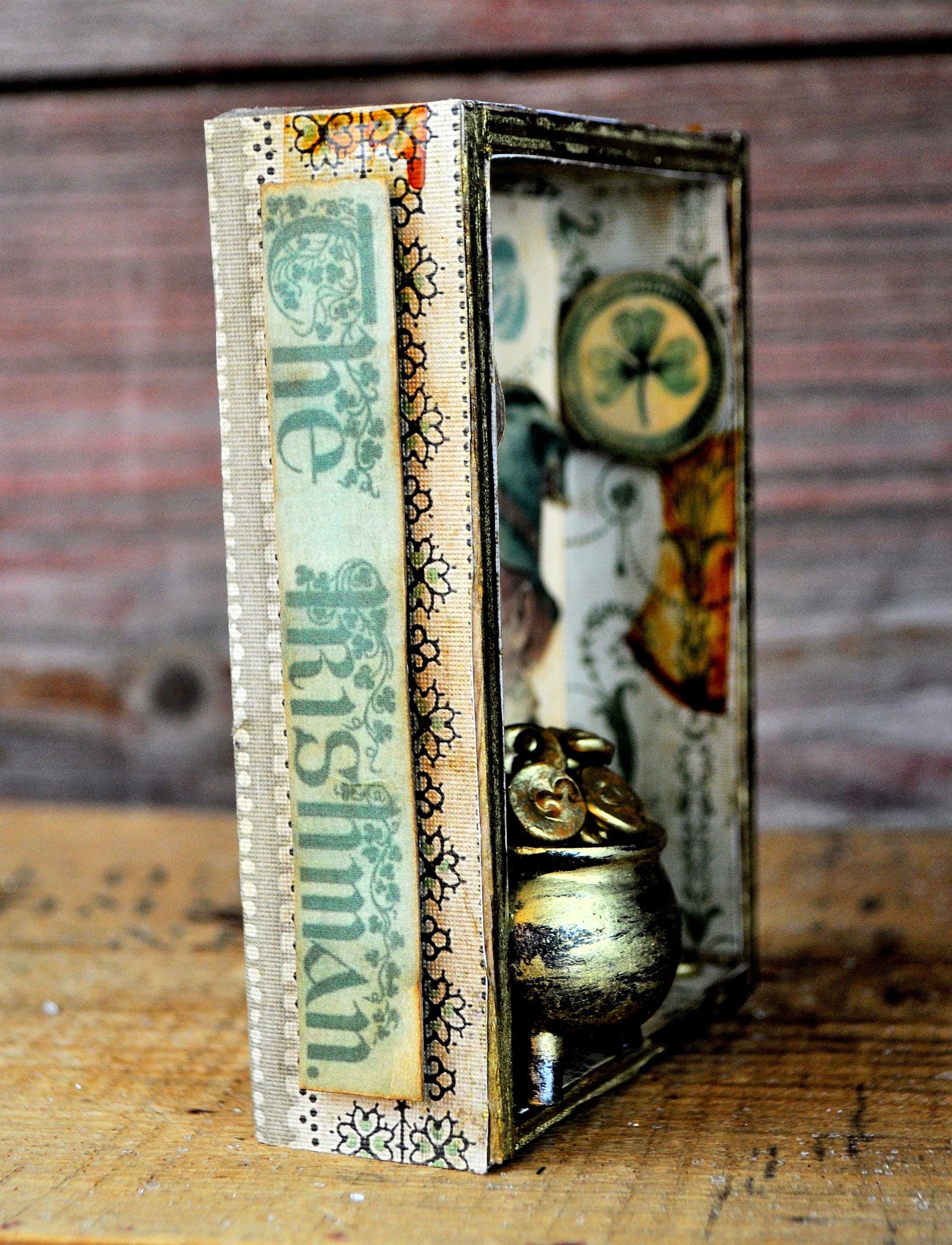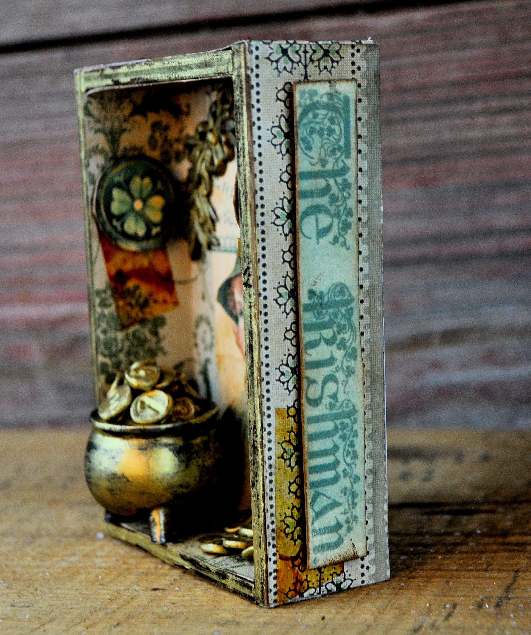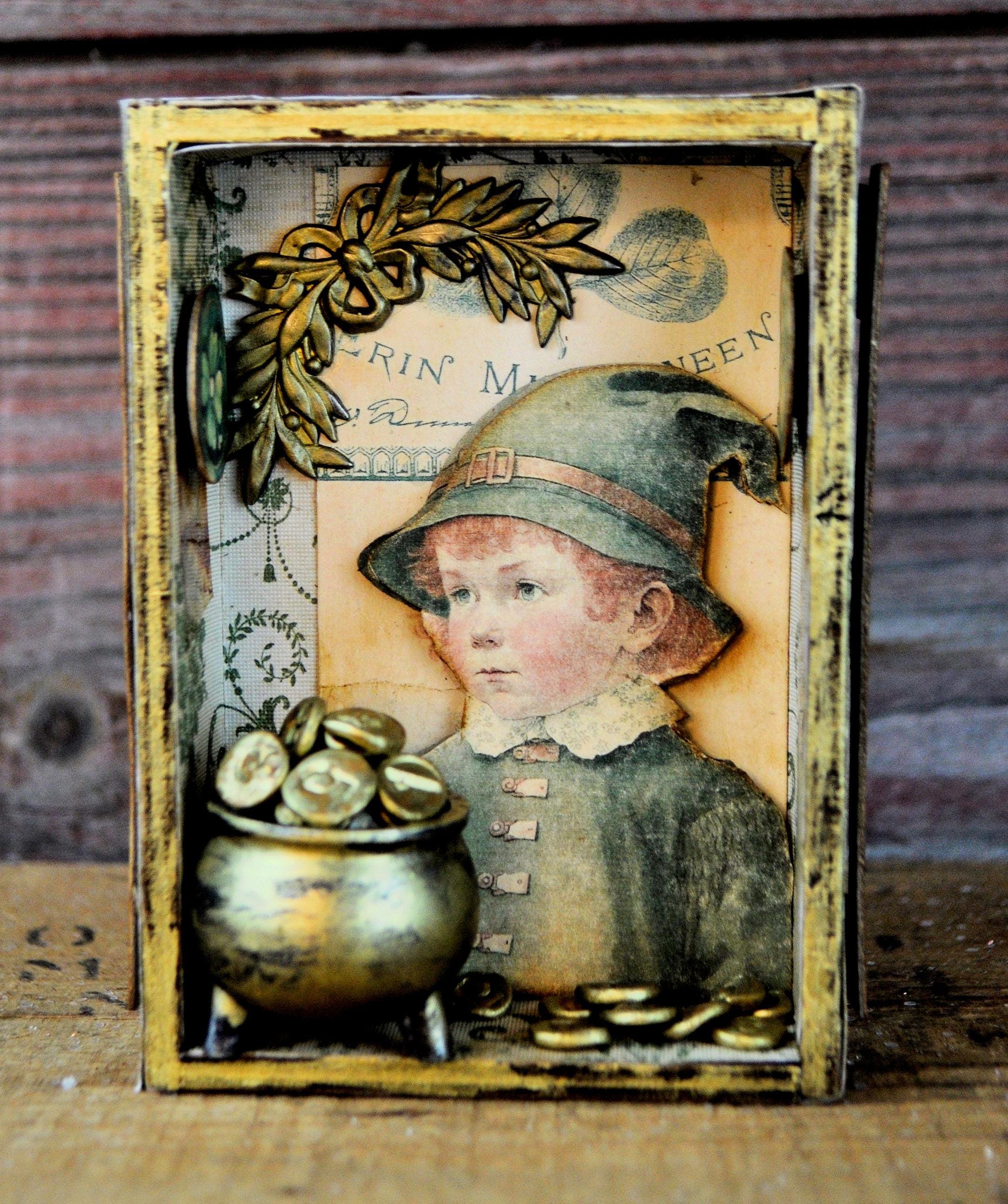 Barb Olson of Muddy Creek Primitives, designer and creator of unique handmade pieces is pleased to offer this small primitive one-of-a-kind St. Patrick's Day wooden vignette display. There is a sweet Leprechaun image with a metal embellishment which has been painted gold. It also has a pot filled with handmade gold coins. There are pieces of faux vintage cellophane tape in various spots. The back and sides are also covered in a vintage looking paper. It is trimmed with gold paint. The sides have a graphic that reads "The Irishman". This St. Patrick's Day vignette measures 3 1/2" high x 4 3/4" wide x 1" deep. It will look perfect with all your prim St Pats Day decor.
