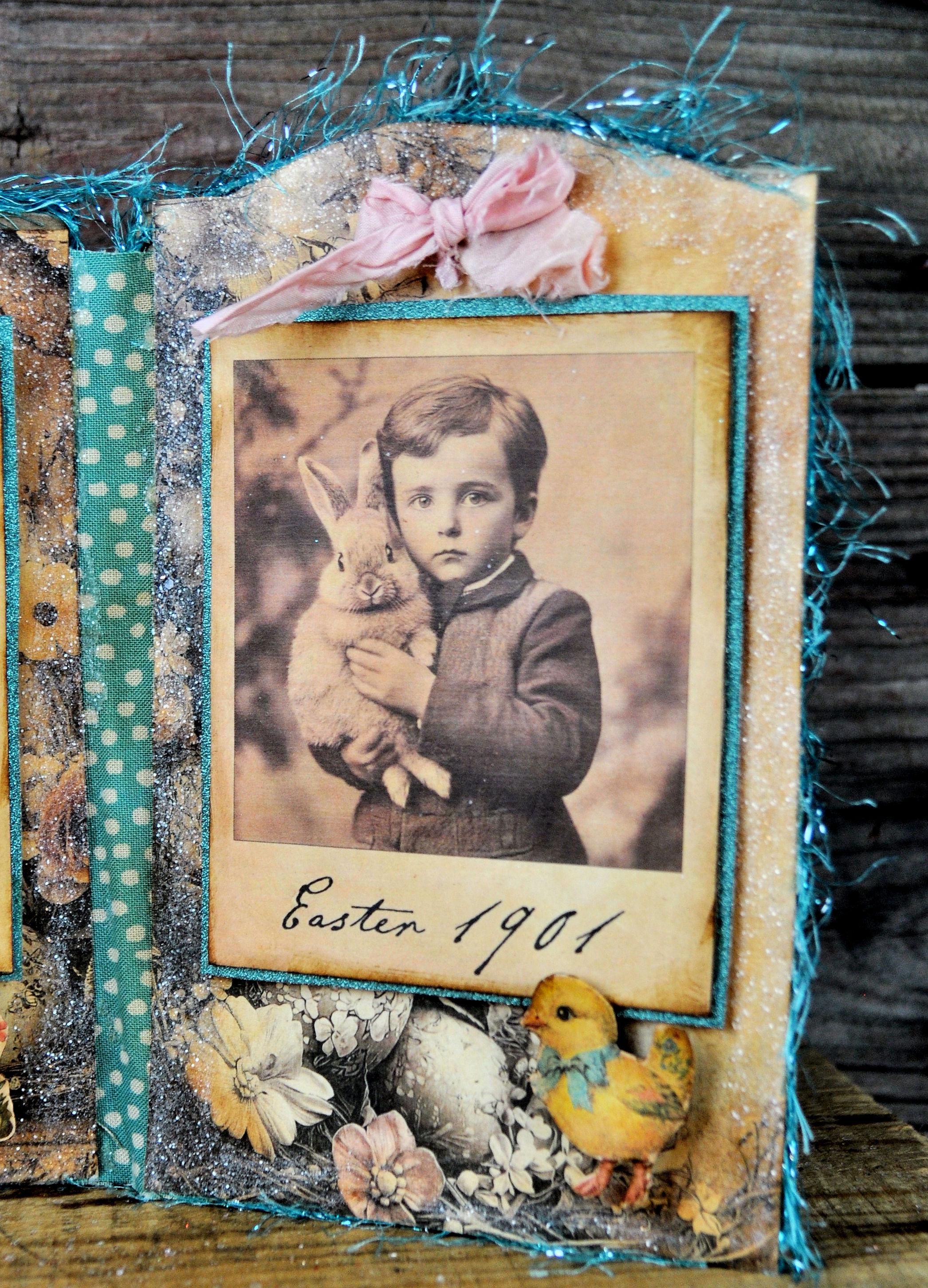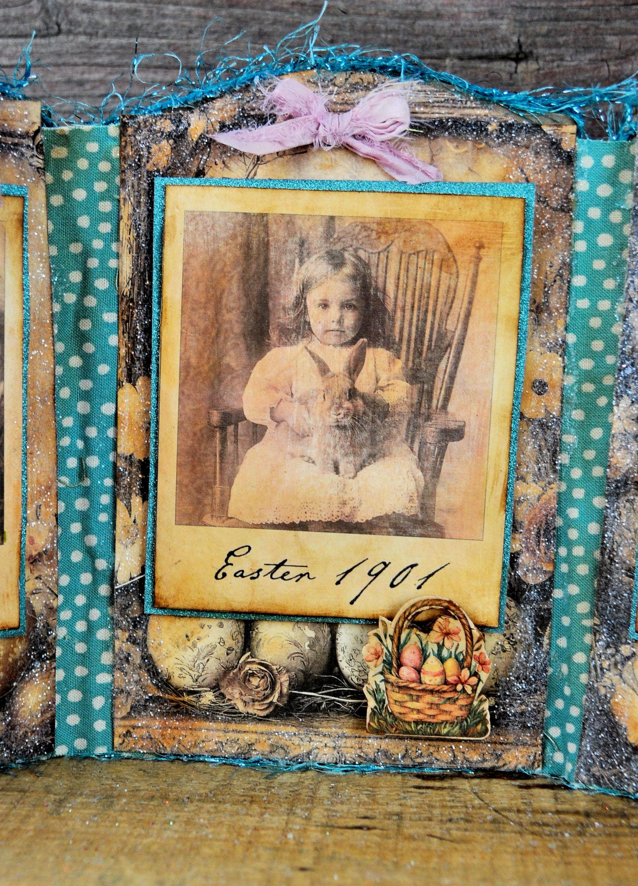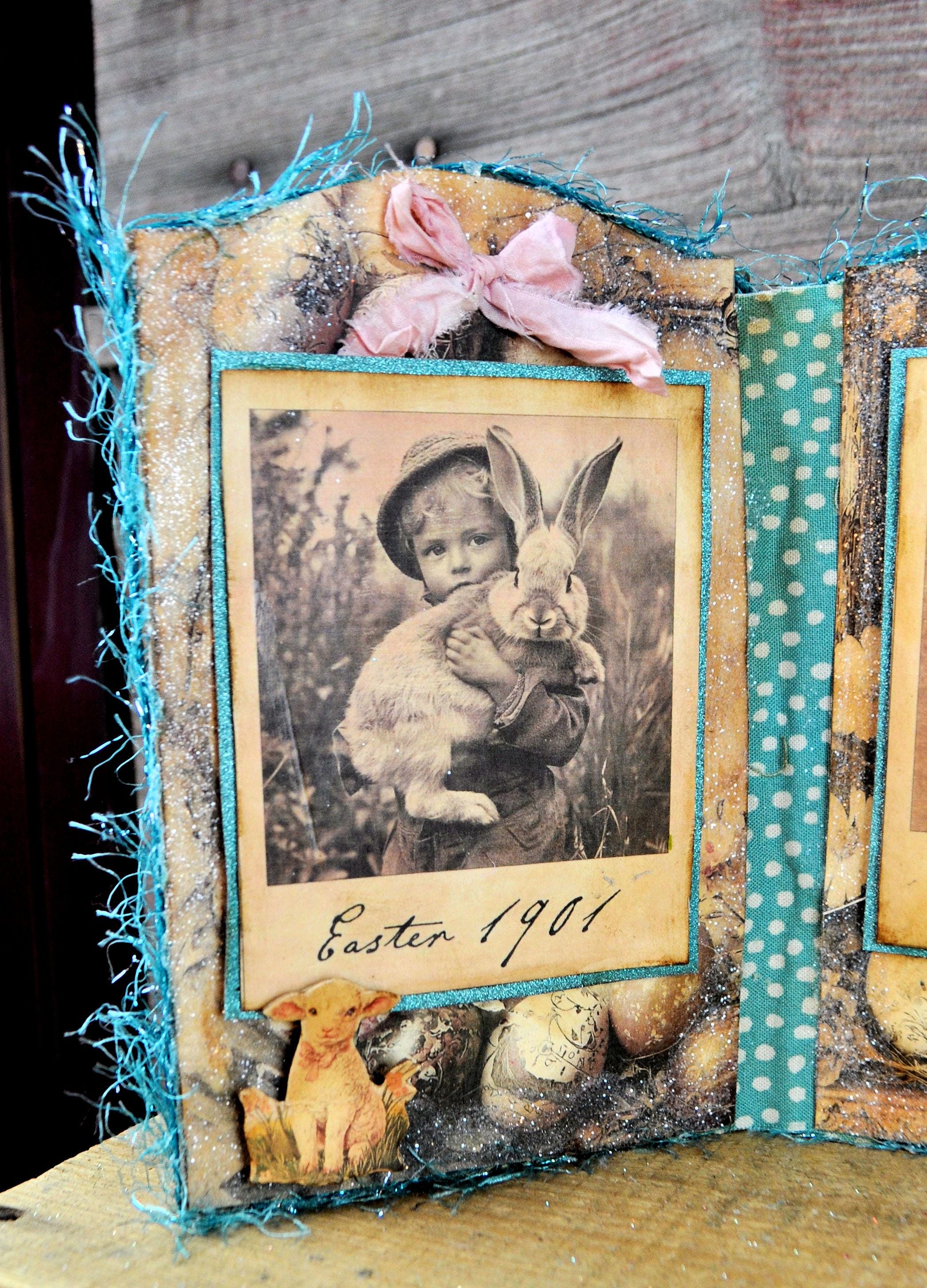 Barb Olson of Muddy Creek Primitives, designer and creator of unique handmade pieces is pleased to offer this primitive one-of-a-kind Easter Trifold Collage. These are fun antique style Easter images. There is clear glitter on the Easter eggs. The back of these panels has sweet vintage looking images of Easter children with bunnies. They are all trimmed in aqua blue sparkle yarn and wonderfully "grunged" up to help them look primitive. This Easter collage measures 14 1/2" x 7 1/4 ". It will look perfect sitting on a table or side table with all your prim decor.