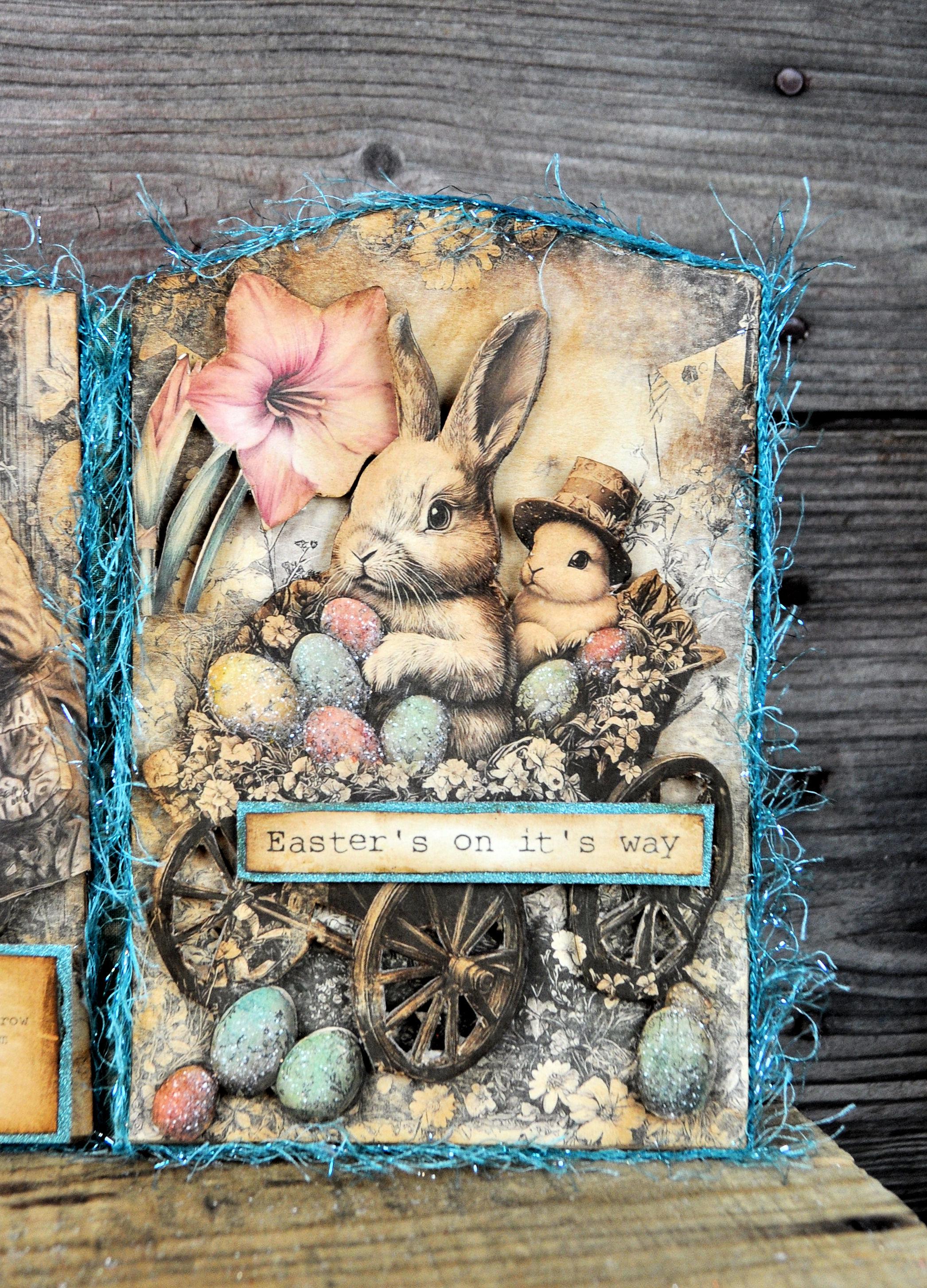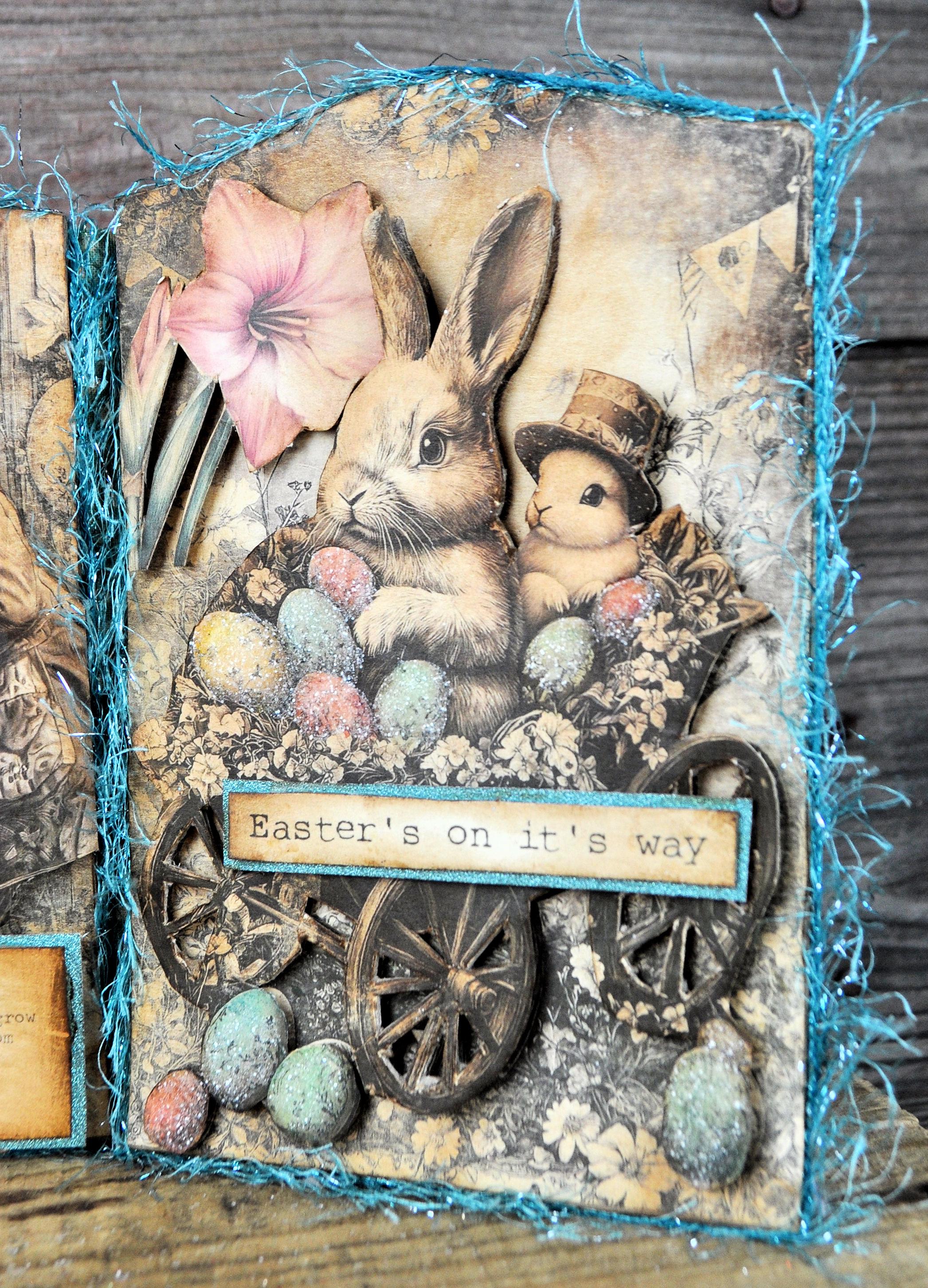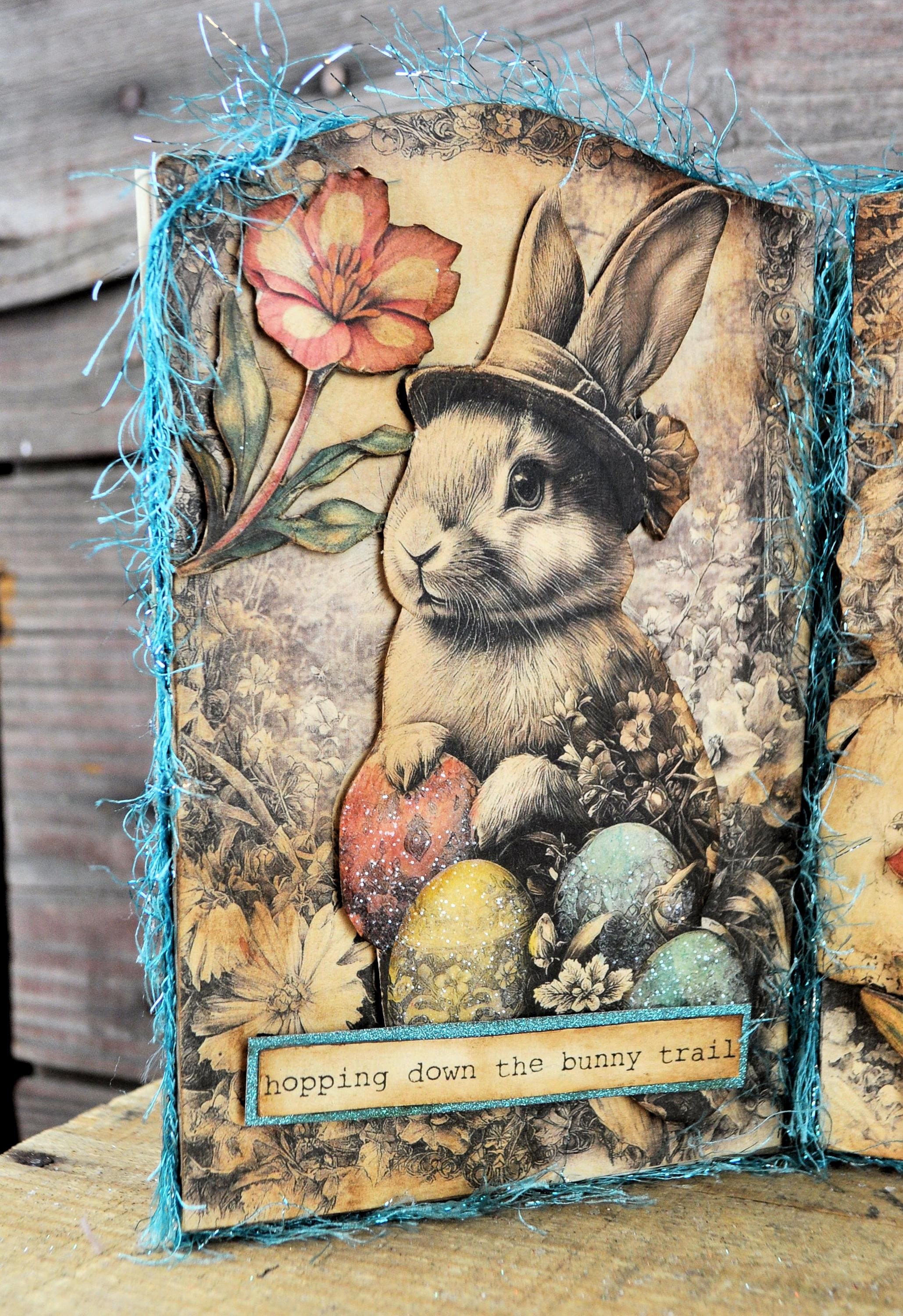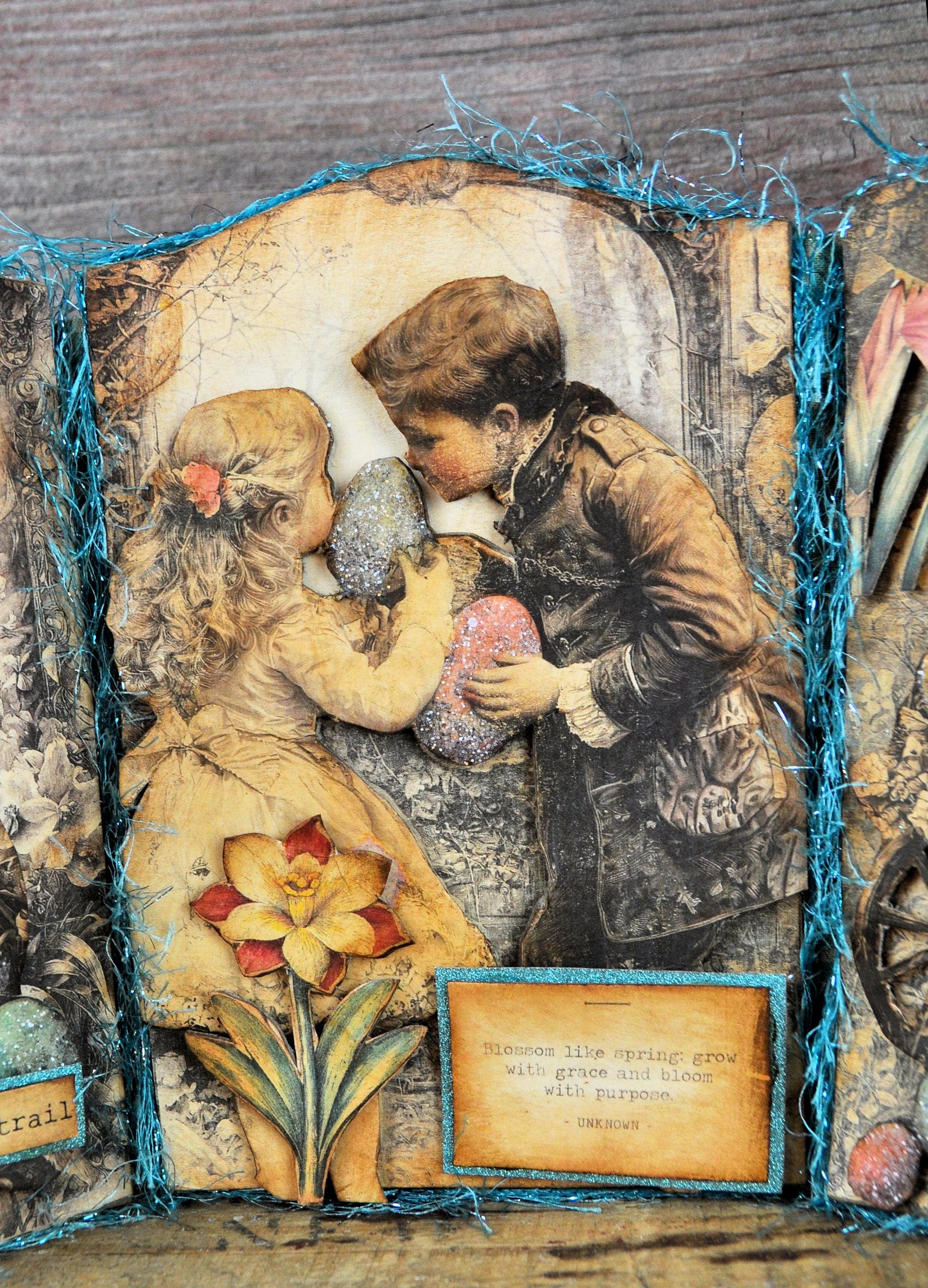 Barb Olson of Muddy Creek Primitives, designer and creator of unique handmade pieces is pleased to offer this primitive one-of-a-kind Easter Trifold Collage. These are fun antique style Easter images. There is clear glitter on the Easter eggs. The back of these panels has sweet vintage looking images of Easter children with bunnies. They are all trimmed in aqua blue sparkle yarn and wonderfully "grunged" up to help them look primitive. This Easter collage measures 14 1/2" x 7 1/4 ". It will look perfect sitting on a table or side table with all your prim decor.