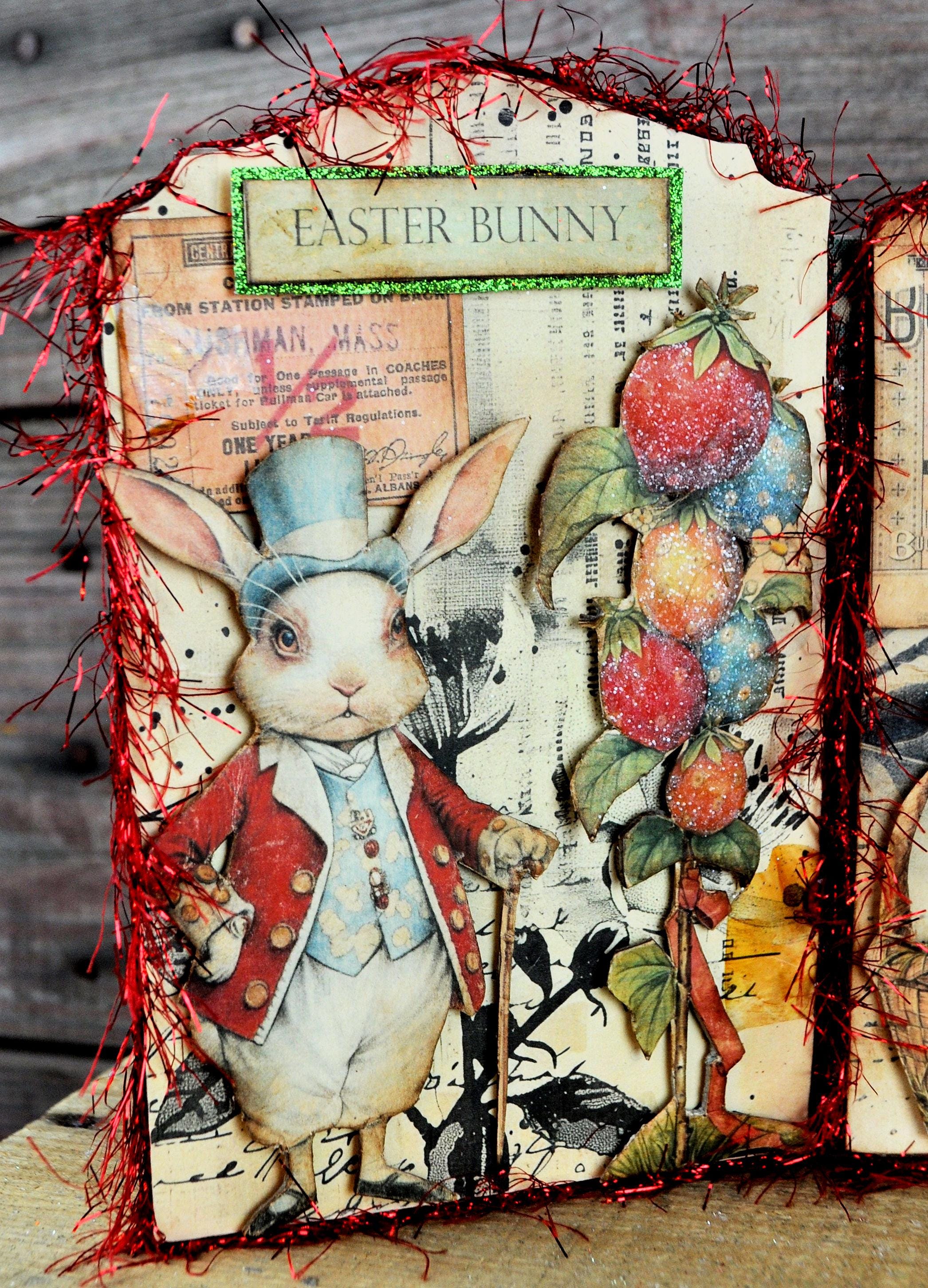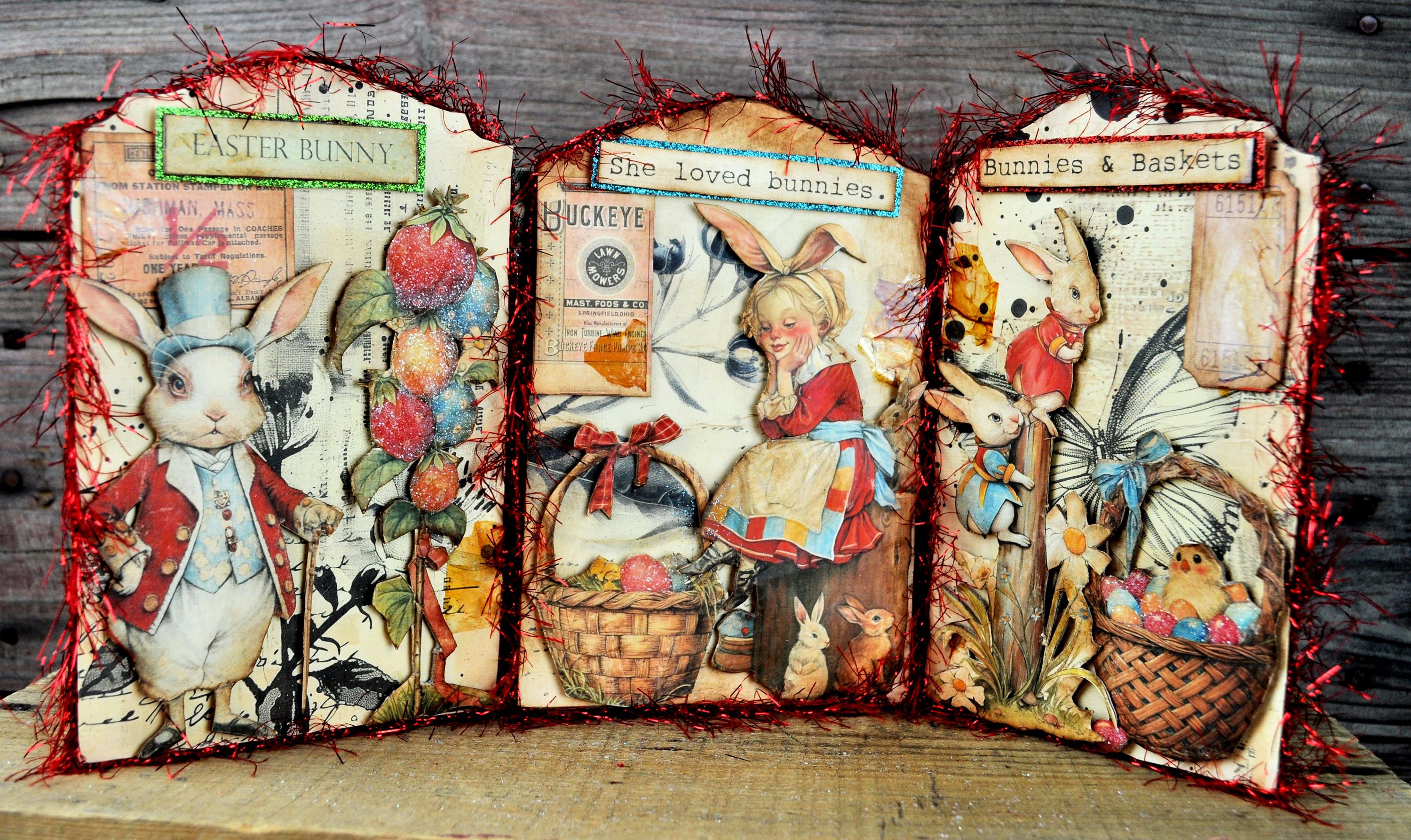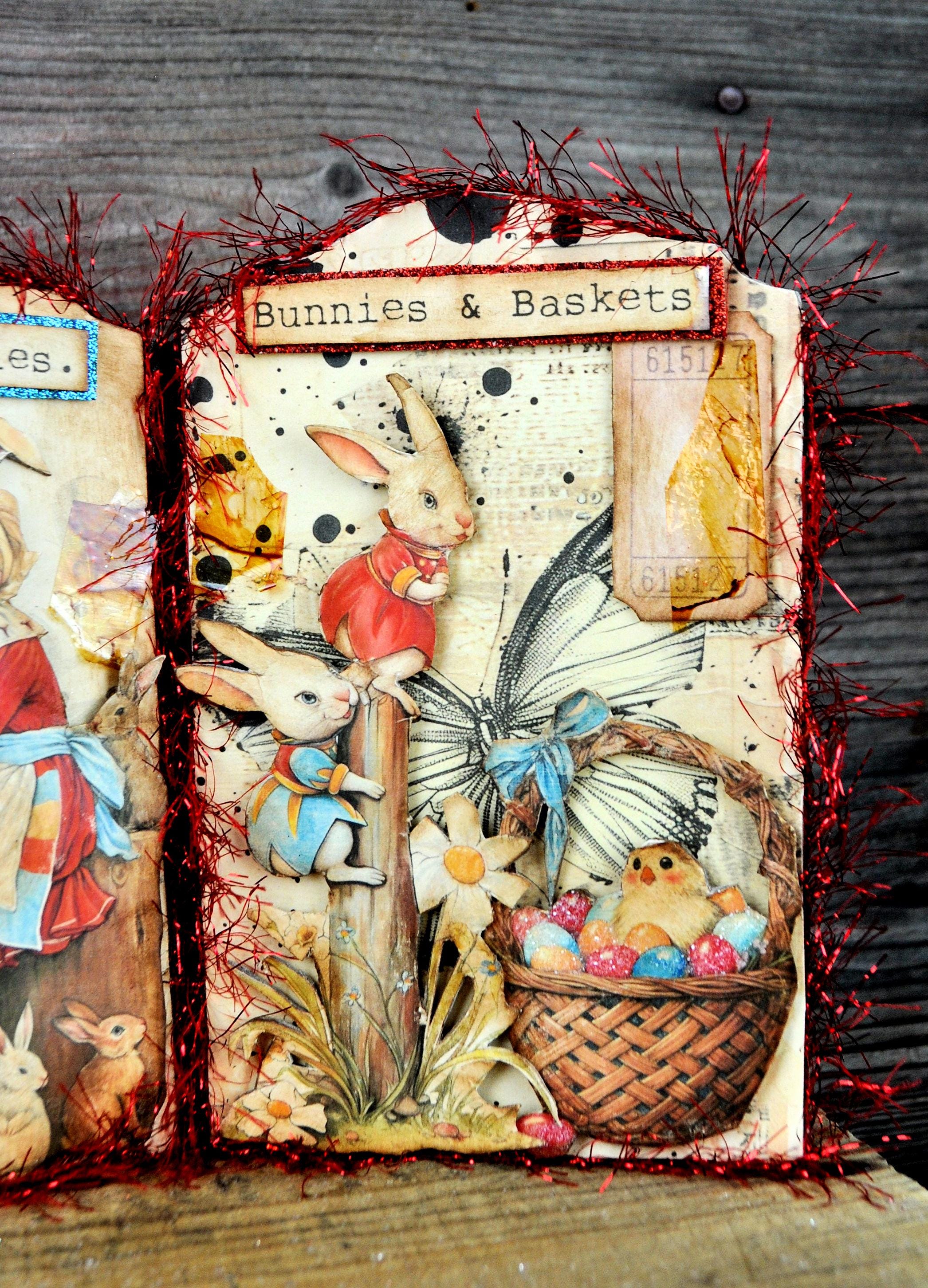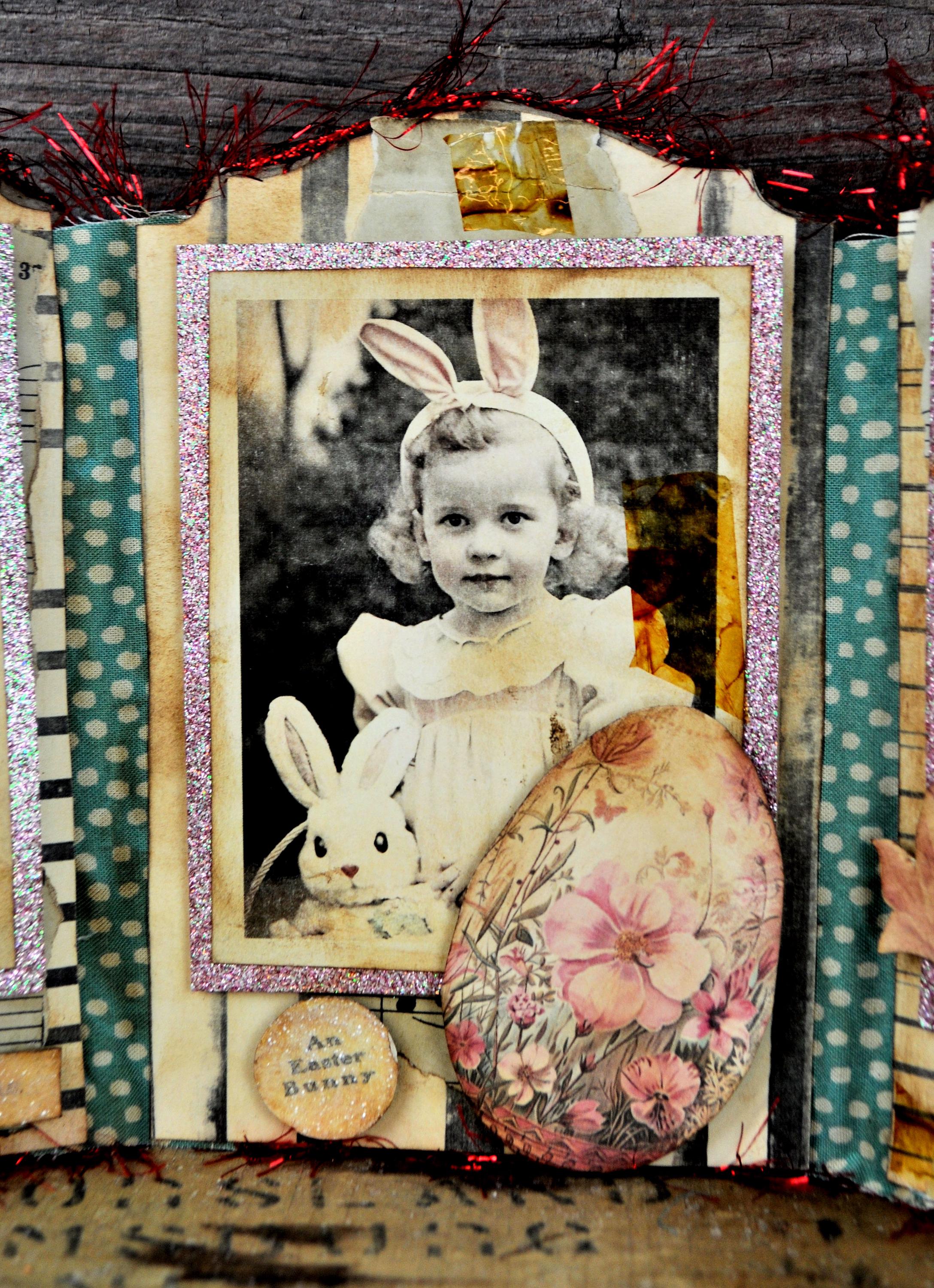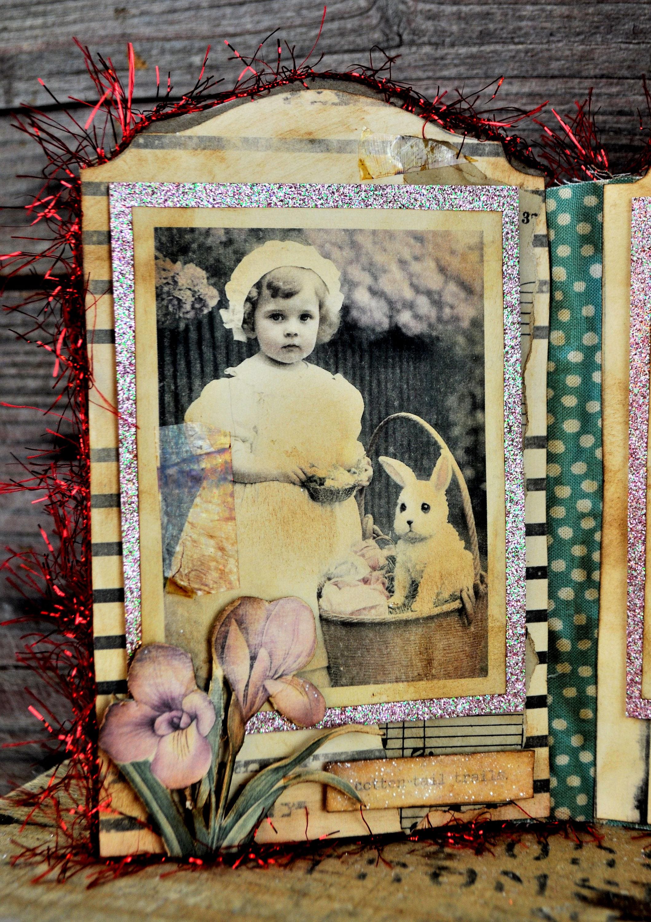 Barb Olson of Muddy Creek Primitives, designer and creator of unique handmade pieces is pleased to offer this primitive one-of-a-kind Easter Trifold Collage. Each panel has a beautiful vintage style Easter image. There is clear glitter on the Easter eggs. The back of these panels has sweet vintage looking images of Easter children. They are all trimmed in red glitter yarn and wonderfully "grunged" up to help them look primitive. This Easter collage measures 14 1/2" x 7 1/4 ". It will look perfect sitting on a table or desk with all your prim decor.