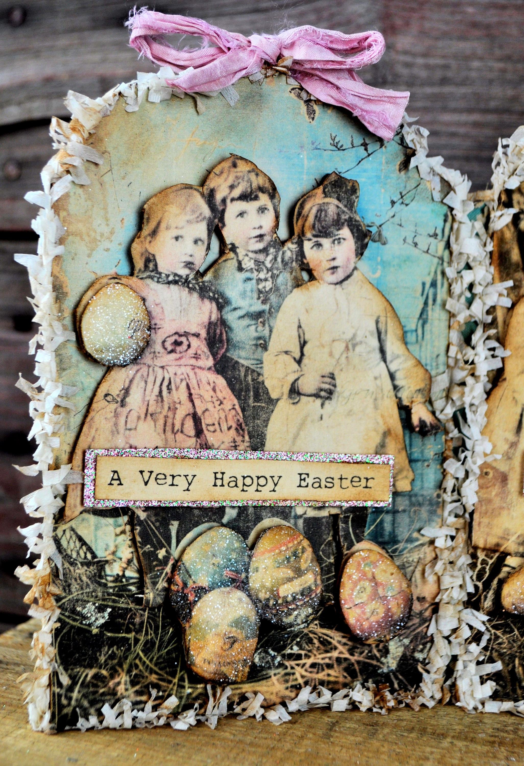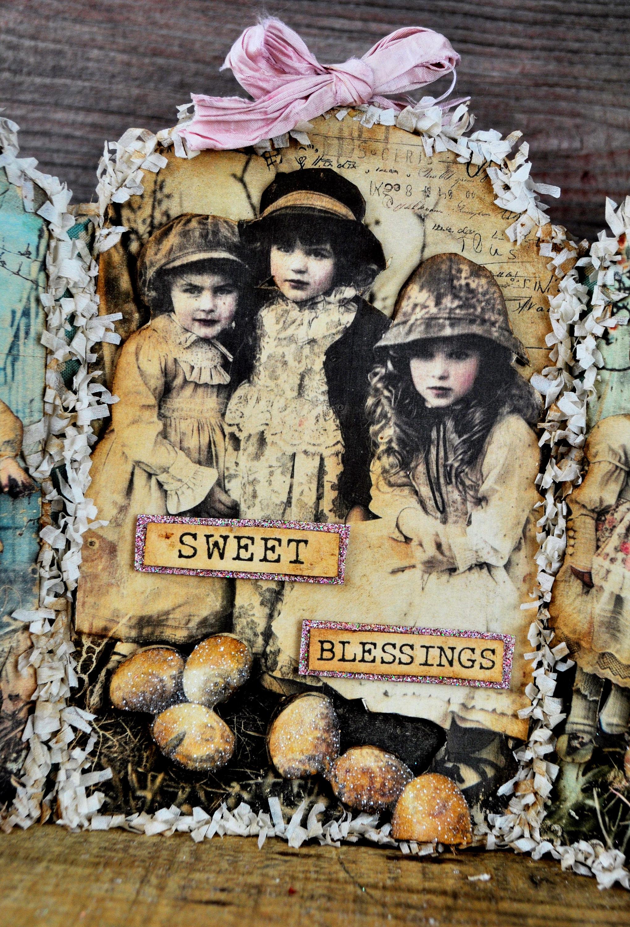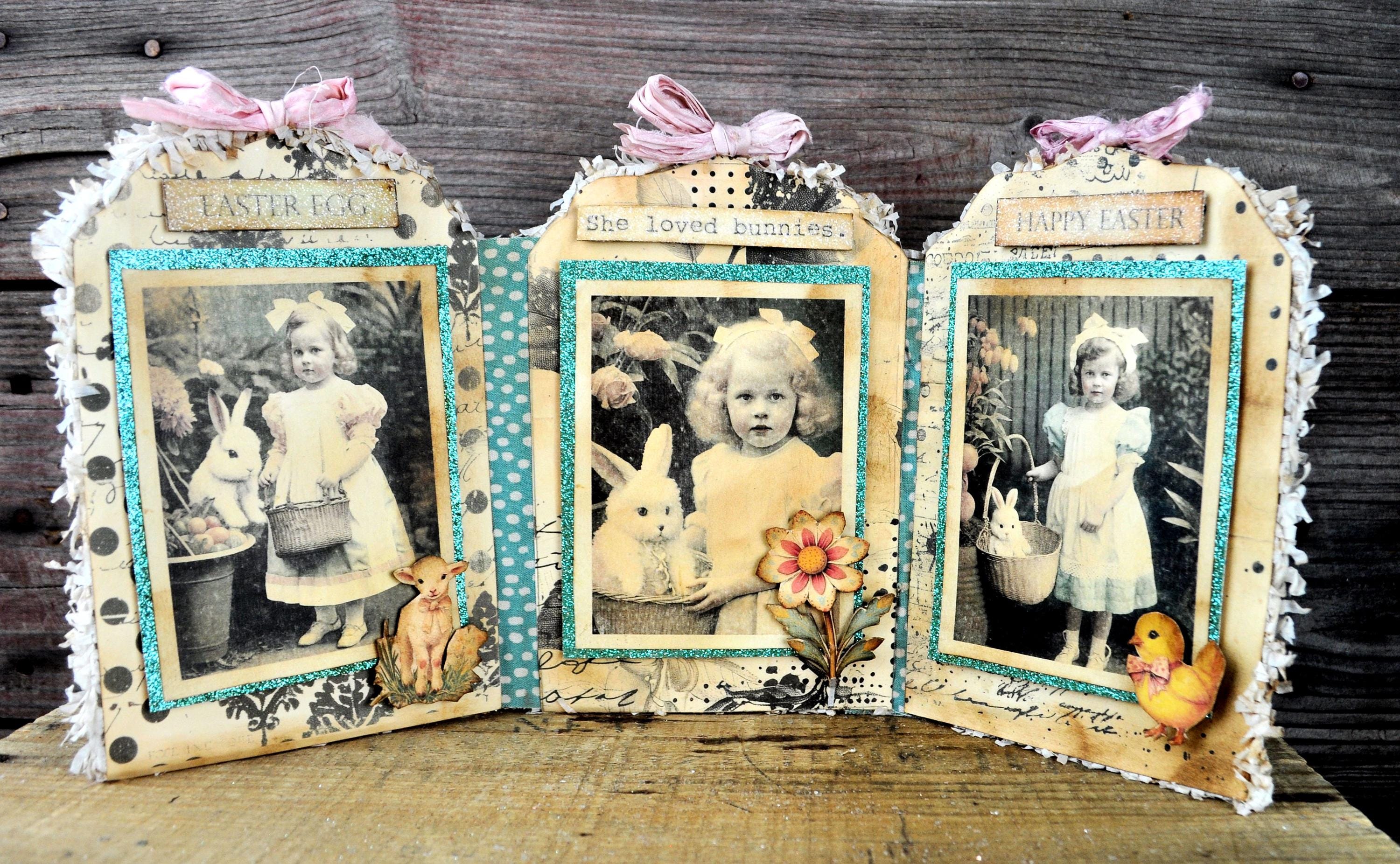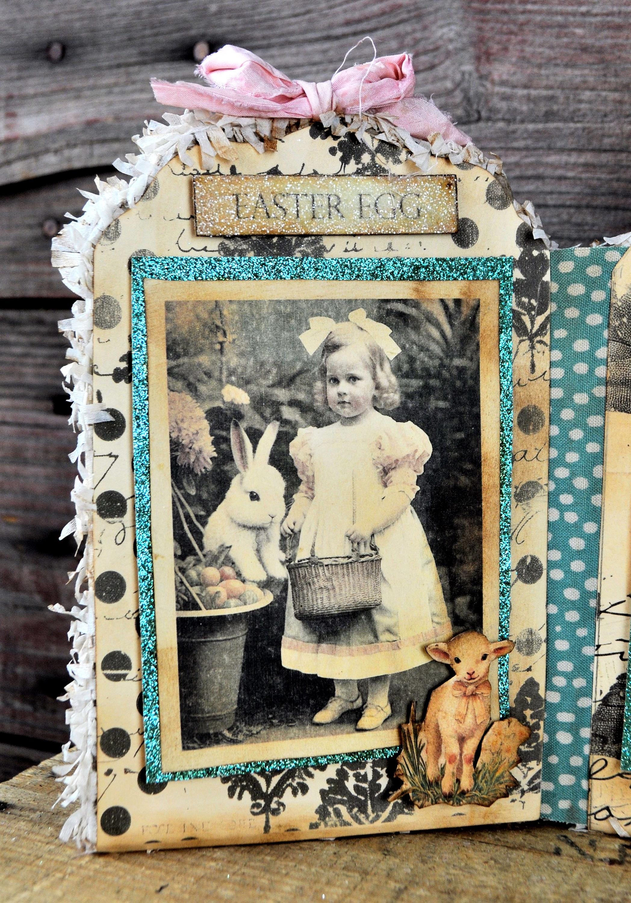 Barb Olson of Muddy Creek Primitives, designer and creator of unique handmade pieces is pleased to offer this primitive one-of-a-kind Easter Trifold Collage. Each panel has a beautiful vintage style Easter image. There is clear glitter on the Easter eggs. The back of these panels has sweet vintage looking images of Easter children with bunnies. They are all trimmed in cream colored crepe paper fringe and have a pink silk bow on the top. Each piece is wonderfully "grunged" up to help them look primitive. This Easter collage measures 14 1/2" x 7 1/4 ". It will look perfect sitting on a table or desk with all your prim decor.