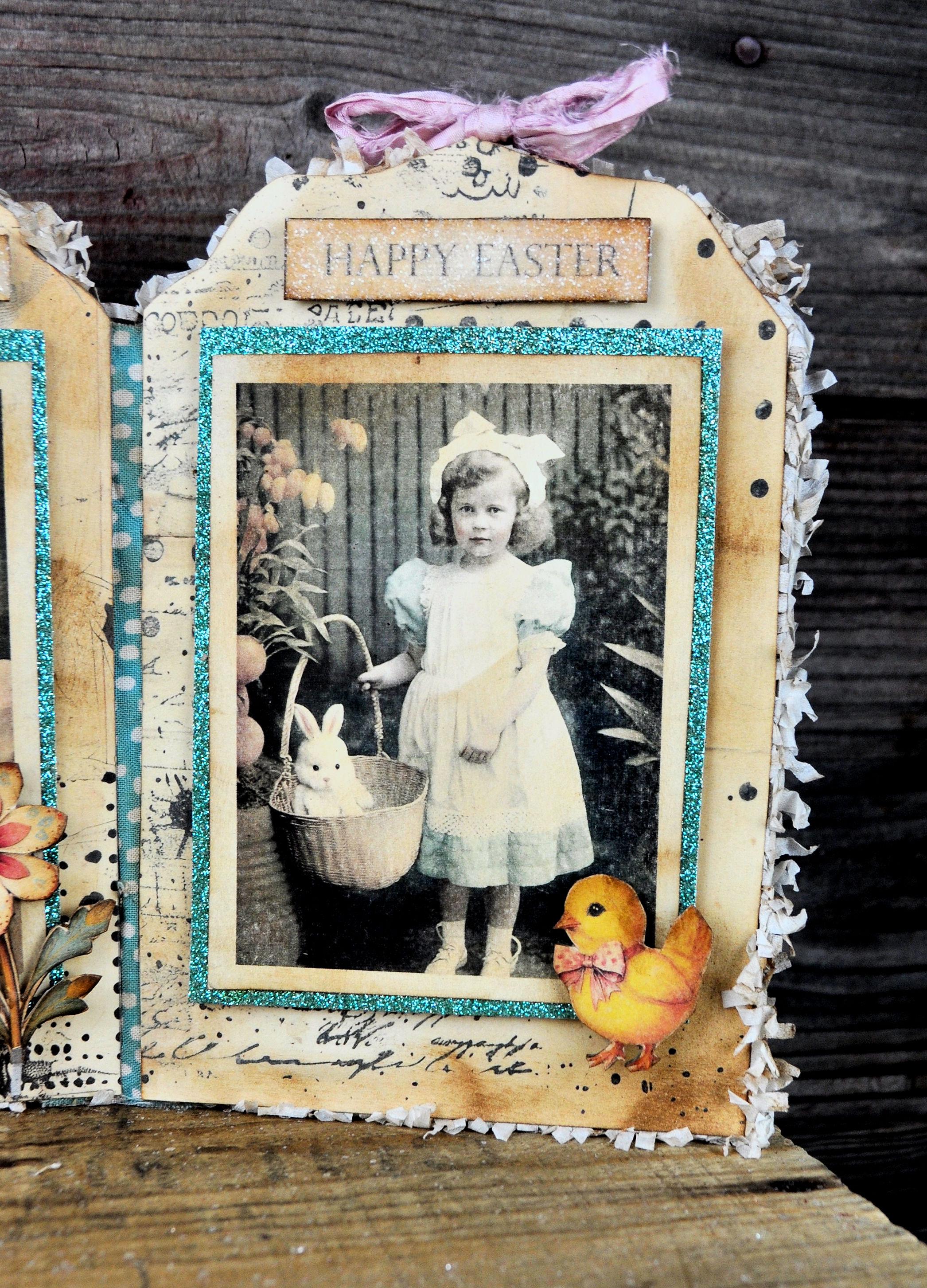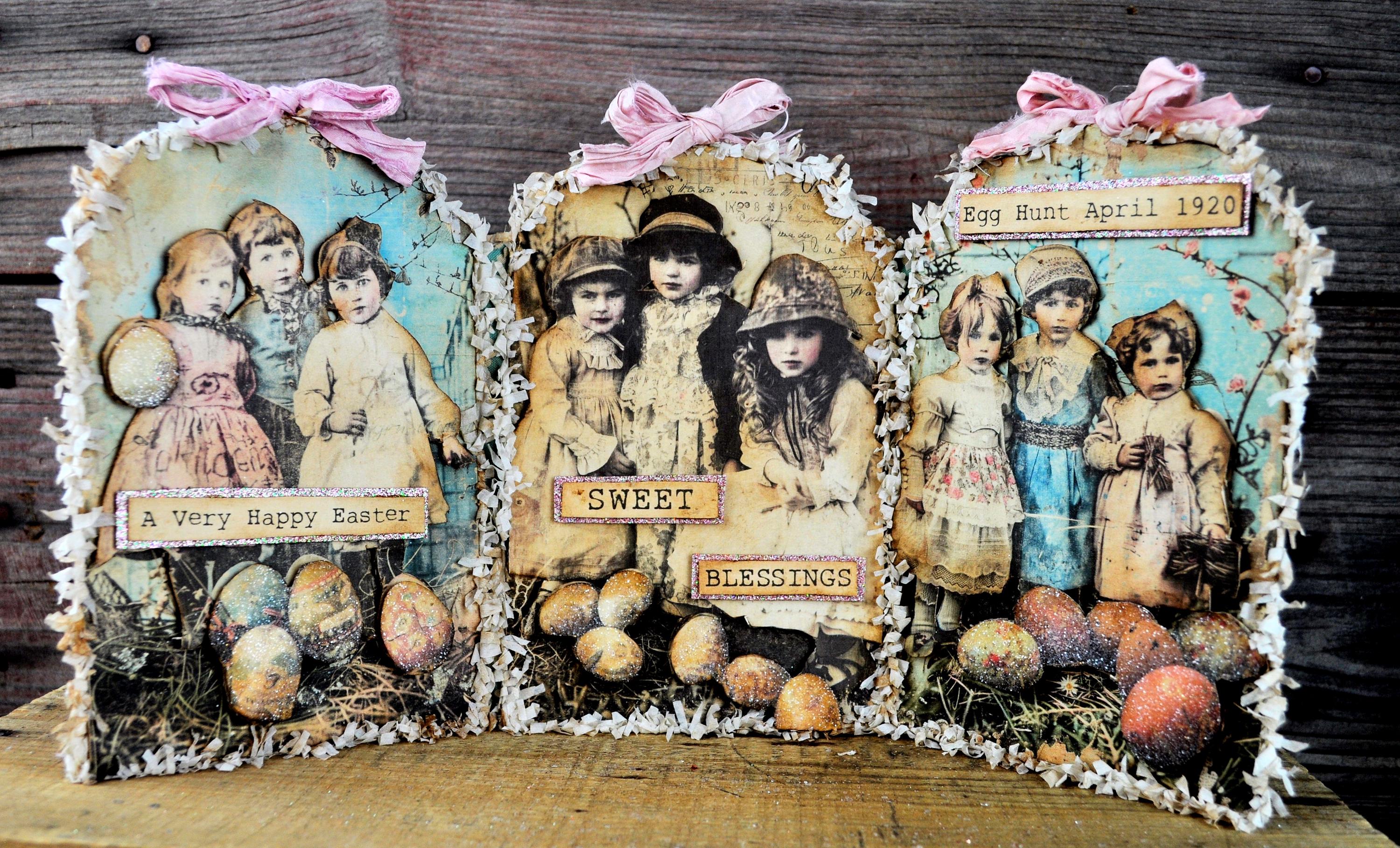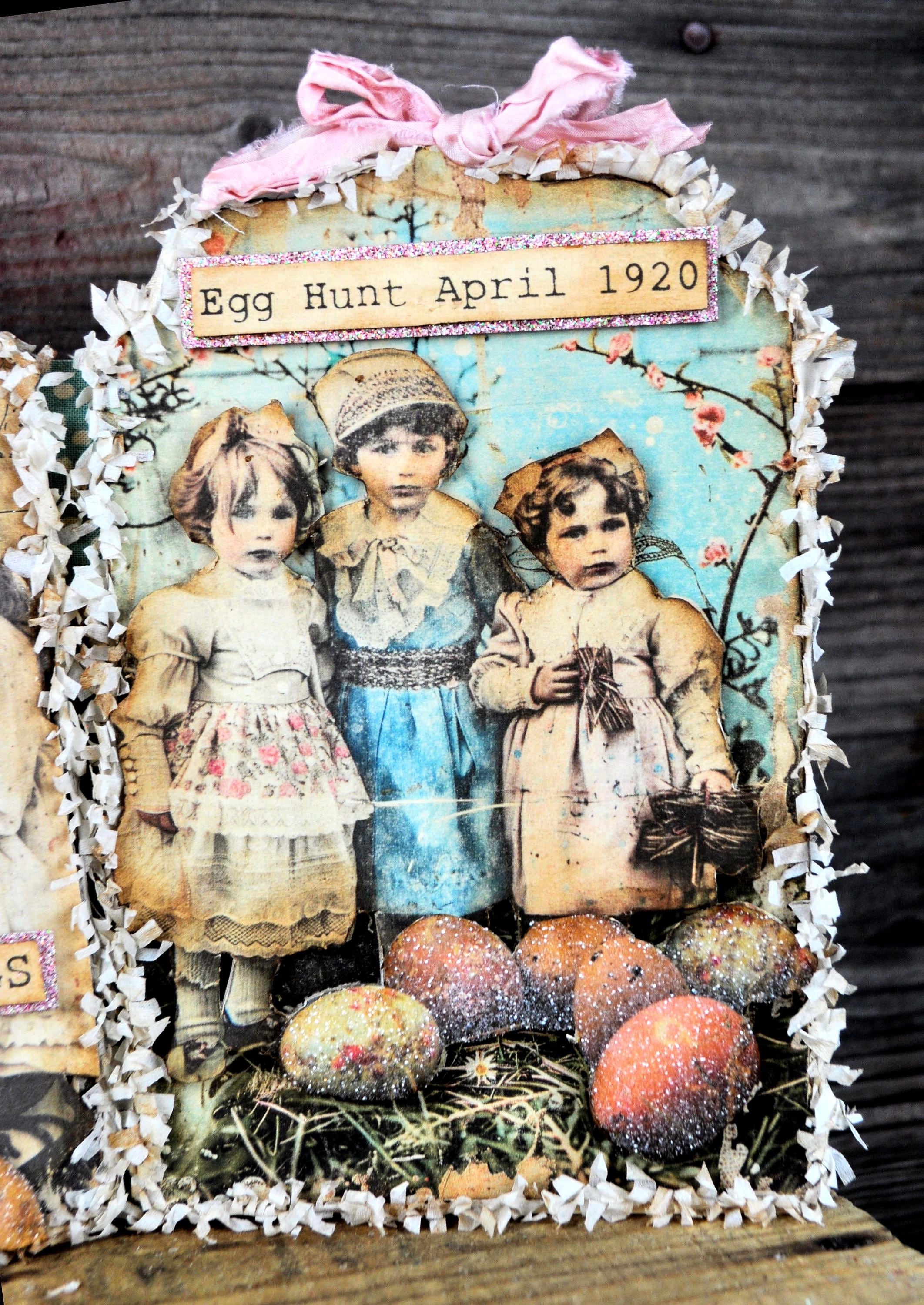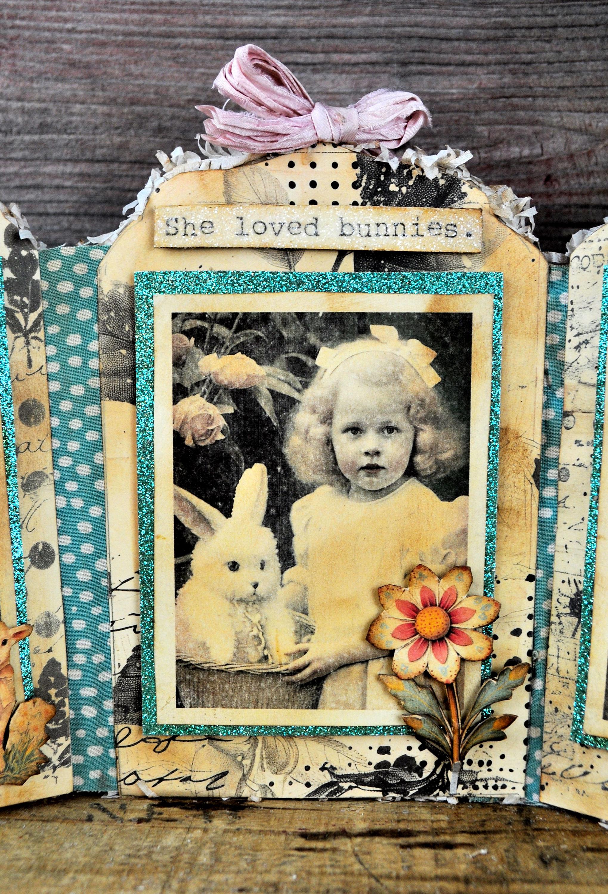 Barb Olson of Muddy Creek Primitives, designer and creator of unique handmade pieces is pleased to offer this primitive one-of-a-kind Easter Trifold Collage. Each panel has a beautiful vintage style Easter image. There is clear glitter on the Easter eggs. The back of these panels has sweet vintage looking images of Easter children with bunnies. They are all trimmed in cream colored crepe paper fringe and have a pink silk bow on the top. Each piece is wonderfully "grunged" up to help them look primitive. This Easter collage measures 14 1/2" x 7 1/4 ". It will look perfect sitting on a table or desk with all your prim decor.