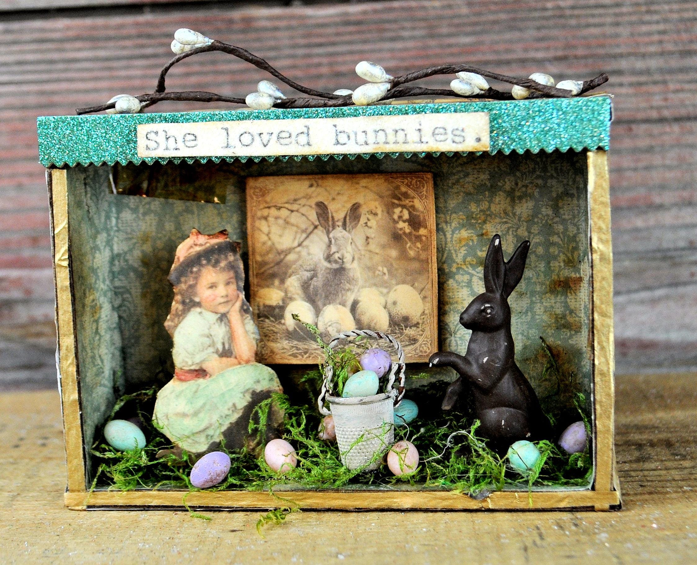 Barb Olson of Muddy Creek Primitives, designer and creator of unique handmade pieces is pleased to offer this small primitive one-of-a-kind Easter vignette display. It has a sweet little girl sitting in moss next to a thimble Easter basket filled with resin eggs and moss. There are also several easter eggs in the moss that surround her. On the top are faux pip berry stems in cream. In the back of the box is a vintage style easter bunny image. At the top is a saying mounted on a piece of aqua glittered cardstock. It also has faux vintage cellophane tape in various spots. The back and sides are covered in a vintage looking paper. It is trimmed with gold ribbon. This Easter vignette measures 4" high x 5 1/2" wide x 1 1/2" deep. It will look perfect displayed with all your prim Easter decor.
