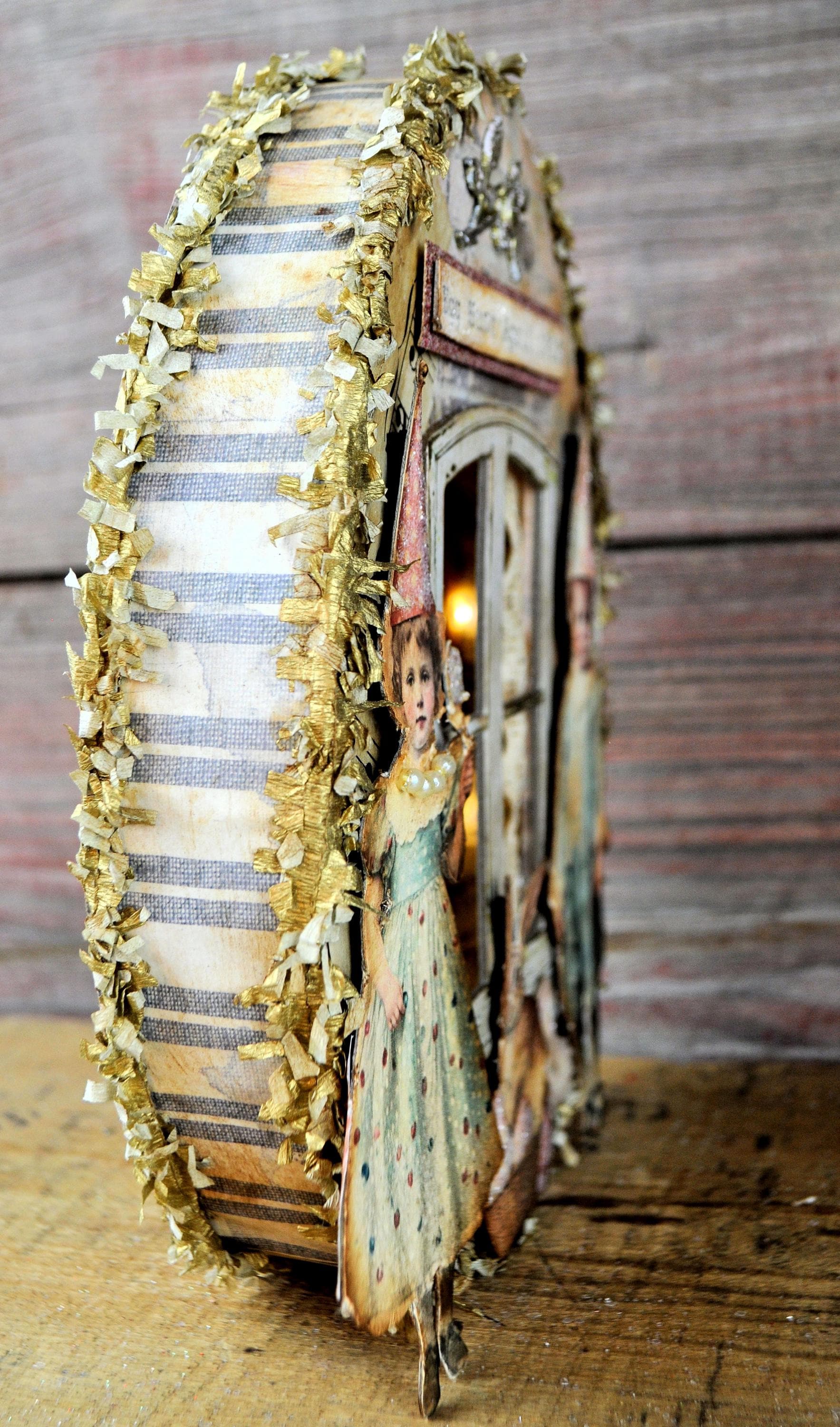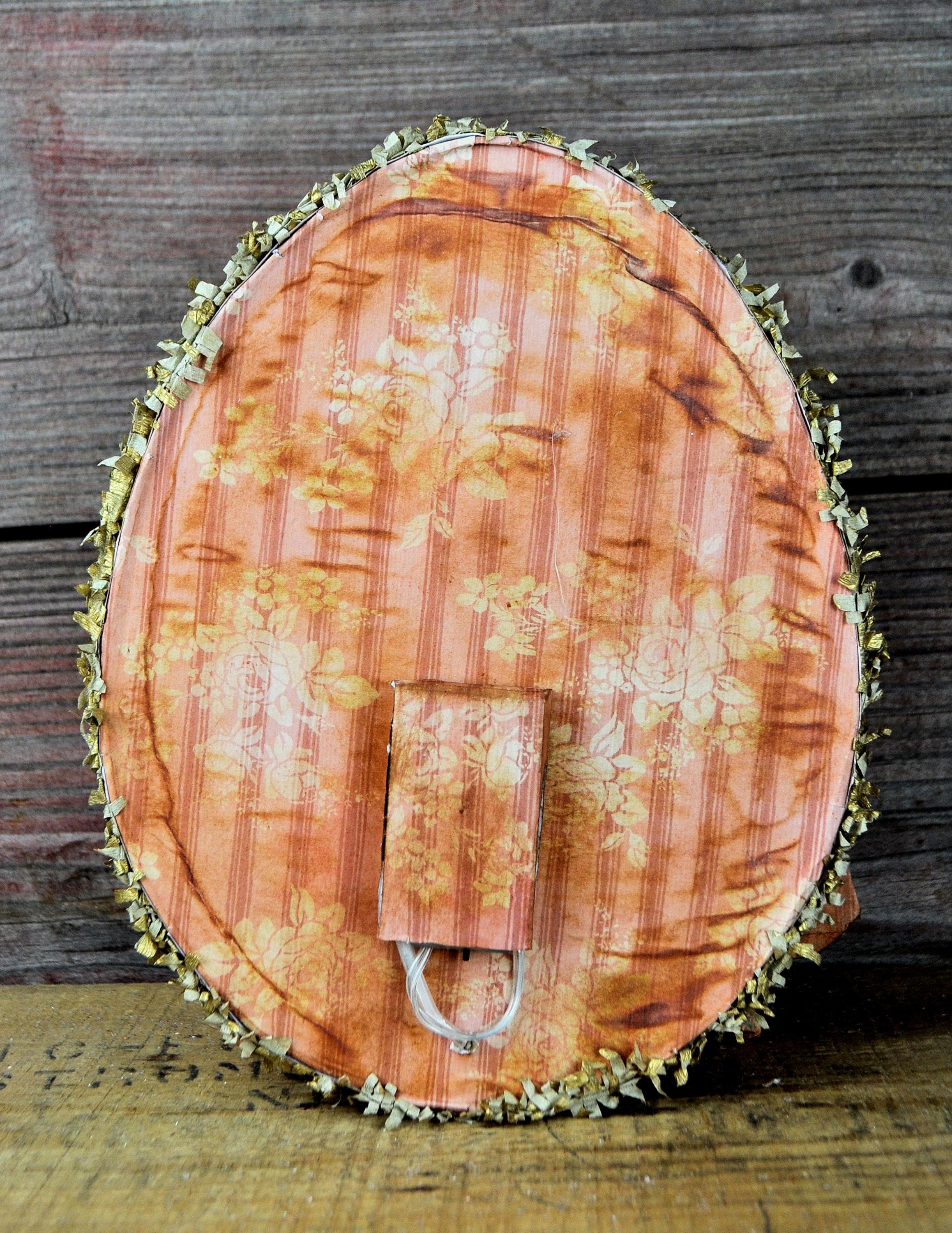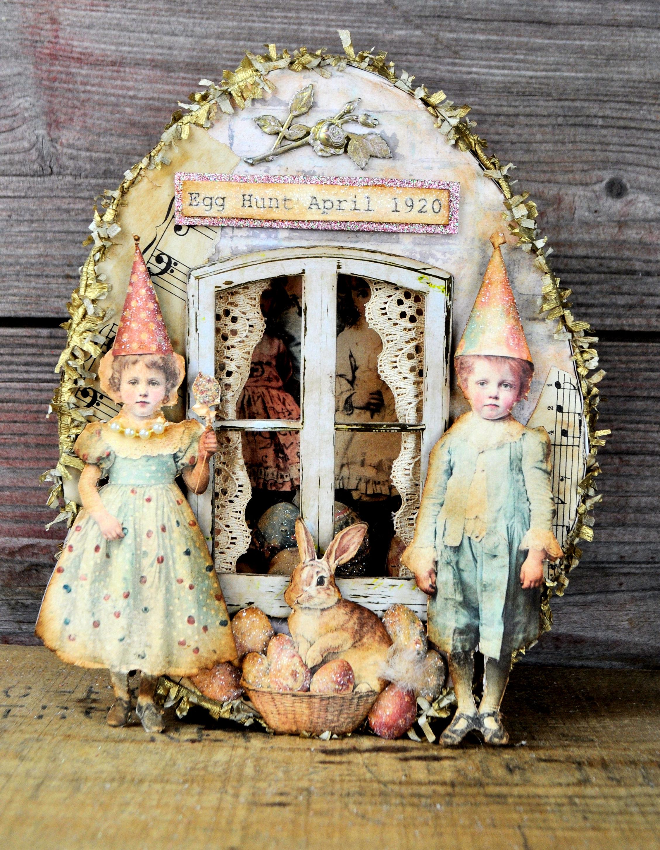 Barb Olson of Muddy Creek Primitives, designer and creator of unique handmade pieces is pleased to offer this primitive one-of-a-kind Easter egg shaped box. Inside the window is a vintage style Easter image. There are two children standing on either side of the window. The window has curtains made of lace. A basket with a bunny is placed between the two children. The eggs are all adorned with clear glitter. At the very top is a metal adornment painted gold and a sign that reads " Egg hunt April 1920". The box is covered in beautiful spring papers inside and out and trimmed with gold crepe paper fringe. There is a battery-operated set of lights with the switch on the back of the box. This piece is wonderfully "grunged" up to help it look primitive. This Easter collage measures 9" x 7" x 2". It will look perfect sitting on your mantle or shelf with all your prim Easter decor.