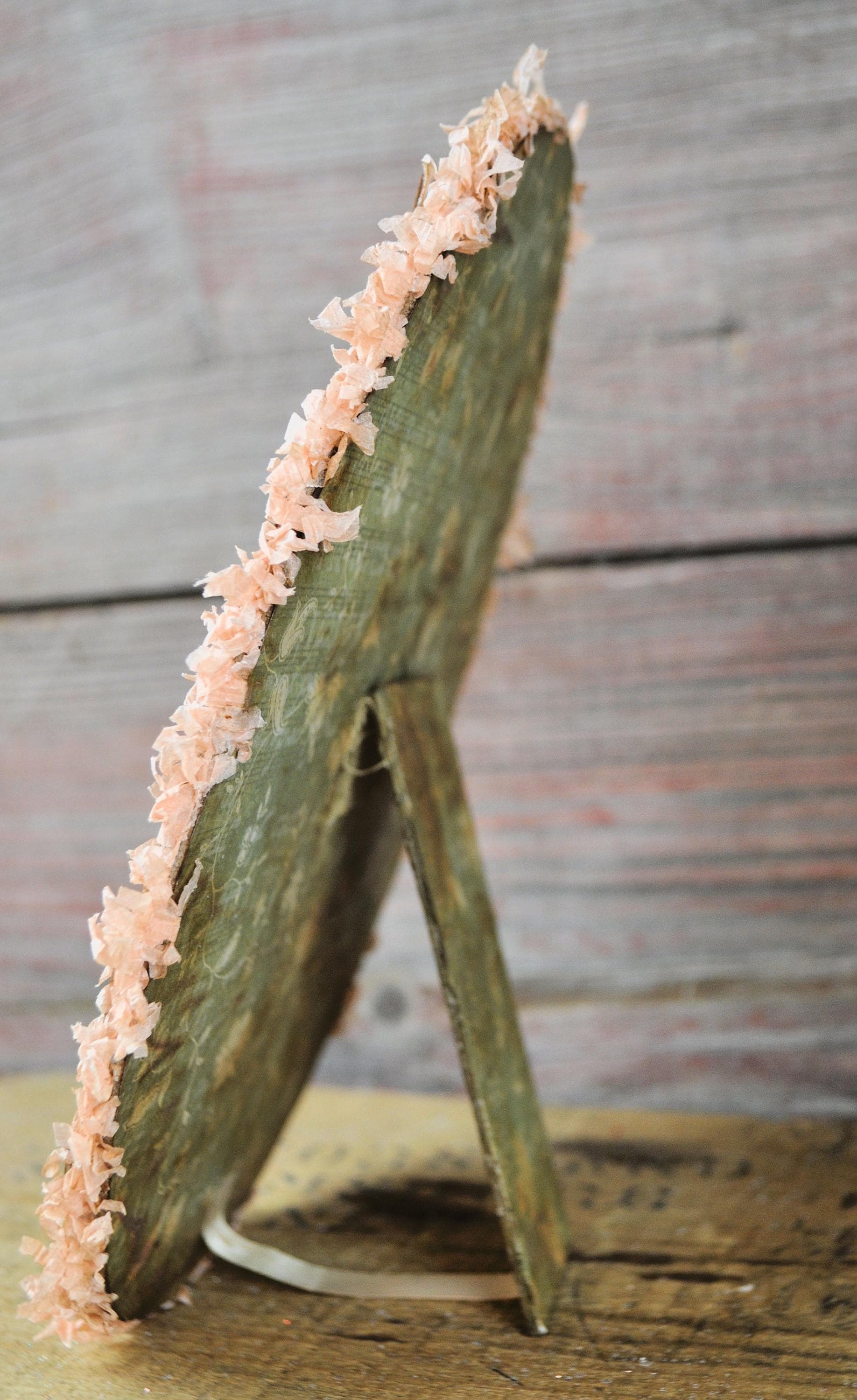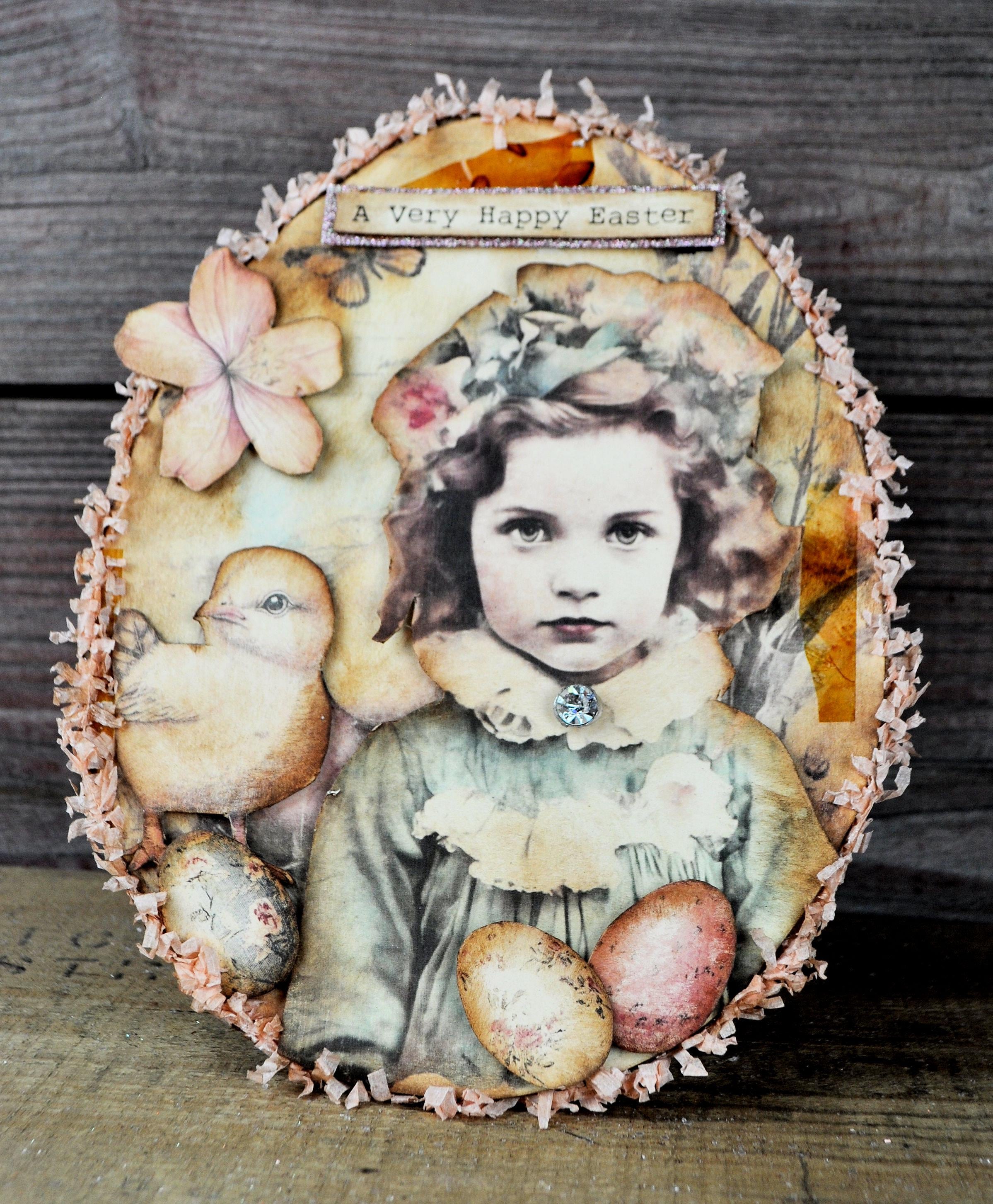 Barb Olson of Muddy Creek Primitives, designer and creator of unique handmade pieces is pleased to offer this primitive one-of-a-kind Easter egg collage. It has a beautiful little vintage style girl and a chick with a flower & eggs. The girl has a vintage piece of costume jewelry on her dress. There is also clear glitter on the eggs. The egg is trimmed in pink crepe paper fringe. This Easter egg collage measures 9" x 7". It will look perfect sitting on a table or shelf with all your prim Spring decor.