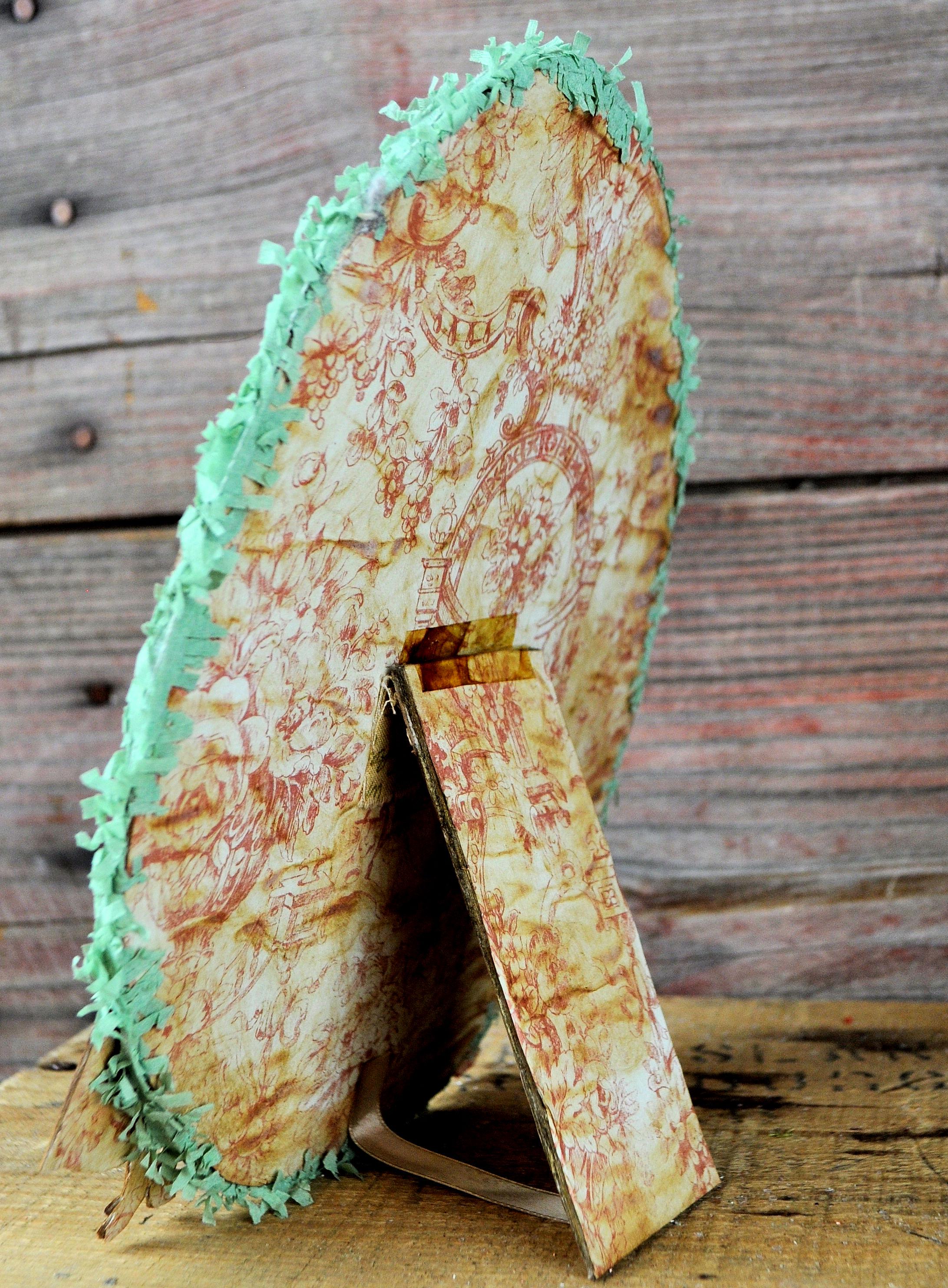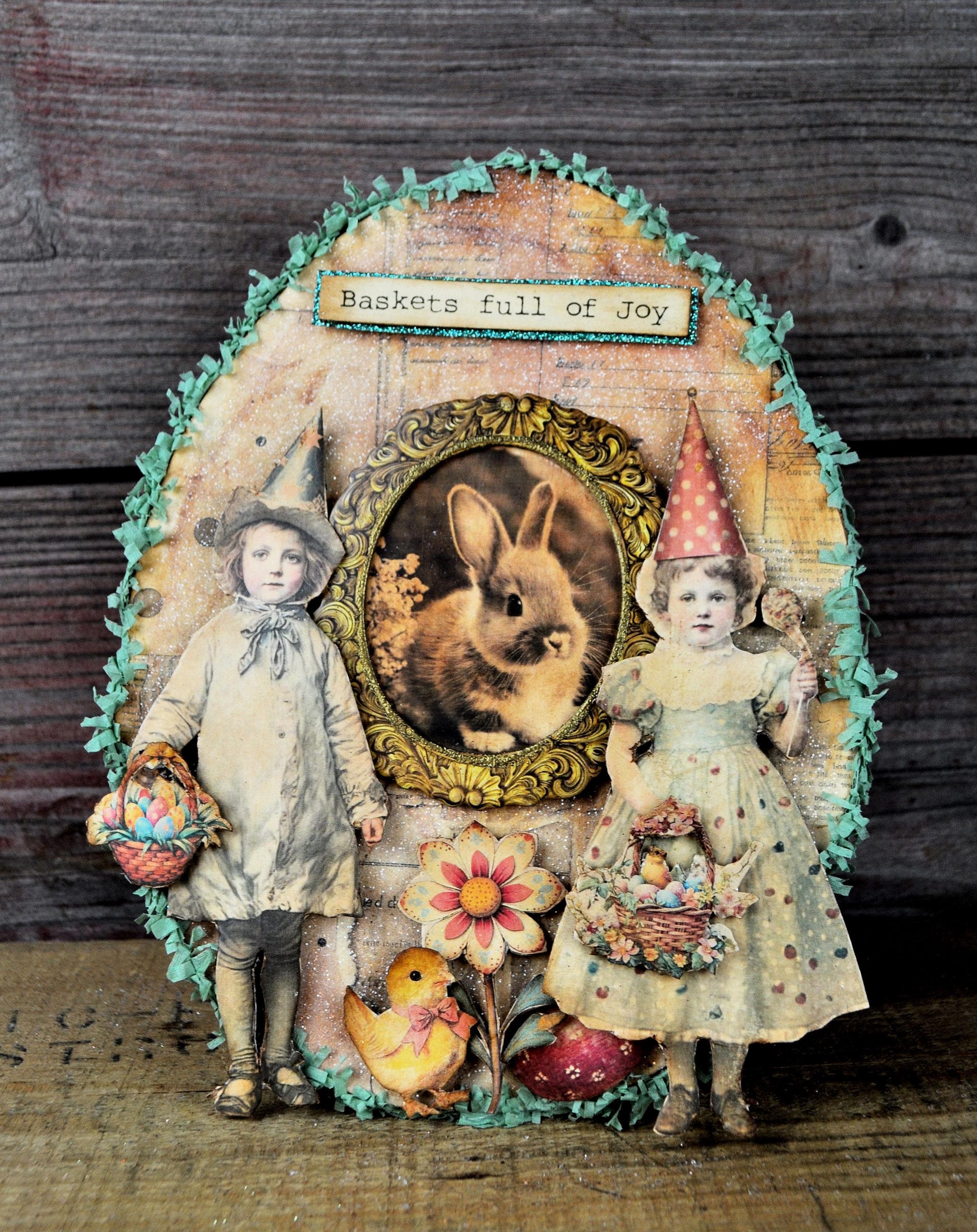 Barb Olson of Muddy Creek Primitives, designer and creator of unique handmade pieces is pleased to offer this primitive one-of-a-kind Easter egg collage. It has two children holding an easter basket and a chick with a flower. There is a gold frame with a bunny image inside. There is also clear glitter on the eggs. The egg is trimmed in aqua blue crepe paper fringe. This Easter egg collage measures 9" x 7". It will look perfect sitting on a mantle or shelf with all your prim Spring decor.