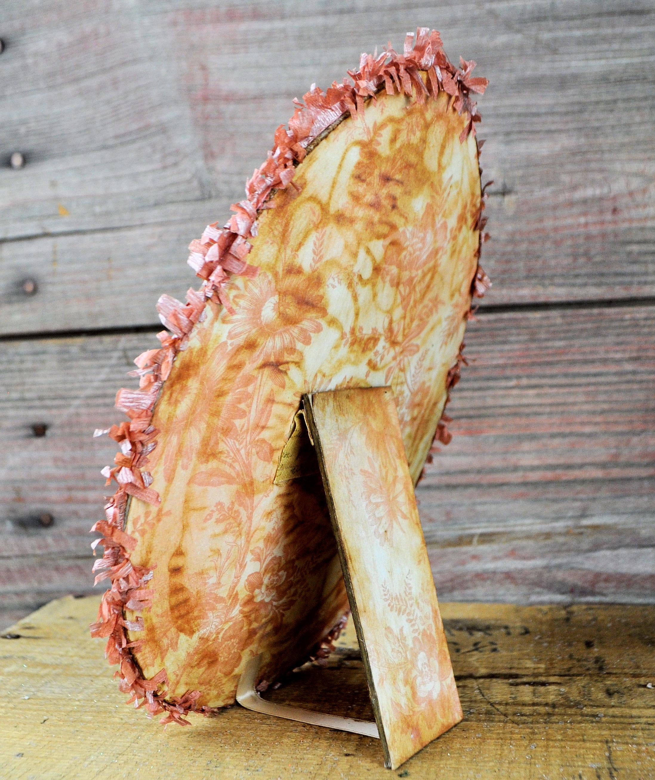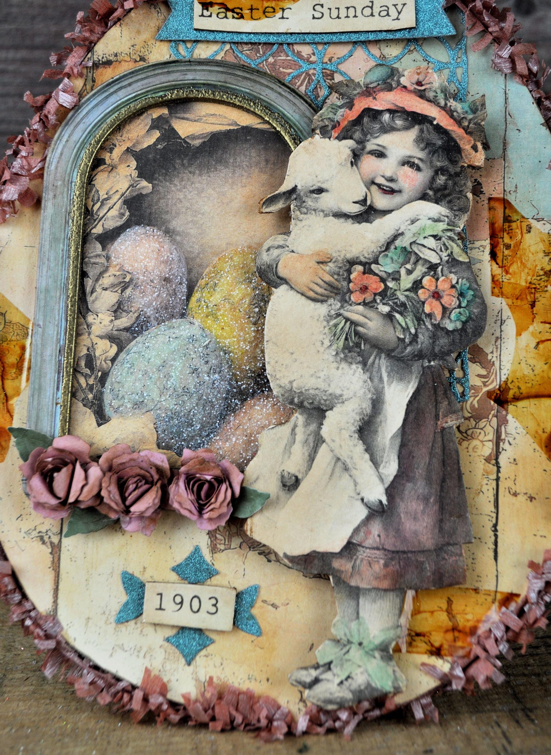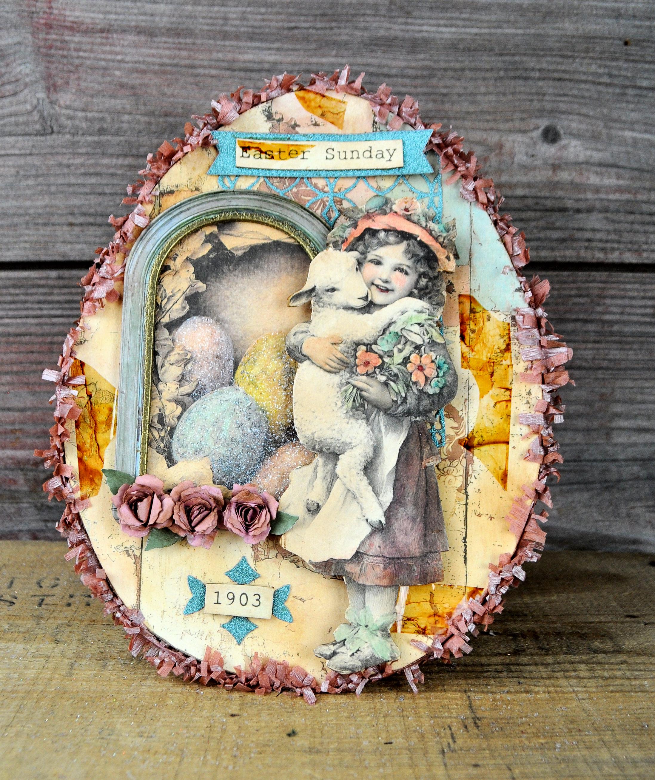 Barb Olson of Muddy Creek Primitives, designer and creator of unique handmade pieces is pleased to offer this primitive one-of-a-kind Easter egg collage. It has a beautiful vintage looking image of a young girl holding a lamb. There is a frame with a easter egg image inside. There is also clear glitter on the eggs. There are three handmade paper roses with leaves and a couple word phrases backed with aqua glitter paper. The egg is trimmed in light pink crepe paper fringe. It also has vintage looking cellophane tape. This Easter egg collage measures 9" x 7". It will look perfect sitting on a mantle or shelf with all your prim Spring decor.