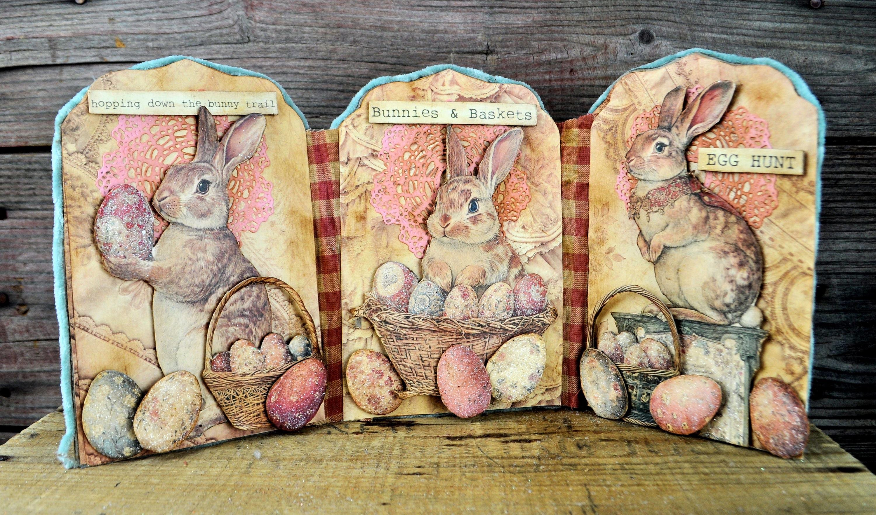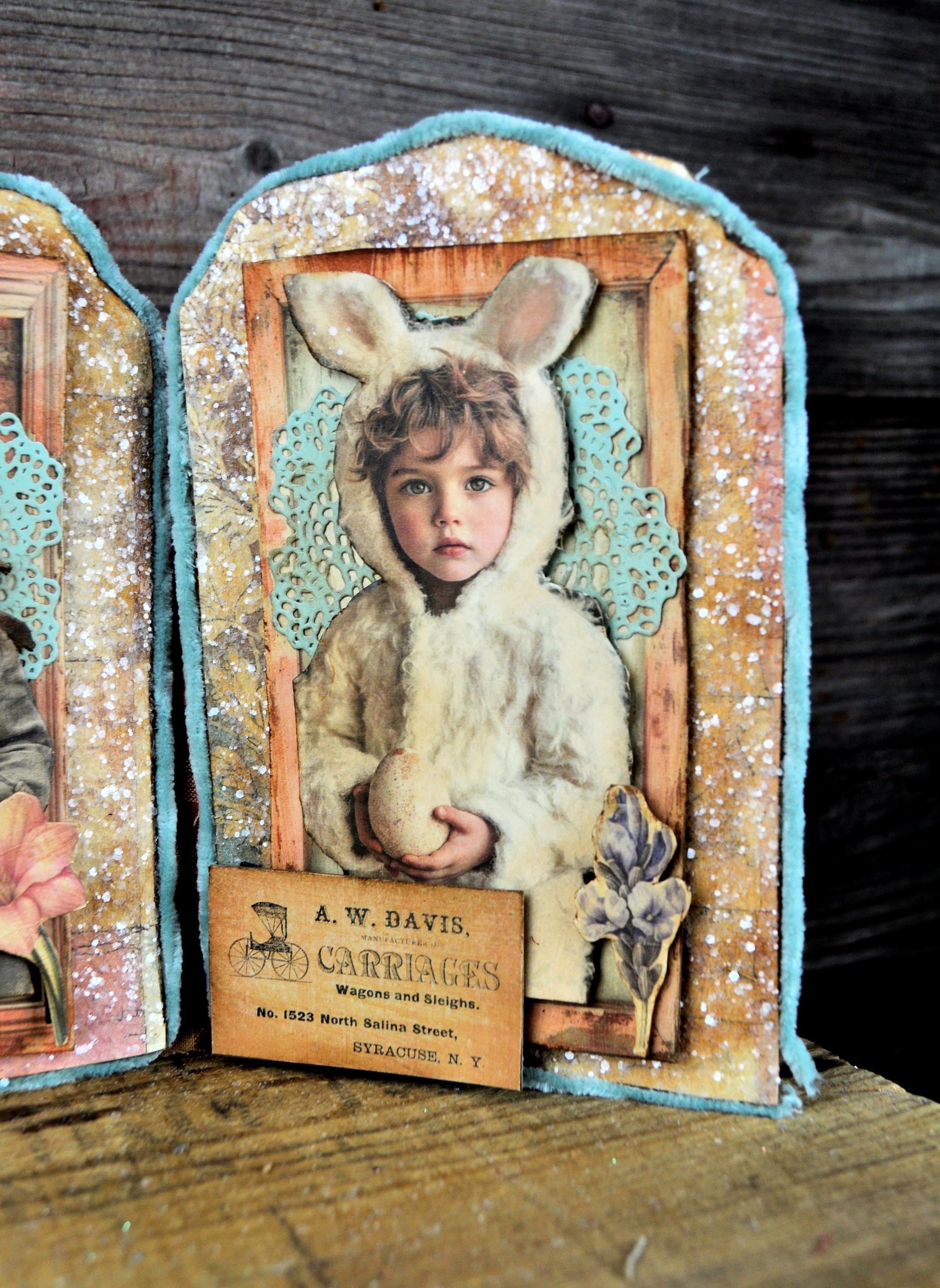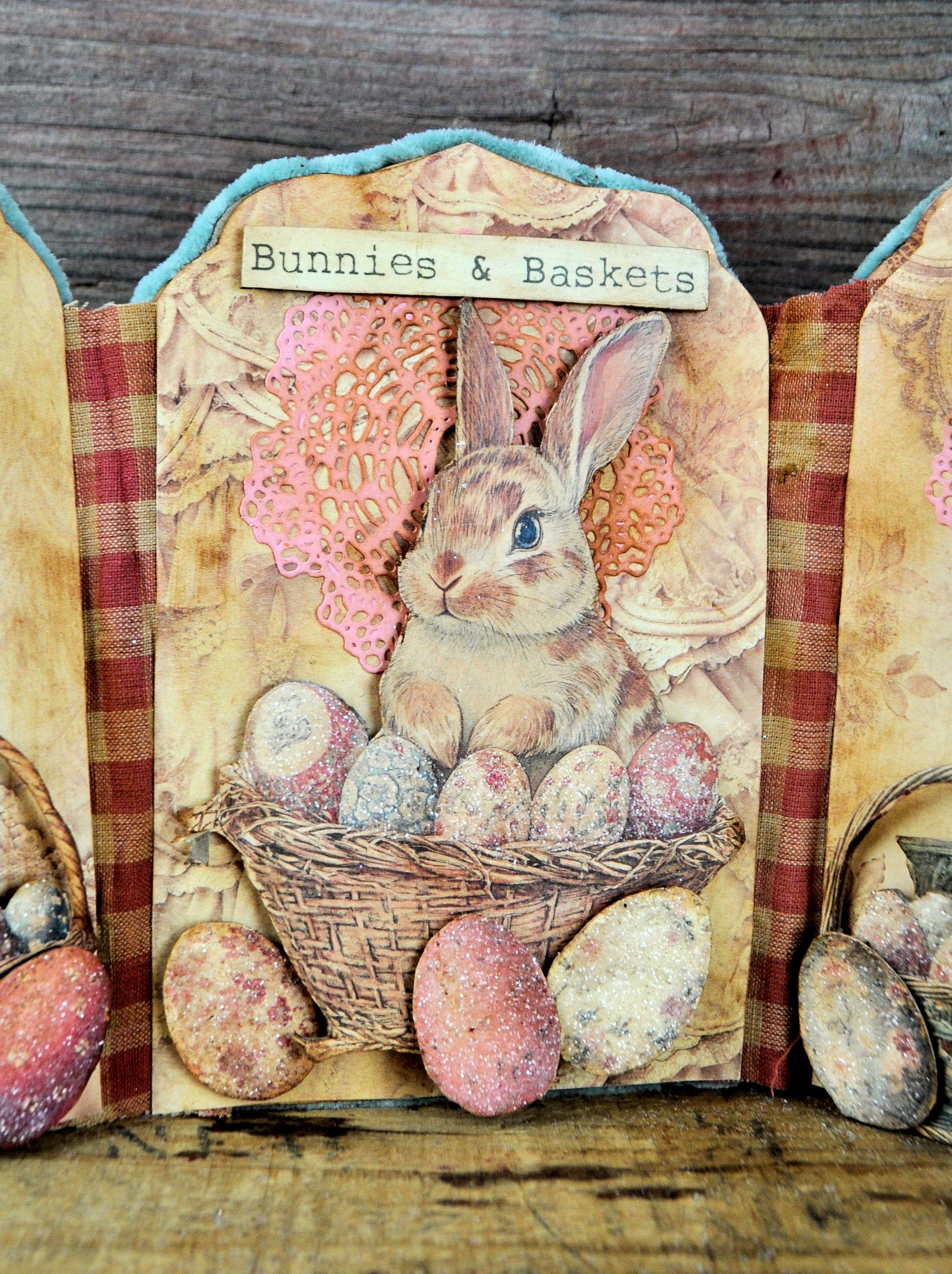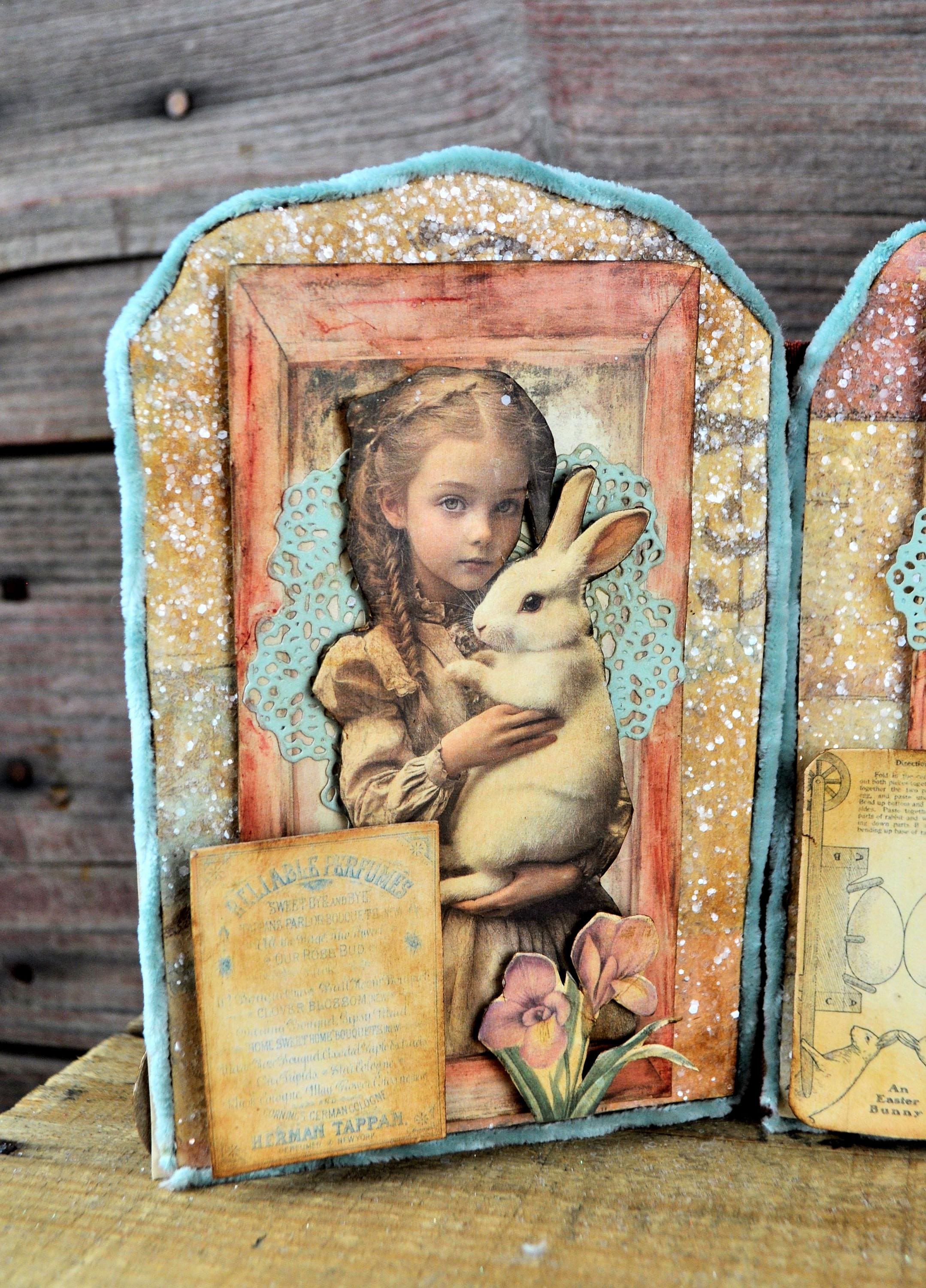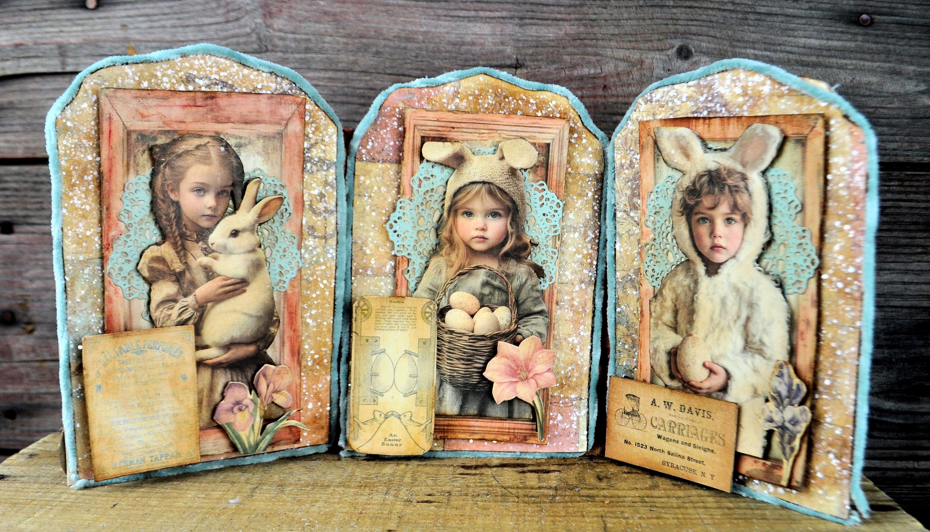 Barb Olson of Muddy Creek Primitives, designer and creator of unique handmade pieces is pleased to offer this primitive one-of-a-kind Easter Trifold Collage. Each panel has a beautiful vintage style Easter image. There is clear glitter on the eggs. The back of these panels has sweet vintage looking images of Easter bunnies and clear glitter. They are all trimmed in aqua blue colored yarn. Each piece is wonderfully "grunged" up to help them look primitive. This Easter collage measures 14 1/2" x 7 1/4 ". It will look perfect sitting on a table or desk with all your prim decor.