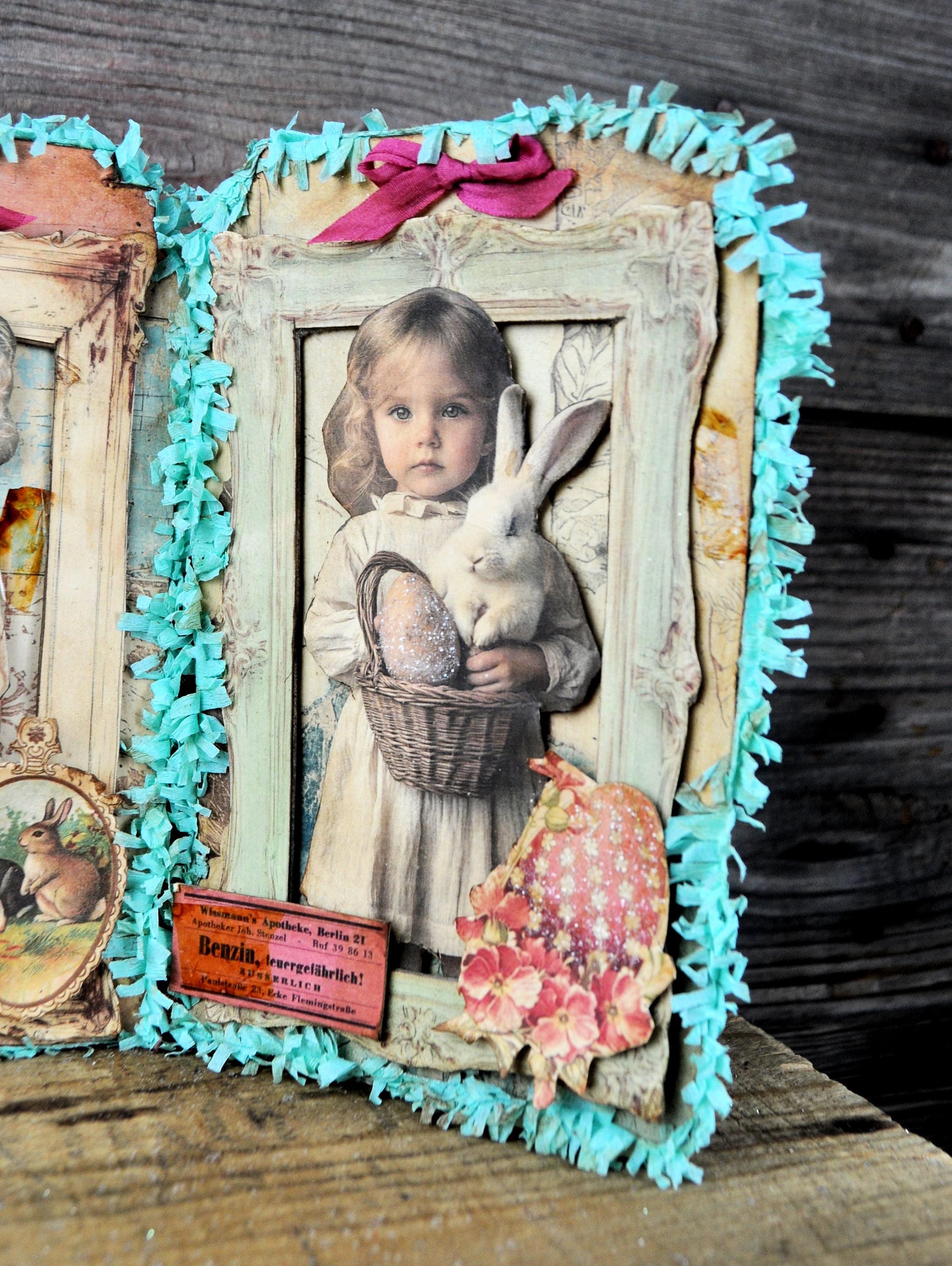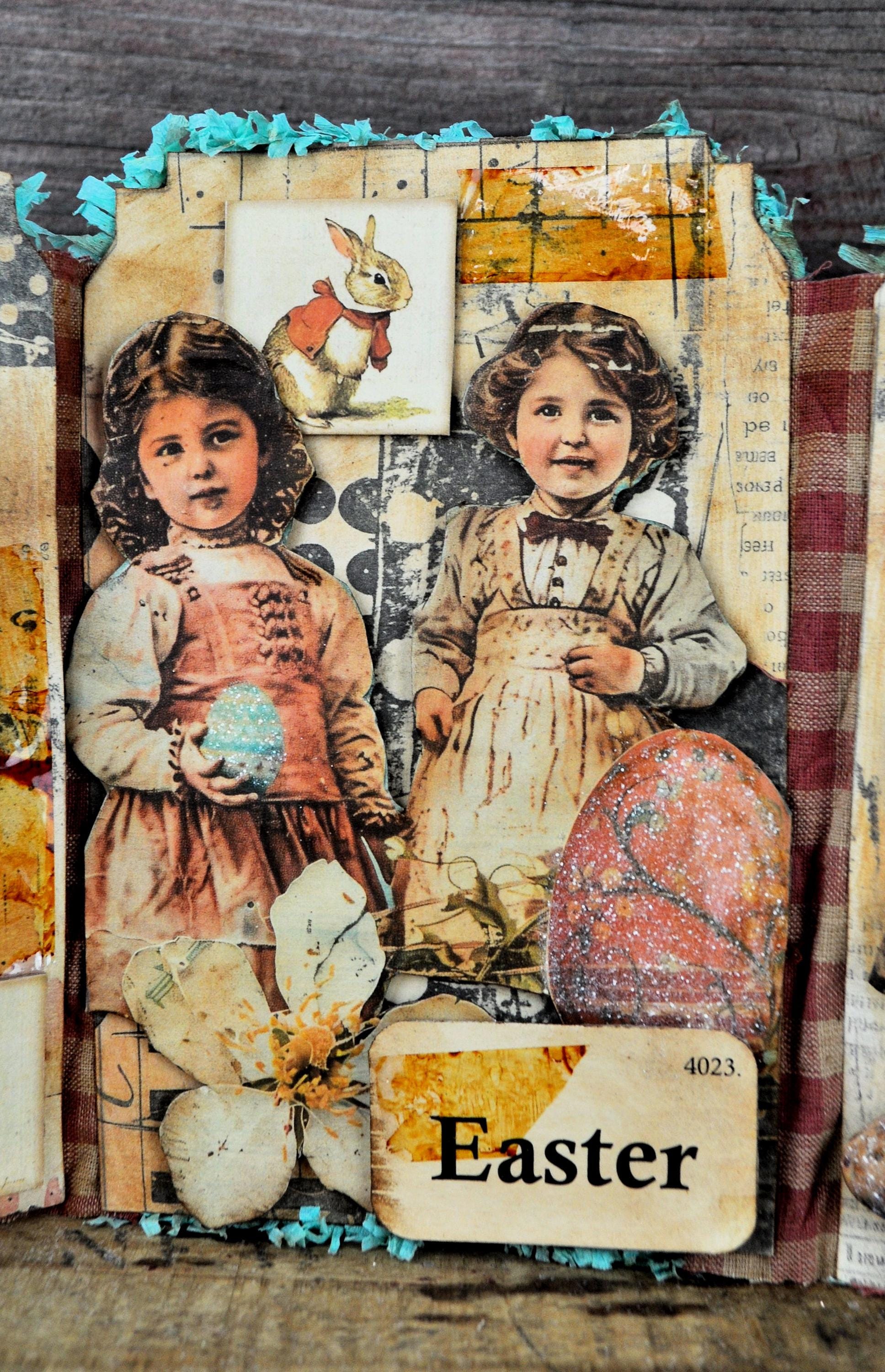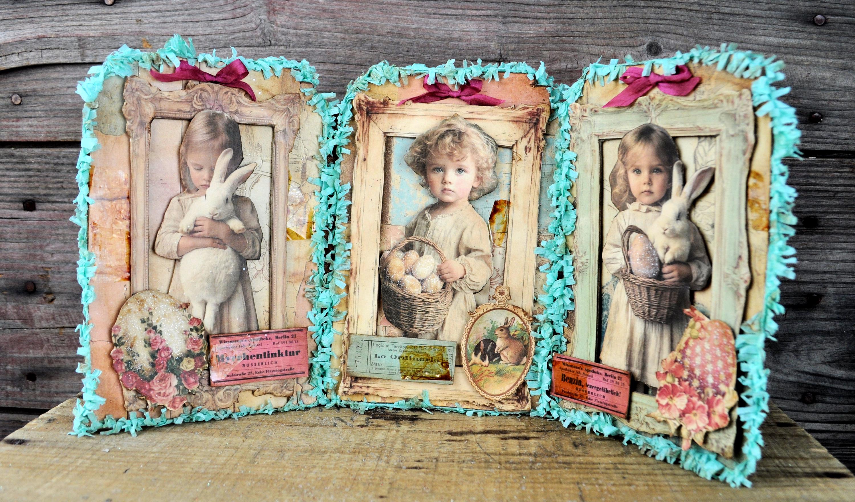 Barb Olson of Muddy Creek Primitives, designer and creator of unique handmade pieces is pleased to offer this primitive one-of-a-kind Easter Trifold Collage. Each panel has a beautiful vintage style Easter image. There is clear glitter on the Easter eggs. The back of these panels has sweet vintage looking images of Easter children with bunnies and clear glitter. They are all trimmed in aqua blue colored crepe paper fringe. Each piece is wonderfully "grunged" up to help them look primitive. This Easter collage measures 14 1/2" x 7 1/4 ". It will look perfect sitting on a table or desk with all your prim decor.