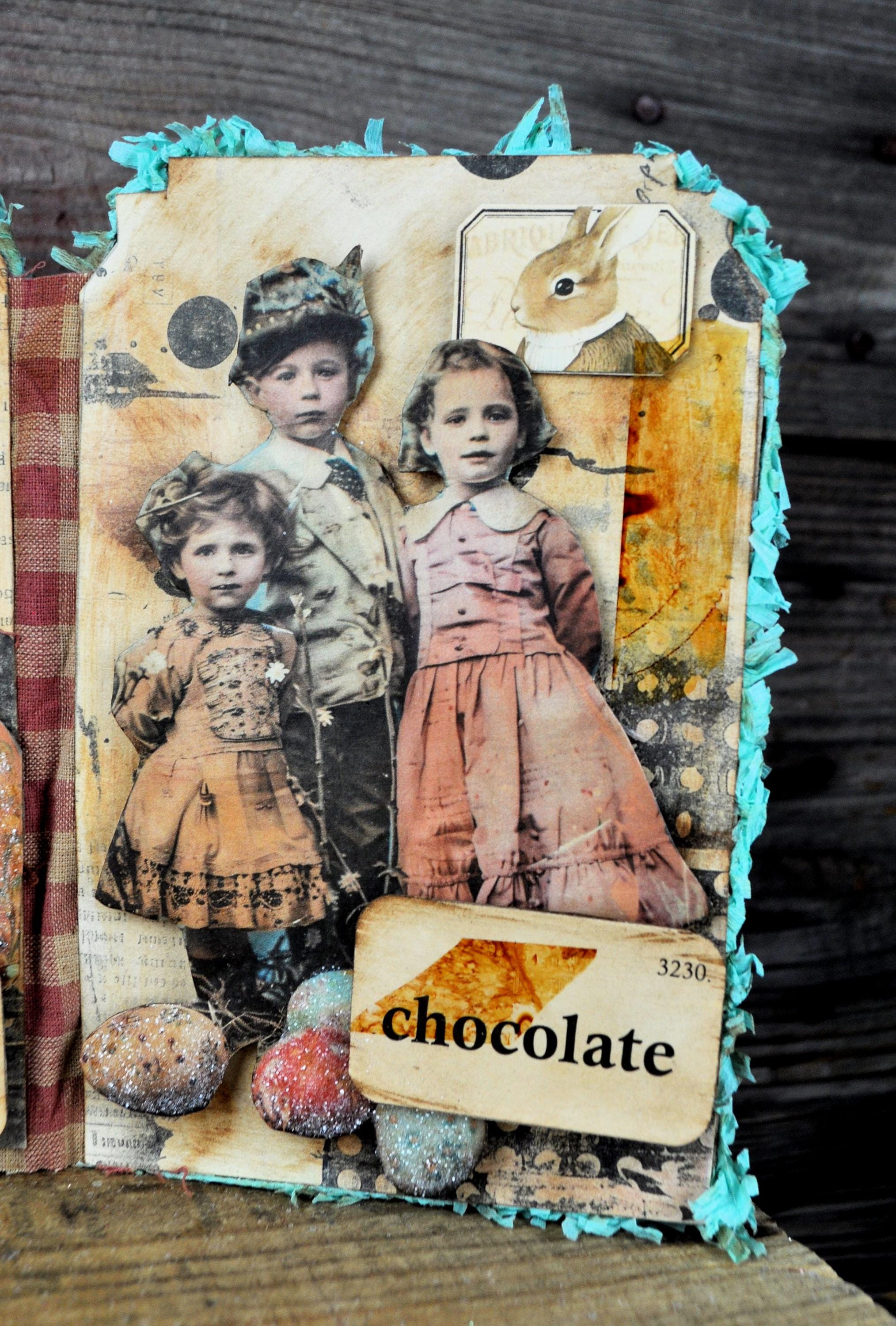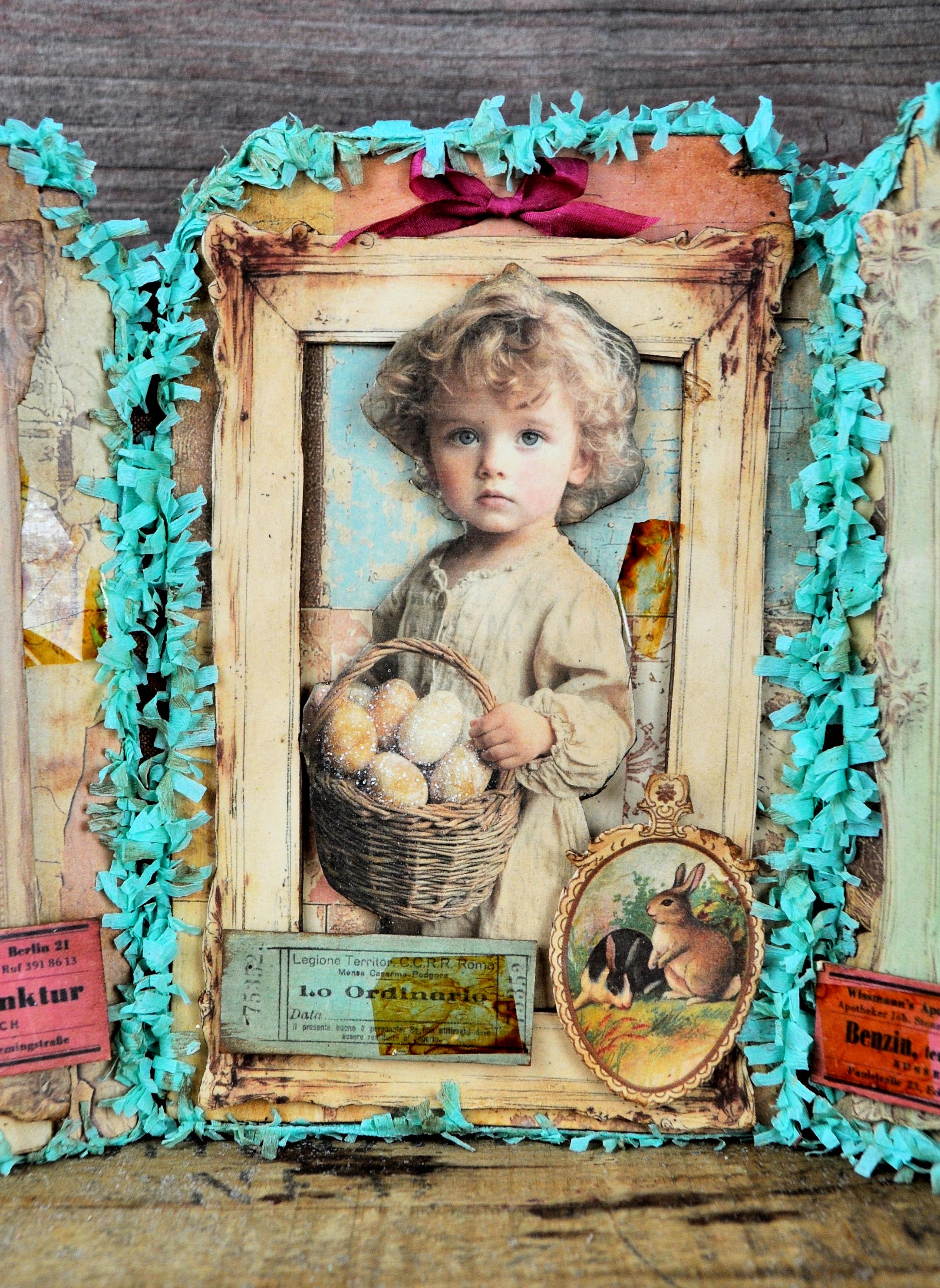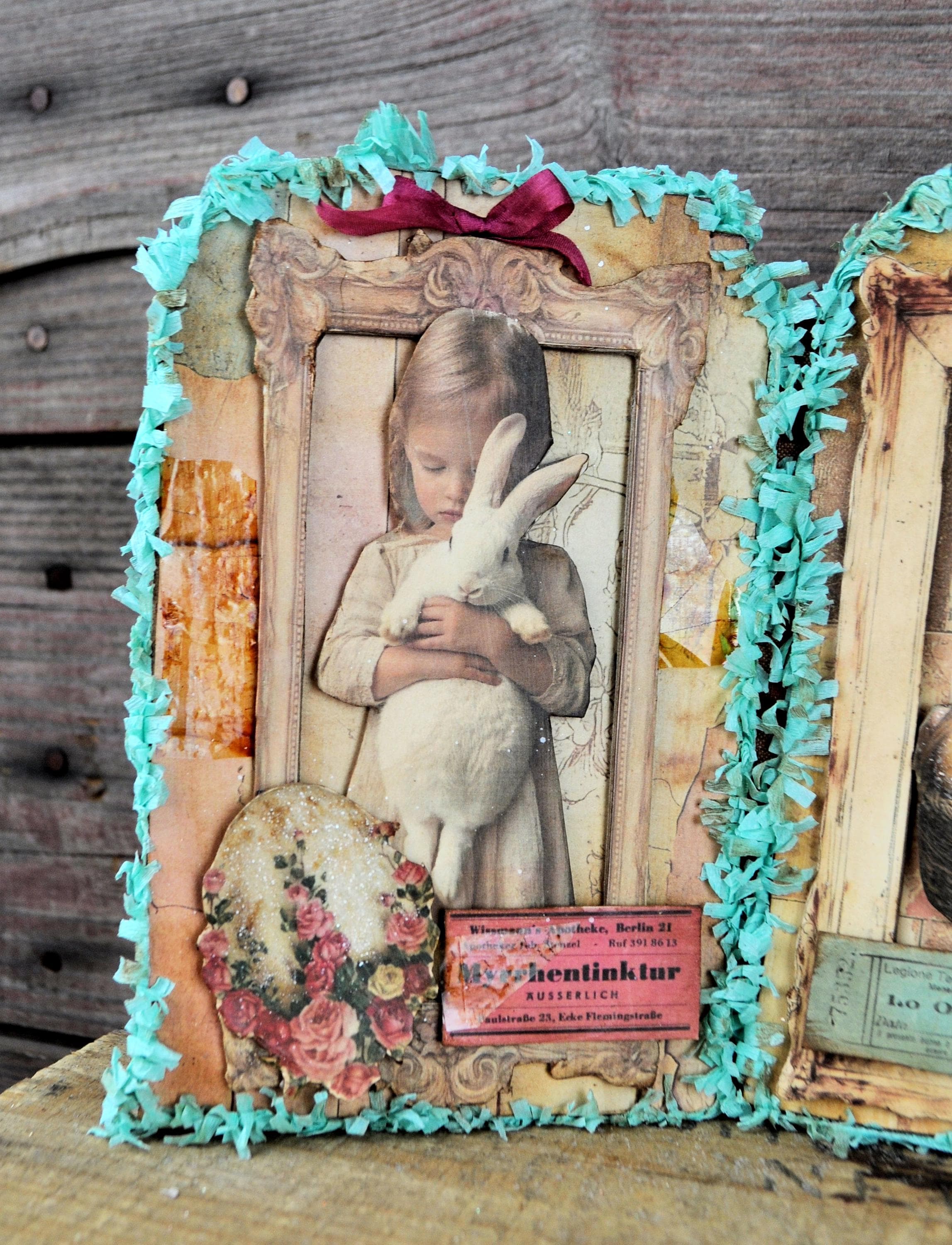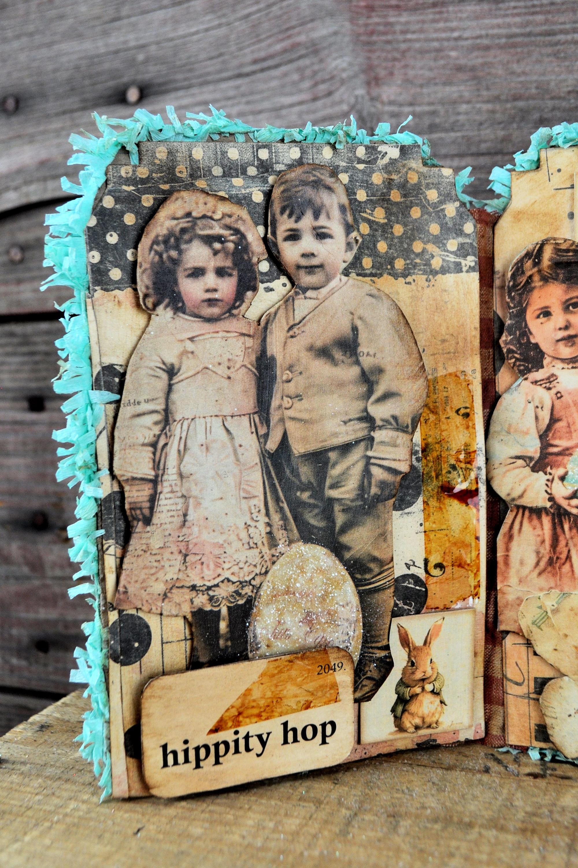 Barb Olson of Muddy Creek Primitives, designer and creator of unique handmade pieces is pleased to offer this primitive one-of-a-kind Easter Trifold Collage. Each panel has a beautiful vintage style Easter image. There is clear glitter on the Easter eggs. The back of these panels has sweet vintage looking images of Easter children with bunnies and clear glitter. They are all trimmed in aqua blue colored crepe paper fringe. Each piece is wonderfully "grunged" up to help them look primitive. This Easter collage measures 14 1/2" x 7 1/4 ". It will look perfect sitting on a table or desk with all your prim decor.