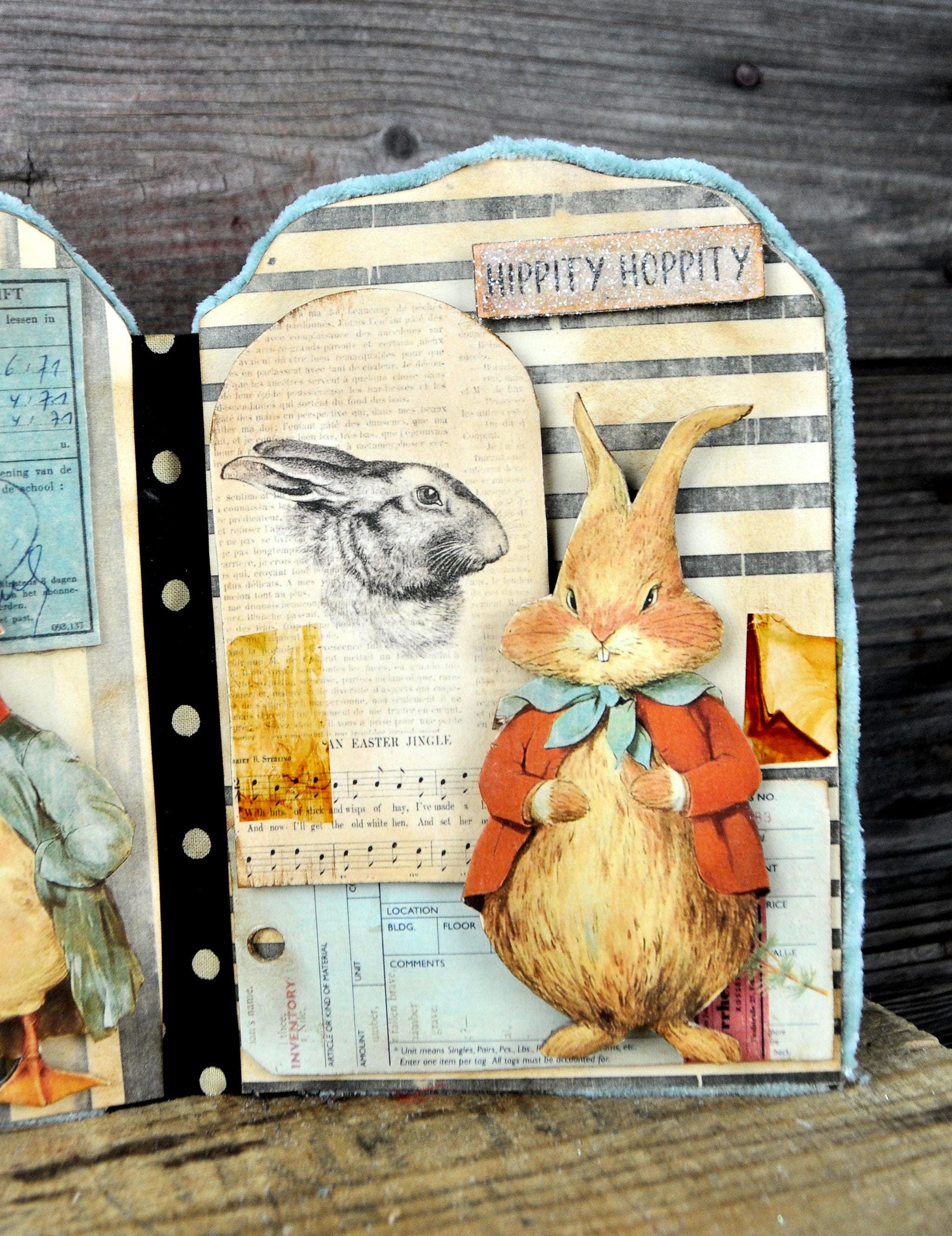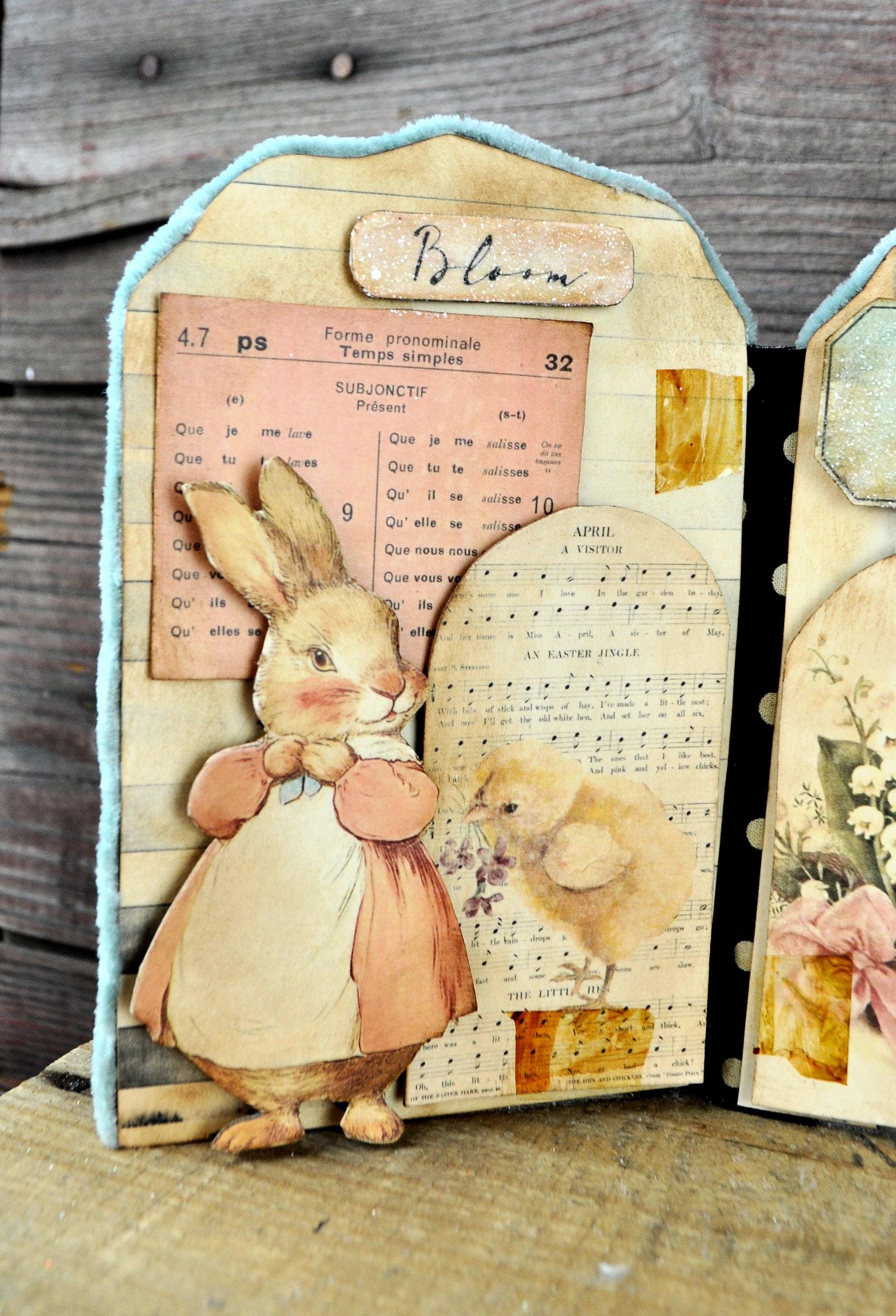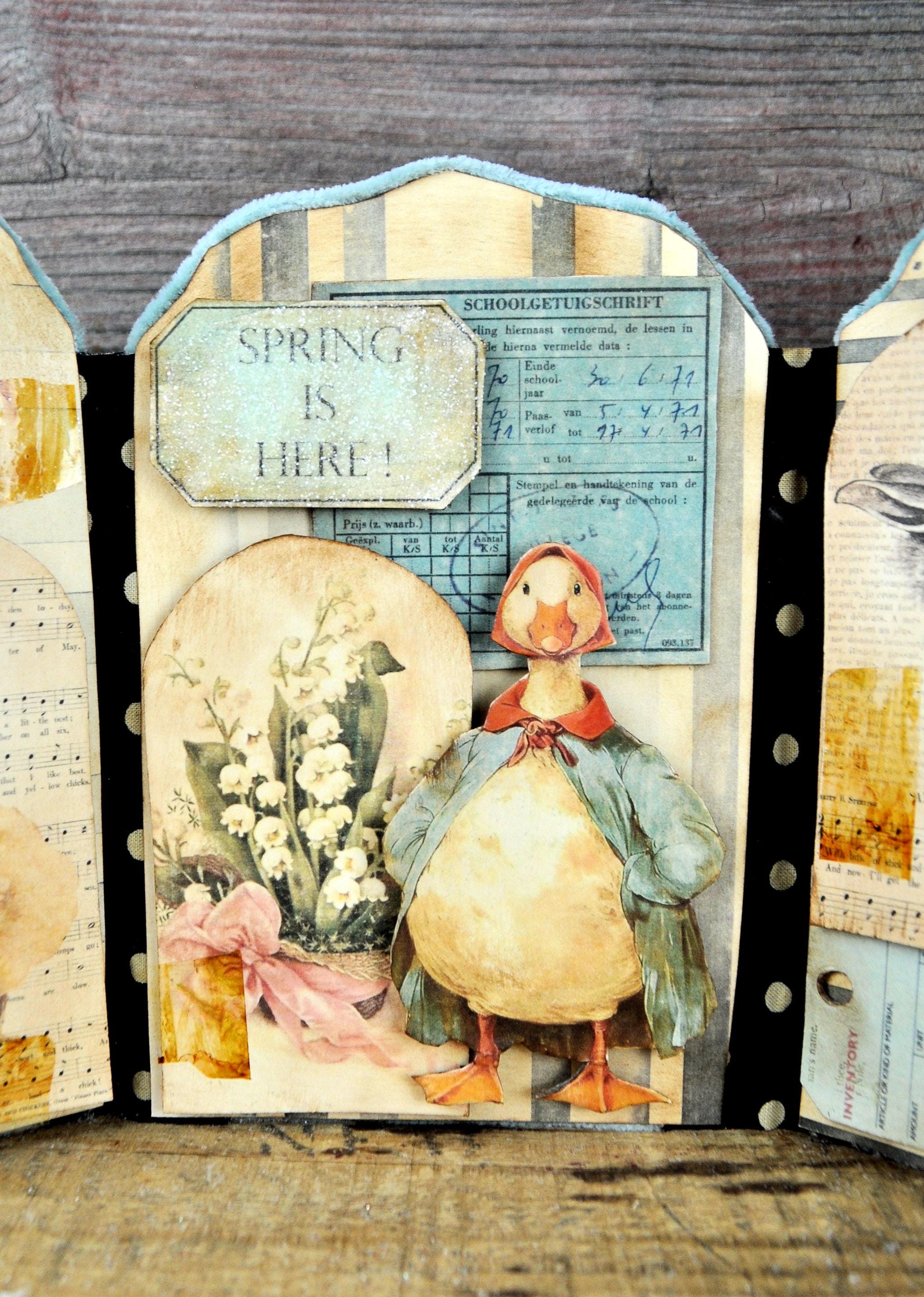 Barb Olson of Muddy Creek Primitives, designer and creator of unique handmade pieces is pleased to offer this primitive one-of-a-kind Easter Trifold Collage. Each panel has a beautiful vintage style Easter image. There is clear glitter on the phrases. The back of these panels has sweet vintage looking images of Easter animals and clear glitter. They are all trimmed in aqua blue colored yarn. Each piece is wonderfully "grunged" up to help them look primitive. This Easter collage measures 14 1/2" x 7 1/4 ". It will look perfect sitting on a table or desk with all your prim decor.