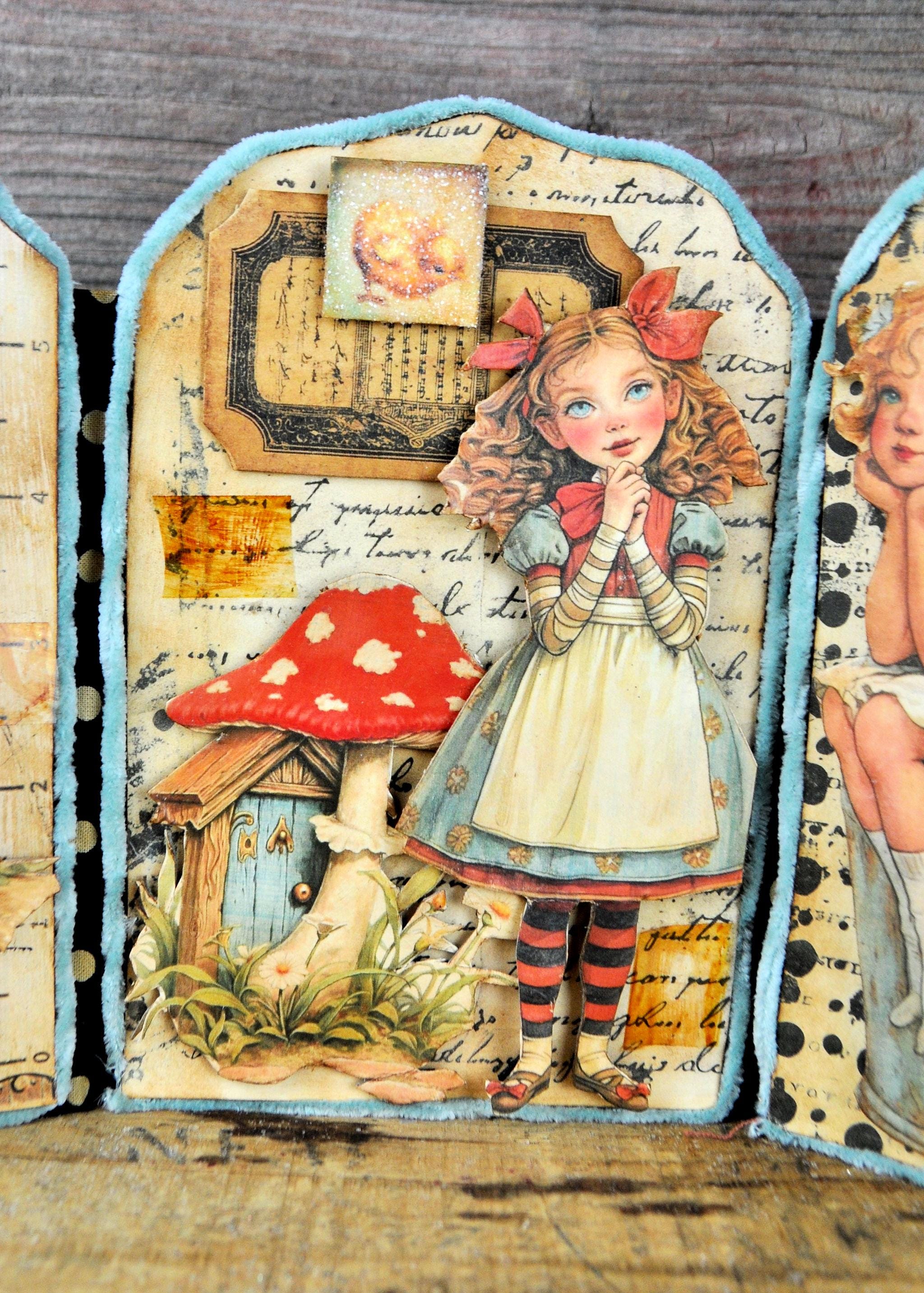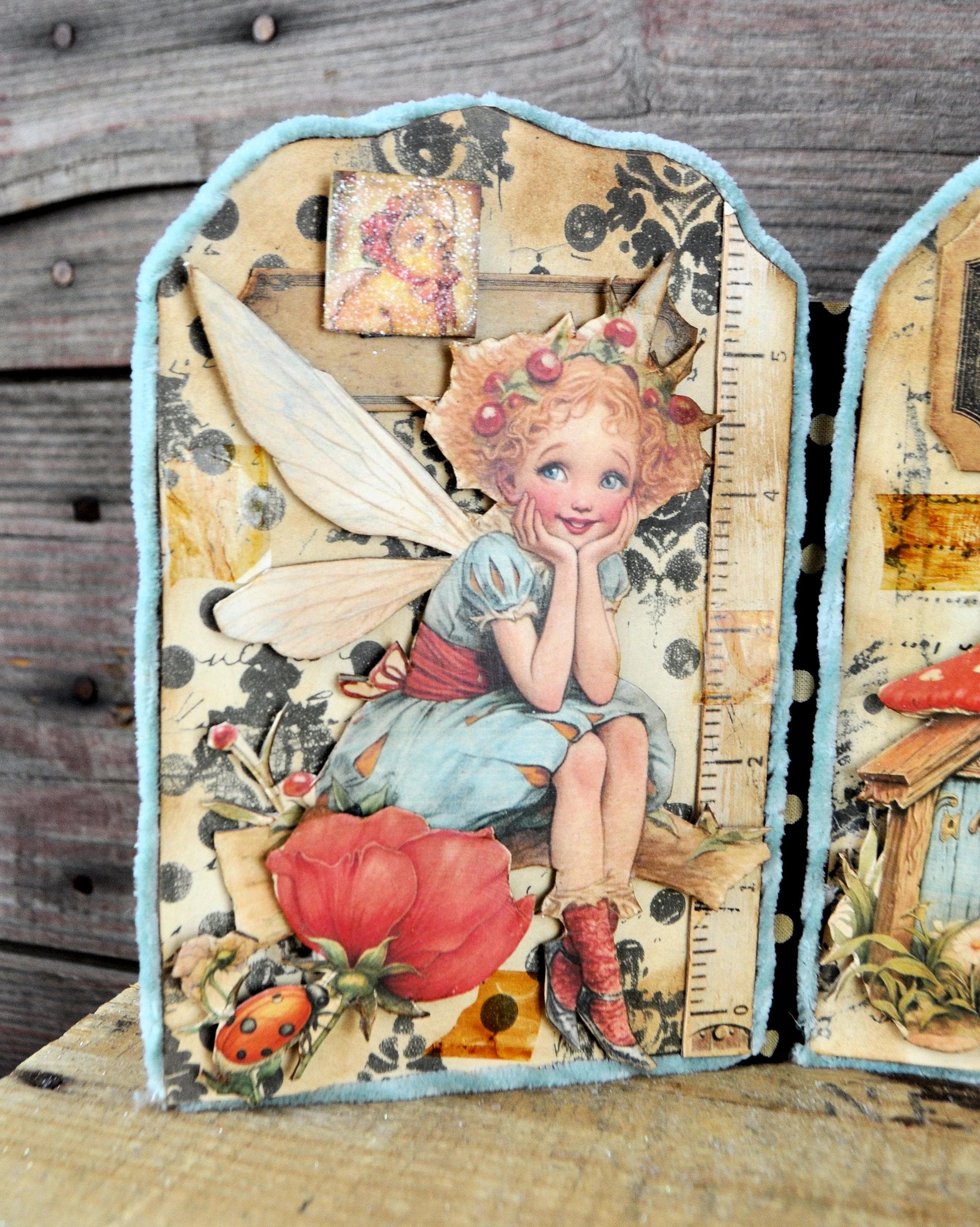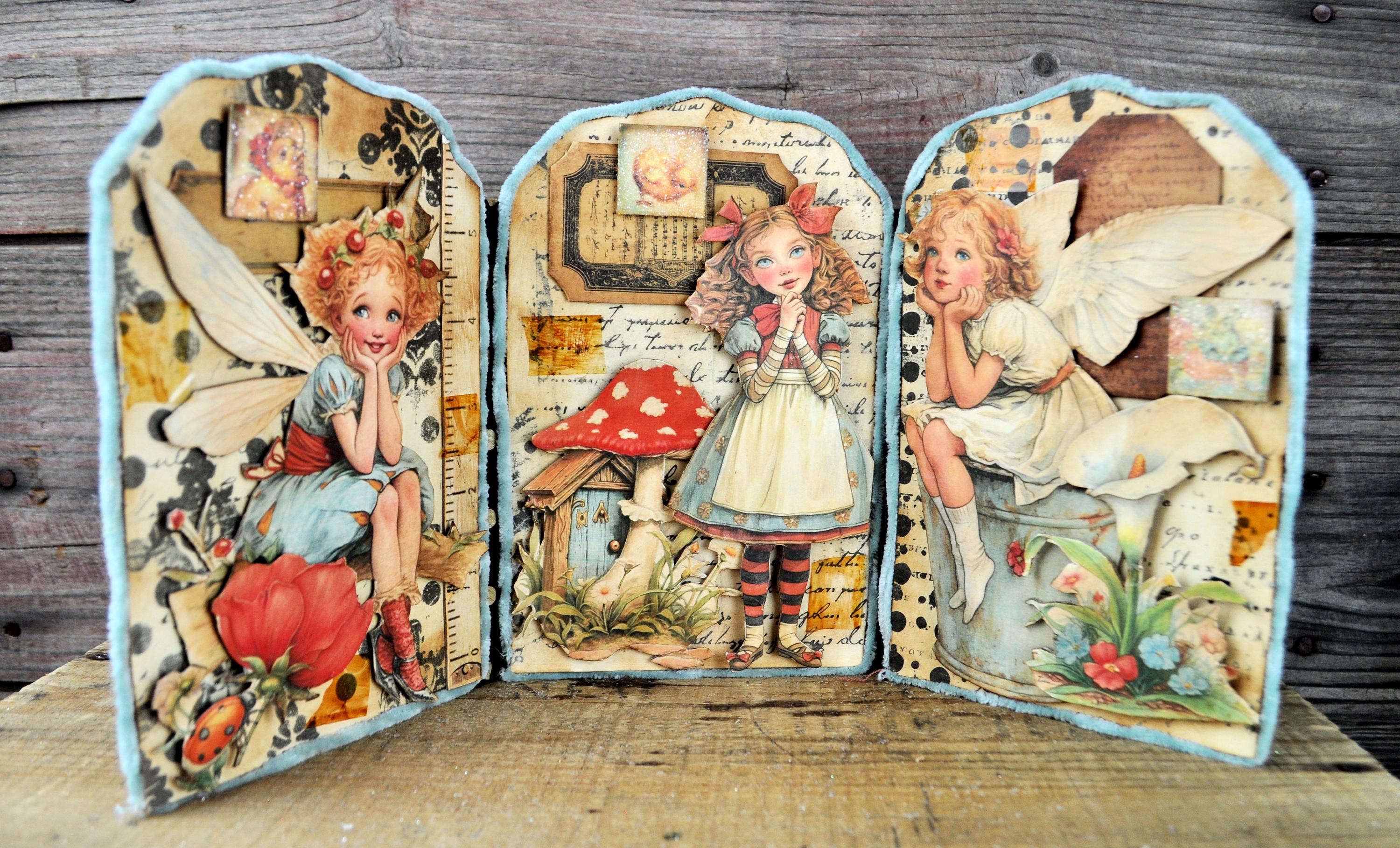 Barb Olson of Muddy Creek Primitives, designer and creator of unique handmade pieces is pleased to offer this primitive one-of-a-kind Easter Trifold Collage. Each panel has a beautiful vintage style Easter image. There is clear glitter on the phrases. The back of these panels has sweet vintage looking images of Easter animals and clear glitter. They are all trimmed in aqua blue colored yarn. Each piece is wonderfully "grunged" up to help them look primitive. This Easter collage measures 14 1/2" x 7 1/4 ". It will look perfect sitting on a table or desk with all your prim decor.