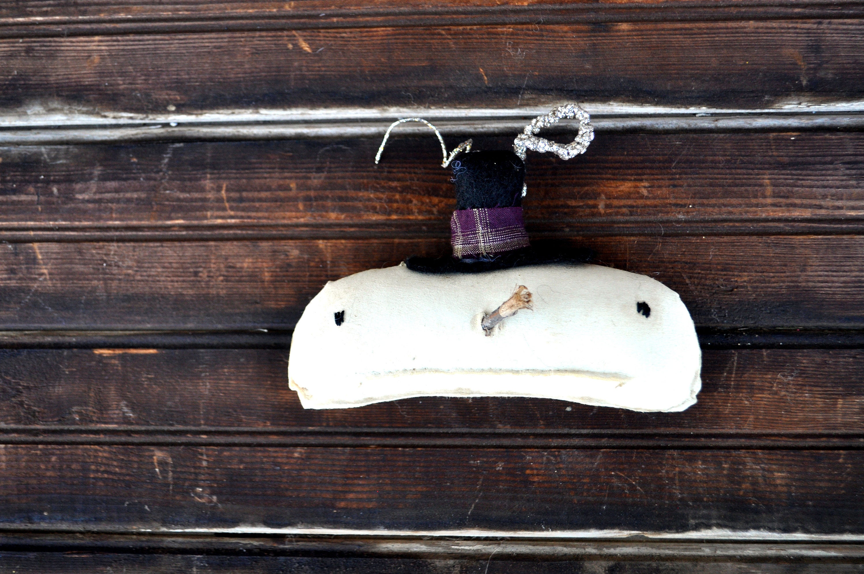 Barb Olson of Muddy Creek Primitives, designer and creator of unique handmade pieces is pleased to offer this primitive Snowman, designed by Blue Moon Beginnings. This snowman is painted white and has a black felt hat. His eyes are hand embroidered and his nose is a stick. The mouth is hand stitched. His hat has a small glitter branch and a piece of dark red homespun on the brim. This Snowman has been all "grunged" up with cinnamon and coffee to make him look so wonderfully prim. He will set wonderfully on a small shelf or table surrounded by greenery . The snowman is 4” tall.