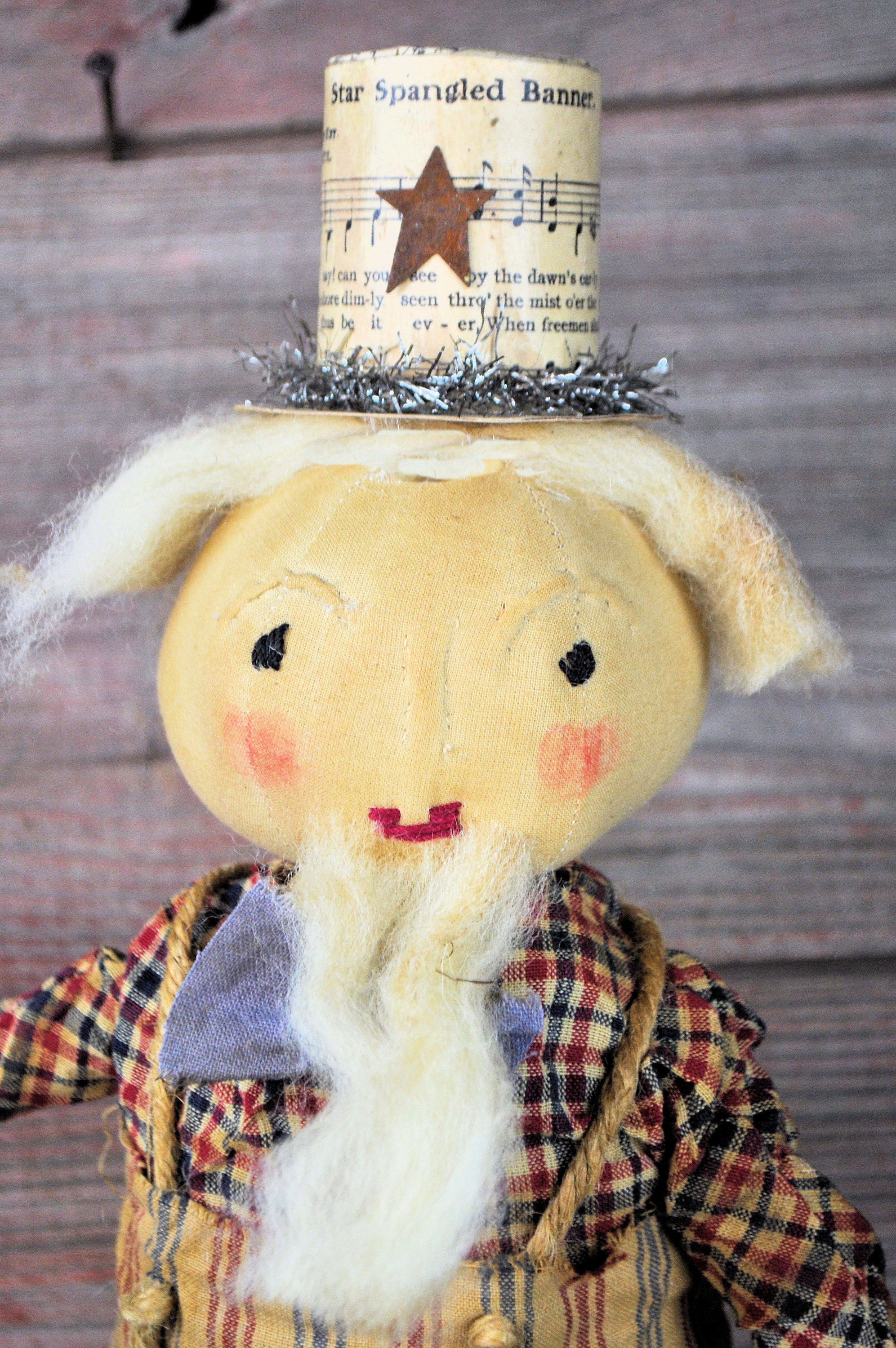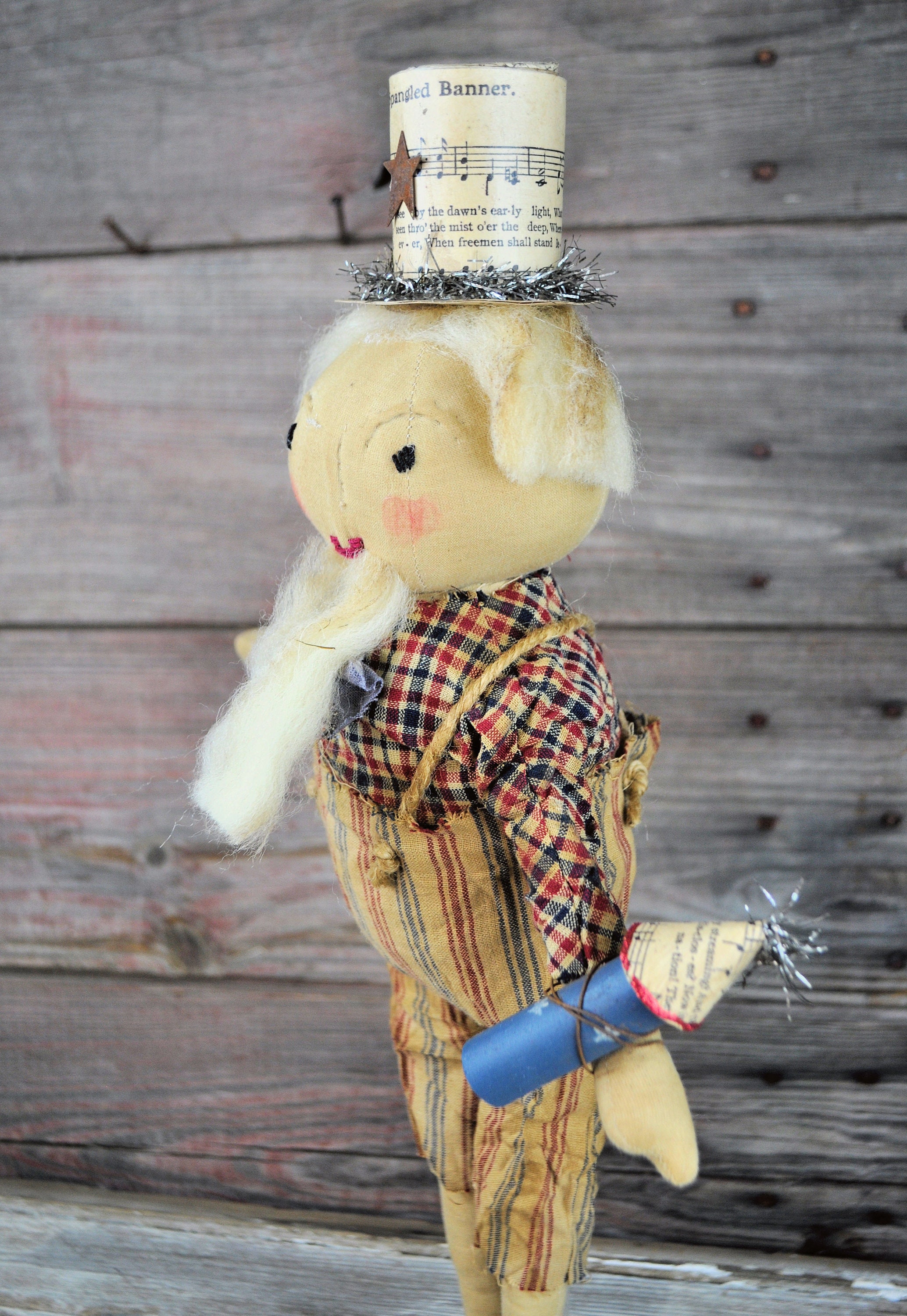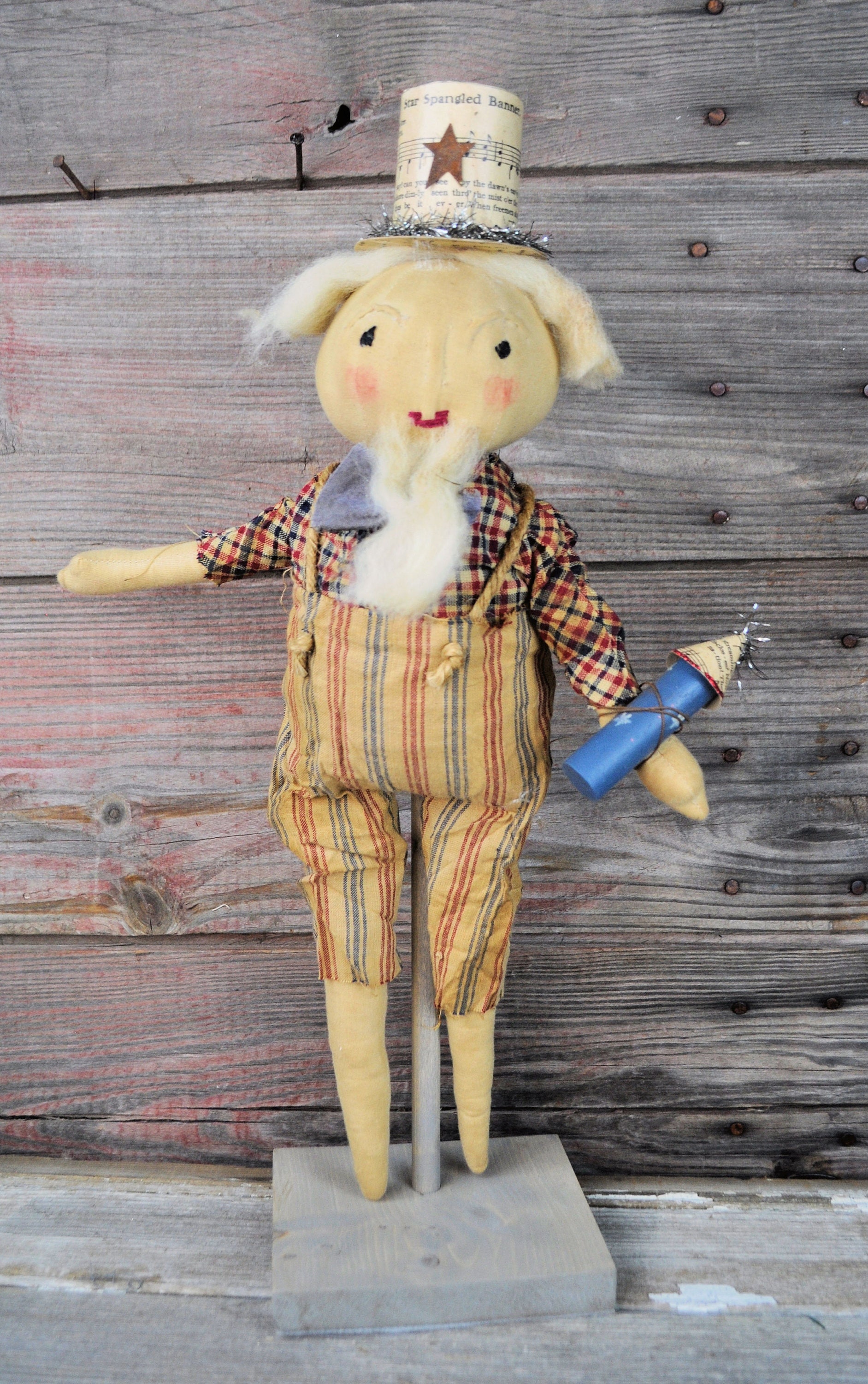 Barb Olson of Muddy Creek Primitives, designer and creator of unique handmade pieces is pleased to offer this prim Uncle Sam that is holding a rocket firework. He is wearing a homespun red, tan and blue striped pants and hand-dyed blue bowtie. His shirt is red tan and blue homespun plaid. He has twine suspenders with small rusty stars as buttons. His hat is made from an old copy of "Star Spangled Banner" sheet music. On the brim of the hat is antique style tinsel garland and a distressed rusty star. His eyes and mouth are handstitched with crochet thread. His nose and eyebrows are hand sculpted with needle and thread. Uncle Sam's hair and beard are cream wool roving. He is holding a handmade rocket firework with tinsel garland for the sparks. The top of the rocket is more of the "Star Spangled Banner" sheet music and red glitter on the edge. The base is painted blue with white stars. He is mounted on a gray stained board with a dowel. The board has felt on the base to protect your furniture. He is wonderfully grunged up to look very primitive. Uncle Sam is 19" tall. Set him on your mantle or side table with our companion piece, Liberty with "Liberty" star garland ( also available in our Etsy shop).