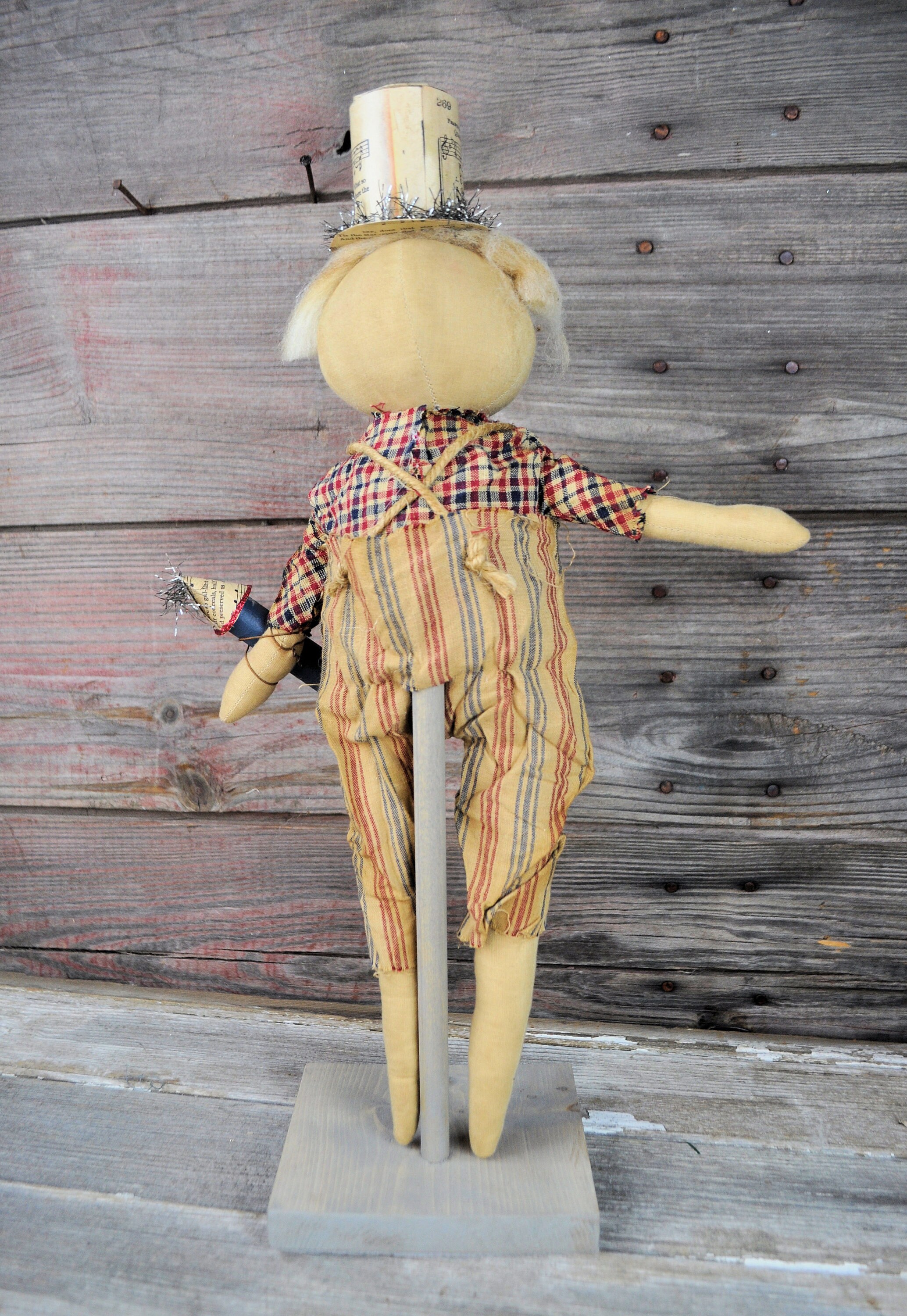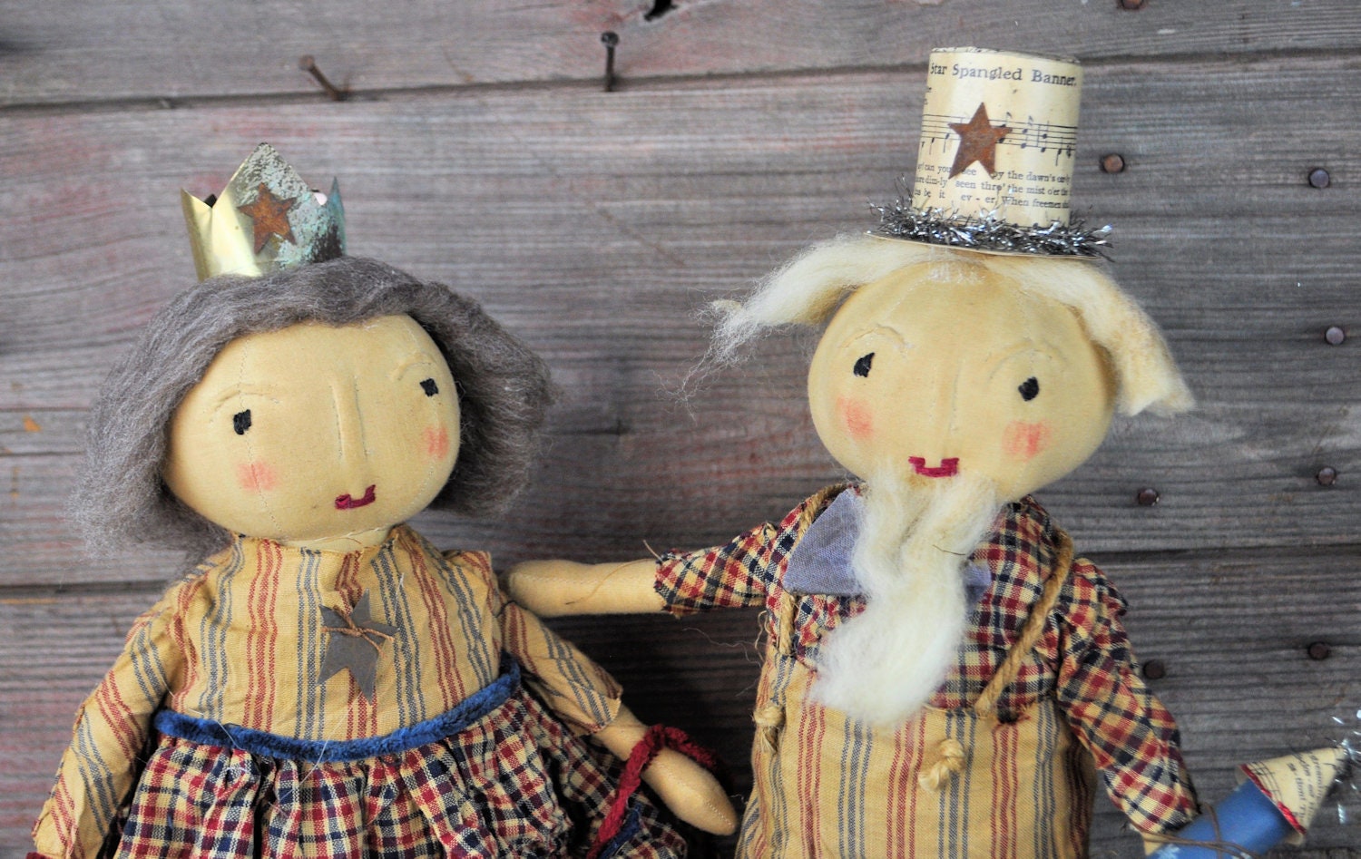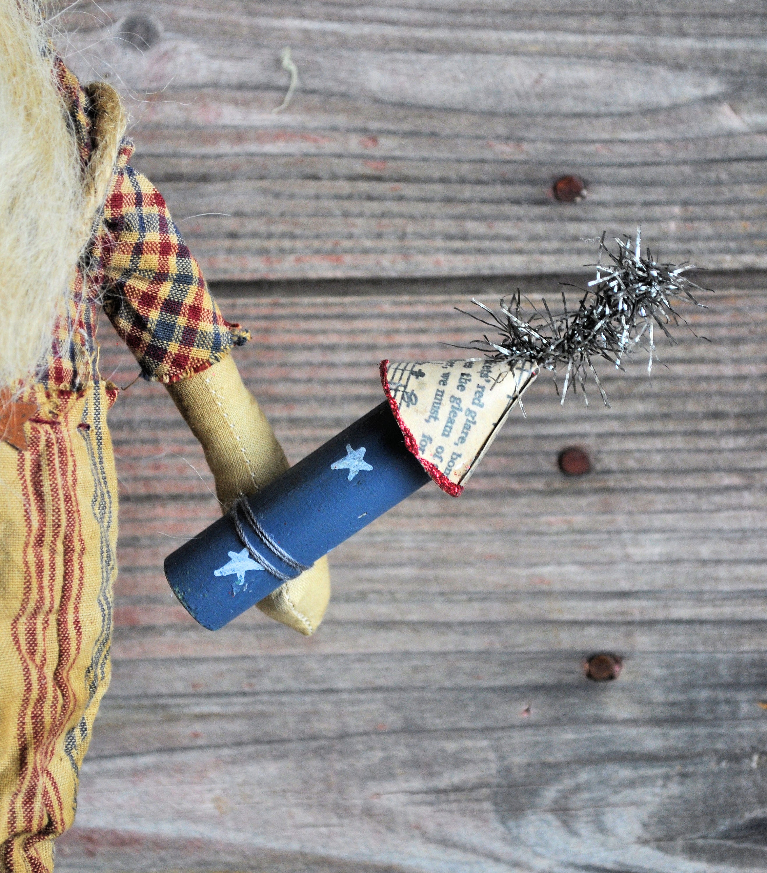 Barb Olson of Muddy Creek Primitives, designer and creator of unique handmade pieces is pleased to offer this prim Uncle Sam that is holding a rocket firework. He is wearing a homespun red, tan and blue striped pants and hand-dyed blue bowtie. His shirt is red tan and blue homespun plaid. He has twine suspenders with small rusty stars as buttons. His hat is made from an old copy of "Star Spangled Banner" sheet music. On the brim of the hat is antique style tinsel garland and a distressed rusty star. His eyes and mouth are handstitched with crochet thread. His nose and eyebrows are hand sculpted with needle and thread. Uncle Sam's hair and beard are cream wool roving. He is holding a handmade rocket firework with tinsel garland for the sparks. The top of the rocket is more of the "Star Spangled Banner" sheet music and red glitter on the edge. The base is painted blue with white stars. He is mounted on a gray stained board with a dowel. The board has felt on the base to protect your furniture. He is wonderfully grunged up to look very primitive. Uncle Sam is 19" tall. Set him on your mantle or side table with our companion piece, Liberty with "Liberty" star garland ( also available in our Etsy shop).
